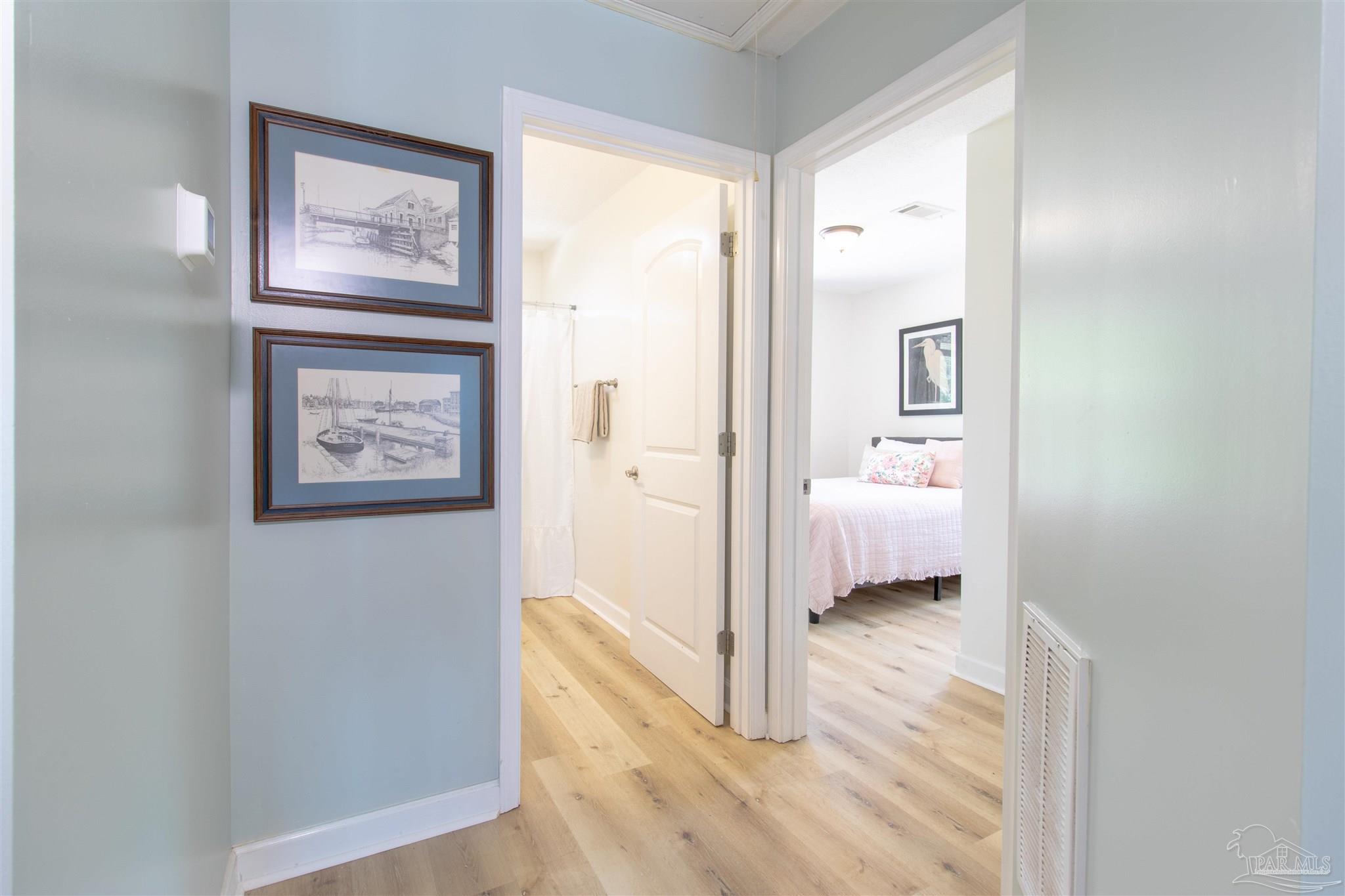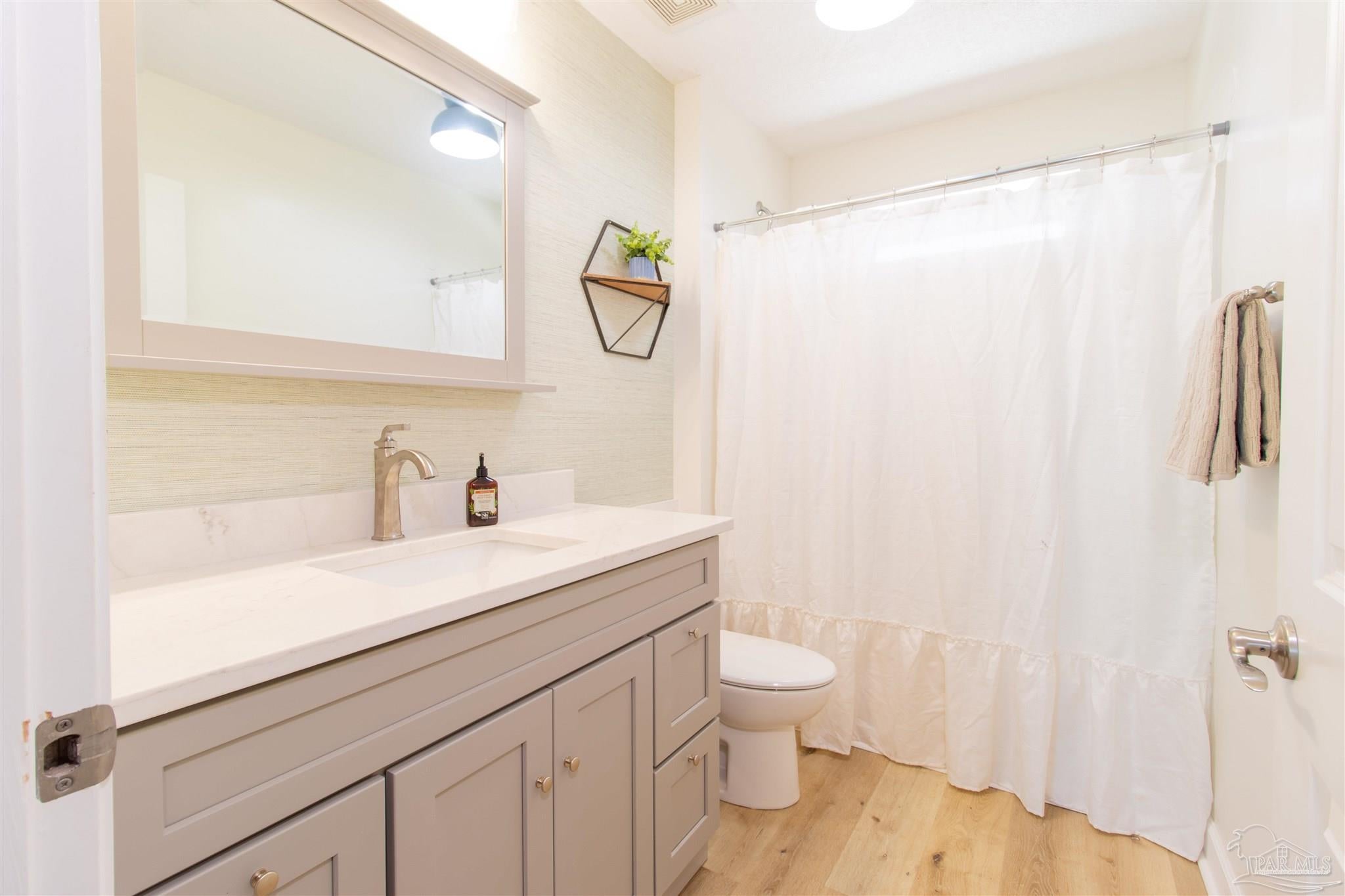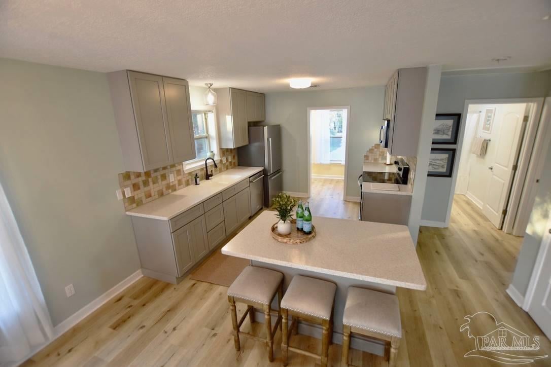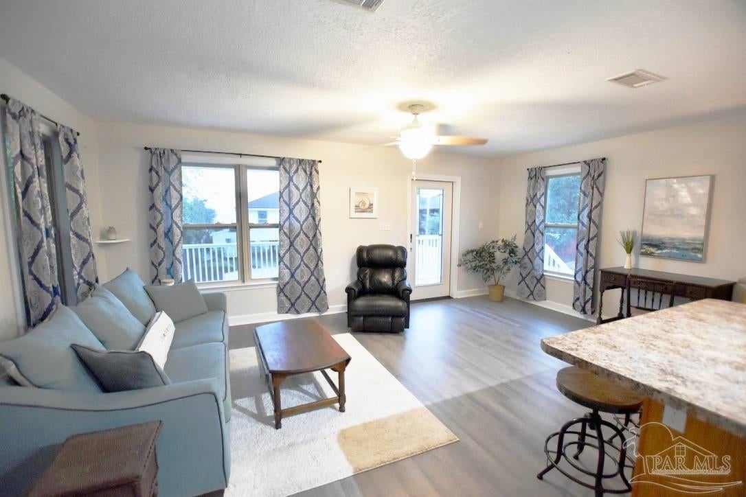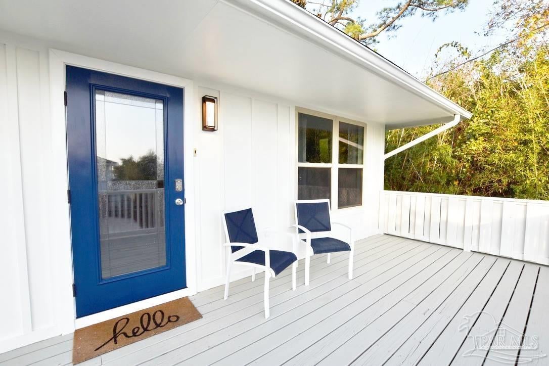 Owners have given this amazing property the attention its been waiting for. Price adjustment and major improvements! Fall in love with this turn-key coastal retreat, completely remodeled inside and out. New exterior paint, updated landscaping, fruit trees, a new fence and dock, and a whole new vibe. This property is made up of two completely independent houses on one lot. The 3 bedroom 2 bath main house is light and bright. It features an open concept kitchen/dining/living design, huge pantry, and a utility room off the kitchen. There are two guest bedrooms that share a second bath, and a primary suite with a dressing room, large bathroom, and big windows to soak up the water views. The 1 bed/1 bath secondary house is completely independent with its own utilities. It has an amazing, large, open concept kitchen/living room and a bedroom with attached bath and laundry. This house has it's own covered parking and a deck. This is the perfect situation for multi-generational living or rent out one unit and live in the other. Both homes built in 2008 have impact windows and doors, are high and dry on pilings, and have abundant space below for entertaining and covered parking, as well as a large workshop. Whether you’re an investor looking for an income producing short term rental opportunity, or you’re searching for your primary home, don't miss this fantastic property. Catch red fish, speckled trout, crabs and beautiful sunsets from the dock. Located just steps from the Woodlawn Beach Boat Ramp, and equally distant from Navarre Beach and Pensacola Beach. Zoned for top rated schools. Upgraded from septic to city sewer (2025).