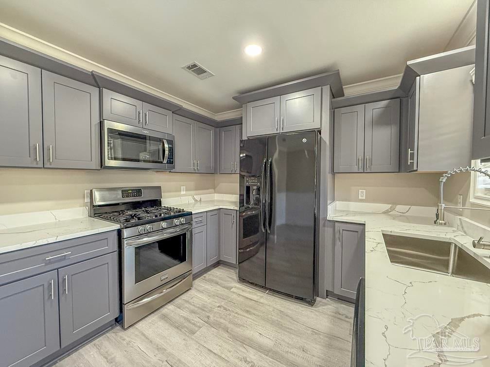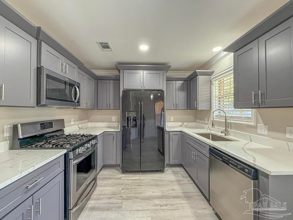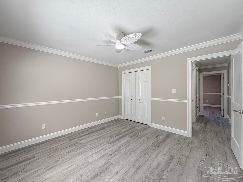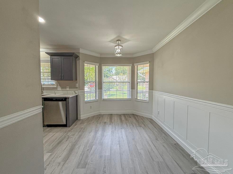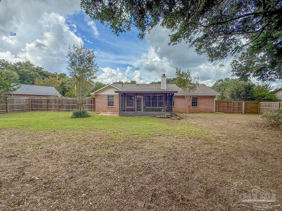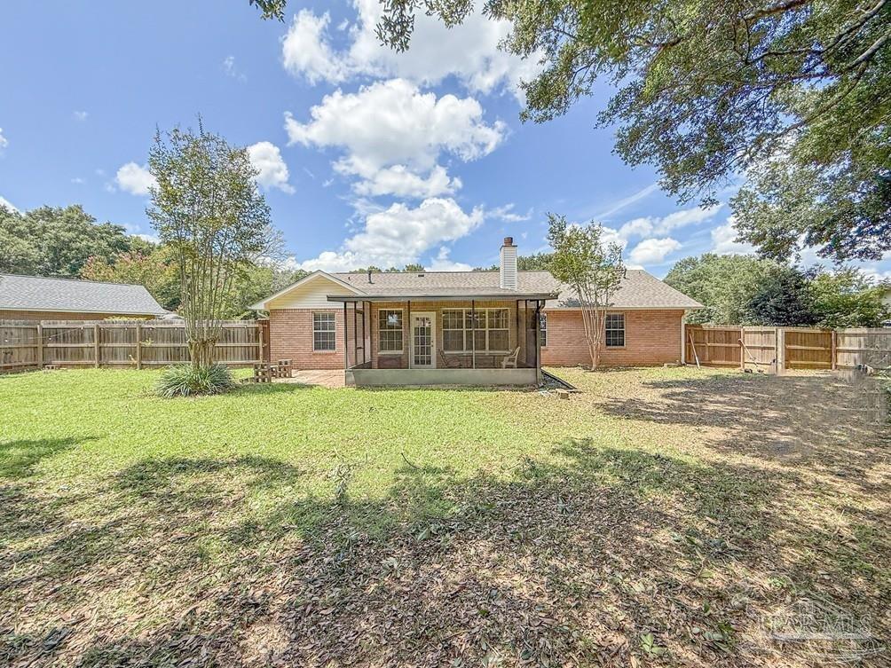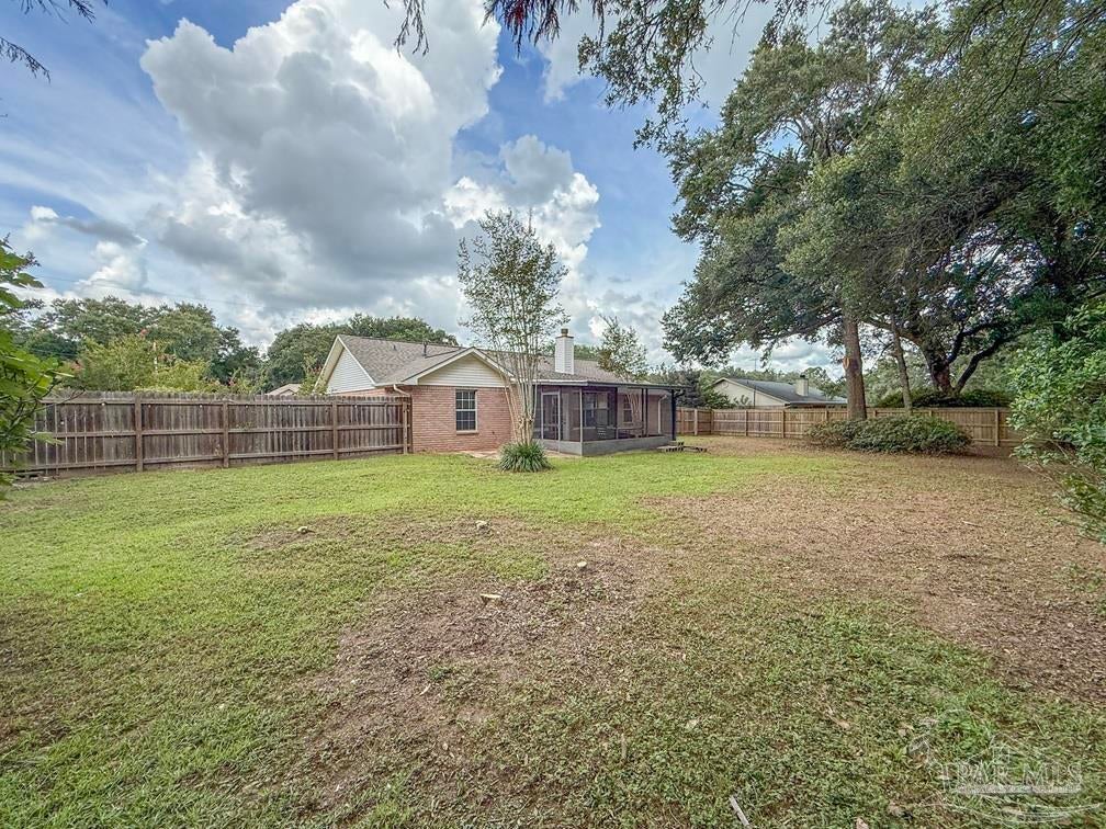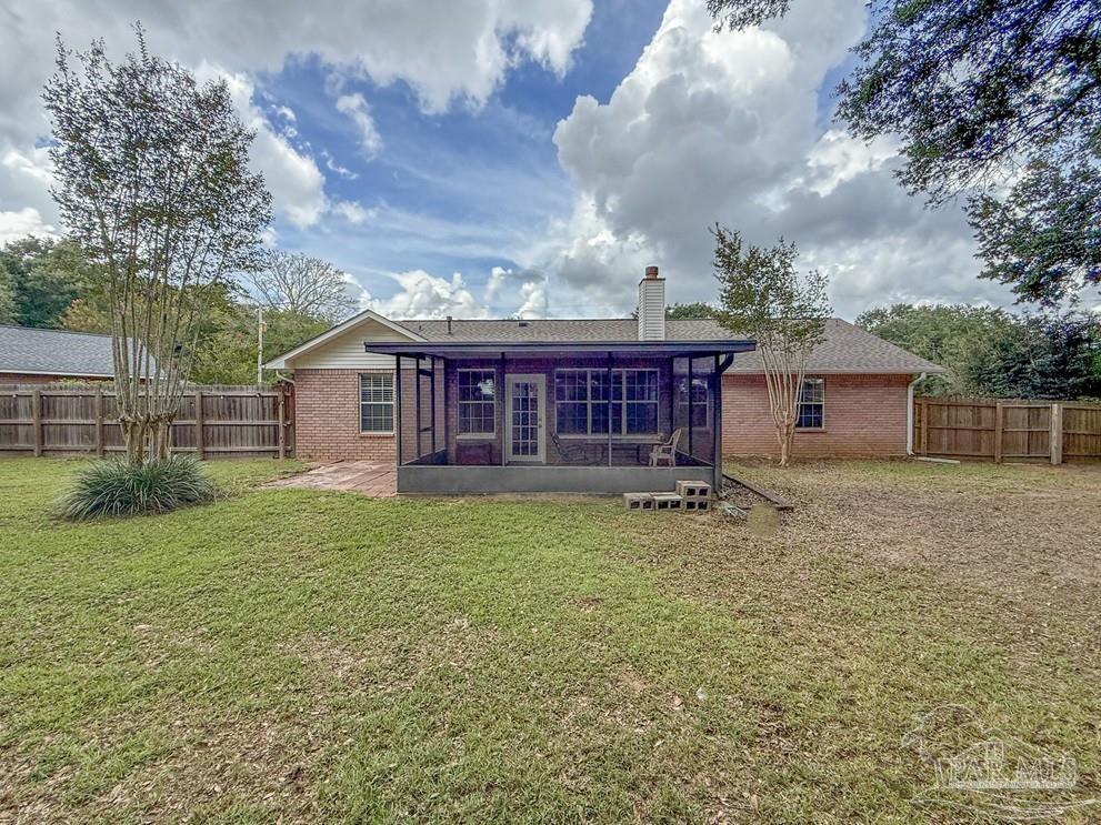 Welcome to this stunningly updated home nestled in a well-established, HOA-free neighborhood in the heart of Pace. Step inside to find beautiful new flooring and a fresh coat of paint throughout. The kitchen shines with all-new cabinetry, stone countertops, updated fixtures, lighting, and a gas stove, dishwasher, and refrigerator. The living room offers a warm, inviting atmosphere featuring crown molding, cathedral ceilings, wainscoting, new baseboards, and a cozy corner wood burning fireplace. Each bedroom includes updated doors, closet doors, modern fixtures, and new blinds. Both bathrooms have been fully renovated with new stone countertops, vanities, tubs/showers, toilets, lighting, and tasteful wainscoting accents. Step out back to a peaceful porch area, perfect for unwinding, with a walkway that leads to a spacious, fully fenced backyard. Other notable features include new AC condenser in 2020 and new roof in 2021.