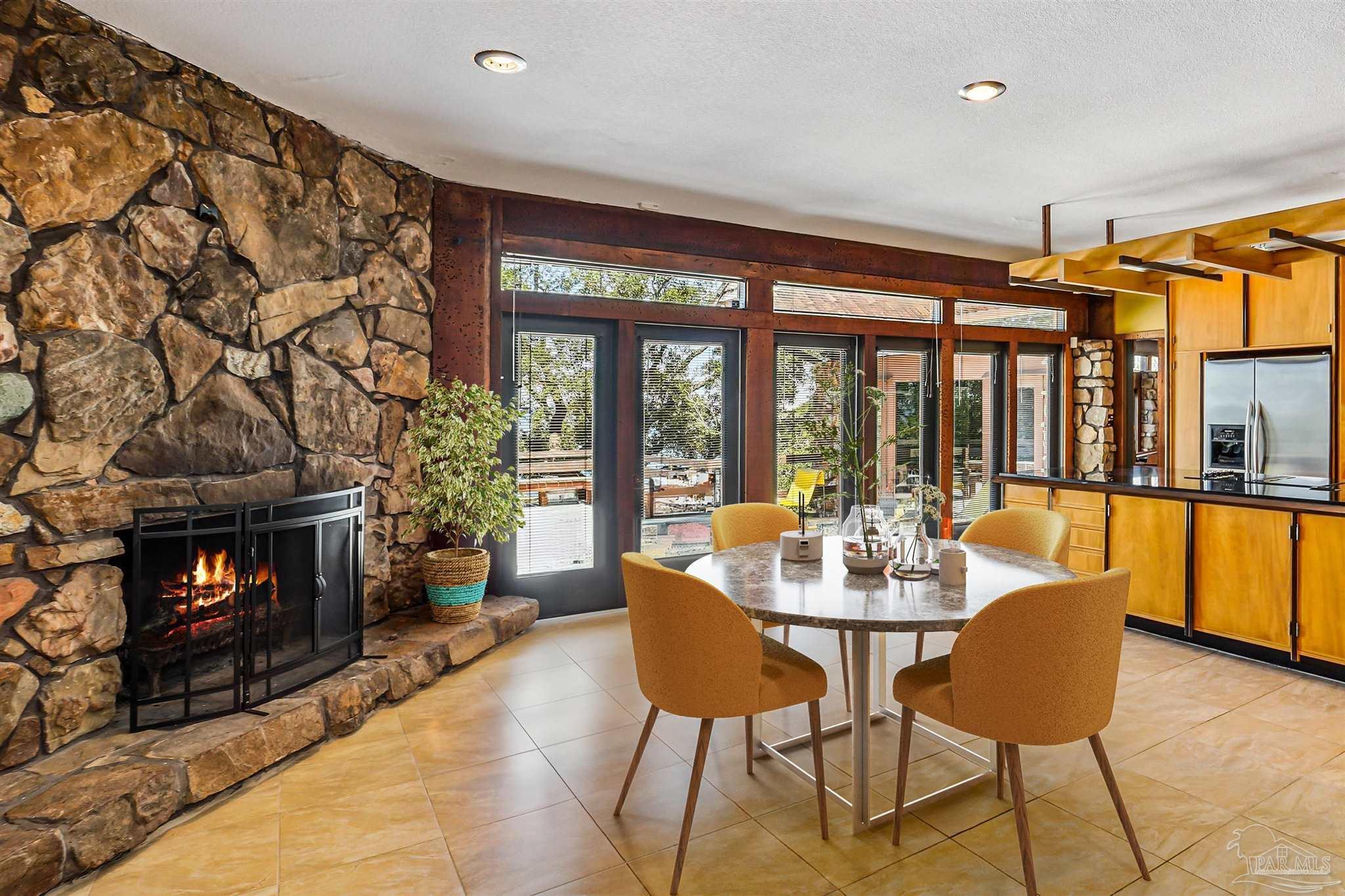 An extraordinary opportunity awaits in Gulf Breeze Proper with this mid-century modern residence, a landmark property designed by an internationally renowned architect. Built in 1972 and inspired by a celebrated American architect, this home offers commanding, panoramic views of Pensacola Bay and the iconic 3-Mile Bridge. Set discreetly on a sloping hill for optimal privacy, its sprawling 0.849-acre lot is one of the largest waterfront parcels in the neighborhood. Owned and maintained by a single family since its construction, the property seamlessly blends its rich architectural pedigree with tasteful, modern updates. The whole home exterior is done in cedar shake and copper trim throughout, which pairs beautifully with the home's unique interior. The 3,234 sq. ft. open-concept layout is distinguished by the lavish and very rare use of Amazonian wormwood throughout the home, both inside and out. This highly unique material, with its distinctive grain and texture, adds unparalleled character and historic depth to the Mid-Century Modern aesthetic, truly setting this residence apart. Expansive living and family rooms are bathed in natural light from oversized windows and open to over 3,000 sq. ft. of balconies. Designed with both art and function in mind, the home retains many original mid-century elements, including some custom furnishings from prominent designers of the era. At its core, a private atrium with a peaceful central garden experience for all balcony levels. The backyard is an entertainer's dream, with two massive balconies providing a stunning backdrop of the bay. Unique features include a spiral staircase, a private elevator, and a versatile potential theater room. This is more than a home; it is a piece of Gulf Breeze history, with notable visitors including a famous astronaut. The impressive 180 feet of waterfront is secured by a grandfathered easement, ensuring the property will never be assessed for dredging costs. With a discerning update, this ma