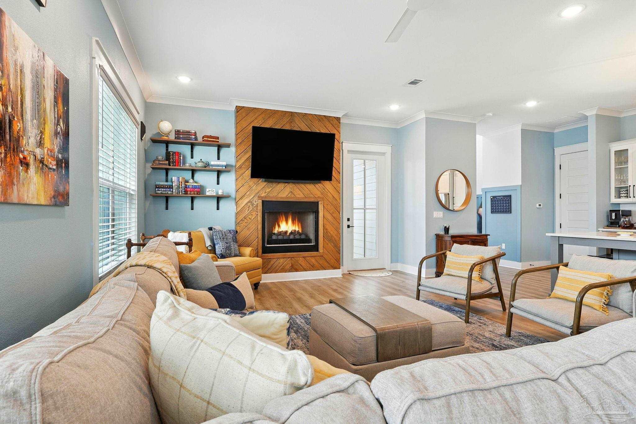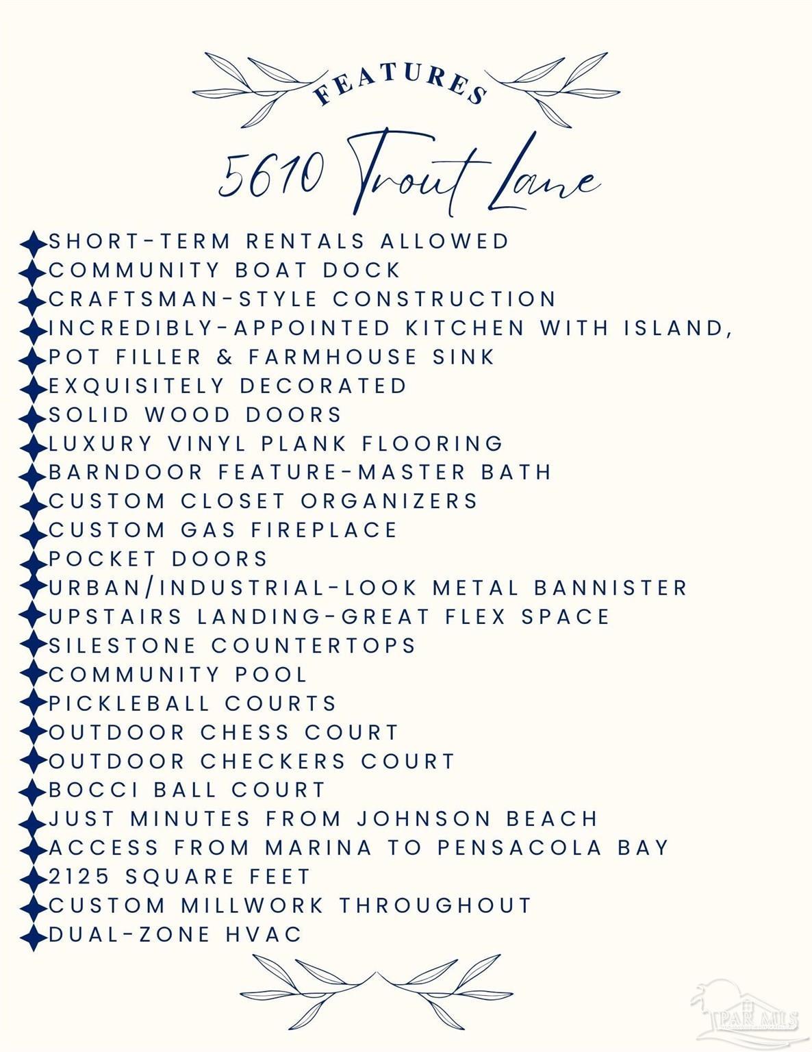 OPEN HOUSE 9/21/2025 1 TO 3!!! Classic appointments, exquisite decorating, incredible upgrades & a soothing color palette make this your choice for the finest in Coastal Living! Highlights include: Craftsman-style construction...6-Panel, solid-wood, interior doors...luxury vinyl plank flooring...barn door feature...fabulous IKEA custom closet organizers...custom gas fireplace...Jack & Jill bath...pocket doors, contemporary metal bannister, upstairs landing could double as an office, study room or home-school classroom..beautiful Silestone countertops throughout! Favorites of the sellers include: trips to Johnson Beach-minutes away...Relaxing on the Community Boat Dock...Innerarity Point Playground Park...Community Pool recreation area with Pickleball Courts, Outdoor Chess & Checkers boards & a Bocci Ball court! Fun!