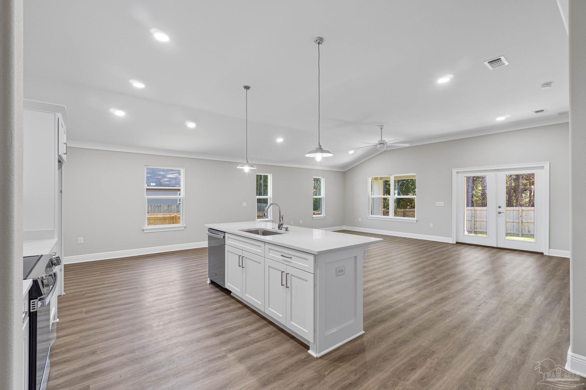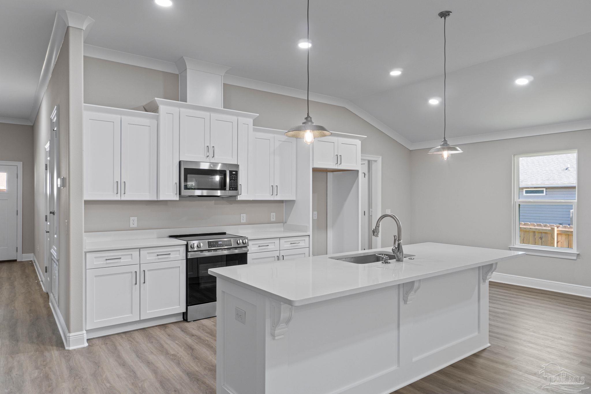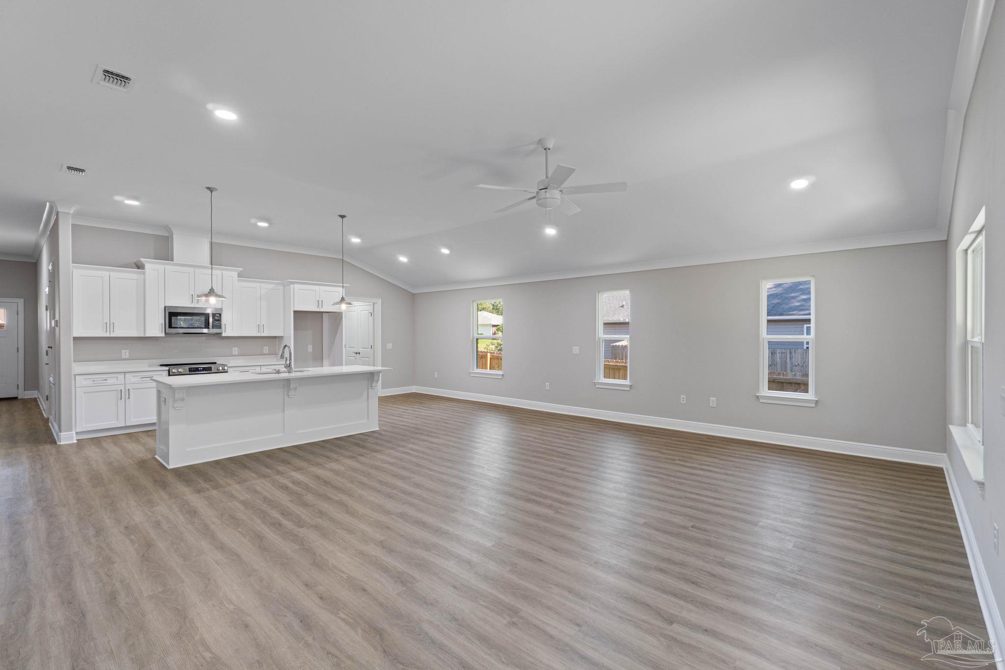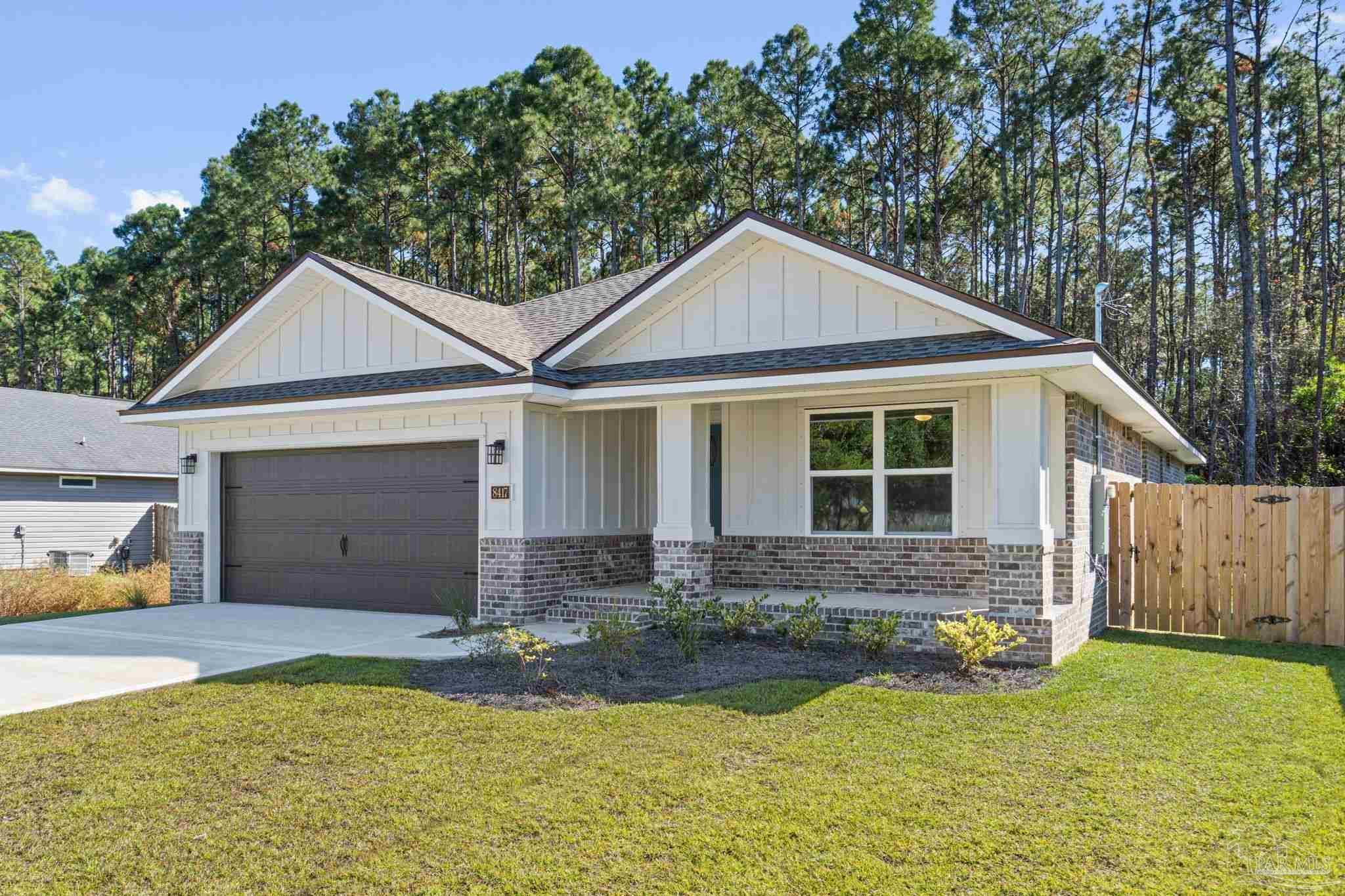 MOVE IN READY NEW CRAFTSMAN Custom Built Home ~ this luxurious 3 bed/2 bath floor plan sits at the end of 4 new builds~Great Central Location with easy access to Navarre Beach, Navarre Waterfront Park and Hwy 98 to Hurlburt Field AFB.This Stunning Robbins Builders Home offers trend setting features~Greeted by a walk in foyer sweeping through to your open floor plan ~Large kitchen enjoying custom cabinets with crown molding, beautiful quartz counter tops~under mount sink~S/S appliances, large double door pantry & closed off utility room ~sleek top center Island with pendant lights ~open flow to the family room with patio doors out to the large covered porch .Wood look LVP throughout with tiled bathrooms~ Large master with trey ceiling /ceiling fan and large walk-in closet ~master bath offers an oversized TILED shower ~ double vanity with picture frame mirrors. Additional Bedrooms are a great size with double closets and ceiling fans~Home has a welcoming covered front porch and large covered back porch to sit out and enjoy those wonderful Florida evenings ~great to cook out and entertain. Grassed yard with irrigation system for easy care in the summer months. TAEXX in wall pest control system~ Hurricane protection for windows and dimensional shingle roof for lower insurance premium. Upgrades throughout include recessed lighting, bedroom fans, crown molding, deluxe lighting package,50 Gallon water heater, garage door remotes, attic drop down stairs~ to name a few.....Call today for further information.