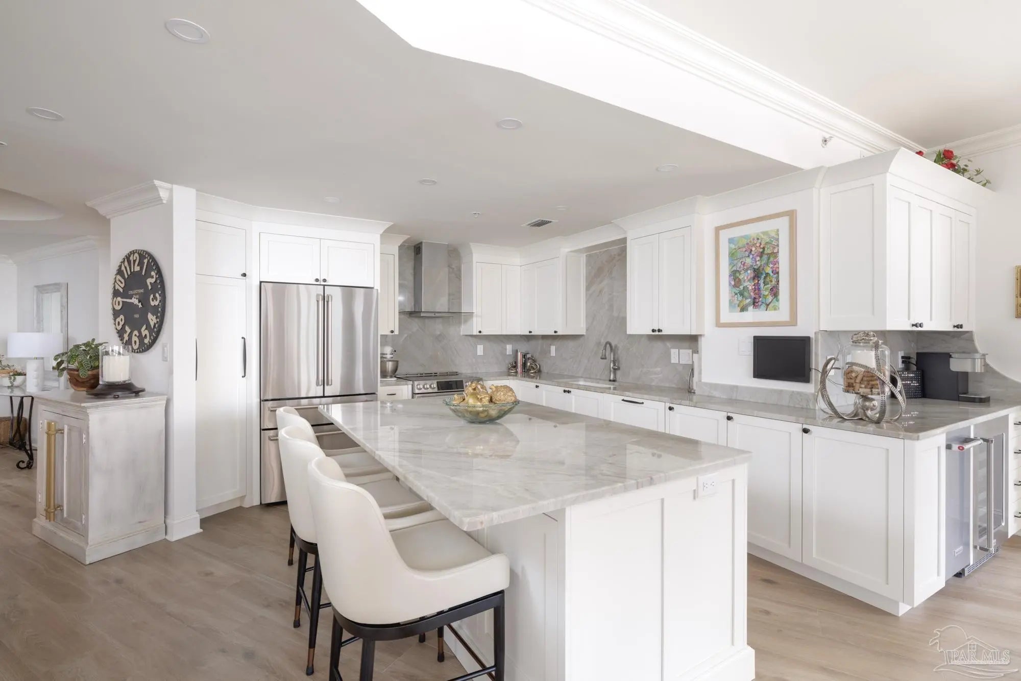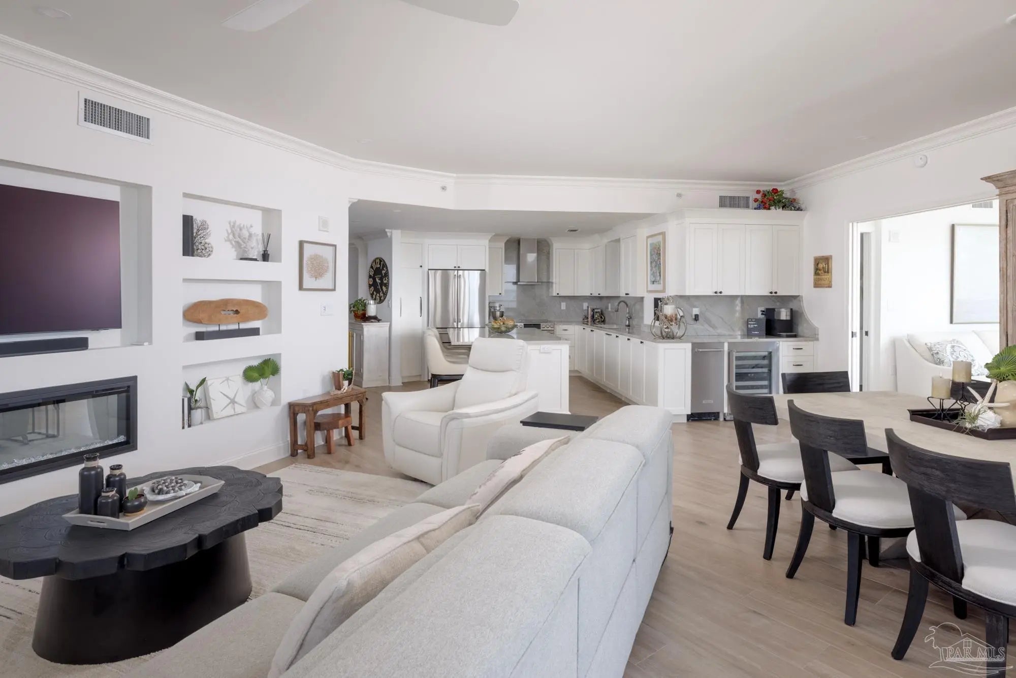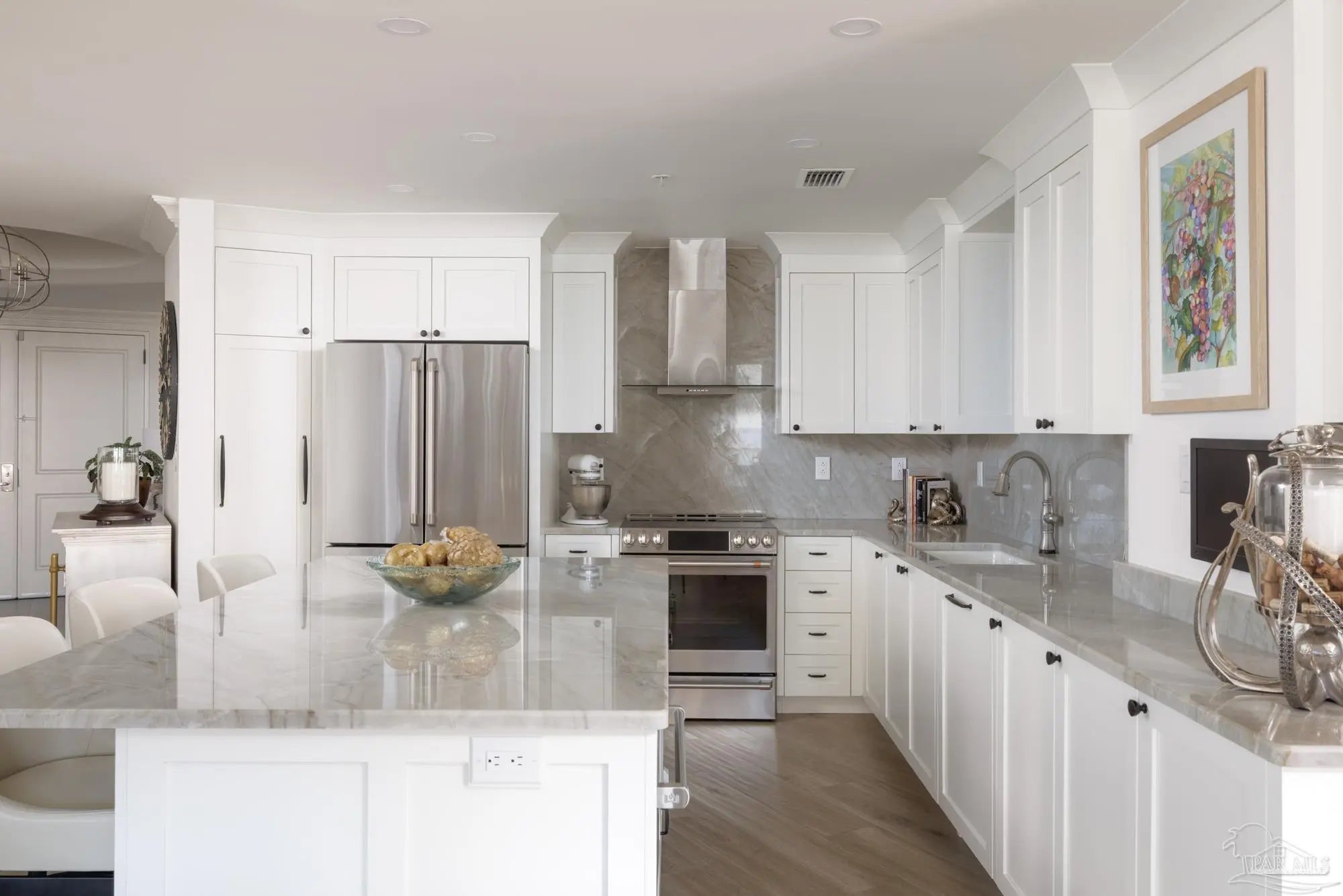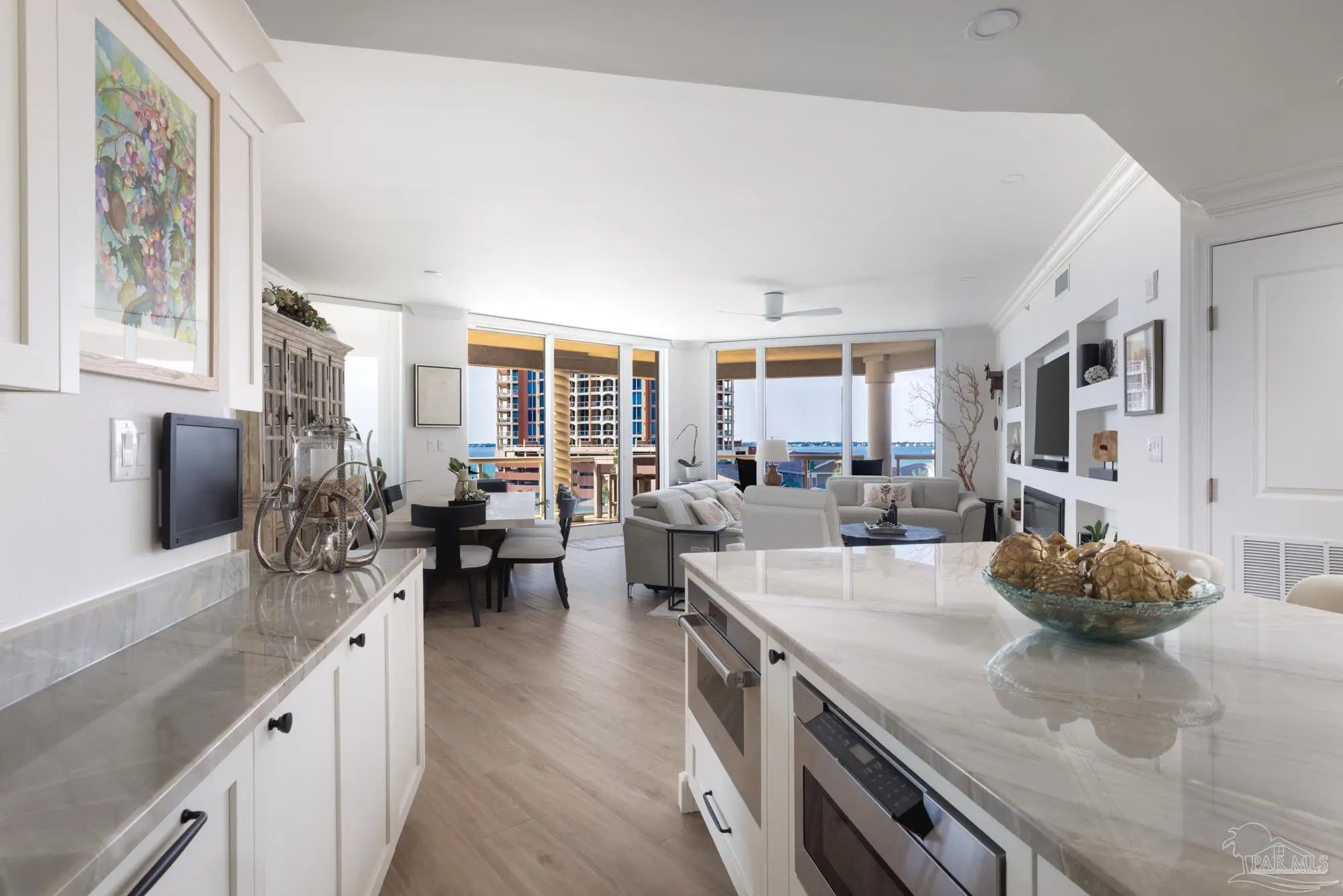 From the moment you enter this stunning Portofino condo, you’re surrounded by paradise. Expansive sapphire-blue water views fill every window, wrapping the home in coastal tranquility while complementing the thoughtfully designed interior. This three-bedroom residence in Tower One has been transformed into a timeless, contemporary retreat. Step through the foyer into open living spaces, where the newly remodeled kitchen (2025) flows seamlessly into the dining and living areas. The kitchen features stainless Café appliances—including a range with hood, ice maker, and wine fridge—set against elegant quartz and quartzite surfaces, a custom backsplash, and abundant cabinetry. A walk-in pantry provides added storage. Pocket doors off the kitchen lead to one of three bedrooms, complete with terrace views and convenient access to a full bath—ideal for guests. The living room showcases a built-in fireplace and entertainment center, all while offering sweeping views of both the Gulf of Mexico and Santa Rosa Sound. Sliding floor to ceiling glass doors that open to an expansive corner balcony. Out here, two spacious sitting areas and a built-in outdoor grill create the perfect setting for year-round entertaining. The primary suite offers direct terrace access, a walk-in closet, and a beautifully updated bath with granite waterfall counters and marble accents. A second bedroom opens to its own terrace, featuring twin closets and access to a third full bath. A laundry room completes the interior. Beyond the residence itself, enjoy the exclusive Portofino lifestyle—resort pools, on-site dining, and the beach just steps away. This is a rare opportunity to own a sophisticated coastal retreat with unmatched views and luxurious finishes.