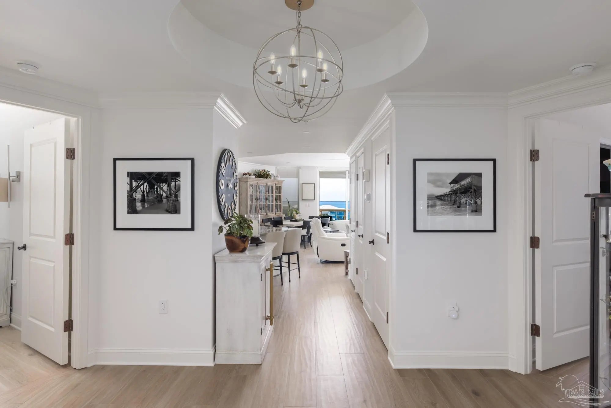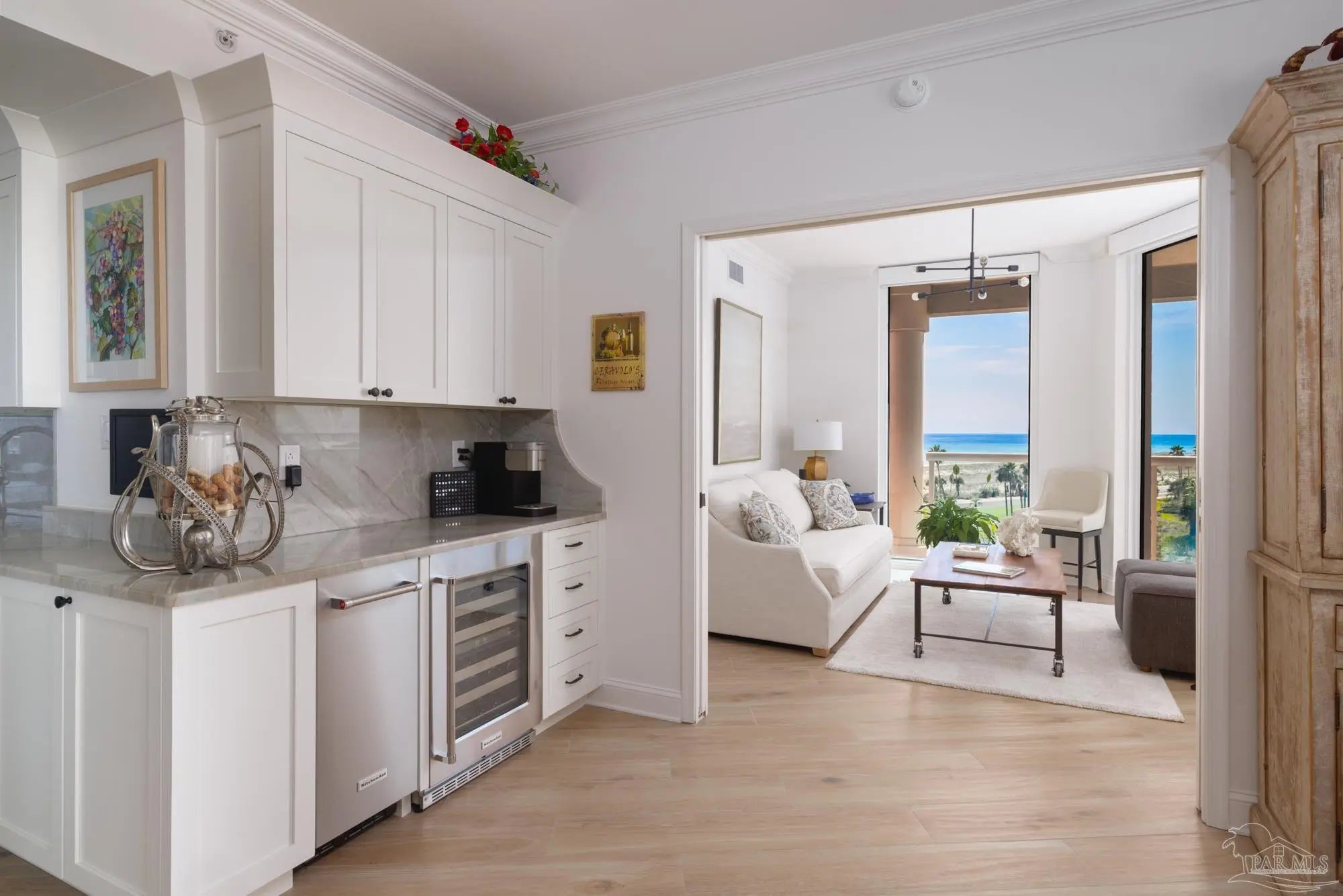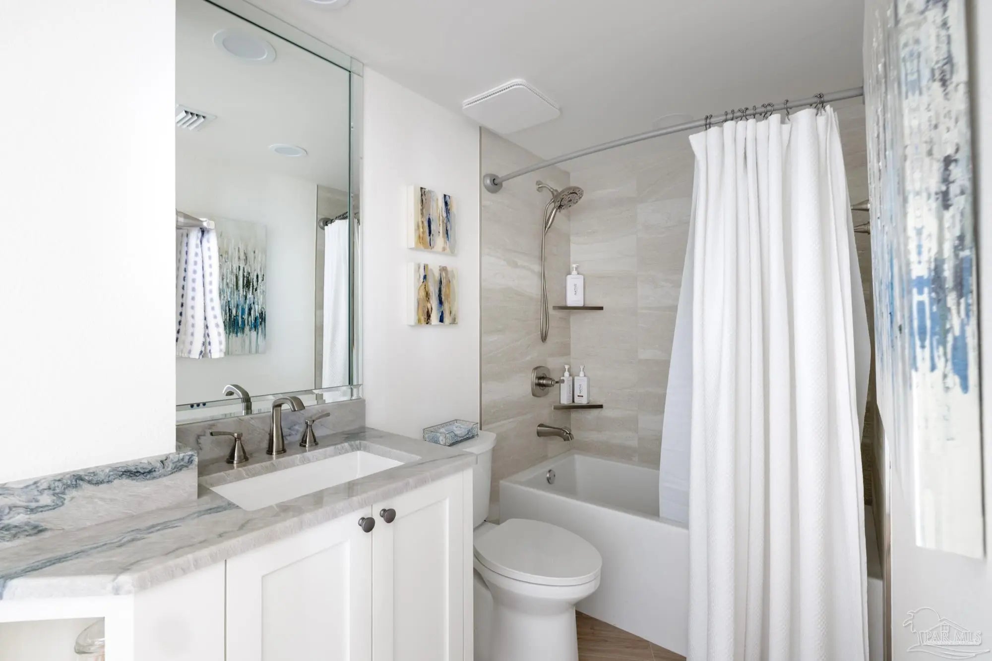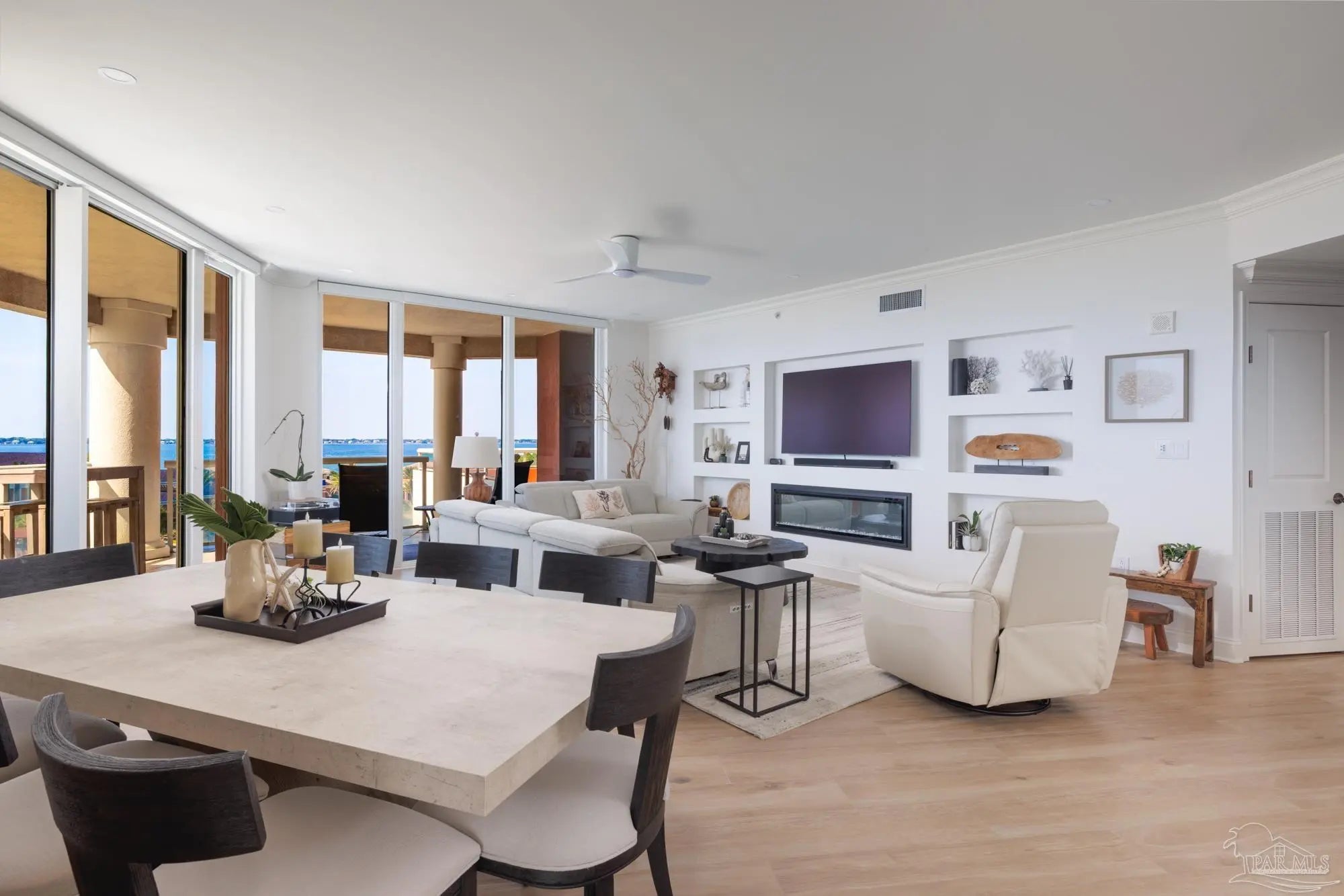 From the moment you enter this stunning Portofino condo, you’re surrounded by paradise. Expansive sapphire-blue water views fill every window, wrapping the home in coastal tranquility while complementing the thoughtfully designed interior. This three-bedroom residence in Tower One has been transformed into a timeless, contemporary retreat. Step through the foyer into open living spaces, where the newly remodeled kitchen (2025) flows seamlessly into the dining and living areas. The kitchen features stainless Café appliances—including a range with hood, ice maker, and wine fridge—set against elegant quartz and quartzite surfaces, a custom backsplash, and abundant cabinetry. A walk-in pantry provides added storage. Pocket doors off the kitchen lead to one of three bedrooms, complete with terrace views and convenient access to a full bath—ideal for guests. The living room showcases a built-in fireplace and entertainment center, all while offering sweeping views of both the Gulf of Mexico and Santa Rosa Sound. Sliding floor to ceiling glass doors that open to an expansive corner balcony. Out here, two spacious sitting areas and a built-in outdoor grill create the perfect setting for year-round entertaining. The primary suite offers direct terrace access, a walk-in closet, and a beautifully updated bath with granite waterfall counters and marble accents. A second bedroom opens to its own terrace, featuring twin closets and access to a third full bath. A laundry room completes the interior. Beyond the residence itself, enjoy the exclusive Portofino lifestyle—resort pools, on-site dining, and the beach just steps away. This is a rare opportunity to own a sophisticated coastal retreat with unmatched views and luxurious finishes.