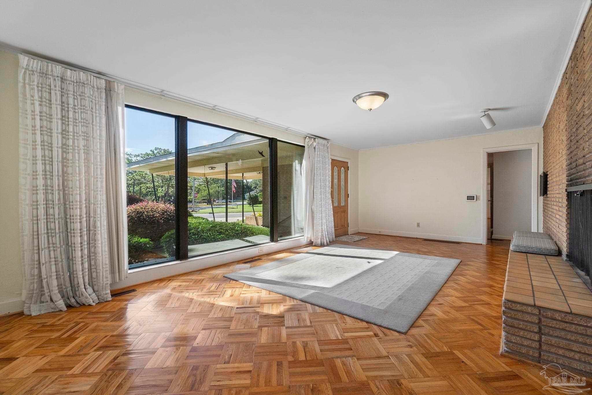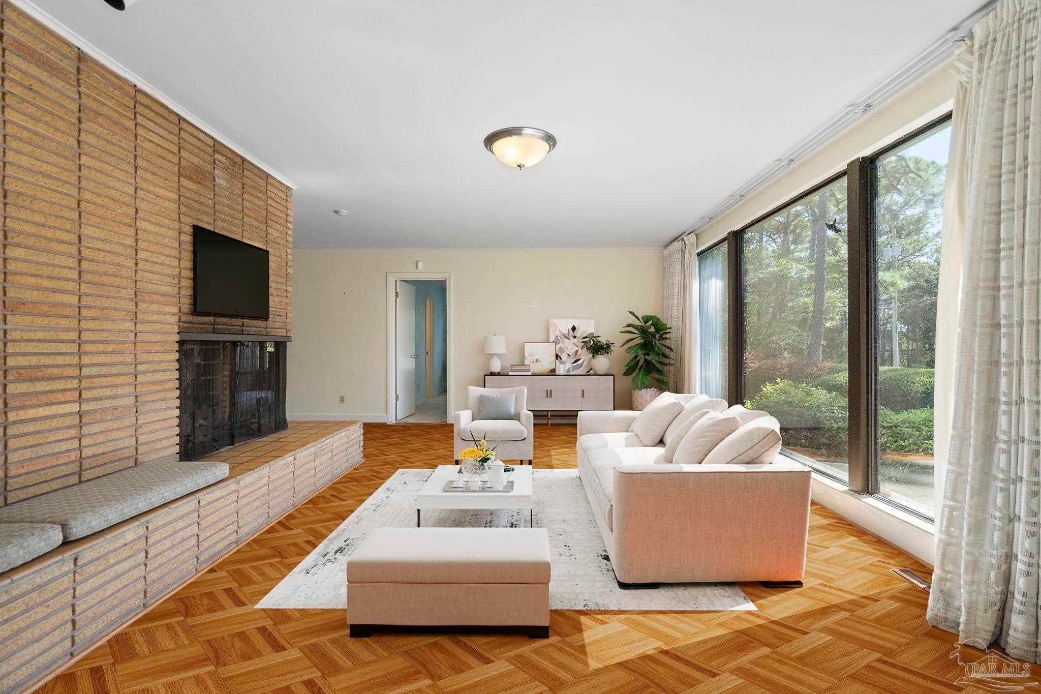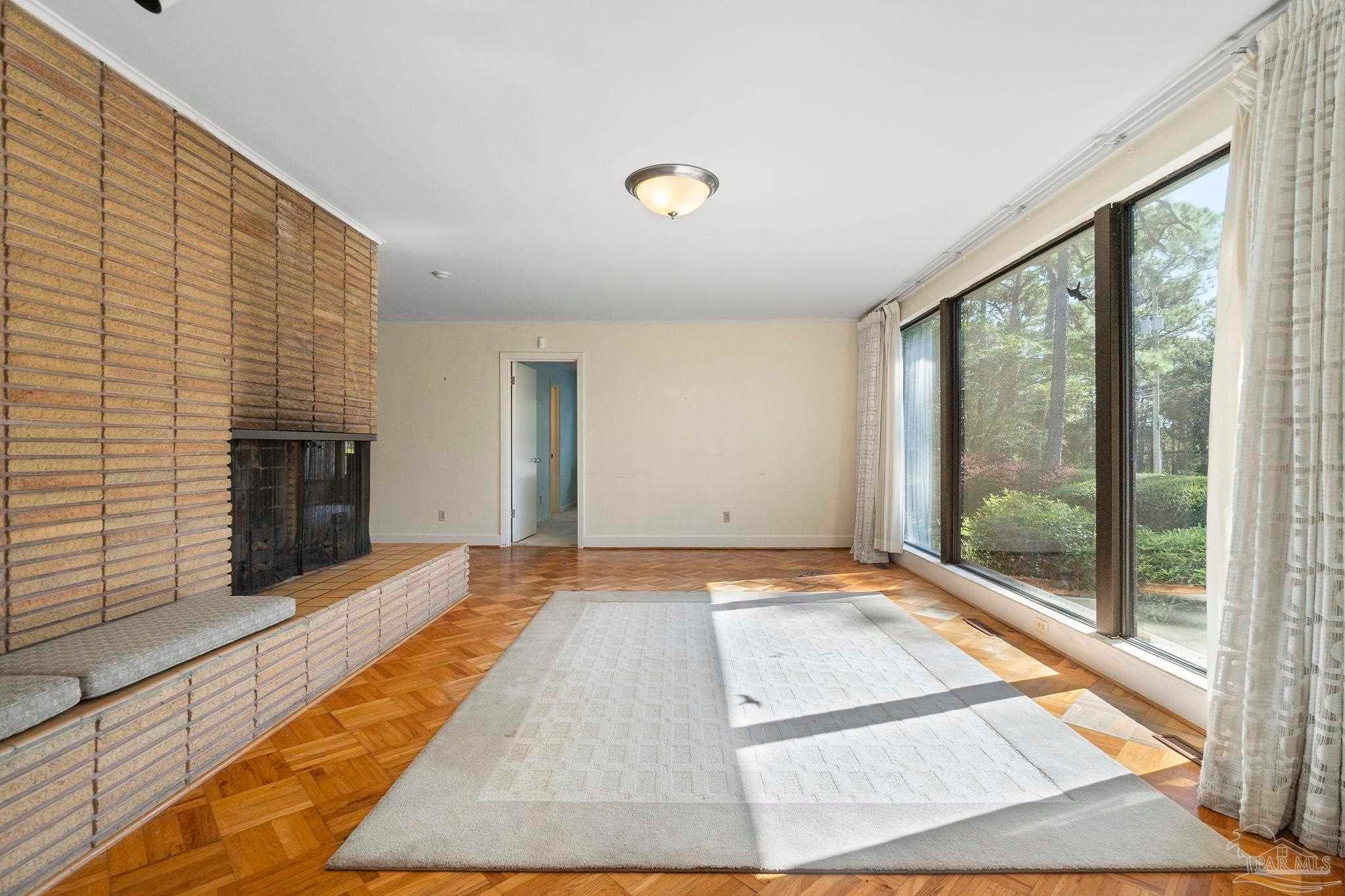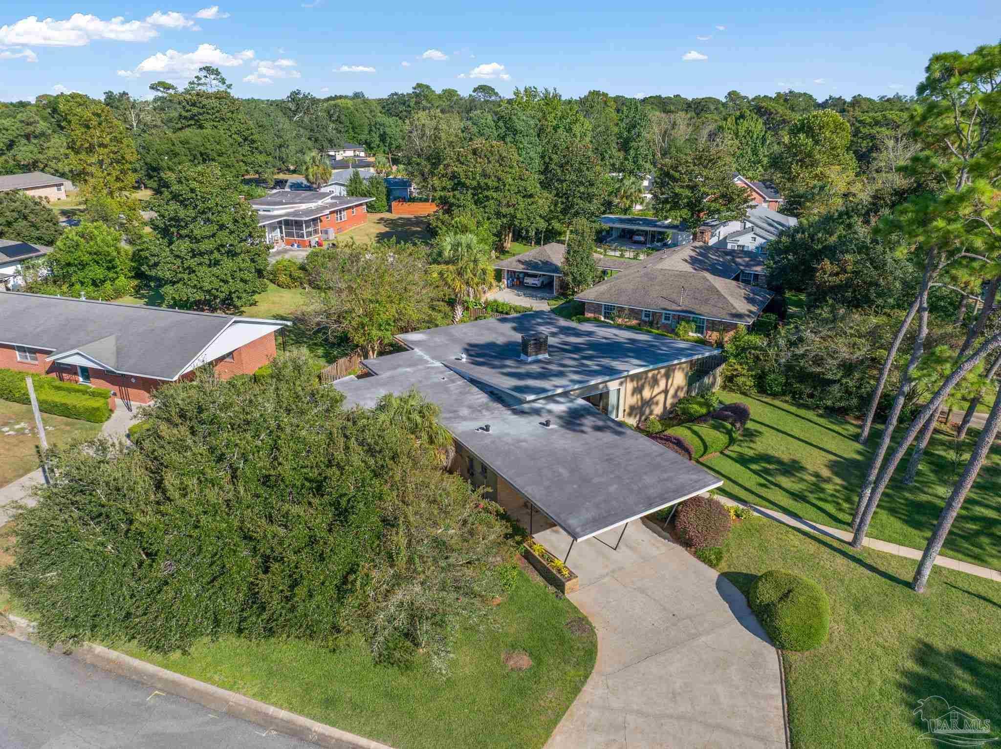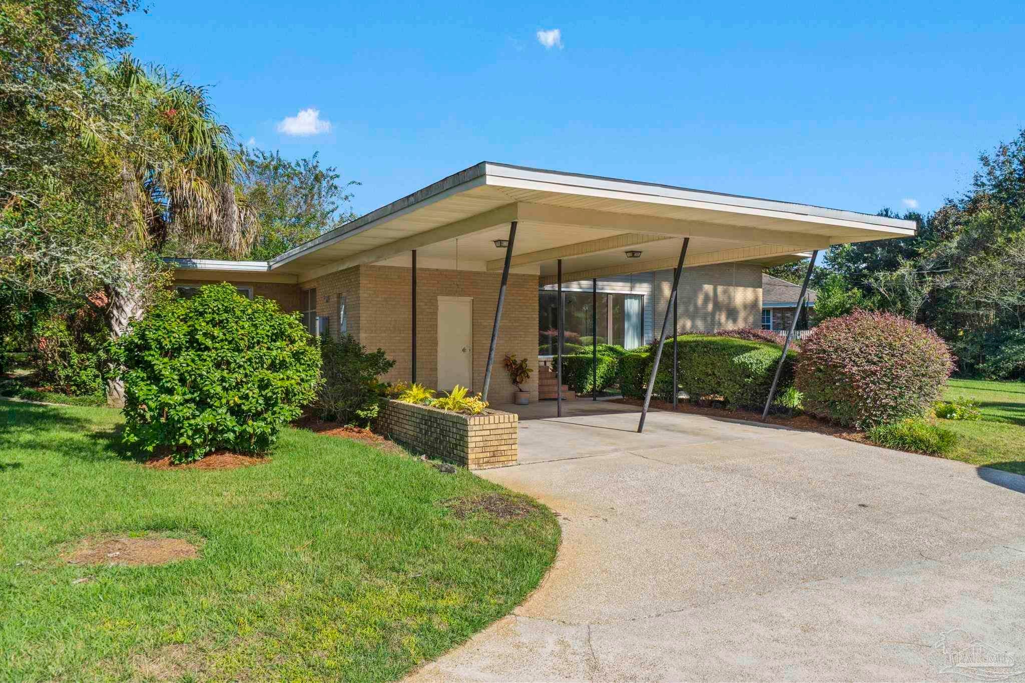 Welcome to this charming 5-bedroom, 2.5-bathroom home located on a desirable corner lot in beautiful Pensacola. This residence showcases distinctive Frank Lloyd Wright-inspired architectural elements that add both character and allure. Upon entering, you will appreciate the inviting living area, featuring a cozy wood-burning fireplace, built in fish tank with a large, picturesque window to let in the natural light & hardwood parquet-style flooring. Underneath the existing carpeting in the home, the hardwood flooring presents an opportunity for elegant restoration. The thoughtfully designed split floor plan places a primary suite on each side of the home, enhancing privacy and functionality. At the rear, a spacious family room awaits, complete with exquisite built-in shelves, electric fireplace and a wet bar, perfect for entertaining or casual gatherings. This room is illuminated by natural light, thanks to its access to the lush, fully fenced backyard, providing a serene outdoor escape. The backyard is highlighted by extensive landscaping, offering a vivid array of plants that create a picturesque setting for relaxation or outdoor activities. Additionally an exterior shed for tools and garden supplies and a workshop area catering to hobbyists or those needing extra space. An intriguing aspect of this property is the bomb shelter located in the side yard, available for viewing upon signing a hold harmless agreement. This unique feature adds an element of historical interest and functionality. This home’s remarkable features combined with its ideal location with a park across the street with beautiful mature large oak trees, trails, and that property will never be built on make it a perfect choice for those seeking both character and comfort. Don’t miss the opportunity to make this distinctive property your own!