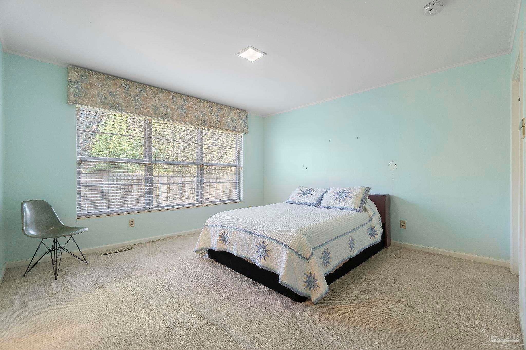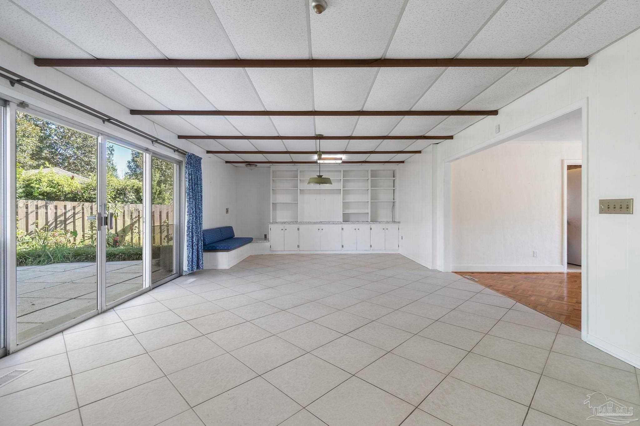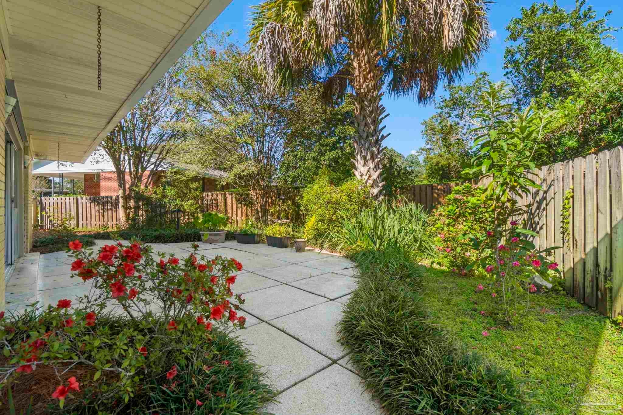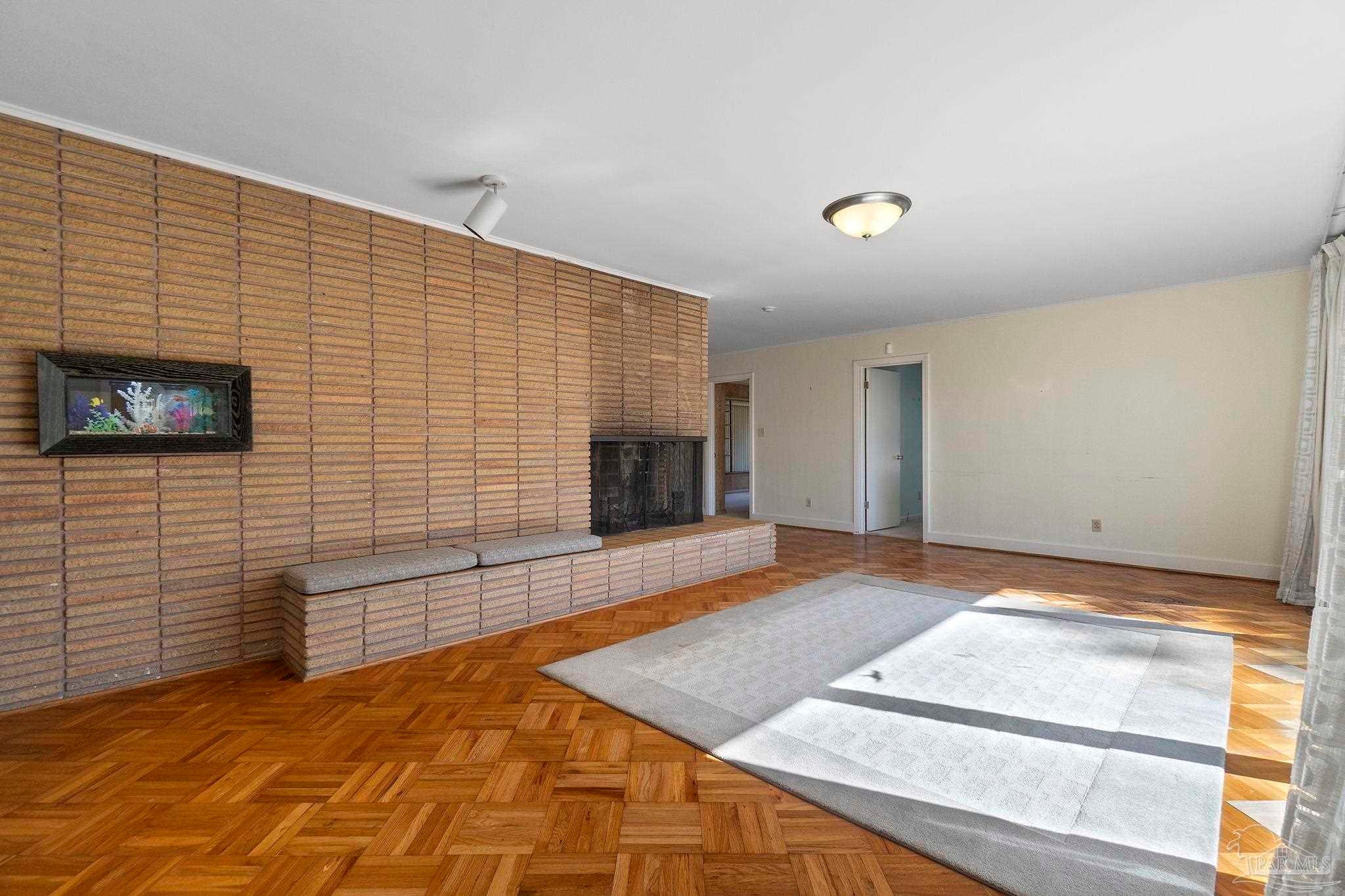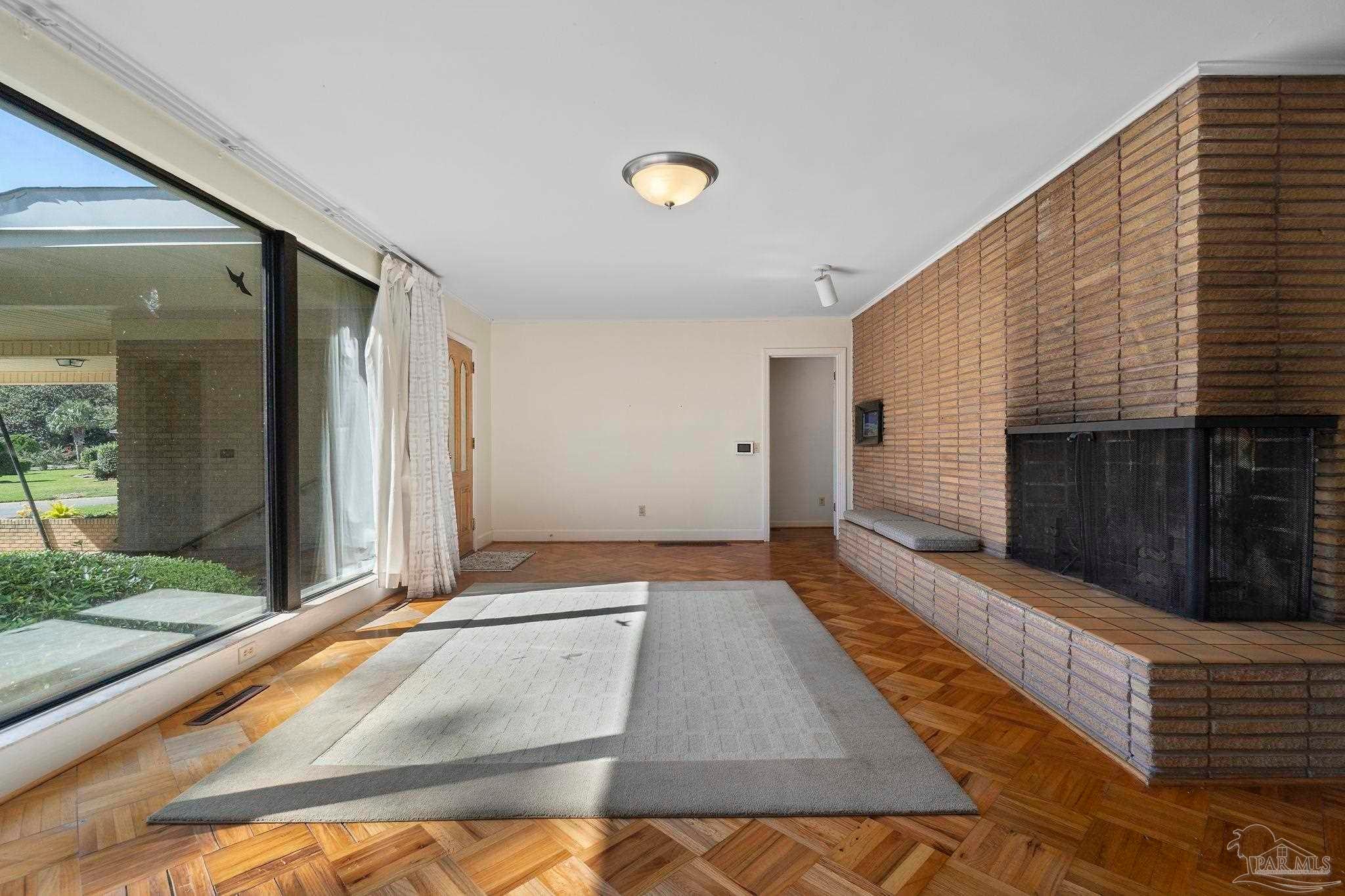 Welcome to this charming 5-bedroom, 2.5-bathroom home located on a desirable corner lot in beautiful Pensacola. This residence showcases distinctive Frank Lloyd Wright-inspired architectural elements that add both character and allure. Upon entering, you will appreciate the inviting living area, featuring a cozy wood-burning fireplace, built in fish tank with a large, picturesque window to let in the natural light & hardwood parquet-style flooring. Underneath the existing carpeting in the home, the hardwood flooring presents an opportunity for elegant restoration. The thoughtfully designed split floor plan places a primary suite on each side of the home, enhancing privacy and functionality. At the rear, a spacious family room awaits, complete with exquisite built-in shelves, electric fireplace and a wet bar, perfect for entertaining or casual gatherings. This room is illuminated by natural light, thanks to its access to the lush, fully fenced backyard, providing a serene outdoor escape. The backyard is highlighted by extensive landscaping, offering a vivid array of plants that create a picturesque setting for relaxation or outdoor activities. Additionally an exterior shed for tools and garden supplies and a workshop area catering to hobbyists or those needing extra space. An intriguing aspect of this property is the bomb shelter located in the side yard, available for viewing upon signing a hold harmless agreement. This unique feature adds an element of historical interest and functionality. This home’s remarkable features combined with its ideal location with a park across the street with beautiful mature large oak trees, trails, and that property will never be built on make it a perfect choice for those seeking both character and comfort. Don’t miss the opportunity to make this distinctive property your own!