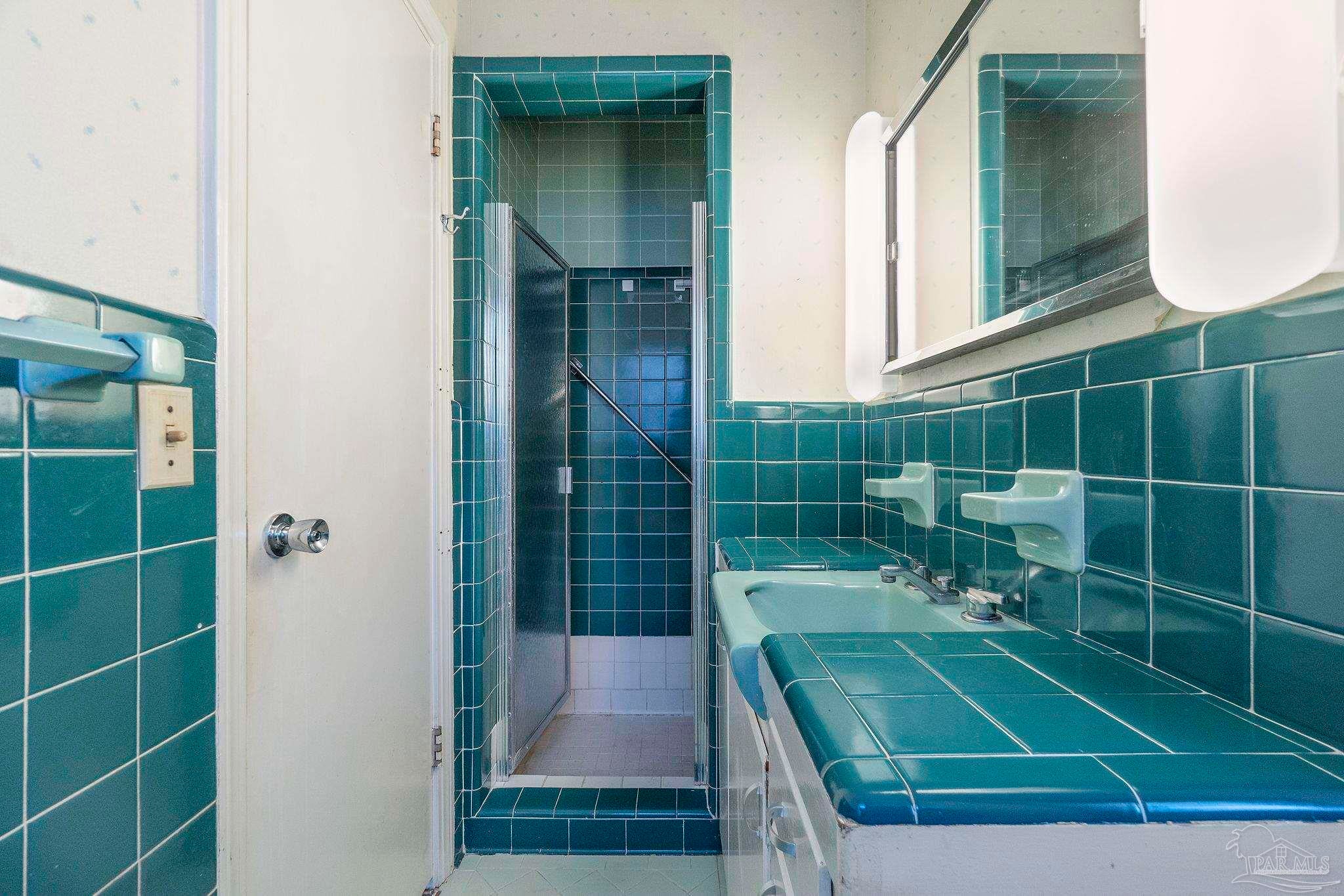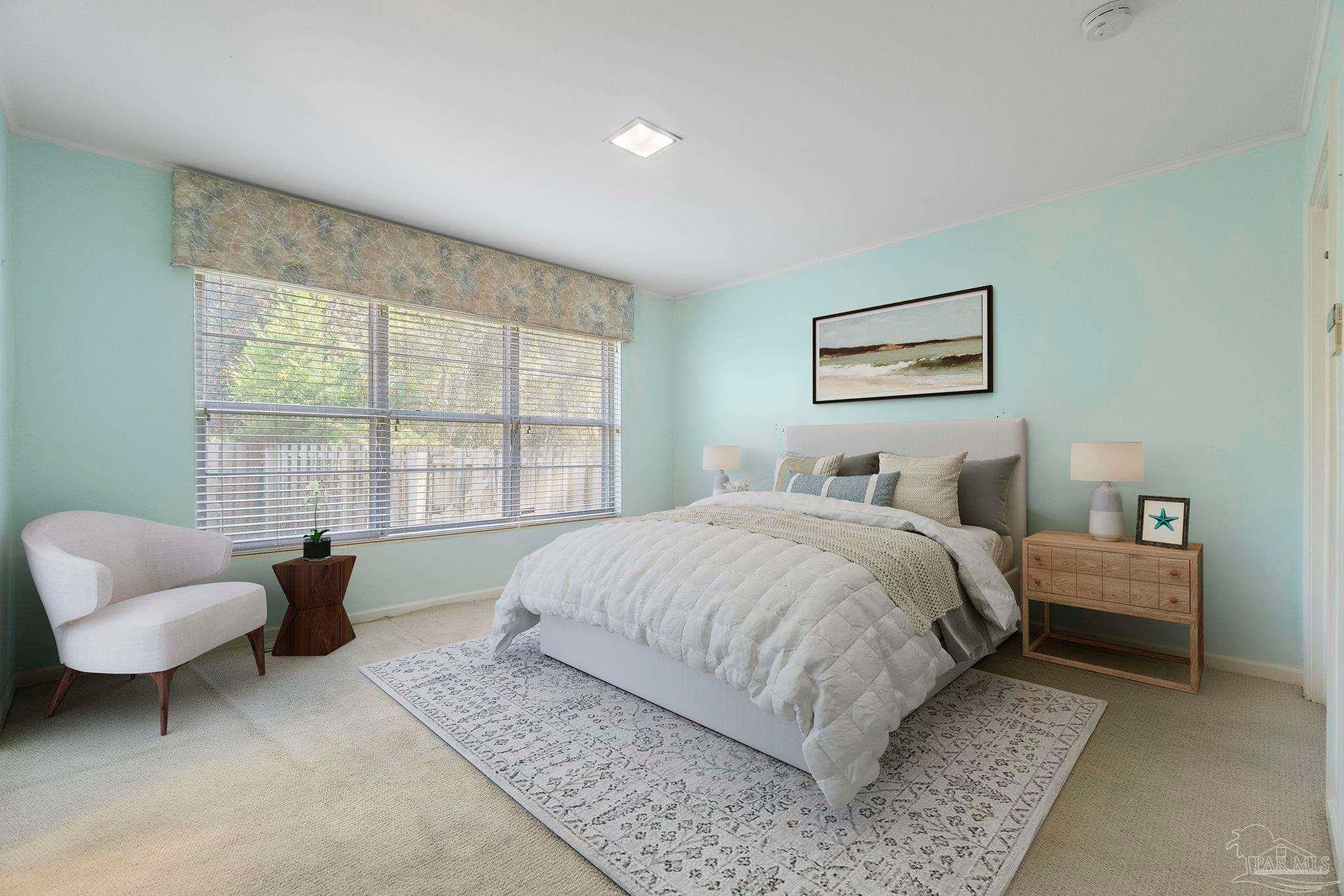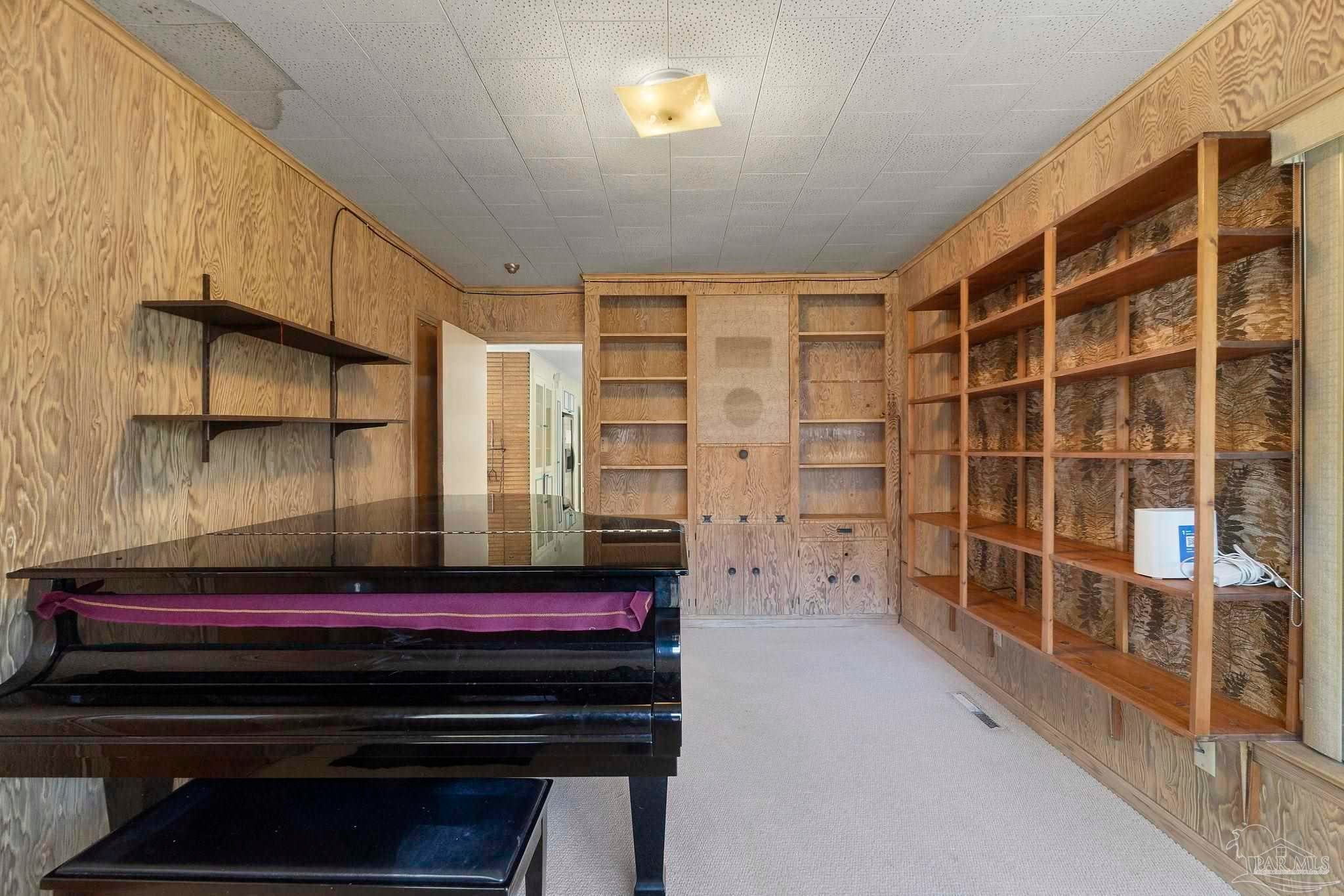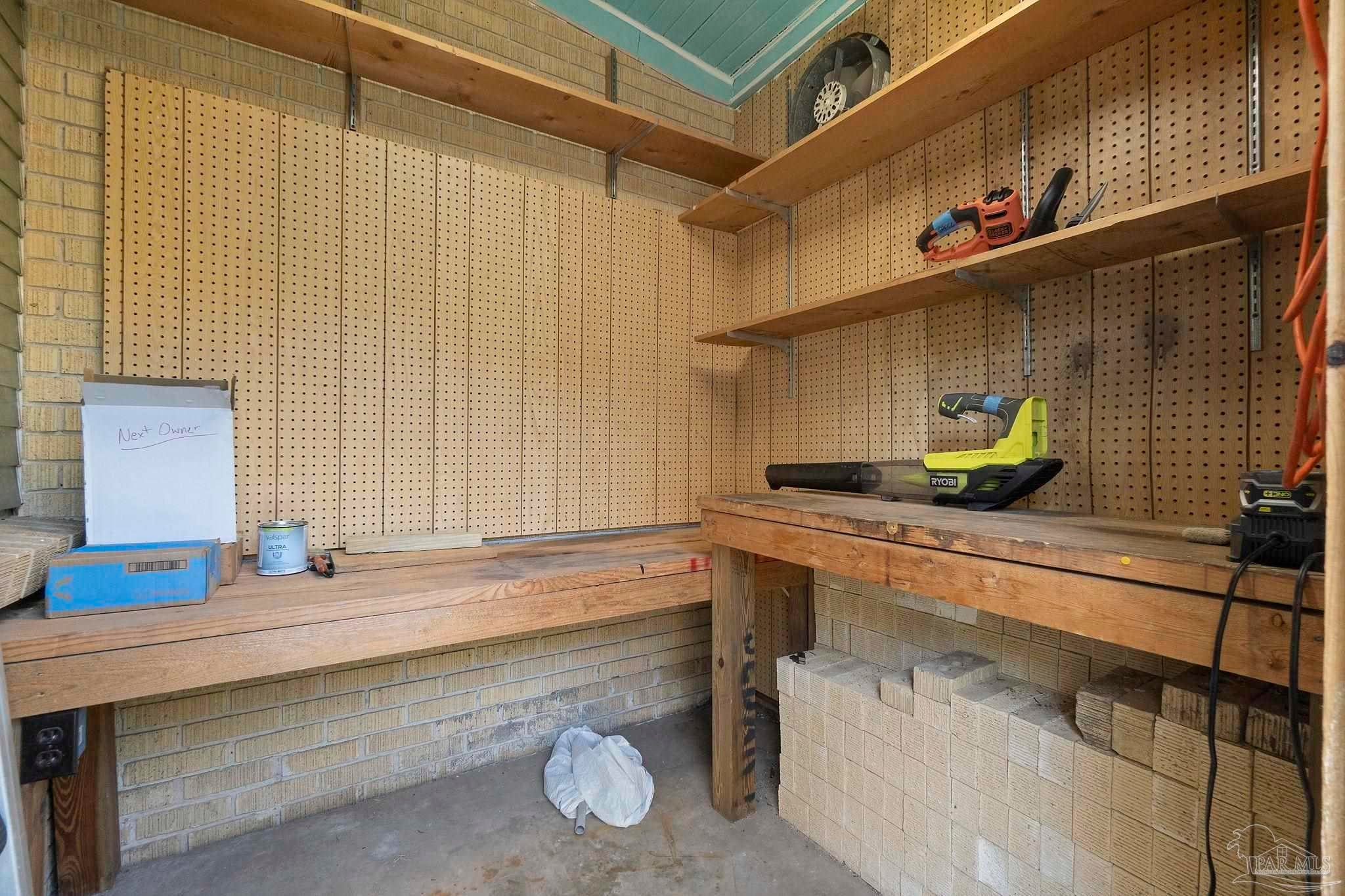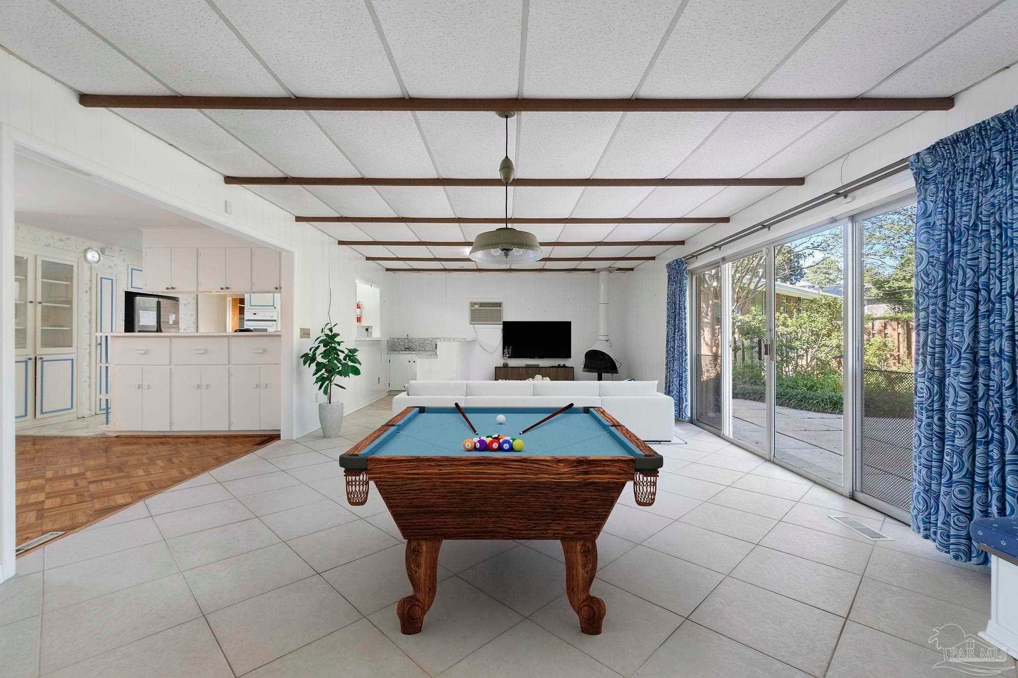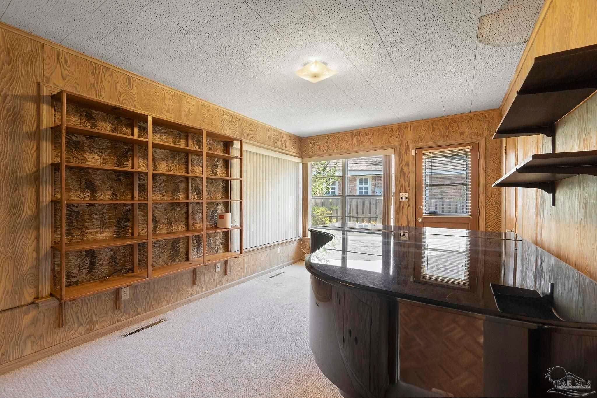 Welcome to this charming 5-bedroom, 2.5-bathroom home located on a desirable corner lot in beautiful Pensacola. This residence showcases distinctive Frank Lloyd Wright-inspired architectural elements that add both character and allure. Upon entering, you will appreciate the inviting living area, featuring a cozy wood-burning fireplace, built in fish tank with a large, picturesque window to let in the natural light & hardwood parquet-style flooring. Underneath the existing carpeting in the home, the hardwood flooring presents an opportunity for elegant restoration. The thoughtfully designed split floor plan places a primary suite on each side of the home, enhancing privacy and functionality. At the rear, a spacious family room awaits, complete with exquisite built-in shelves, electric fireplace and a wet bar, perfect for entertaining or casual gatherings. This room is illuminated by natural light, thanks to its access to the lush, fully fenced backyard, providing a serene outdoor escape. The backyard is highlighted by extensive landscaping, offering a vivid array of plants that create a picturesque setting for relaxation or outdoor activities. Additionally an exterior shed for tools and garden supplies and a workshop area catering to hobbyists or those needing extra space. An intriguing aspect of this property is the bomb shelter located in the side yard, available for viewing upon signing a hold harmless agreement. This unique feature adds an element of historical interest and functionality. This home’s remarkable features combined with its ideal location with a park across the street with beautiful mature large oak trees, trails, and that property will never be built on make it a perfect choice for those seeking both character and comfort. Don’t miss the opportunity to make this distinctive property your own!