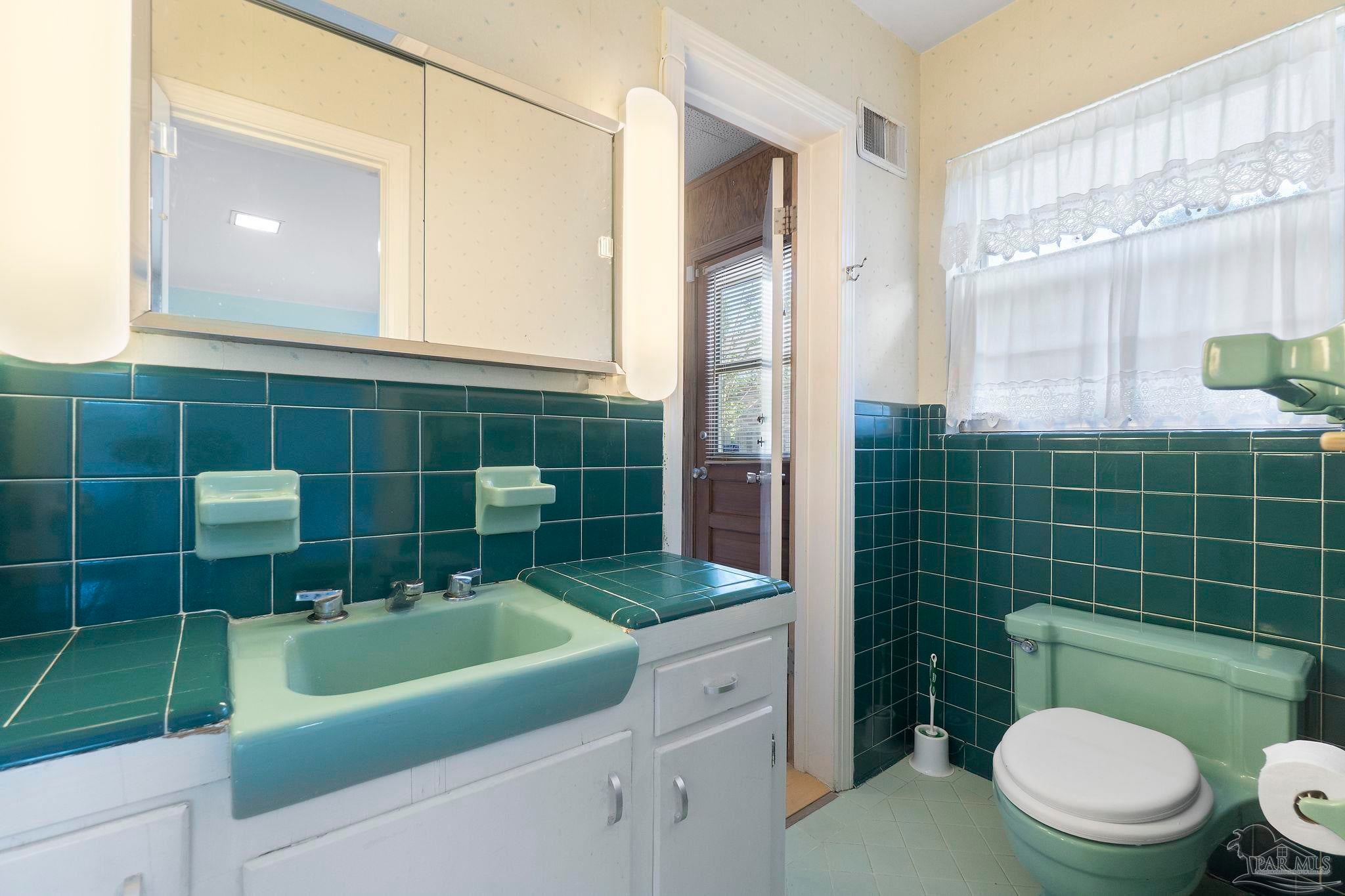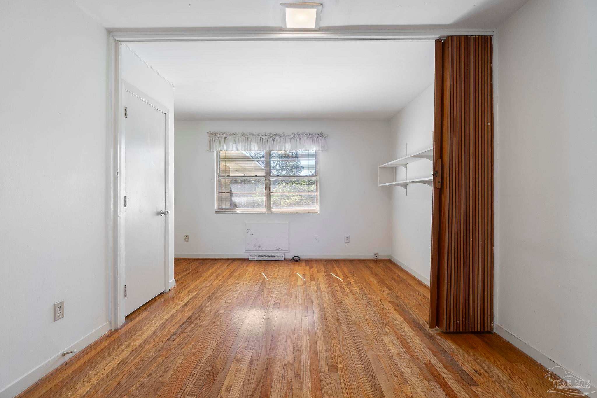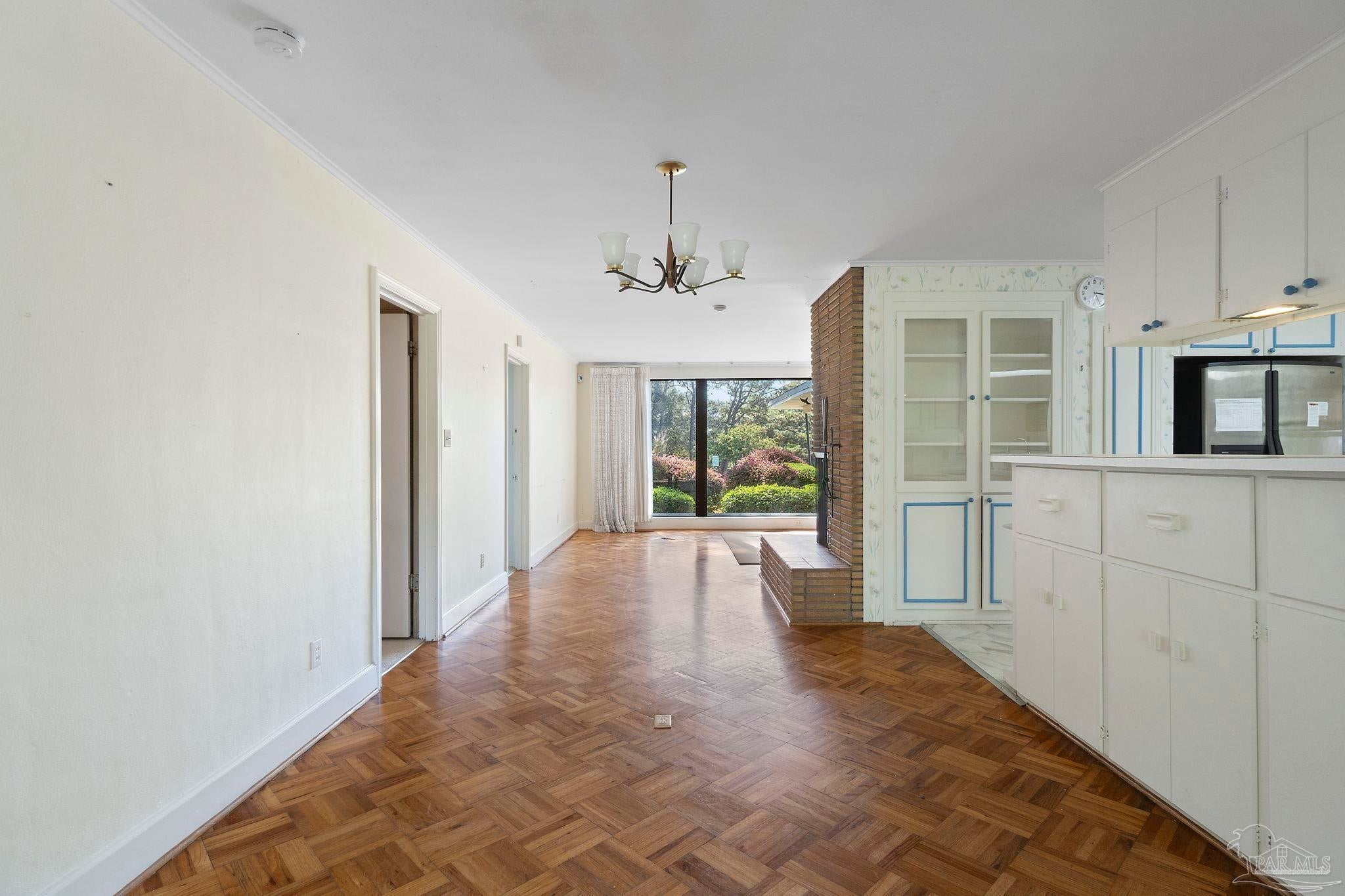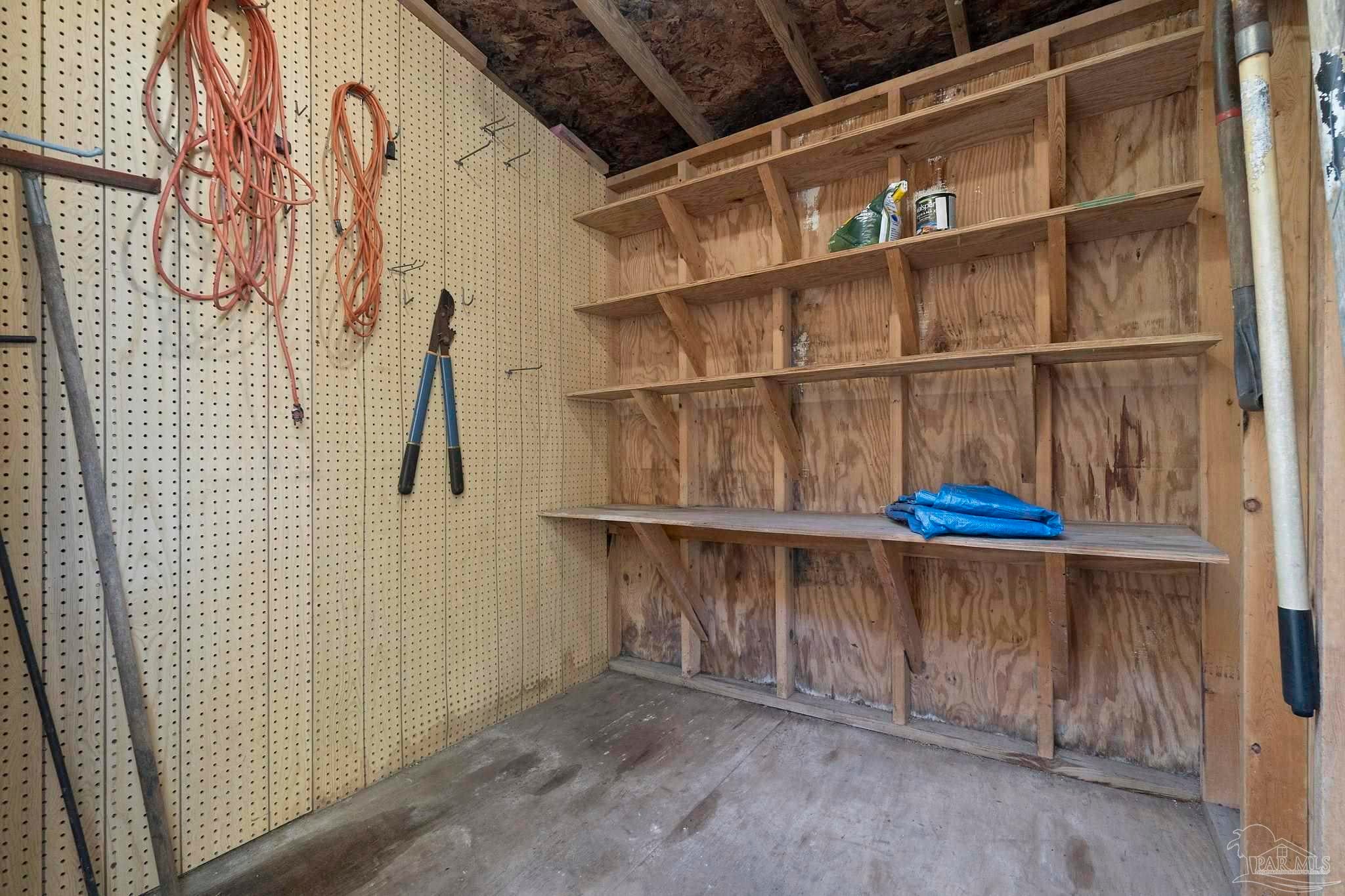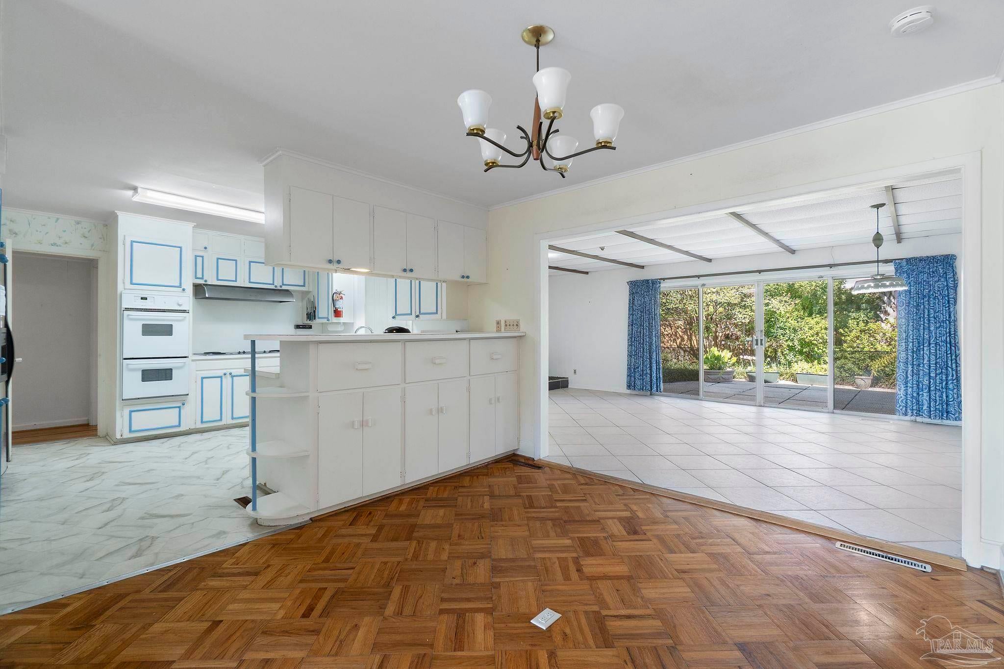 Welcome to this charming 5-bedroom, 2.5-bathroom home located on a desirable corner lot in beautiful Pensacola. This residence showcases distinctive Frank Lloyd Wright-inspired architectural elements that add both character and allure. Upon entering, you will appreciate the inviting living area, featuring a cozy wood-burning fireplace, built in fish tank with a large, picturesque window to let in the natural light & hardwood parquet-style flooring. Underneath the existing carpeting in the home, the hardwood flooring presents an opportunity for elegant restoration. The thoughtfully designed split floor plan places a primary suite on each side of the home, enhancing privacy and functionality. At the rear, a spacious family room awaits, complete with exquisite built-in shelves, electric fireplace and a wet bar, perfect for entertaining or casual gatherings. This room is illuminated by natural light, thanks to its access to the lush, fully fenced backyard, providing a serene outdoor escape. The backyard is highlighted by extensive landscaping, offering a vivid array of plants that create a picturesque setting for relaxation or outdoor activities. Additionally an exterior shed for tools and garden supplies and a workshop area catering to hobbyists or those needing extra space. An intriguing aspect of this property is the bomb shelter located in the side yard, available for viewing upon signing a hold harmless agreement. This unique feature adds an element of historical interest and functionality. This home’s remarkable features combined with its ideal location with a park across the street with beautiful mature large oak trees, trails, and that property will never be built on make it a perfect choice for those seeking both character and comfort. Don’t miss the opportunity to make this distinctive property your own!