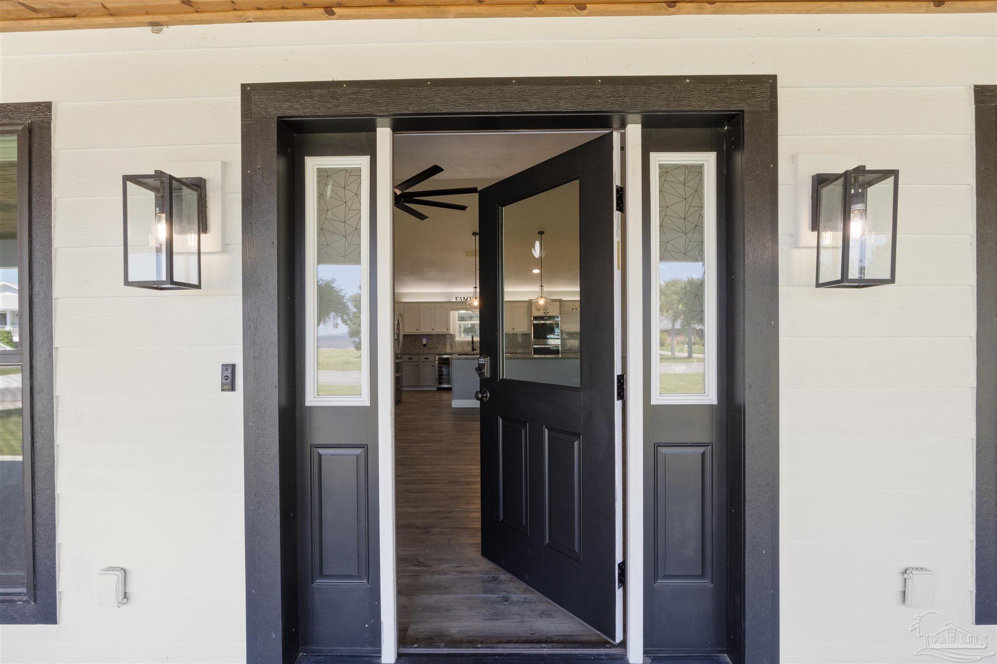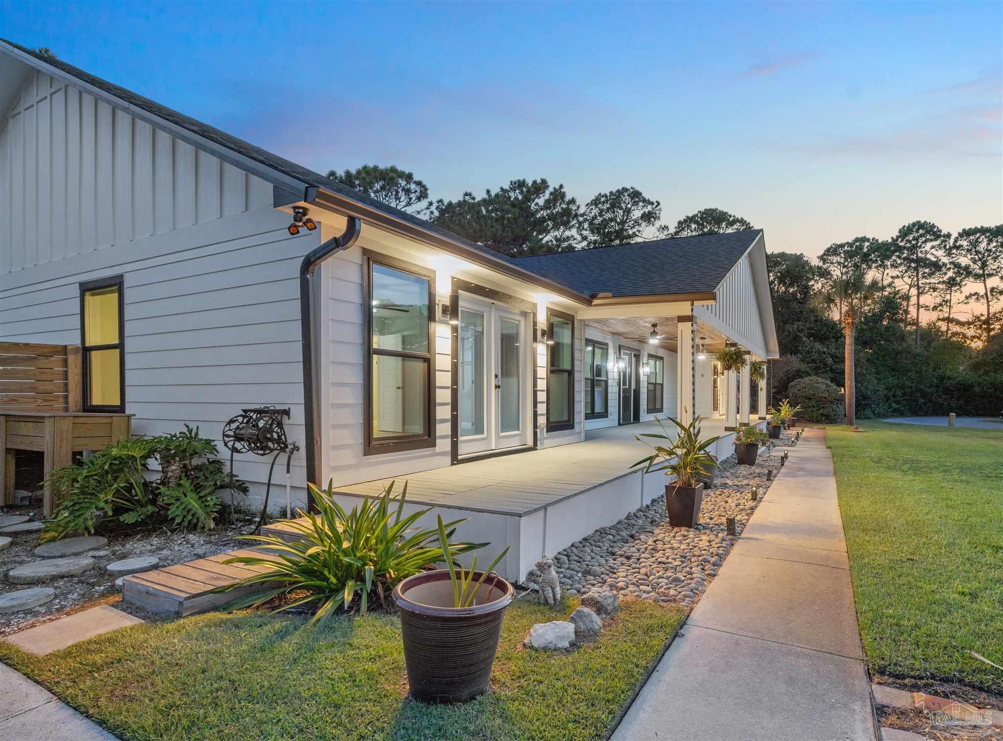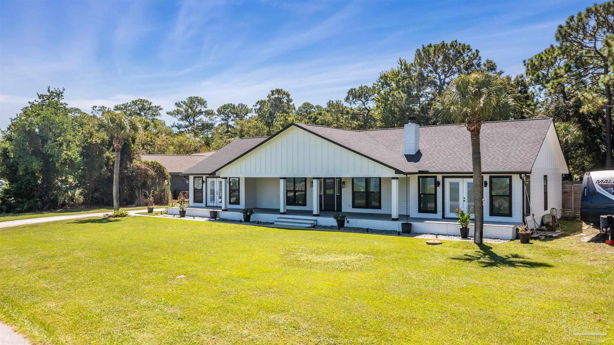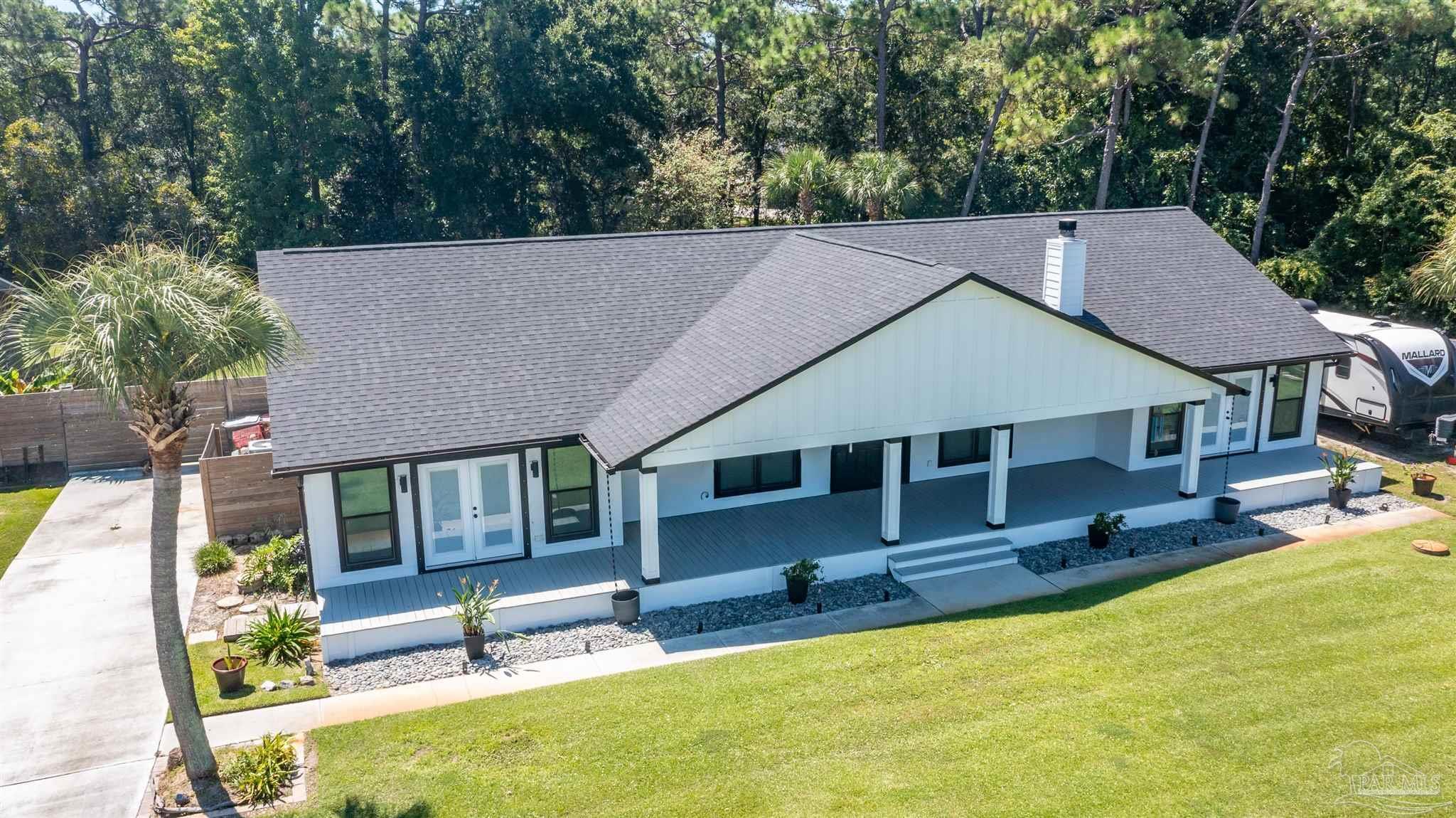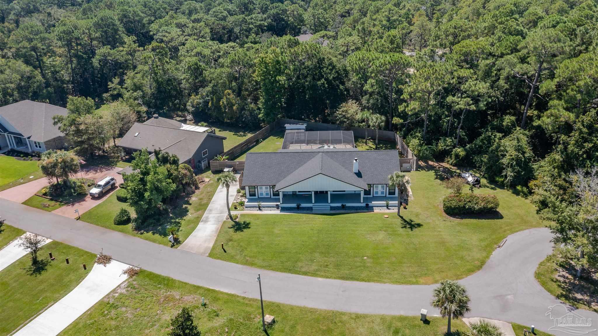 ENJOY PRIVACY, A SPACIOUS OPEN FLOOR PLAN WITH ABUNDANT NATURAL LIGHT THROUGHOUT, AND LIVING IN A GATED COMMUNITY ON A PRIVATE ISLAND. Located just minutes from NAS Pensacola, this custom 3BR/2BA home with pool offers modern luxury and coastal charm in the exclusive gated community of Innerarity Island. Set on an elevated cul-de-sac lot, the home features an open floor plan, soaring ceilings, impact-rated windows (2024), new doors (2024), smart-home upgrades, and glimpses of Perdido Bay from the wide front porch. The chef’s kitchen boasts a gas Thermador cooktop, wi-fi double ovens, granite counters, large island, walk-in pantry, spice pantry, wine fridge, and touch-activated faucet. French doors from multiple rooms open to the heated saltwater gunite pool (2020, new pump 2025) with tanning ledge, bubblers, flagstone coping, and paver deck (sealed 2025). Screen enclosure (2023), outdoor shower, she-shed/pool house, deckboard fence, 50-amp RV/EV service, and a sprinkler system powered by private well complete the backyard oasis. The primary suite offers French doors to the porch, walk-in closet, and spa-like bath with jetted tub, towel warmer, and oversized custom shower (2025). Guest rooms are spacious, with the front bedroom also opening to the porch. Guest bath updated with double vanity and polished tile. Additional features include heated/cooled Florida room, Nest thermostat, Ring cameras, fireplace, laundry with washer/dryer, and lush landscaped yard with mature trees and blueberry bushes. Community amenities include a bayfront pool, tennis courts, pickleball, basketball, kayak launch, park, and pier. Residents enjoy neighborhood traditions and abundant wildlife within this unique conservation-focused community. This is more than a home — it’s a lifestyle. Schedule your private showing today!