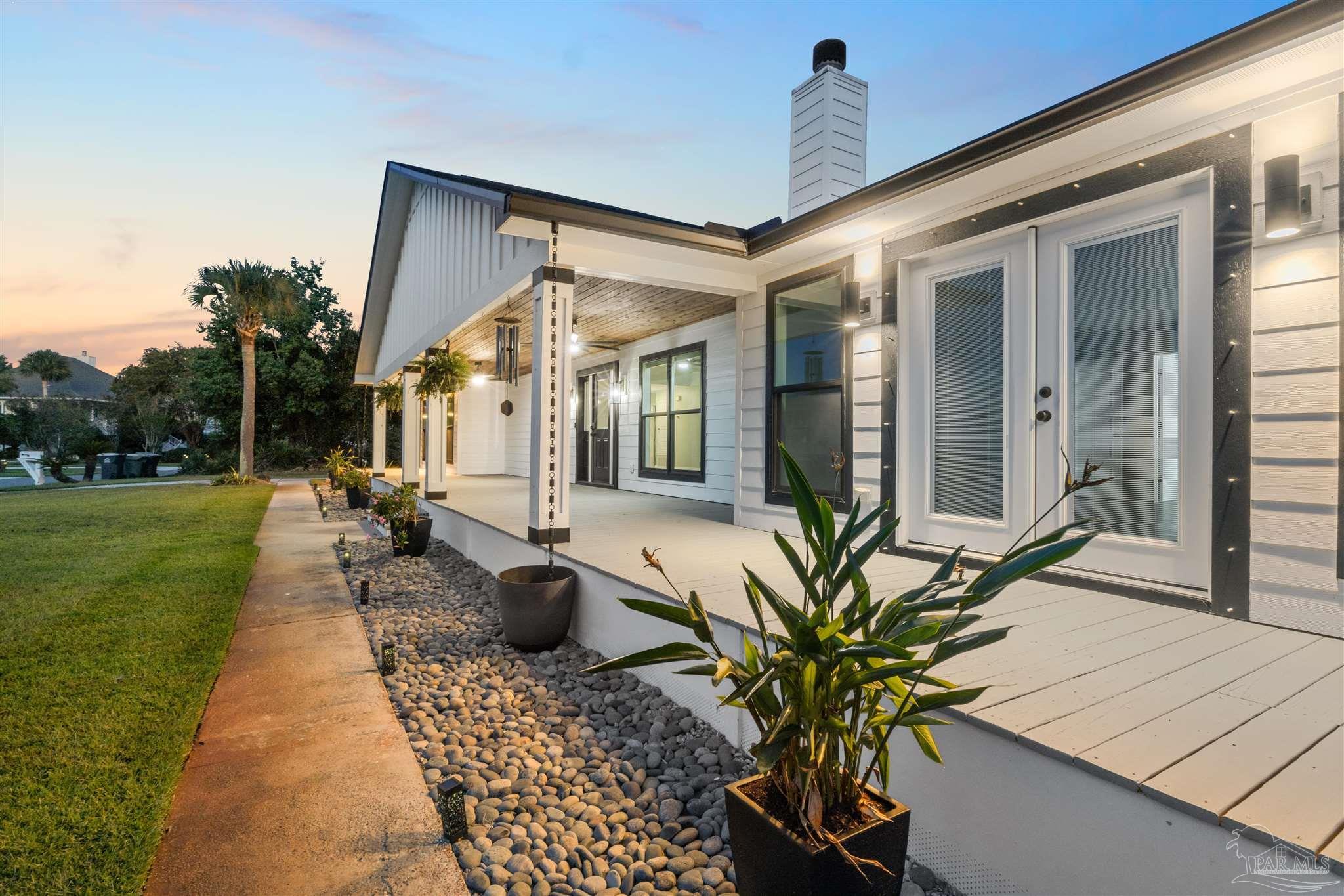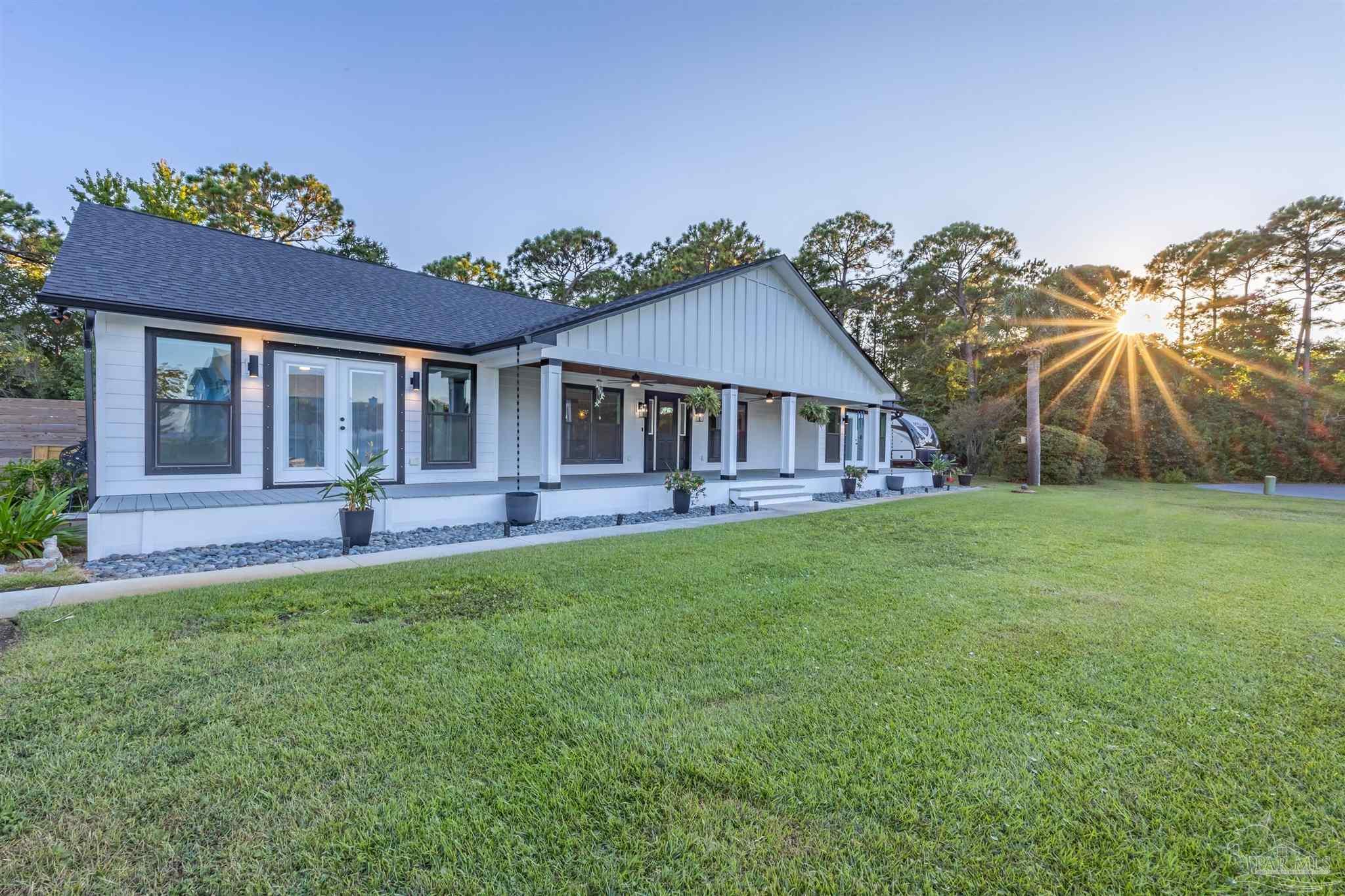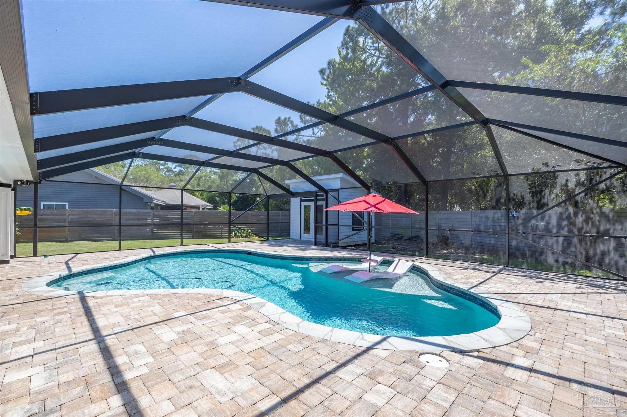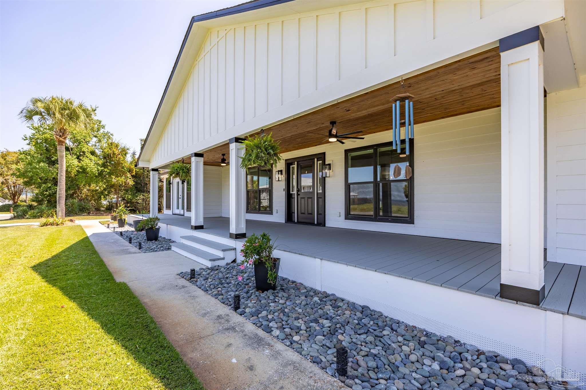 ENJOY PRIVACY, A SPACIOUS OPEN FLOOR PLAN WITH ABUNDANT NATURAL LIGHT THROUGHOUT, AND LIVING IN A GATED COMMUNITY ON A PRIVATE ISLAND. Located just minutes from NAS Pensacola, this custom 3BR/2BA home with pool offers modern luxury and coastal charm in the exclusive gated community of Innerarity Island. Set on an elevated cul-de-sac lot, the home features an open floor plan, soaring ceilings, impact-rated windows (2024), new doors (2024), smart-home upgrades, and glimpses of Perdido Bay from the wide front porch. The chef’s kitchen boasts a gas Thermador cooktop, wi-fi double ovens, granite counters, large island, walk-in pantry, spice pantry, wine fridge, and touch-activated faucet. French doors from multiple rooms open to the heated saltwater gunite pool (2020, new pump 2025) with tanning ledge, bubblers, flagstone coping, and paver deck (sealed 2025). Screen enclosure (2023), outdoor shower, she-shed/pool house, deckboard fence, 50-amp RV/EV service, and a sprinkler system powered by private well complete the backyard oasis. The primary suite offers French doors to the porch, walk-in closet, and spa-like bath with jetted tub, towel warmer, and oversized custom shower (2025). Guest rooms are spacious, with the front bedroom also opening to the porch. Guest bath updated with double vanity and polished tile. Additional features include heated/cooled Florida room, Nest thermostat, Ring cameras, fireplace, laundry with washer/dryer, and lush landscaped yard with mature trees and blueberry bushes. Community amenities include a bayfront pool, tennis courts, pickleball, basketball, kayak launch, park, and pier. Residents enjoy neighborhood traditions and abundant wildlife within this unique conservation-focused community. This is more than a home — it’s a lifestyle. Schedule your private showing today!