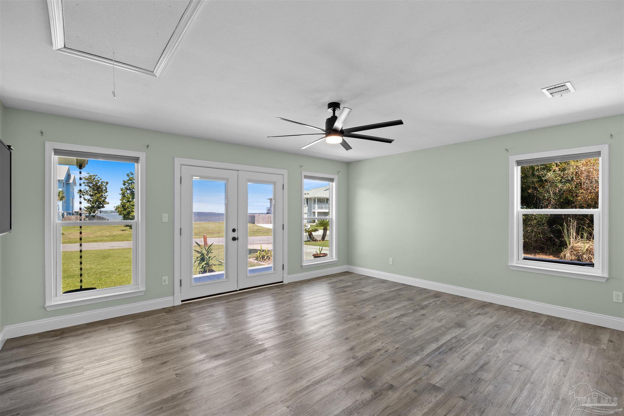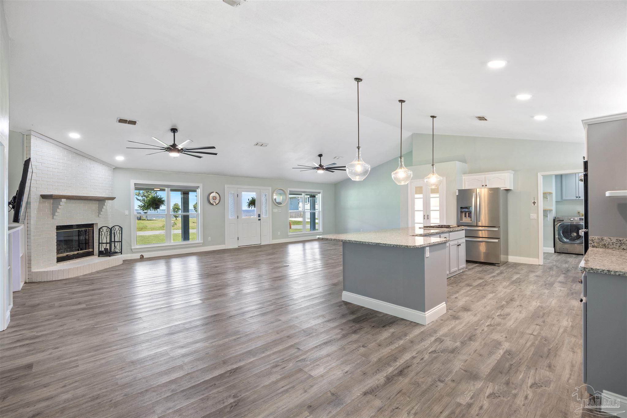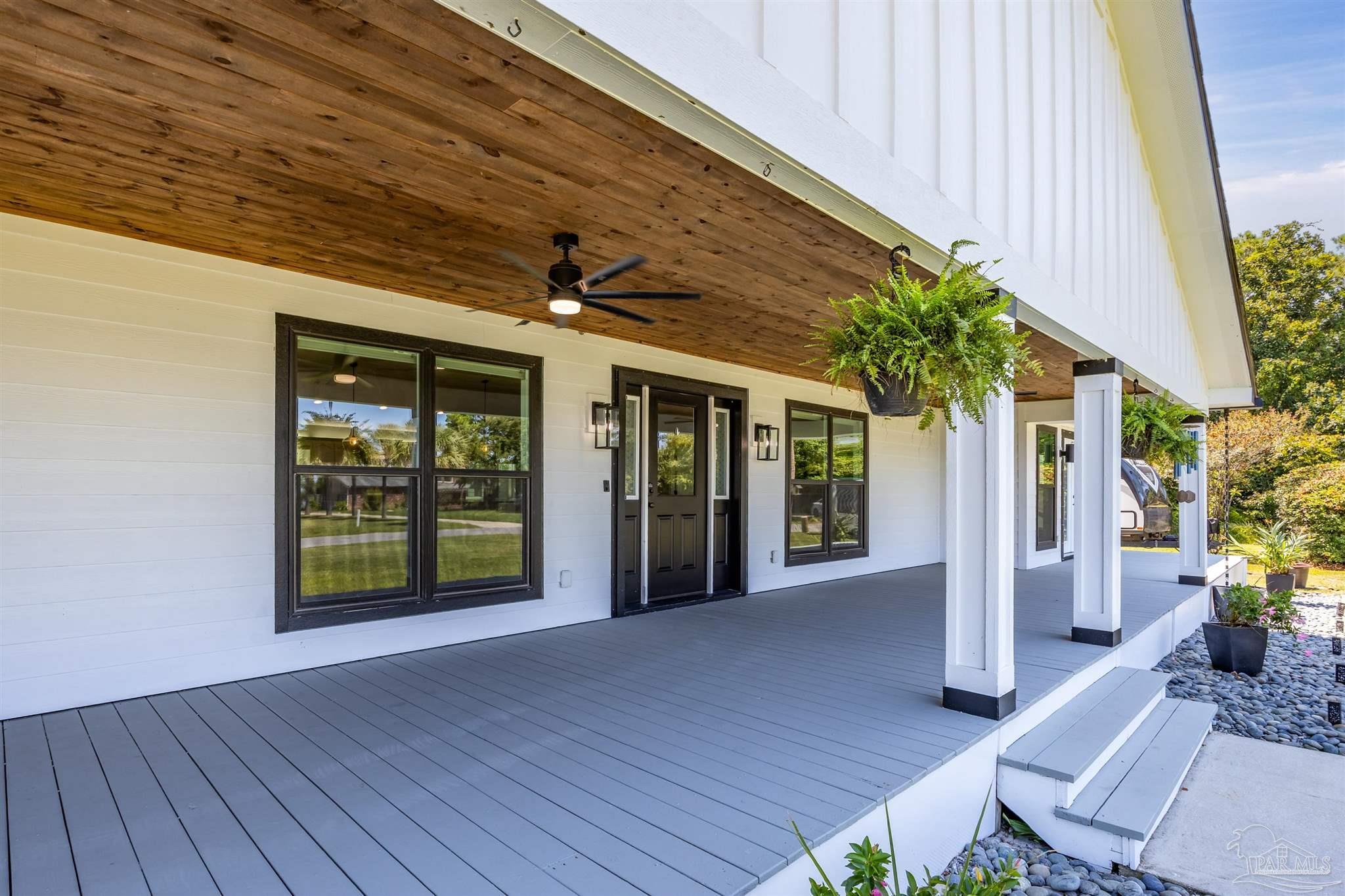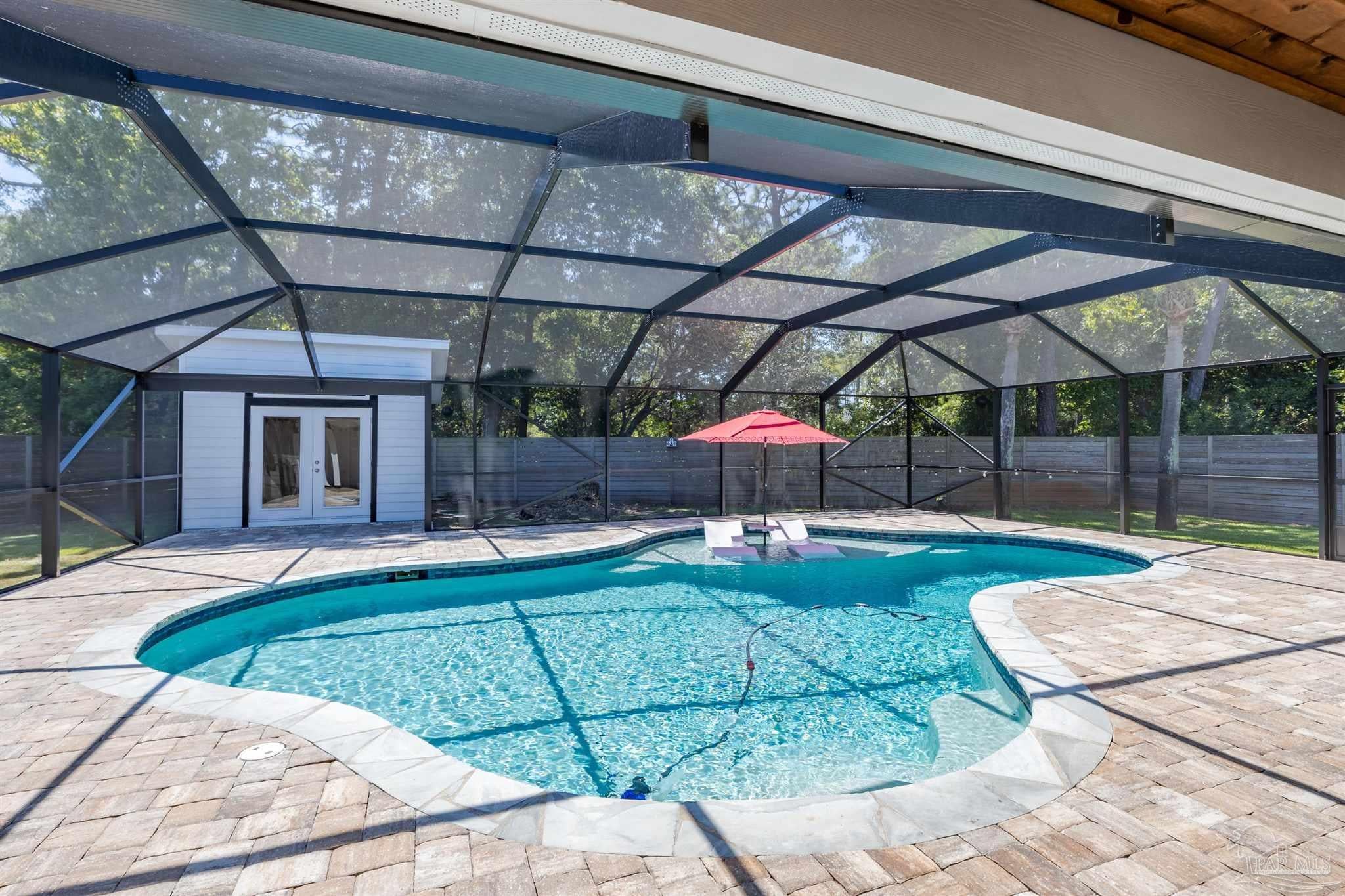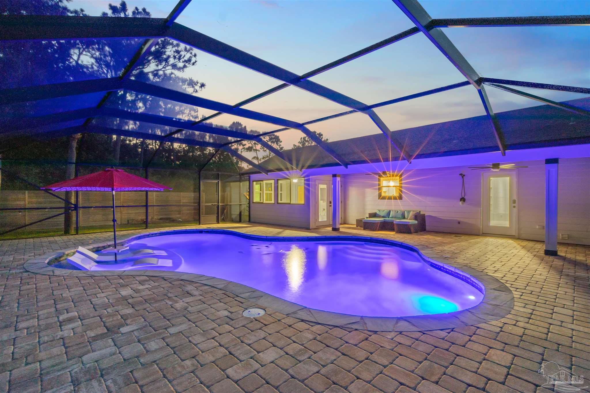 ENJOY PRIVACY, A SPACIOUS OPEN FLOOR PLAN WITH ABUNDANT NATURAL LIGHT THROUGHOUT, AND LIVING IN A GATED COMMUNITY ON A PRIVATE ISLAND. Located just minutes from NAS Pensacola, this custom 3BR/2BA home with pool offers modern luxury and coastal charm in the exclusive gated community of Innerarity Island. Set on an elevated cul-de-sac lot, the home features an open floor plan, soaring ceilings, impact-rated windows (2024), new doors (2024), smart-home upgrades, and glimpses of Perdido Bay from the wide front porch. The chef’s kitchen boasts a gas Thermador cooktop, wi-fi double ovens, granite counters, large island, walk-in pantry, spice pantry, wine fridge, and touch-activated faucet. French doors from multiple rooms open to the heated saltwater gunite pool (2020, new pump 2025) with tanning ledge, bubblers, flagstone coping, and paver deck (sealed 2025). Screen enclosure (2023), outdoor shower, she-shed/pool house, deckboard fence, 50-amp RV/EV service, and a sprinkler system powered by private well complete the backyard oasis. The primary suite offers French doors to the porch, walk-in closet, and spa-like bath with jetted tub, towel warmer, and oversized custom shower (2025). Guest rooms are spacious, with the front bedroom also opening to the porch. Guest bath updated with double vanity and polished tile. Additional features include heated/cooled Florida room, Nest thermostat, Ring cameras, fireplace, laundry with washer/dryer, and lush landscaped yard with mature trees and blueberry bushes. Community amenities include a bayfront pool, tennis courts, pickleball, basketball, kayak launch, park, and pier. Residents enjoy neighborhood traditions and abundant wildlife within this unique conservation-focused community. This is more than a home — it’s a lifestyle. Schedule your private showing today!