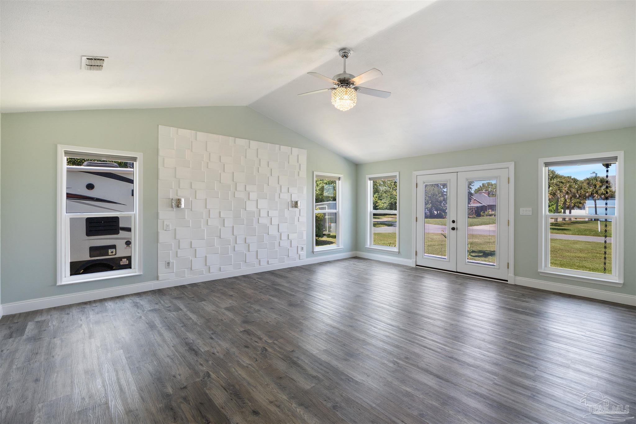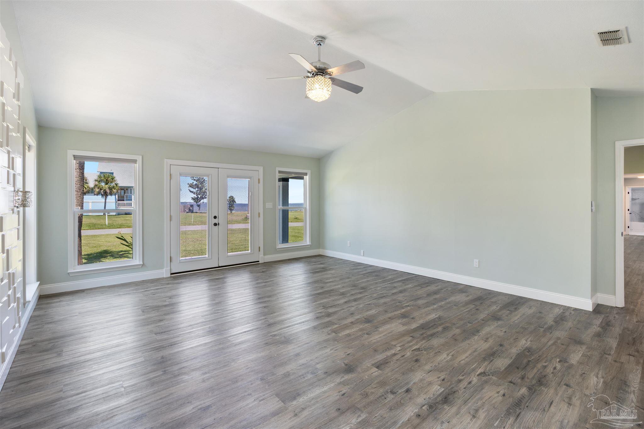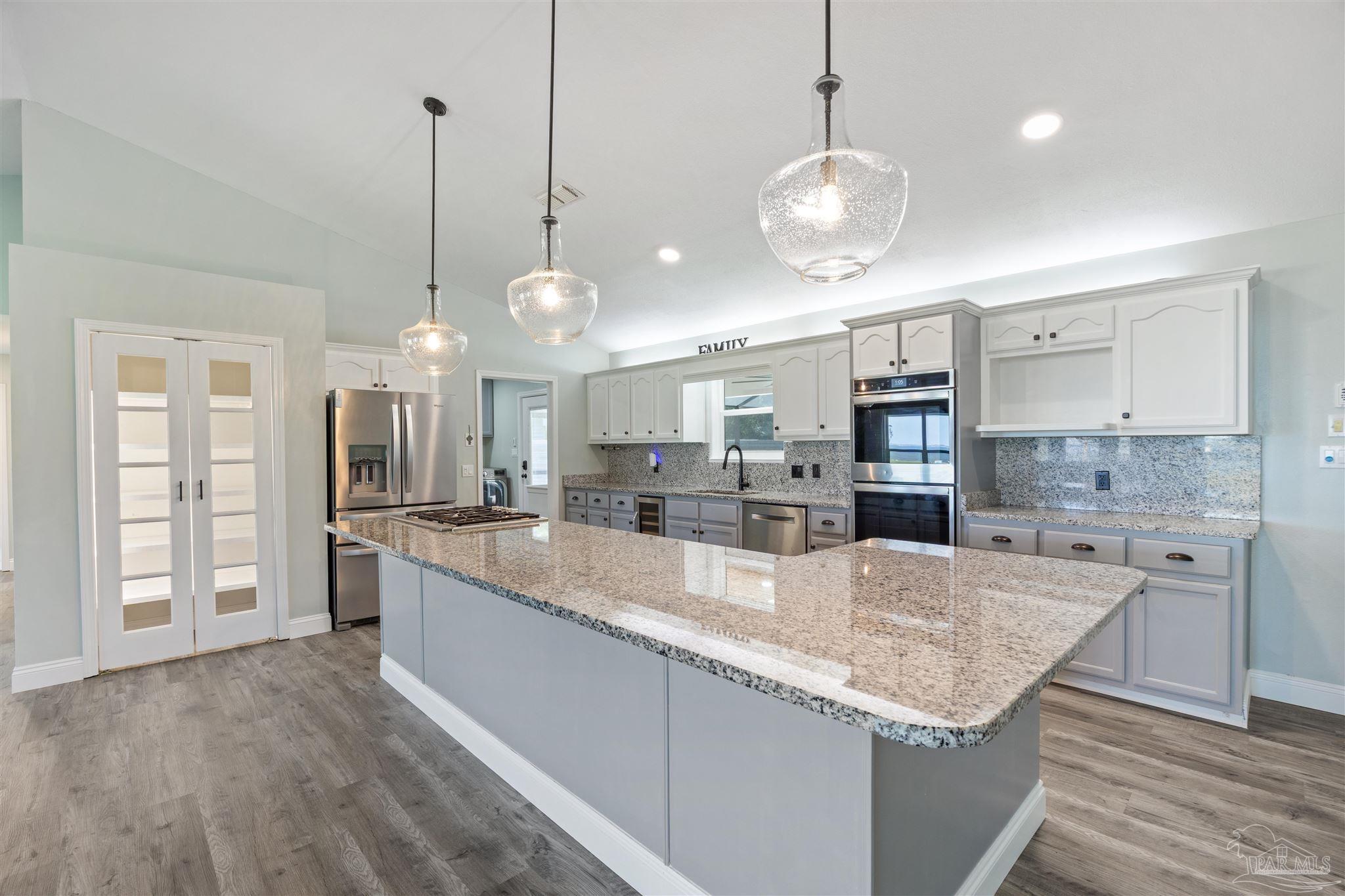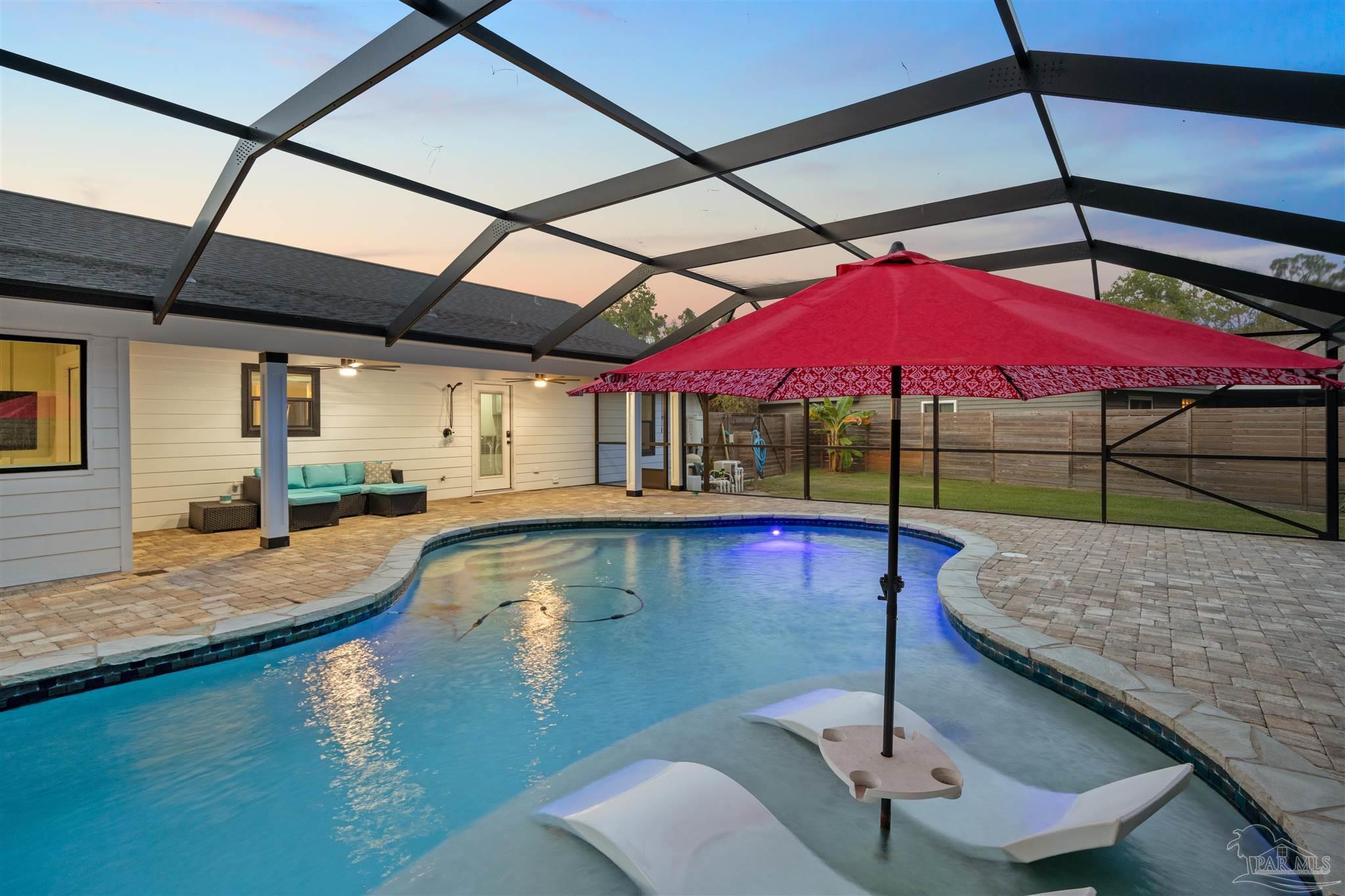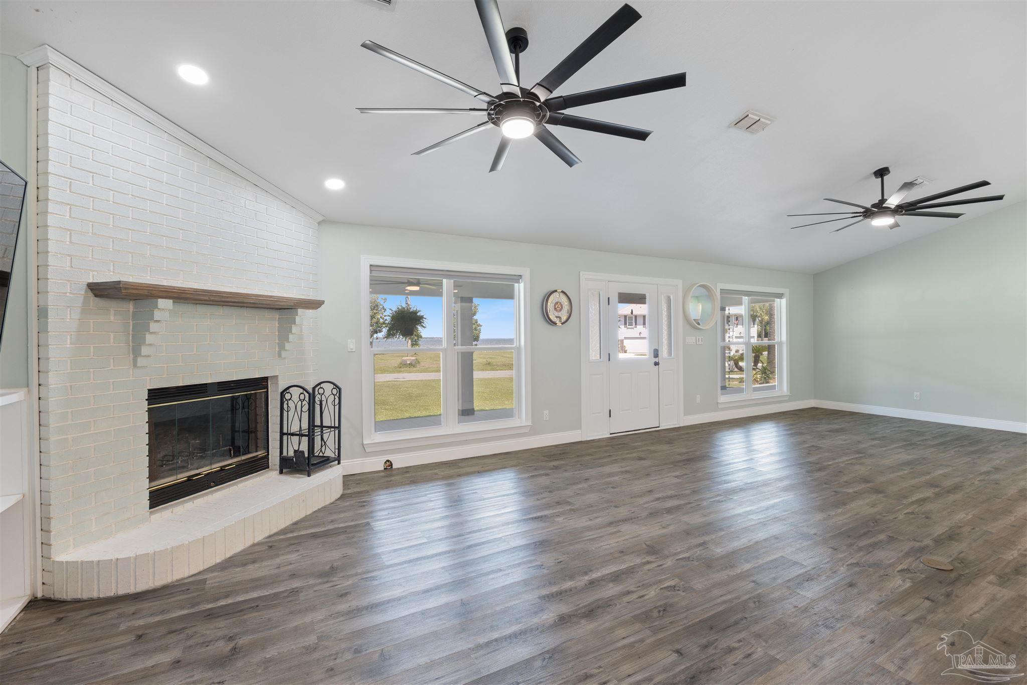 ENJOY PRIVACY, A SPACIOUS OPEN FLOOR PLAN WITH ABUNDANT NATURAL LIGHT THROUGHOUT, AND LIVING IN A GATED COMMUNITY ON A PRIVATE ISLAND. Located just minutes from NAS Pensacola, this custom 3BR/2BA home with pool offers modern luxury and coastal charm in the exclusive gated community of Innerarity Island. Set on an elevated cul-de-sac lot, the home features an open floor plan, soaring ceilings, impact-rated windows (2024), new doors (2024), smart-home upgrades, and glimpses of Perdido Bay from the wide front porch. The chef’s kitchen boasts a gas Thermador cooktop, wi-fi double ovens, granite counters, large island, walk-in pantry, spice pantry, wine fridge, and touch-activated faucet. French doors from multiple rooms open to the heated saltwater gunite pool (2020, new pump 2025) with tanning ledge, bubblers, flagstone coping, and paver deck (sealed 2025). Screen enclosure (2023), outdoor shower, she-shed/pool house, deckboard fence, 50-amp RV/EV service, and a sprinkler system powered by private well complete the backyard oasis. The primary suite offers French doors to the porch, walk-in closet, and spa-like bath with jetted tub, towel warmer, and oversized custom shower (2025). Guest rooms are spacious, with the front bedroom also opening to the porch. Guest bath updated with double vanity and polished tile. Additional features include heated/cooled Florida room, Nest thermostat, Ring cameras, fireplace, laundry with washer/dryer, and lush landscaped yard with mature trees and blueberry bushes. Community amenities include a bayfront pool, tennis courts, pickleball, basketball, kayak launch, park, and pier. Residents enjoy neighborhood traditions and abundant wildlife within this unique conservation-focused community. This is more than a home — it’s a lifestyle. Schedule your private showing today!