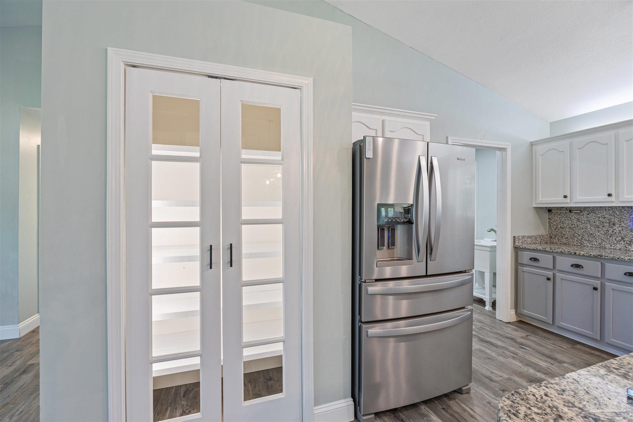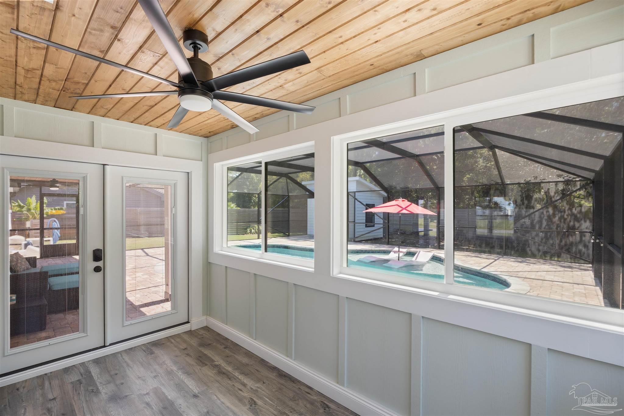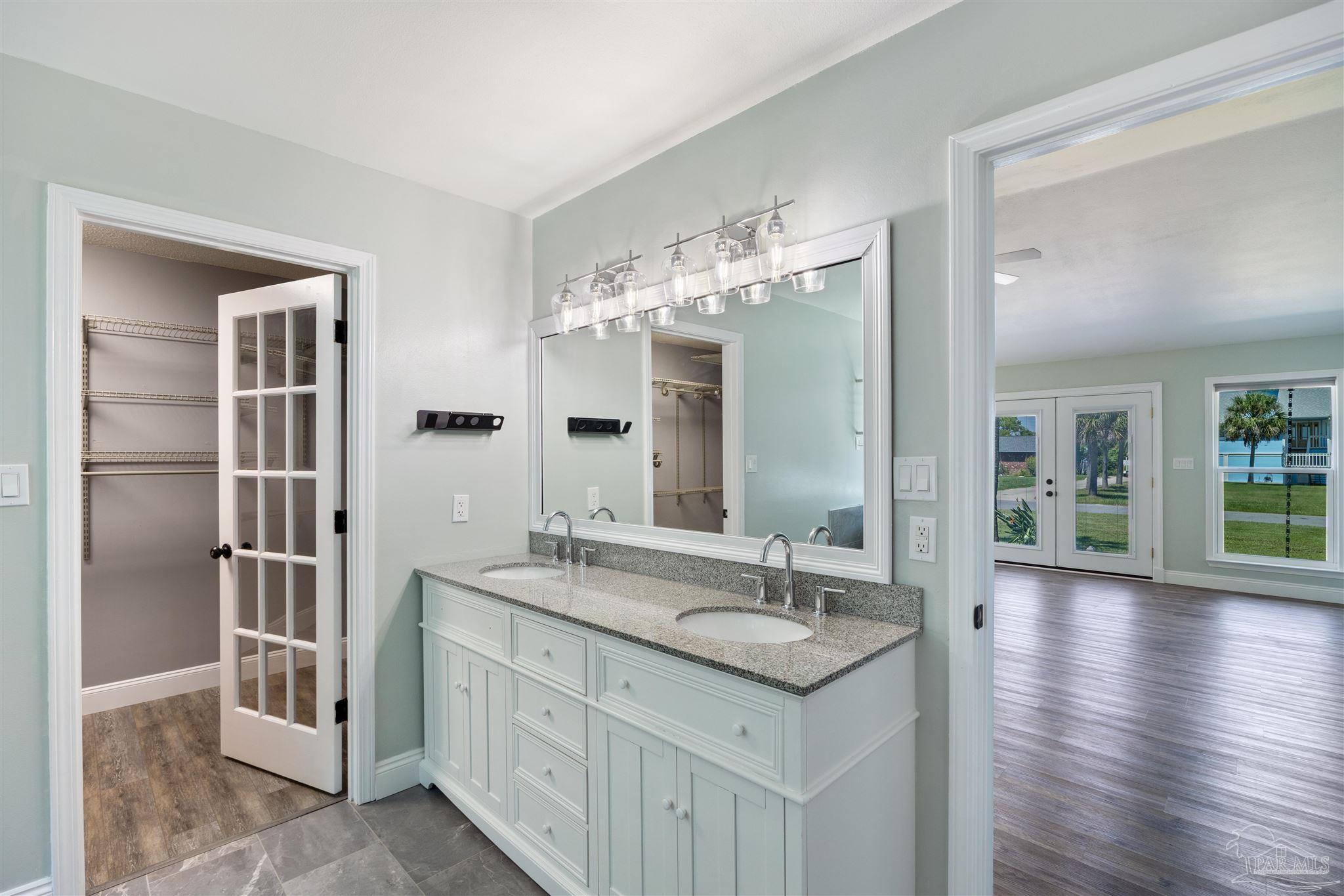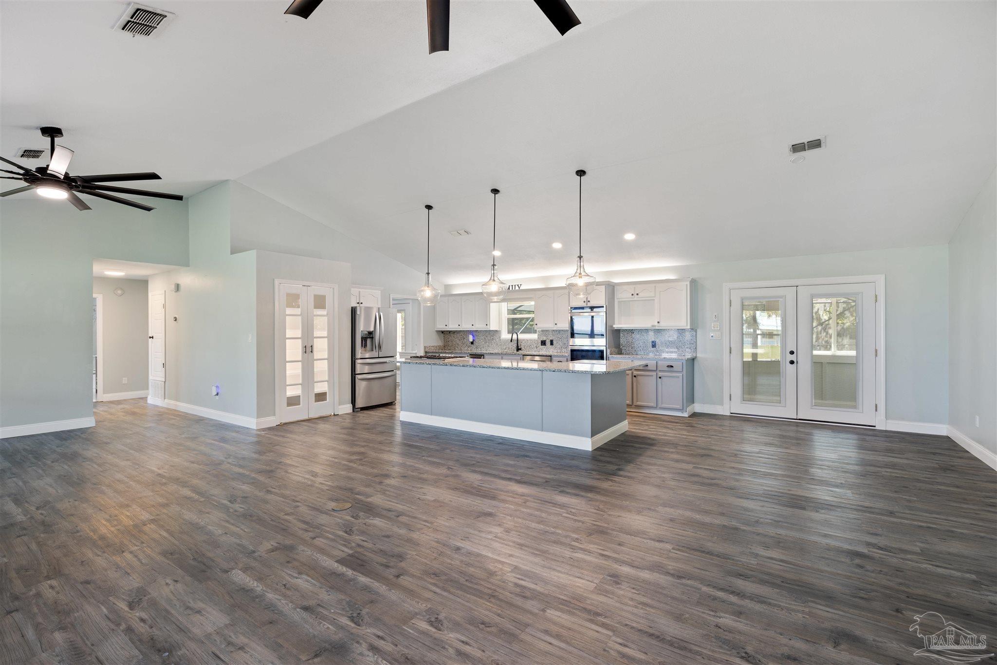 ENJOY PRIVACY, A SPACIOUS OPEN FLOOR PLAN WITH ABUNDANT NATURAL LIGHT THROUGHOUT, AND LIVING IN A GATED COMMUNITY ON A PRIVATE ISLAND. Located just minutes from NAS Pensacola, this custom 3BR/2BA home with pool offers modern luxury and coastal charm in the exclusive gated community of Innerarity Island. Set on an elevated cul-de-sac lot, the home features an open floor plan, soaring ceilings, impact-rated windows (2024), new doors (2024), smart-home upgrades, and glimpses of Perdido Bay from the wide front porch. The chef’s kitchen boasts a gas Thermador cooktop, wi-fi double ovens, granite counters, large island, walk-in pantry, spice pantry, wine fridge, and touch-activated faucet. French doors from multiple rooms open to the heated saltwater gunite pool (2020, new pump 2025) with tanning ledge, bubblers, flagstone coping, and paver deck (sealed 2025). Screen enclosure (2023), outdoor shower, she-shed/pool house, deckboard fence, 50-amp RV/EV service, and a sprinkler system powered by private well complete the backyard oasis. The primary suite offers French doors to the porch, walk-in closet, and spa-like bath with jetted tub, towel warmer, and oversized custom shower (2025). Guest rooms are spacious, with the front bedroom also opening to the porch. Guest bath updated with double vanity and polished tile. Additional features include heated/cooled Florida room, Nest thermostat, Ring cameras, fireplace, laundry with washer/dryer, and lush landscaped yard with mature trees and blueberry bushes. Community amenities include a bayfront pool, tennis courts, pickleball, basketball, kayak launch, park, and pier. Residents enjoy neighborhood traditions and abundant wildlife within this unique conservation-focused community. This is more than a home — it’s a lifestyle. Schedule your private showing today!