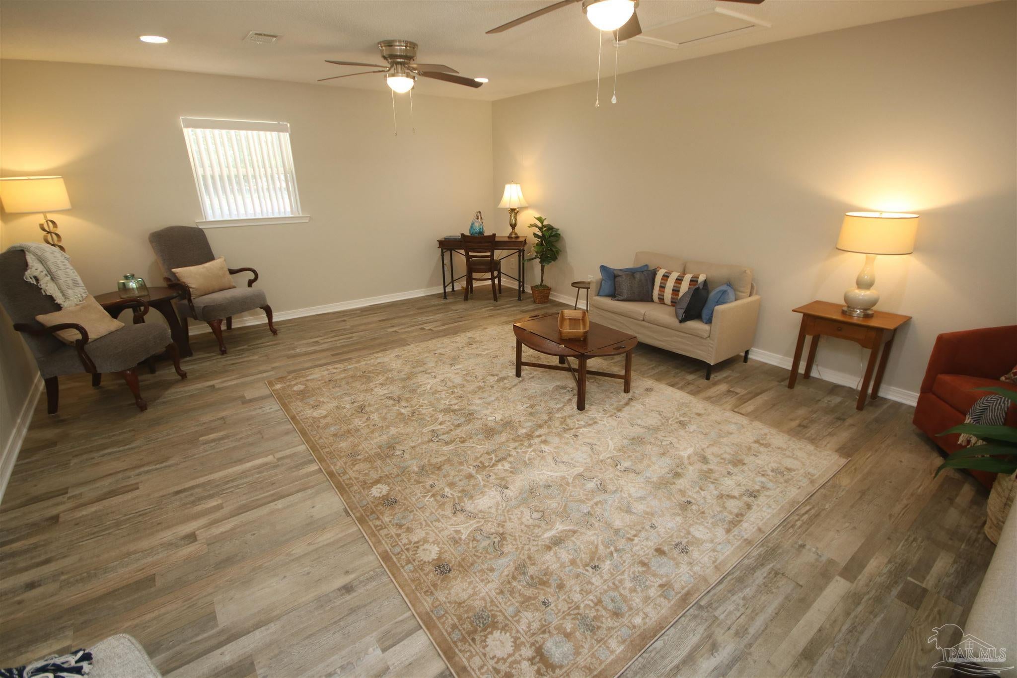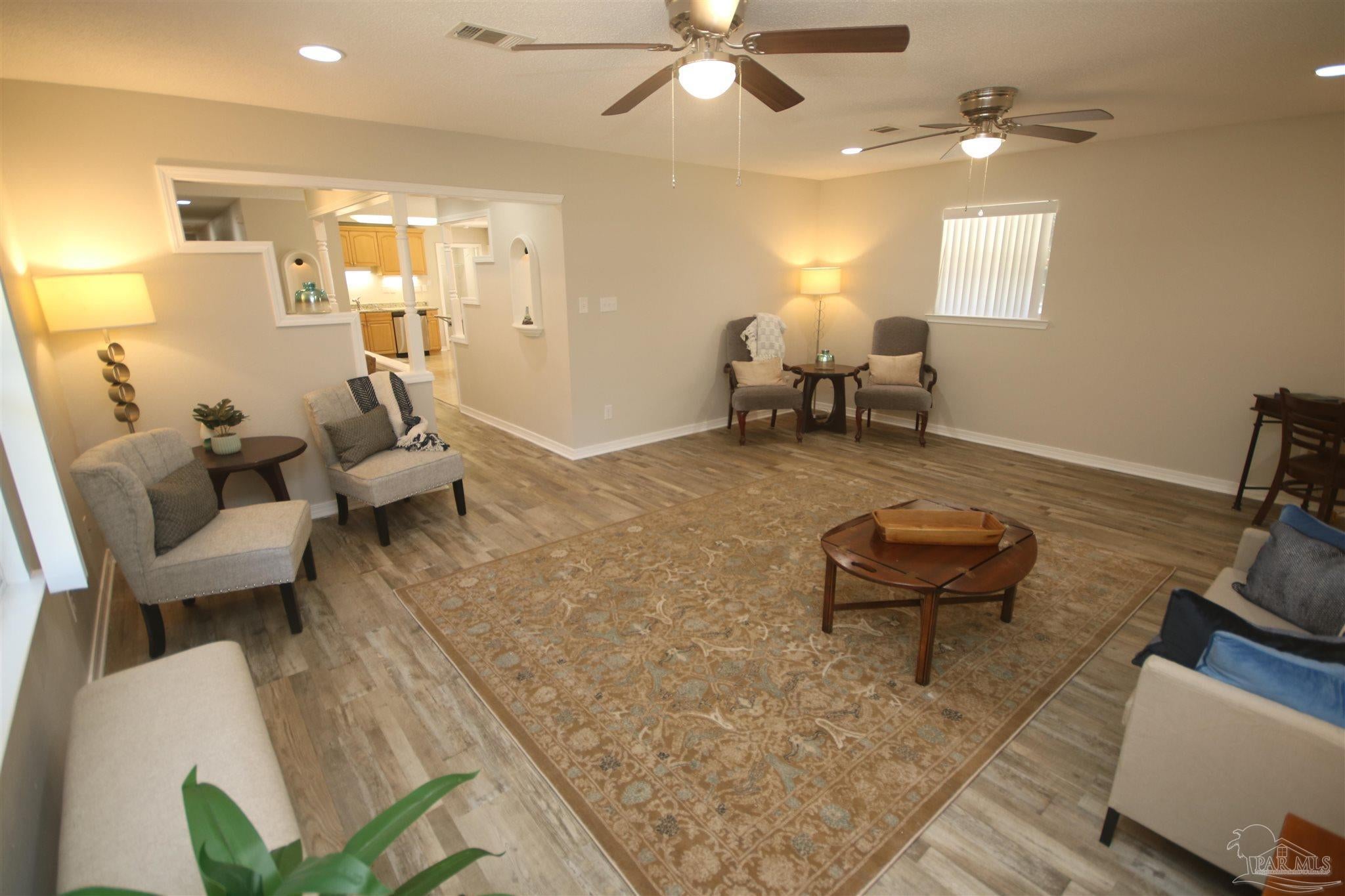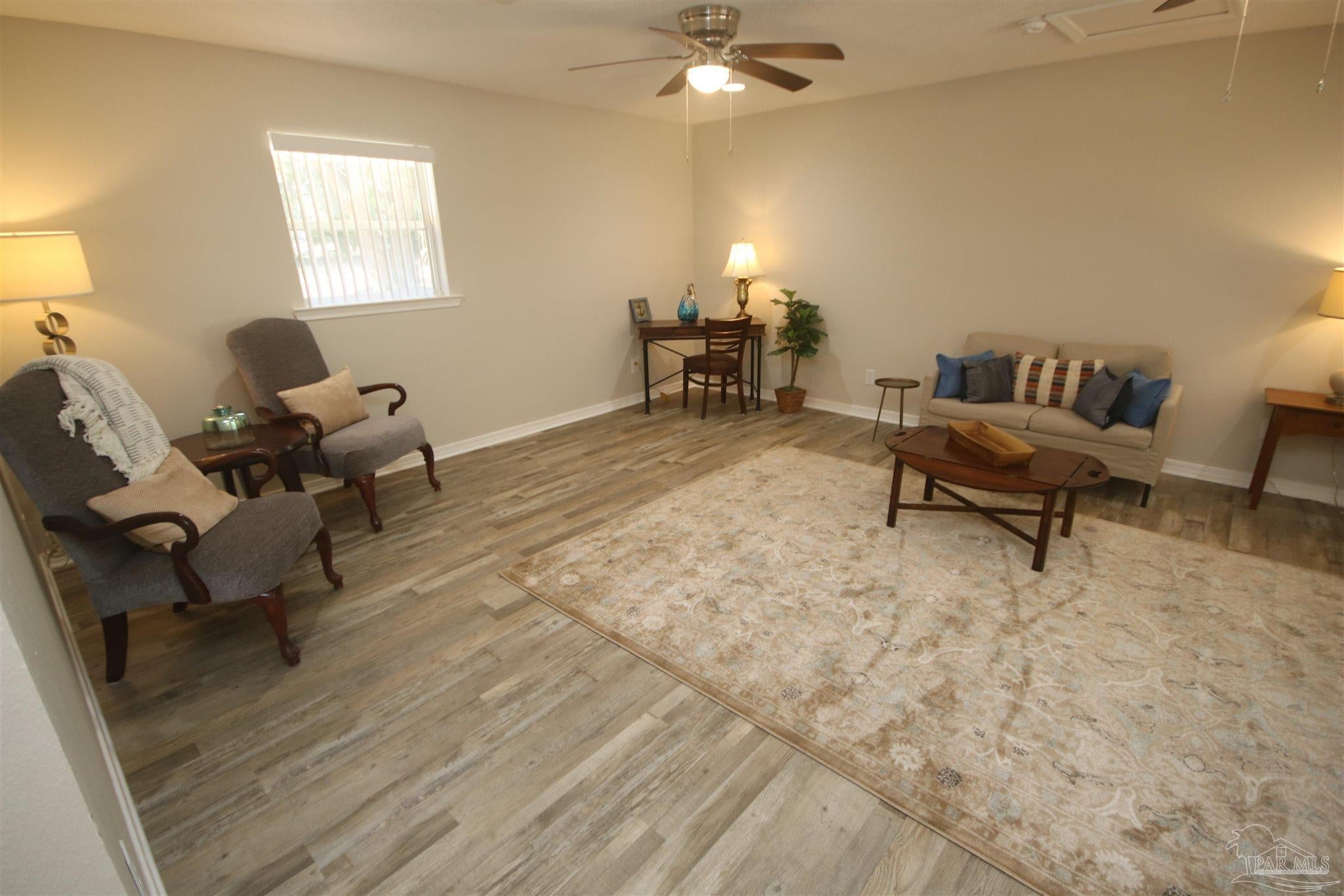 Open House Sat. 11-8-25, 1-4 pm. BEAUTIFULLY UPDATED in 2025! This beautiful open-concept home has been COMPLETELY REFRESHED with all NEW luxury vinyl plank flooring, NEW blinds, fresh interior paint, NEW ceiling fans in every room, and a NEW water heater. The kitchen shines with ALL new appliances, granite countertops, disposal, sink & fixture. The home offers two spacious living areas ~ a living room and a family room plus four spacious bedrooms along a private hallway. The primary suite includes two walk-in closets and a completely remodeled bath, including tub/shower, new solid wood cabinets w/ Granite countertops, mirrors, light fixtures, toilet, tile flooring & bathroom fan. The hall bath was also fully gutted and redone right down to new towel holders. Step outside through double French doors to the 17 x 24.6 patio and shaded backyard, boasting mature oaks, an air conditioned SHE SHED, and a 12 x 10 separate YARD BUILDING with NEW flooring. The backyard is fully fenced and has tons of space for your RV & is complete with a 60 amp RV HOOK UP. The front porch is perfect for enjoying cool relaxing evenings in your rocker. Additional features/ upgrades ~ NEW receptacles & switch plates, NEW door knobs & hinges, NEW railing & post on front porch, NEW French Doors in dining room, Sod in front yard, asphalt driveway, all NEW exterior light fixtures, NEW paint on She Shed along with NEW windows, NEW window unit, NEW vinyl flooring, NEW roof & blinds. NEW ROOF installed on home 9/2021, NEW HVAC 7/2023 inside & outside. Termite Bond w/ Extreme Termite. This is a floor plan that feels much larger than the square footage suggests. This home is in walking distance to Gospel Projects Youth Athletic Club. This home is TRULY a MUST SEE!