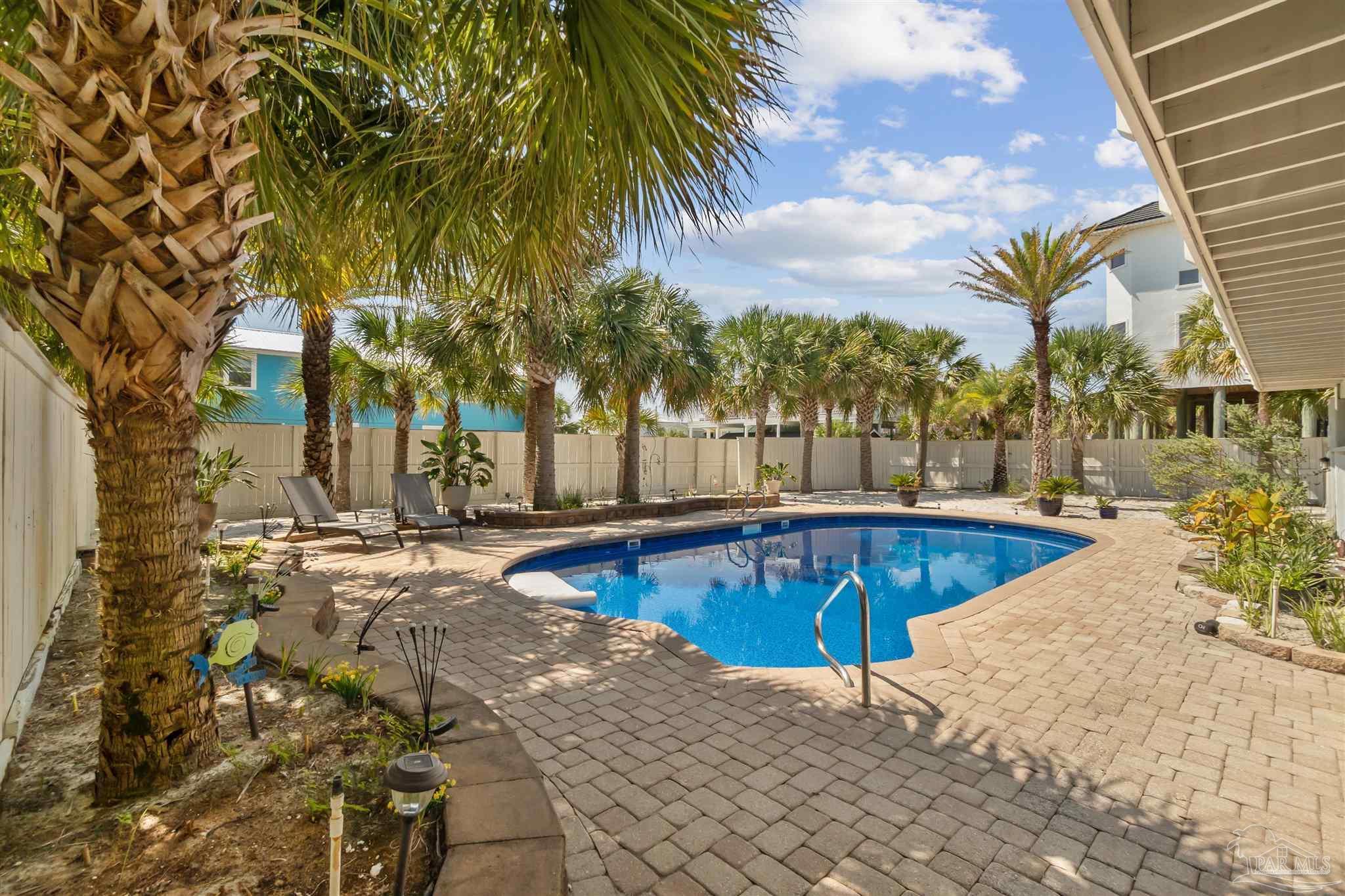 Welcome to your slice of island paradise, where luxurious coastal living meets comfort & charm in this beautifully crafted 3-bedroom, 3.5-bath pool home. Just steps away from the powdery white sands & crystal-clear waters of the Gulf, this home offers the perfect blend of privacy, convenience, & tropical tranquility. From the moment you arrive, you’ll be captivated by the lush, palm-filled backyard & whimsical custom railings that wrap around the spacious Trex decks, setting a cheerful & inviting tone both inside & out. Built with integrity & designed for both entertaining & everyday living, the open-concept floor plan effortlessly connects the expansive kitchen, dining, & living areas, while maintaining privacy & retreat-like comfort in the bedrooms. Every inch of the home reflects thoughtful design & exceptional quality: from the solid 2x6 framing & ¾-inch plywood, to the durable Hardie Board siding & insulated walls for extra peace & quiet. Inside, you'll find a generous laundry room complete with a sink, an oversized pantry, & a layout that makes daily living both practical & pleasurable. Step outside & you’ll feel like you’ve entered your own private resort. Lounge on the expansive paver courtyard or take a refreshing dip in the sparkling 18x36 pool. Unwind in the Hot Spring hot tub comfortably seating six adults, providing a perfect spot to relax after a day in the sun. Strolling back from the beach you will enjoy the custom stained-glass outdoor hot/cold shower. This home also boasts an enormous three-car garage with plenty of space for storage, as well as a large driveway to accommodate all your guests. With gated entrances at both the front & back, you’ll enjoy an extra layer of security & peace of mind. Whether you’re searching for a full-time residence or a high-performing rental opportunity, this partially furnished home checks all the boxes. Located in a lively beachside community filled with shopping, dining, & entertainment.