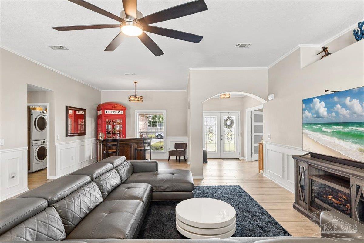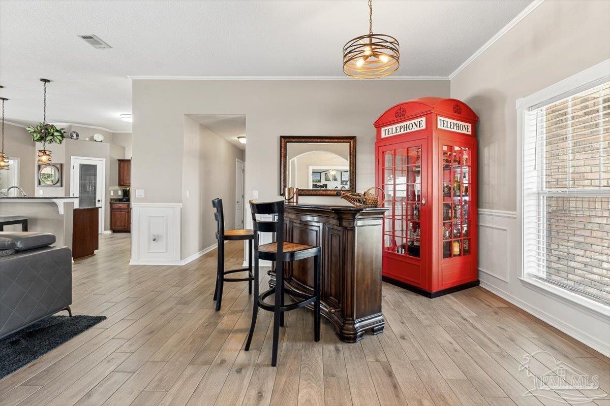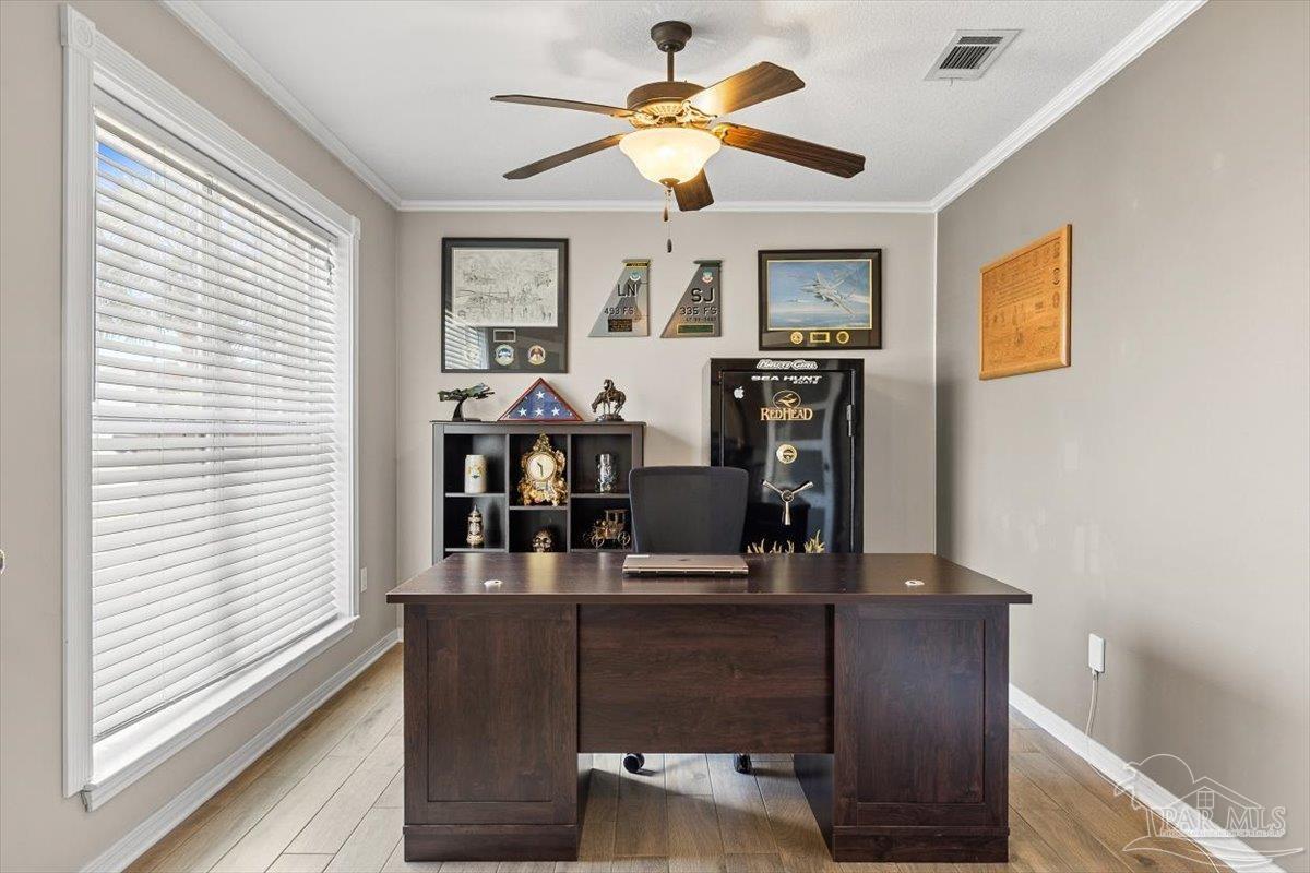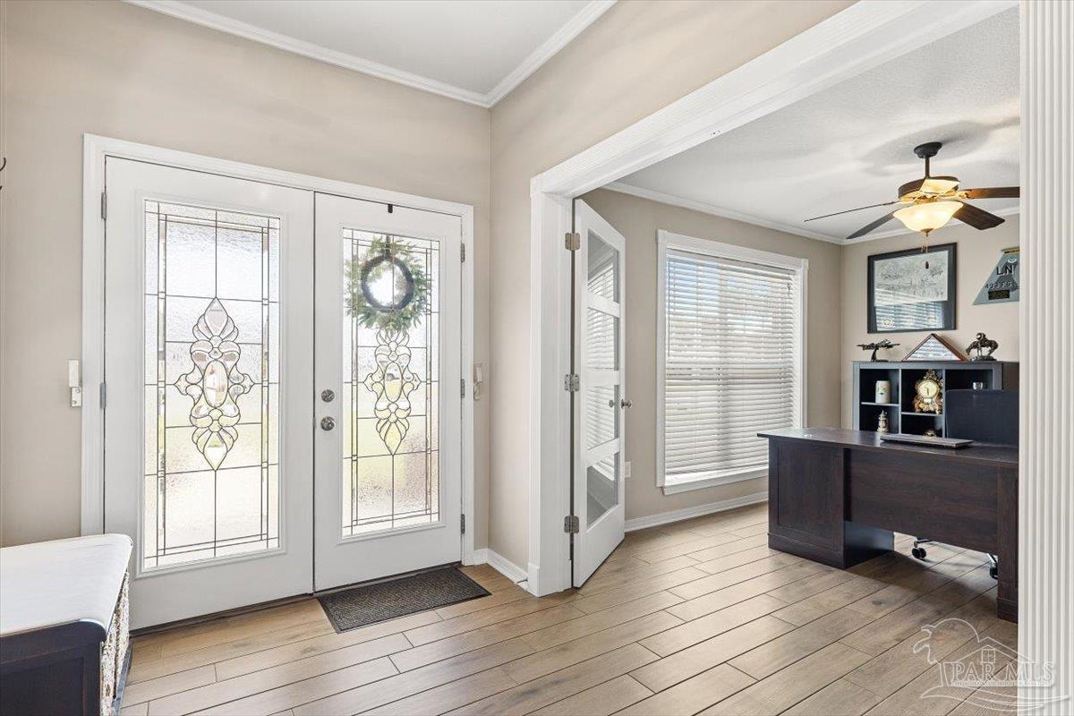 - Baseboards, Ceiling Fan(s), Chair Rail, Crown Molding, High Ceilings, Office/Study