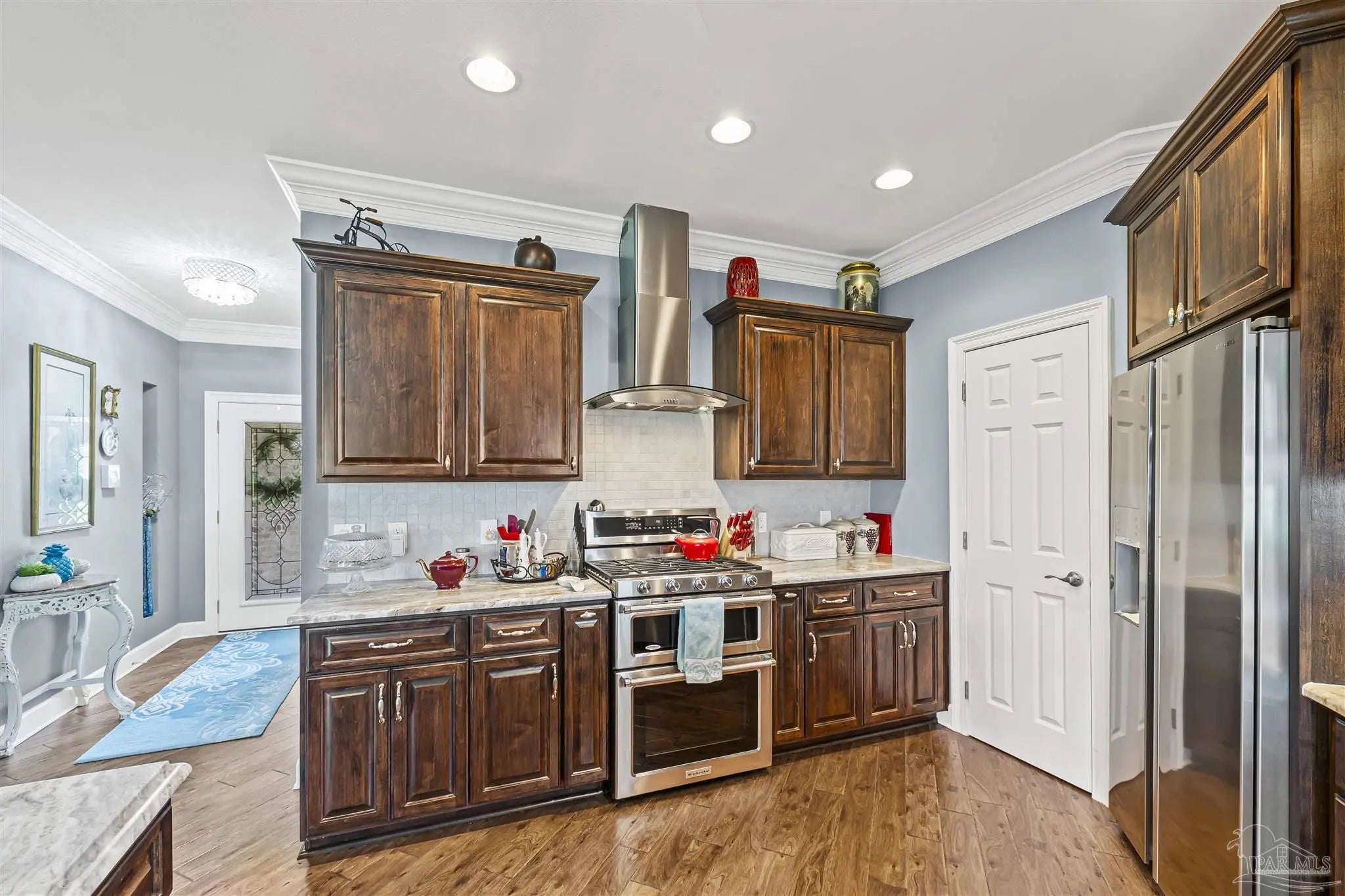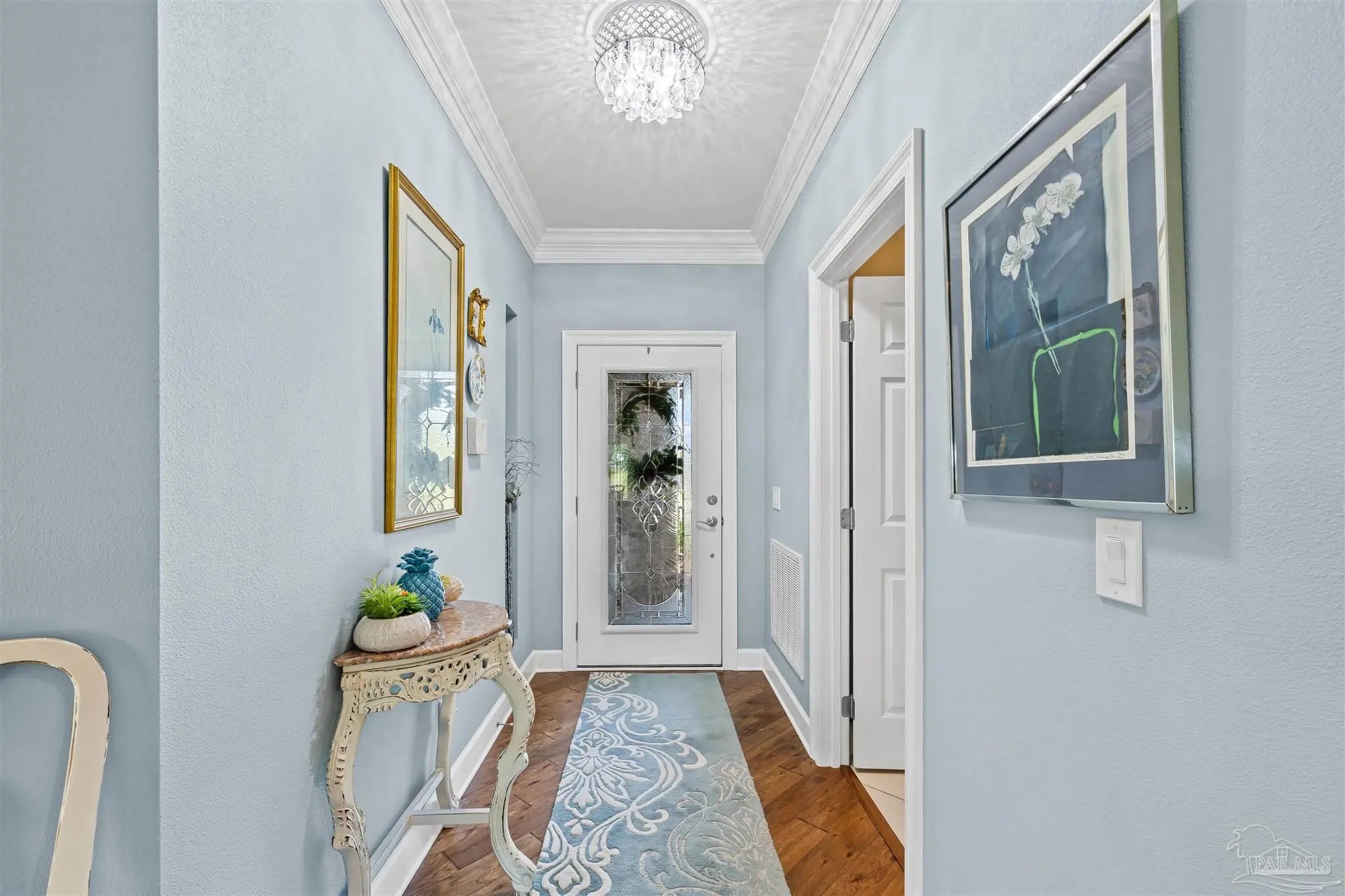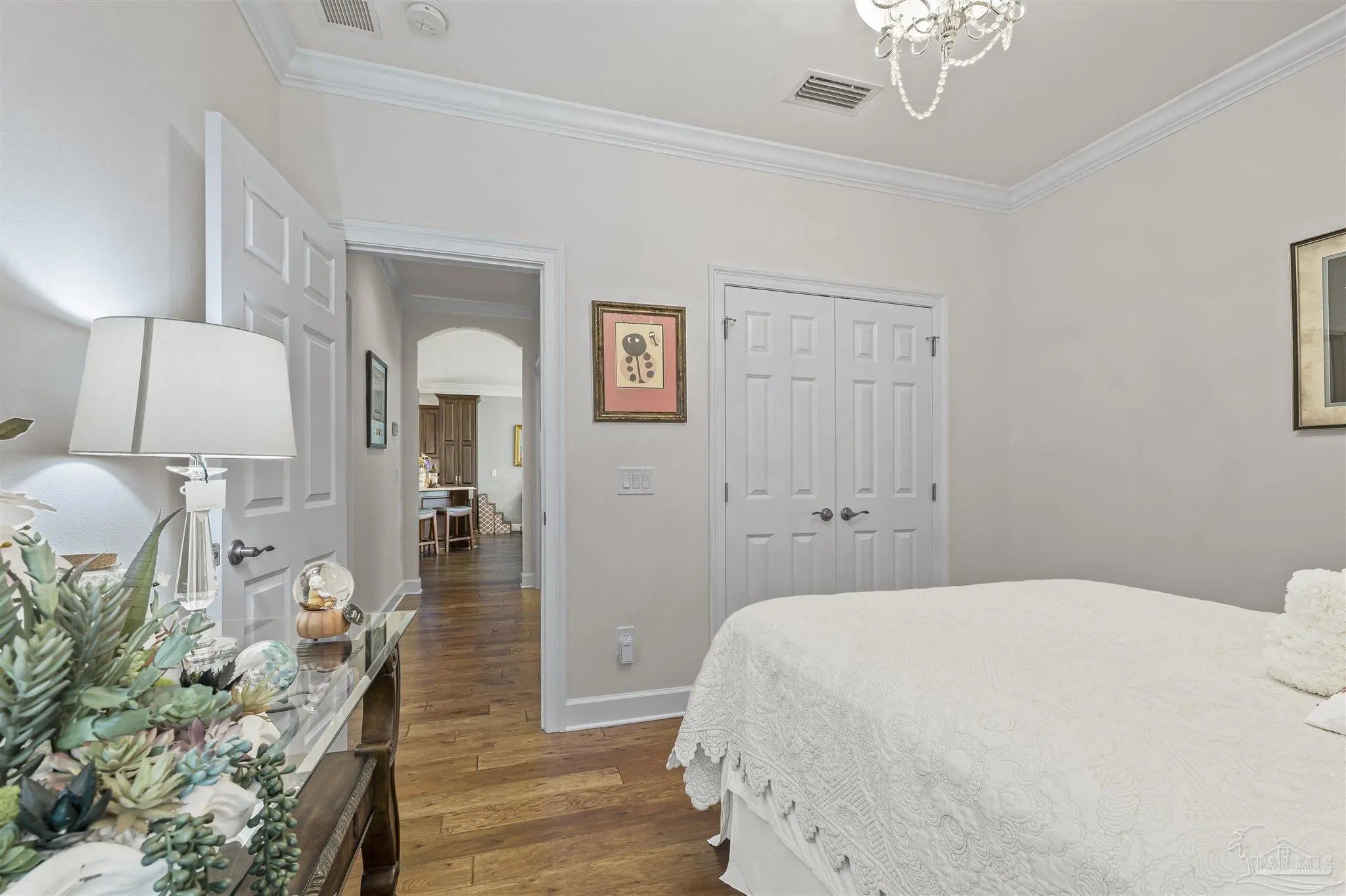 100% Custom All Brick home on the grounds of the illustrious Stonebrook Golf Club gated community! This home sits opposite of the Club House across the driving range, and the putting practice green is just beyond the back yard. Well manicured landscaping greets you as you approach the grand covered entry. Sturdy 4x7 stud construction makes this one of a kind property unshakable. When entering the front door the exclusive premium features begin to jump out, starting with the 9ft ceiling plate, double crown molding and real Eucalyptus hardwood that lines all of the living areas and bedrooms, not a stitch of carpet in the entire home! The entry flows into the living space and custom kitchen. Cabinets are solid Maple with soft close drawers and doors. Upgraded appliances include a Kitchen Aide Gas Range with double ovens, one being convection and dedicated ventilation as well as a Samsung Refrigerator. Tile backsplash and Class A Granite counters finish off this home chef's dream. All three of the home's full bathrooms are fitted with porcelain tile floors, zero entry tile showers and built in storage above the commodes. The guest bathrooms both have quartz counters while the master is fitted with Granite. One of the guest rooms is ensuite with its own oversized walk in closet. The primary bedroom ensuite is additionally fitted with a separate oversize tub and double vanity. There is even a separate office space off the primary suite. Crystal Chandeliers can be found throughout adding elegant lighting. The screened back porch is quiet and keeps out any unwanted pests. Impact windows allow for security from storms with no need for additional hurricane protection. The whole home is on a water purifier and softener. Oversized 2 car garage has lot's of extra room and is fitted with a reinforced hurricane door. HVAC is equipped with UV light filtration as well! Enjoy a day at the community pool or playing tennis or pickleball! Call today for more information or a tour!