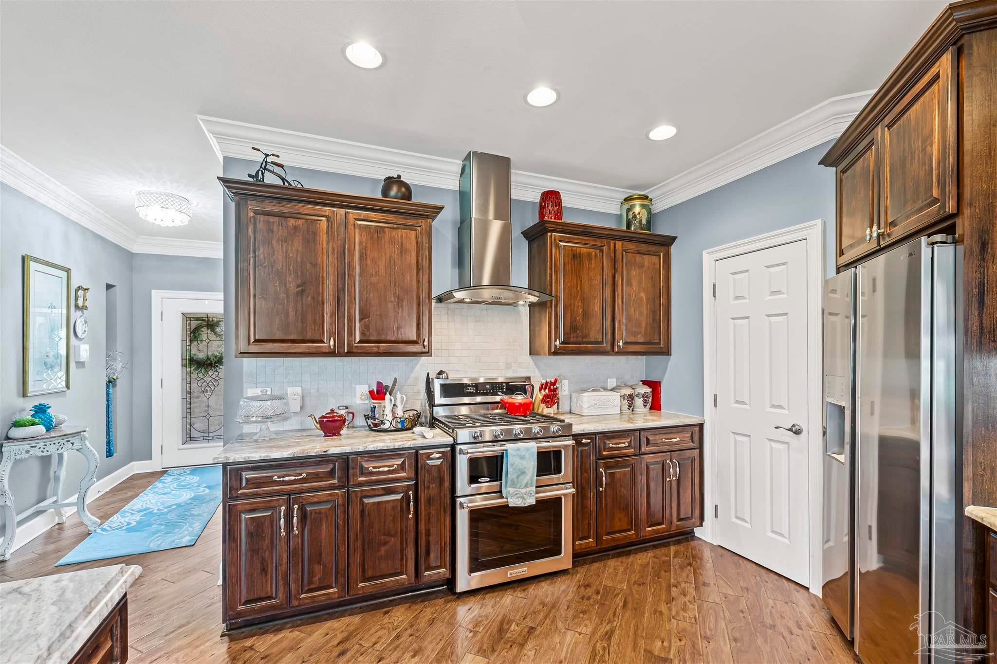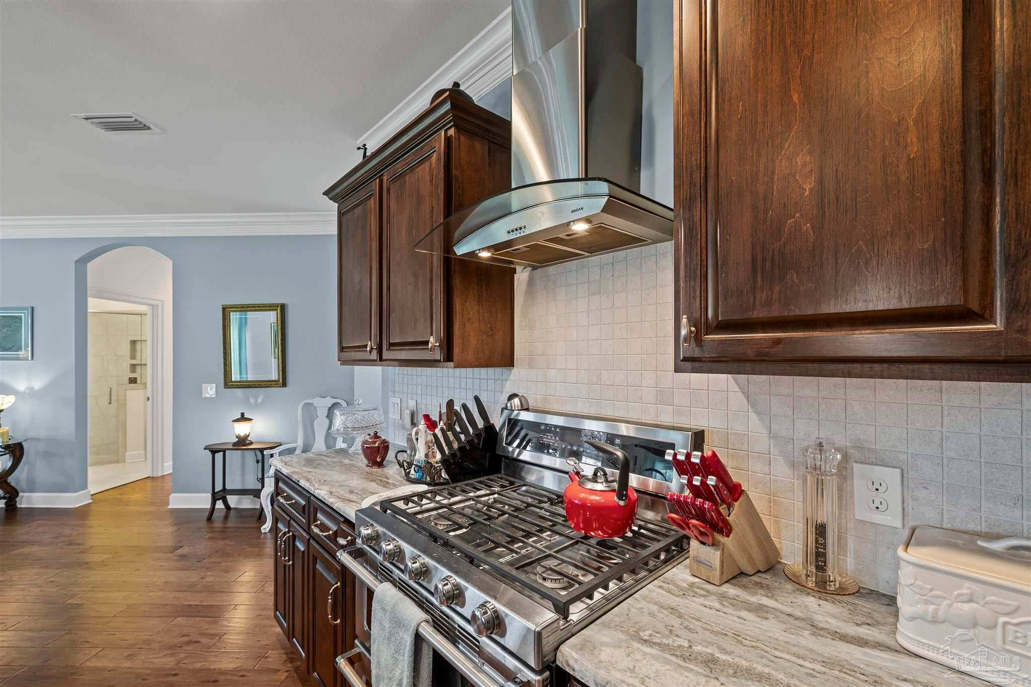 100% Custom All Brick home on the grounds of the illustrious Stonebrook Golf Club gated community! This home sits opposite of the Club House across the driving range, and the putting practice green is just beyond the back yard. Well manicured landscaping greets you as you approach the grand covered entry. Sturdy 4x7 stud construction makes this one of a kind property unshakable. When entering the front door the exclusive premium features begin to jump out, starting with the 9ft ceiling plate, double crown molding and real Eucalyptus hardwood that lines all of the living areas and bedrooms, not a stitch of carpet in the entire home! The entry flows into the living space and custom kitchen. Cabinets are solid Maple with soft close drawers and doors. Upgraded appliances include a Kitchen Aide Gas Range with double ovens, one being convection and dedicated ventilation as well as a Samsung Refrigerator. Tile backsplash and Class A Granite counters finish off this home chef's dream. All three of the home's full bathrooms are fitted with porcelain tile floors, zero entry tile showers and built in storage above the commodes. The guest bathrooms both have quartz counters while the master is fitted with Granite. One of the guest rooms is ensuite with its own oversized walk in closet. The primary bedroom ensuite is additionally fitted with a separate oversize tub and double vanity. There is even a separate office space off the primary suite. Crystal Chandeliers can be found throughout adding elegant lighting. The screened back porch is quiet and keeps out any unwanted pests. Impact windows allow for security from storms with no need for additional hurricane protection. The whole home is on a water purifier and softener. Oversized 2 car garage has lot's of extra room and is fitted with a reinforced hurricane door. HVAC is equipped with UV light filtration as well! Enjoy a day at the community pool or playing tennis or pickleball! Call today for more information or a tour!