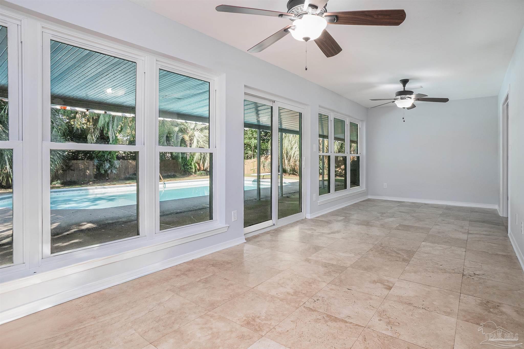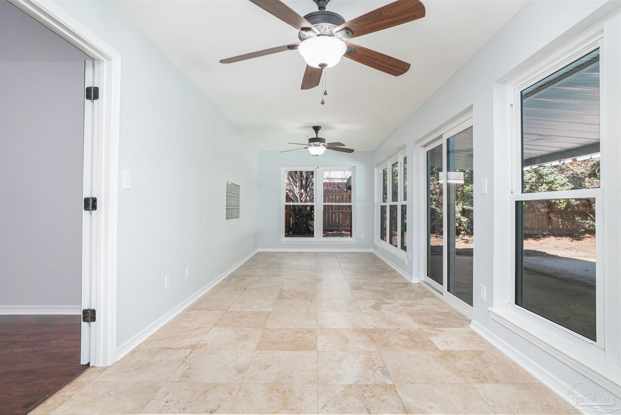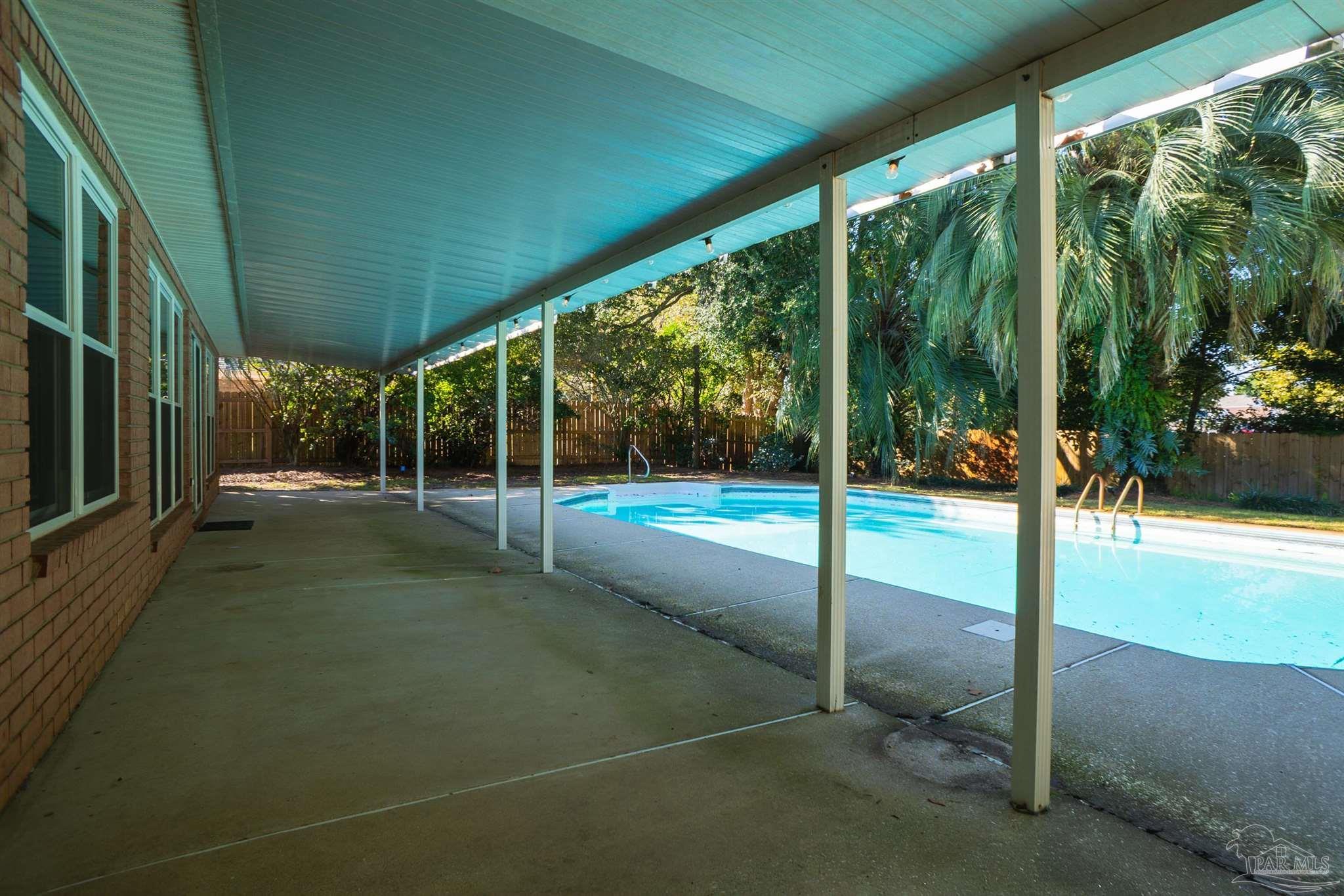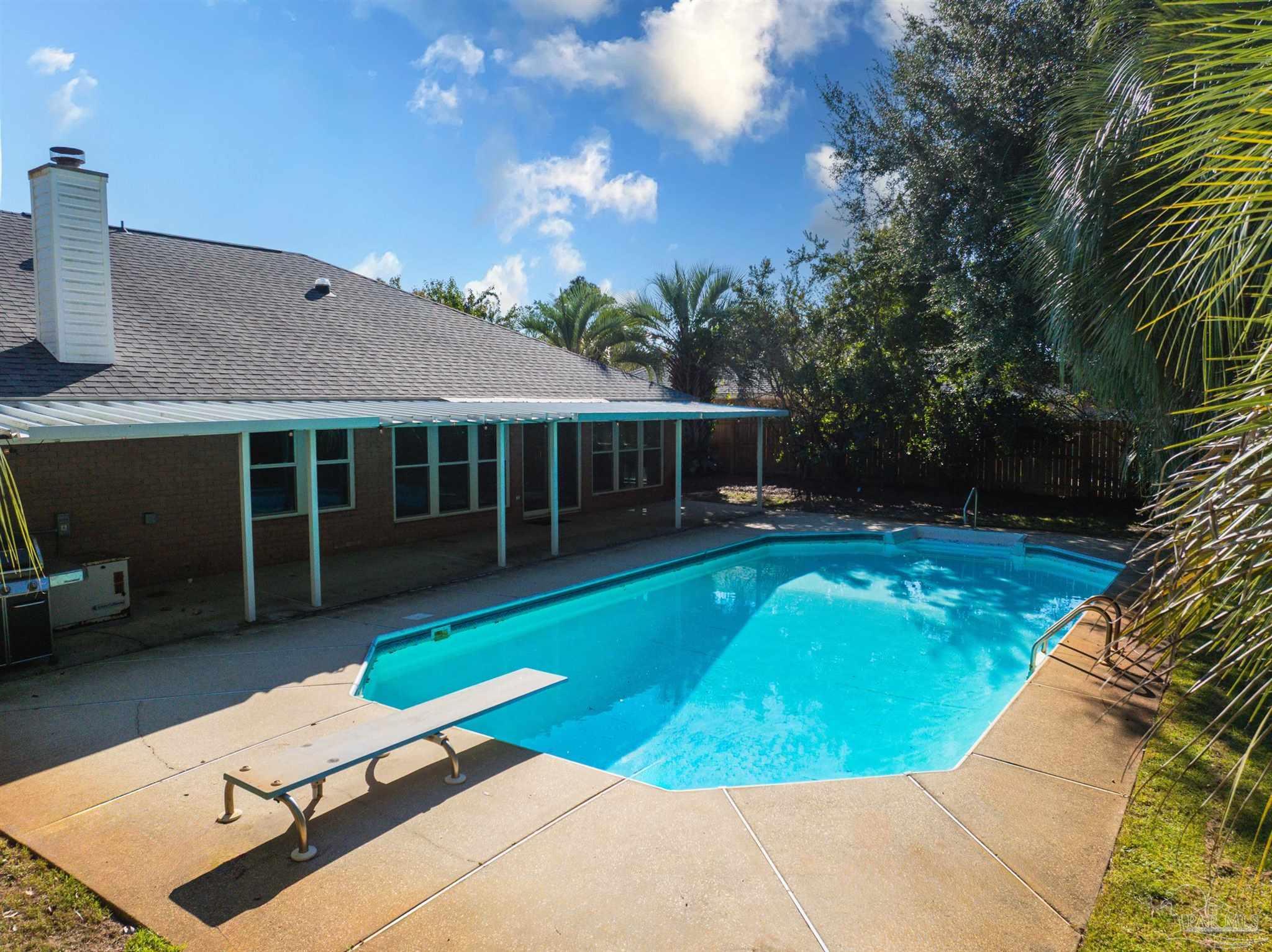 **OPEN HOUSE** November 8 from 11-2pm. Welcome to your dream home, nestled amongst the coveted Tiger Point Village Neighborhood. This budget friendly 3-bedroom, 2-bath haven presents a fabulous blend of comfort and luxury, offering a tranquil retreat from the hustle and bustle of life. Imagine waking up every day to the sight of a sparkling pool in your backyard, surrounded by a lush, well-maintained private oasis with mature foliage. The expansive corner lot provides ample space for your outdoor entertainment and an easy access side yard entry on the East side making rear lawn maintenance a breeze and may also serve as additional storage access for an HOA approved boat or RV. In addition to the fabulous natural canopy of trees at the rear yard, the expansive rear porch offers an extra covering of shade. The lush green yard is maintained by a sprinkler system on a well. Inside the sunroom bathes this lovely abode in natural yet shadowy ambient lighting with a beautiful panoramic view of the pool. The primary bedroom is a sanctuary in itself, featuring an ensuite bath with a large double sink vanity, garden tub and shower. The kitchen is a chef's delight, boasting stainless appliances, breakfast nook and is an open wrapping bar design. This split floorplan allows guests or family some space and privacy in their own bedroom suite. Living in Tiger Point means you're part of a golf cart-friendly community with a plethora of features. Enjoy a 55-acre Soundside Preserve with a ½ mile beach on the sound, dine at The Pointe Restaurant or its themed restaurant neighbor Tiki Republic, and shop at nearby stores 2 minutes away like Lowe's, Publix, and Super Walmart. This home is more than just a house; it's a lifestyle. This home offers so many desirable attributes, it surely won't last long so schedule your showing today! Priced to Sell, so why wait?