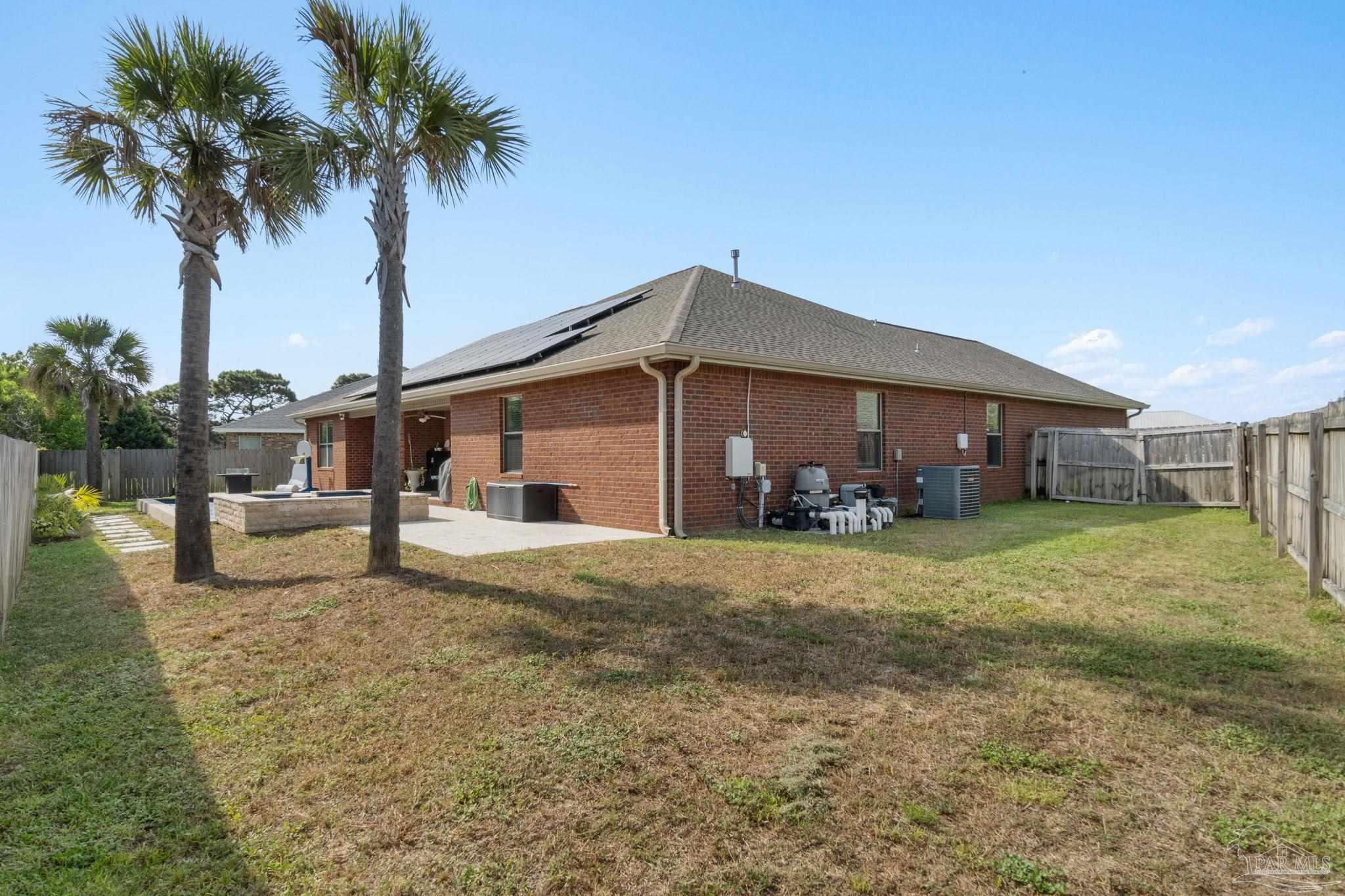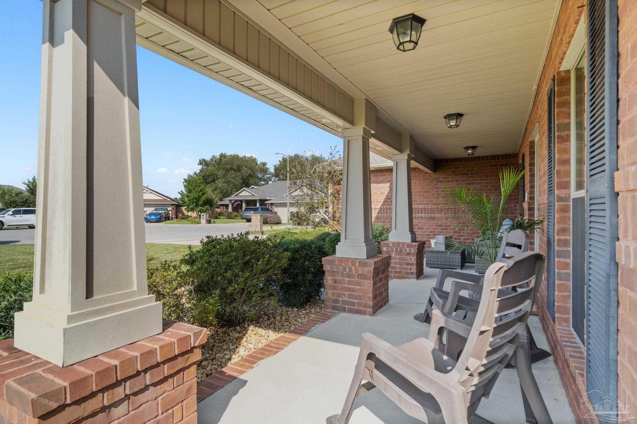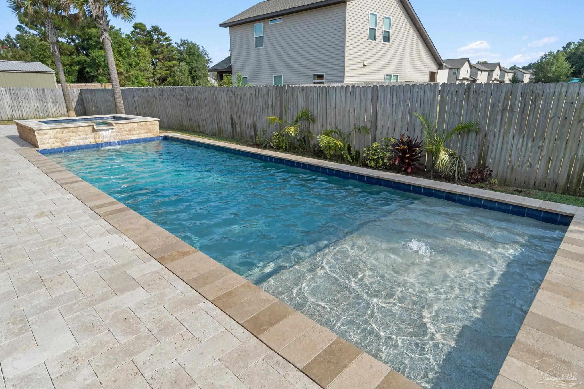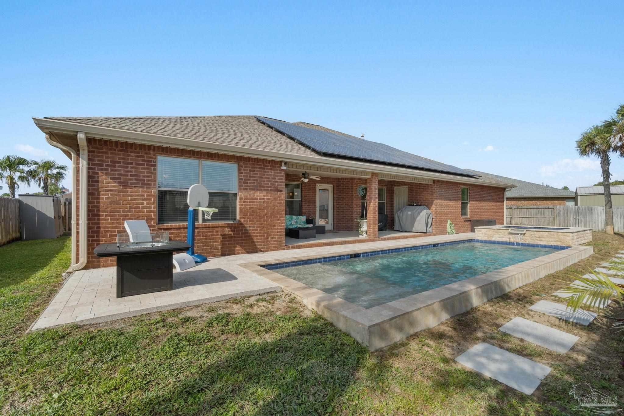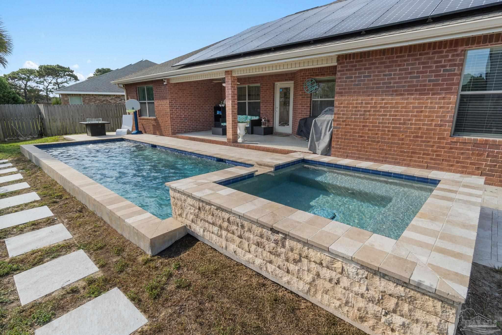 Welcome to your dream POOL home in The Meadows! This stunning 4 bedroom, 3 bathroom all-brick home is tucked away on a quiet cul-de-sac in one of Navarre's most desirable neighborhoods. From the moment you arrive, you'll notice the charming covered front porch, extended driveway, and spacious 3-car garage. Inside, the thoughtful floor plan also offers a formal dining room and a versatile office/flex room behind French doors. The living room features a custom built-in, while the kitchen is a showstopper with granite countertops, stainless steel appliances, and a tasteful backsplash. The oversized laundry room with built-ins serves as a butler pantry for added convenience and storage. The spacious master bedroom is a true retreat, complete with a fantastic en suite bathroom featuring dual vanities, a soaking tub, a walk-in tiled shower with dual shower heads and two walk in closets! The split floor plan features three other great sized bedrooms on the other side of the house, two of which with a full bathroom between them. The 4th bedroom has a walk-in closet and the hallway accessible full third bathroom also has access directly to the back patio, perfect for access to the pool while you're outside having fun. Speaking of which...outdoors your private oasis awaits! Enjoy the custom saltwater gunite pool and hot tub, all overlooked by a covered back patio perfect for relaxing or entertaining year-round and bordered by beautiful palm trees! Additional upgrades include fully paid-off solar panels, a new roof (2021), and a new water heater (2024) for peace of mind. With 4 spacious bedrooms, 3 full baths, and plenty of flexible living space, this home blends comfort, efficiency, and style in an unbeatable East Navarre location close to Hurlburt Field and Navarre's beautiful sugar white beaches. Don't miss your chance to live in The Meadows, schedule your showing today!