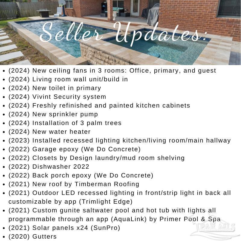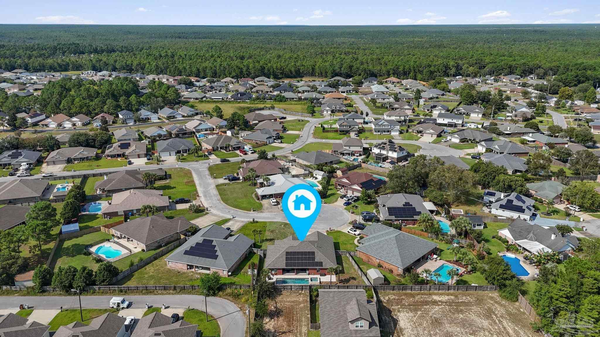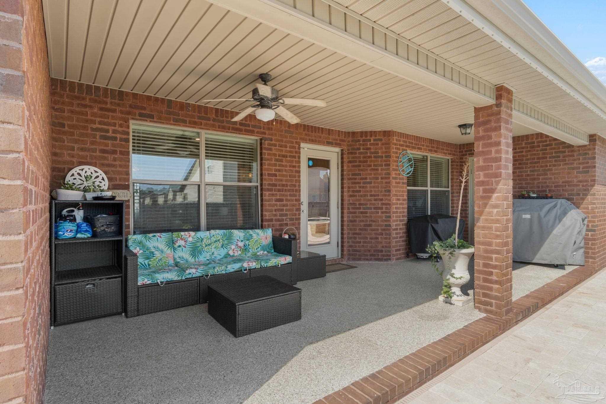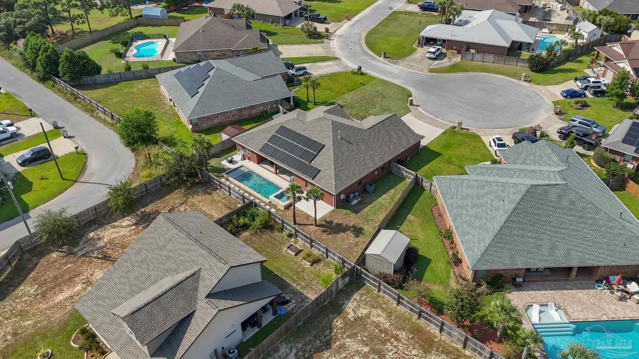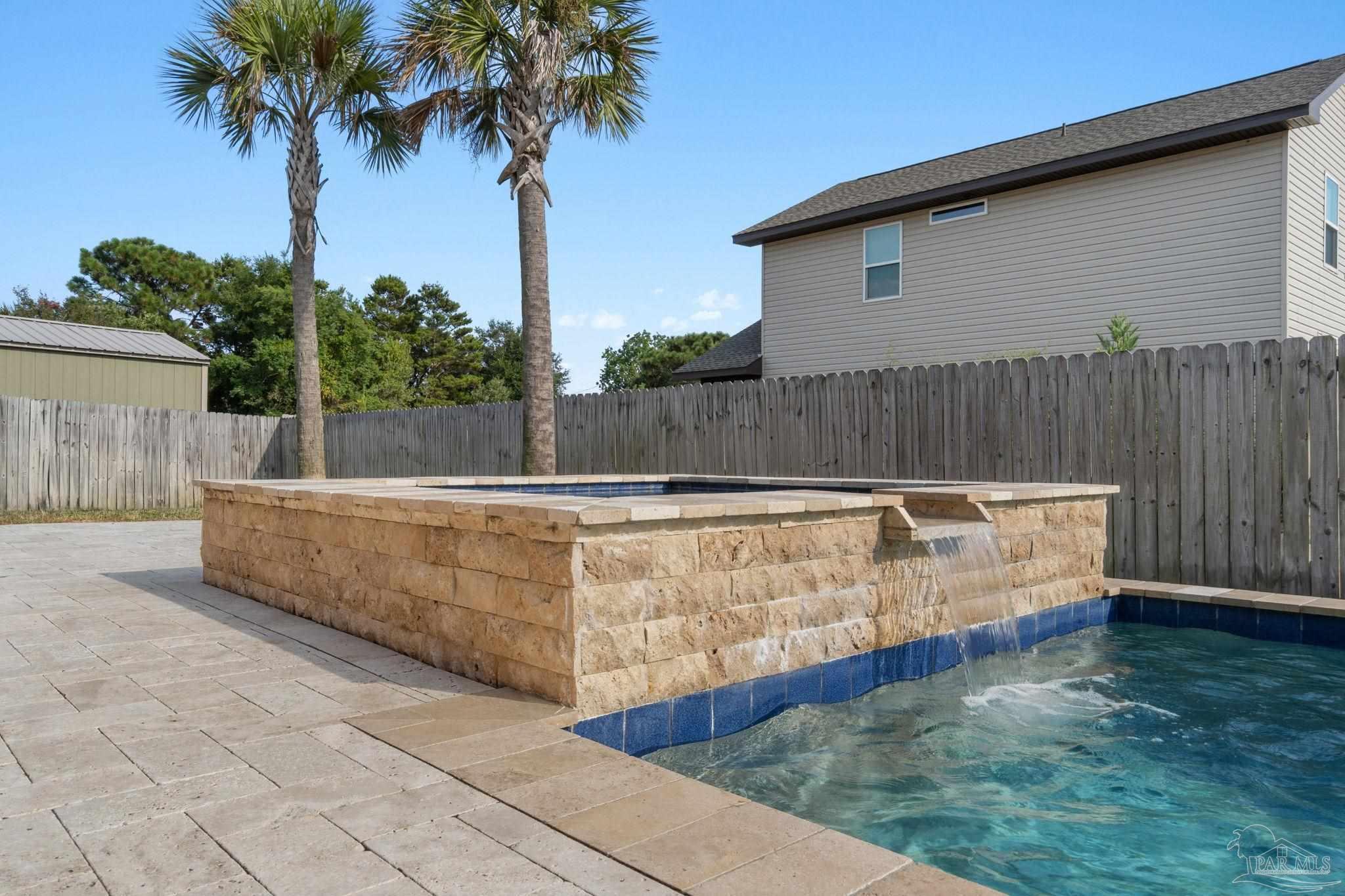 Welcome to your dream POOL home in The Meadows! This stunning 4 bedroom, 3 bathroom all-brick home is tucked away on a quiet cul-de-sac in one of Navarre's most desirable neighborhoods. From the moment you arrive, you'll notice the charming covered front porch, extended driveway, and spacious 3-car garage. Inside, the thoughtful floor plan also offers a formal dining room and a versatile office/flex room behind French doors. The living room features a custom built-in, while the kitchen is a showstopper with granite countertops, stainless steel appliances, and a tasteful backsplash. The oversized laundry room with built-ins serves as a butler pantry for added convenience and storage. The spacious master bedroom is a true retreat, complete with a fantastic en suite bathroom featuring dual vanities, a soaking tub, a walk-in tiled shower with dual shower heads and two walk in closets! The split floor plan features three other great sized bedrooms on the other side of the house, two of which with a full bathroom between them. The 4th bedroom has a walk-in closet and the hallway accessible full third bathroom also has access directly to the back patio, perfect for access to the pool while you're outside having fun. Speaking of which...outdoors your private oasis awaits! Enjoy the custom saltwater gunite pool and hot tub, all overlooked by a covered back patio perfect for relaxing or entertaining year-round and bordered by beautiful palm trees! Additional upgrades include fully paid-off solar panels, a new roof (2021), and a new water heater (2024) for peace of mind. With 4 spacious bedrooms, 3 full baths, and plenty of flexible living space, this home blends comfort, efficiency, and style in an unbeatable East Navarre location close to Hurlburt Field and Navarre's beautiful sugar white beaches. Don't miss your chance to live in The Meadows, schedule your showing today!