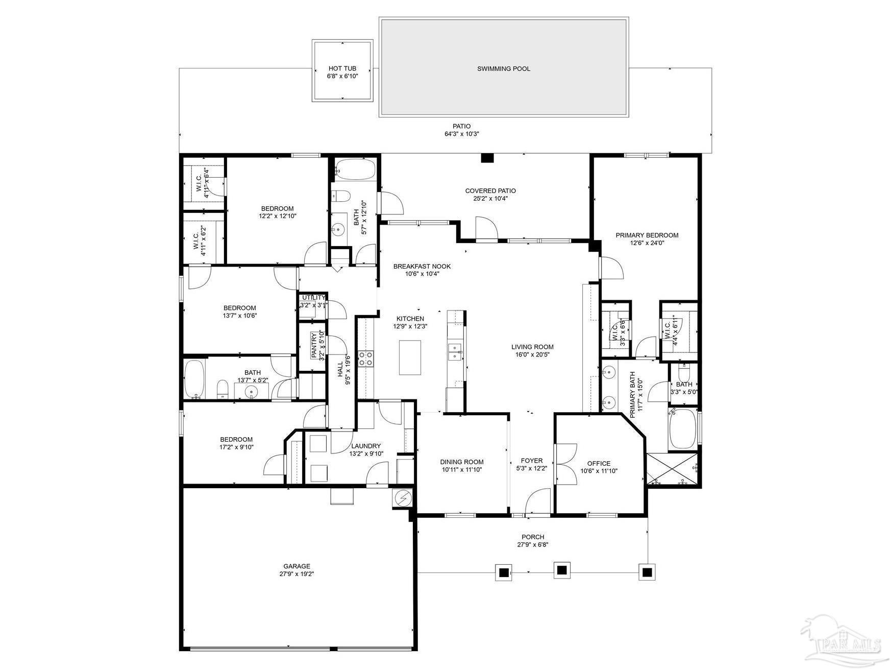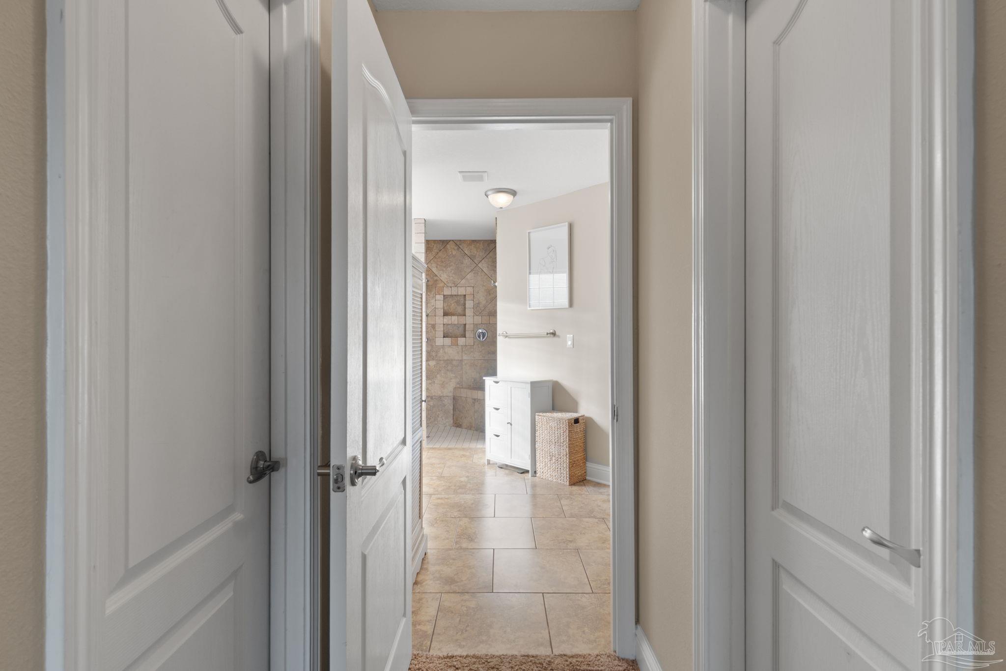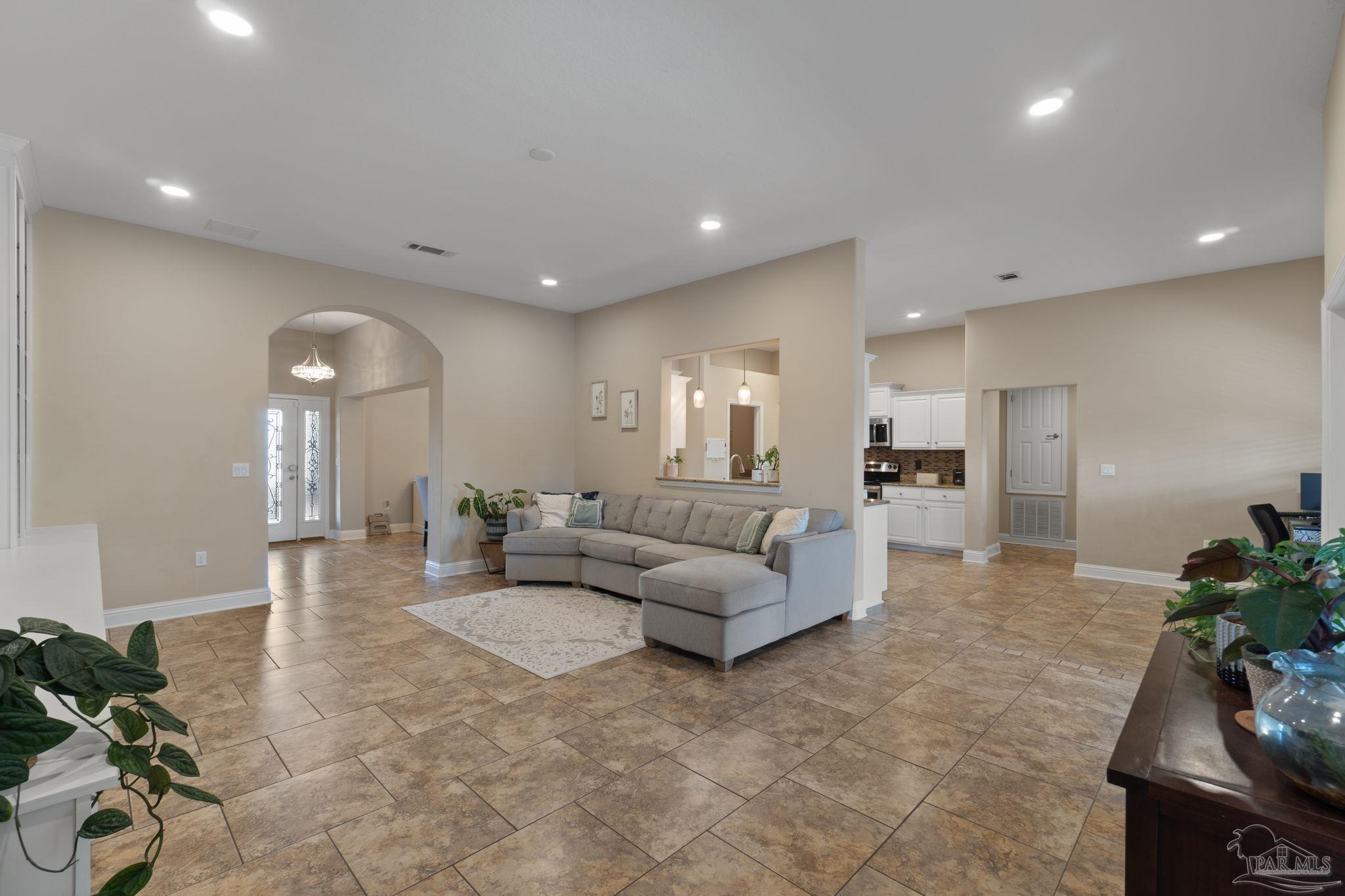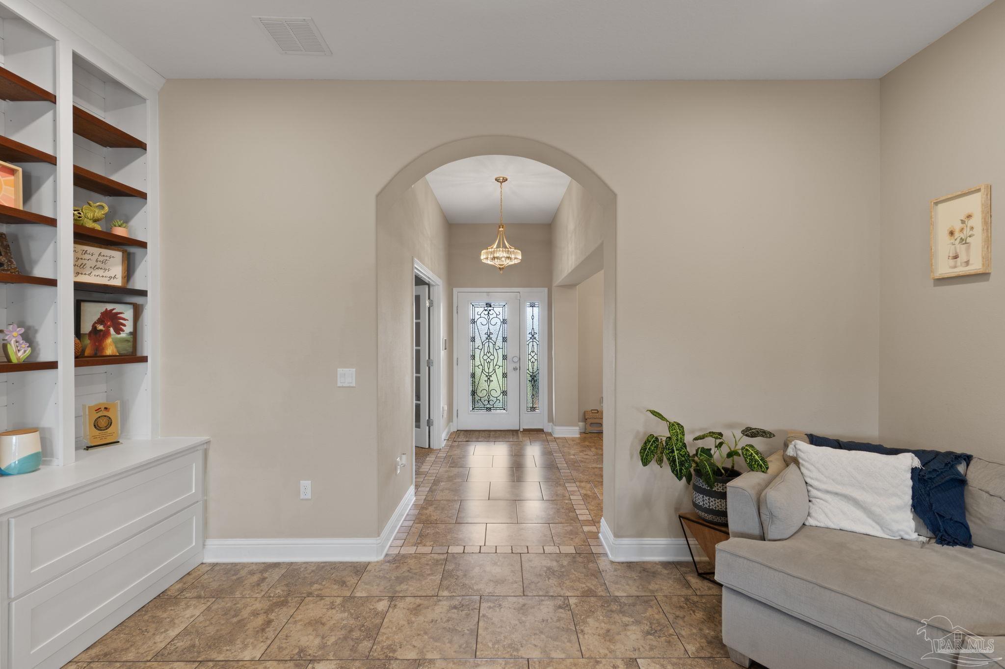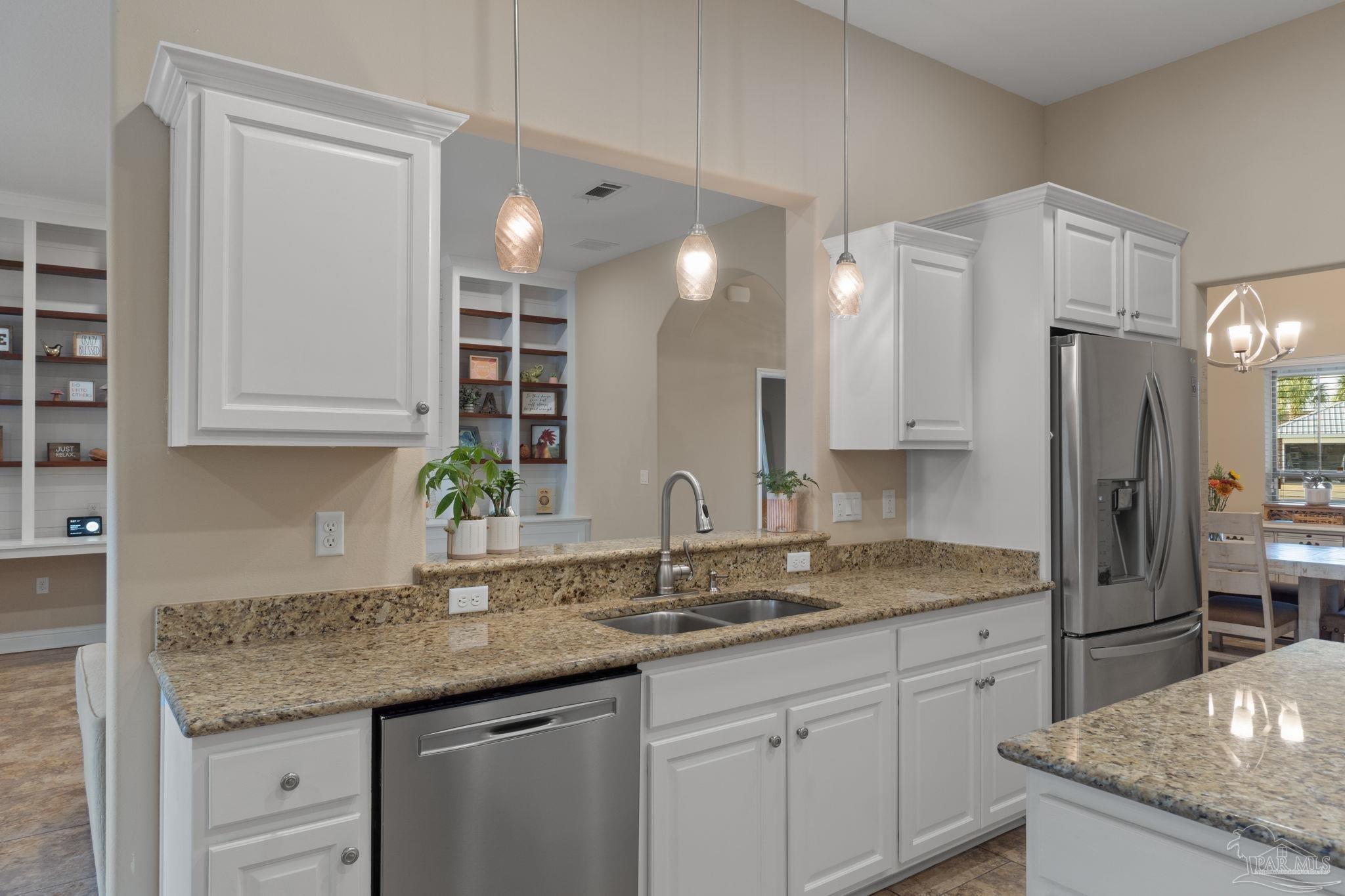 Welcome to your dream POOL home in The Meadows! This stunning 4 bedroom, 3 bathroom all-brick home is tucked away on a quiet cul-de-sac in one of Navarre's most desirable neighborhoods. From the moment you arrive, you'll notice the charming covered front porch, extended driveway, and spacious 3-car garage. Inside, the thoughtful floor plan also offers a formal dining room and a versatile office/flex room behind French doors. The living room features a custom built-in, while the kitchen is a showstopper with granite countertops, stainless steel appliances, and a tasteful backsplash. The oversized laundry room with built-ins serves as a butler pantry for added convenience and storage. The spacious master bedroom is a true retreat, complete with a fantastic en suite bathroom featuring dual vanities, a soaking tub, a walk-in tiled shower with dual shower heads and two walk in closets! The split floor plan features three other great sized bedrooms on the other side of the house, two of which with a full bathroom between them. The 4th bedroom has a walk-in closet and the hallway accessible full third bathroom also has access directly to the back patio, perfect for access to the pool while you're outside having fun. Speaking of which...outdoors your private oasis awaits! Enjoy the custom saltwater gunite pool and hot tub, all overlooked by a covered back patio perfect for relaxing or entertaining year-round and bordered by beautiful palm trees! Additional upgrades include fully paid-off solar panels, a new roof (2021), and a new water heater (2024) for peace of mind. With 4 spacious bedrooms, 3 full baths, and plenty of flexible living space, this home blends comfort, efficiency, and style in an unbeatable East Navarre location close to Hurlburt Field and Navarre's beautiful sugar white beaches. Don't miss your chance to live in The Meadows, schedule your showing today!