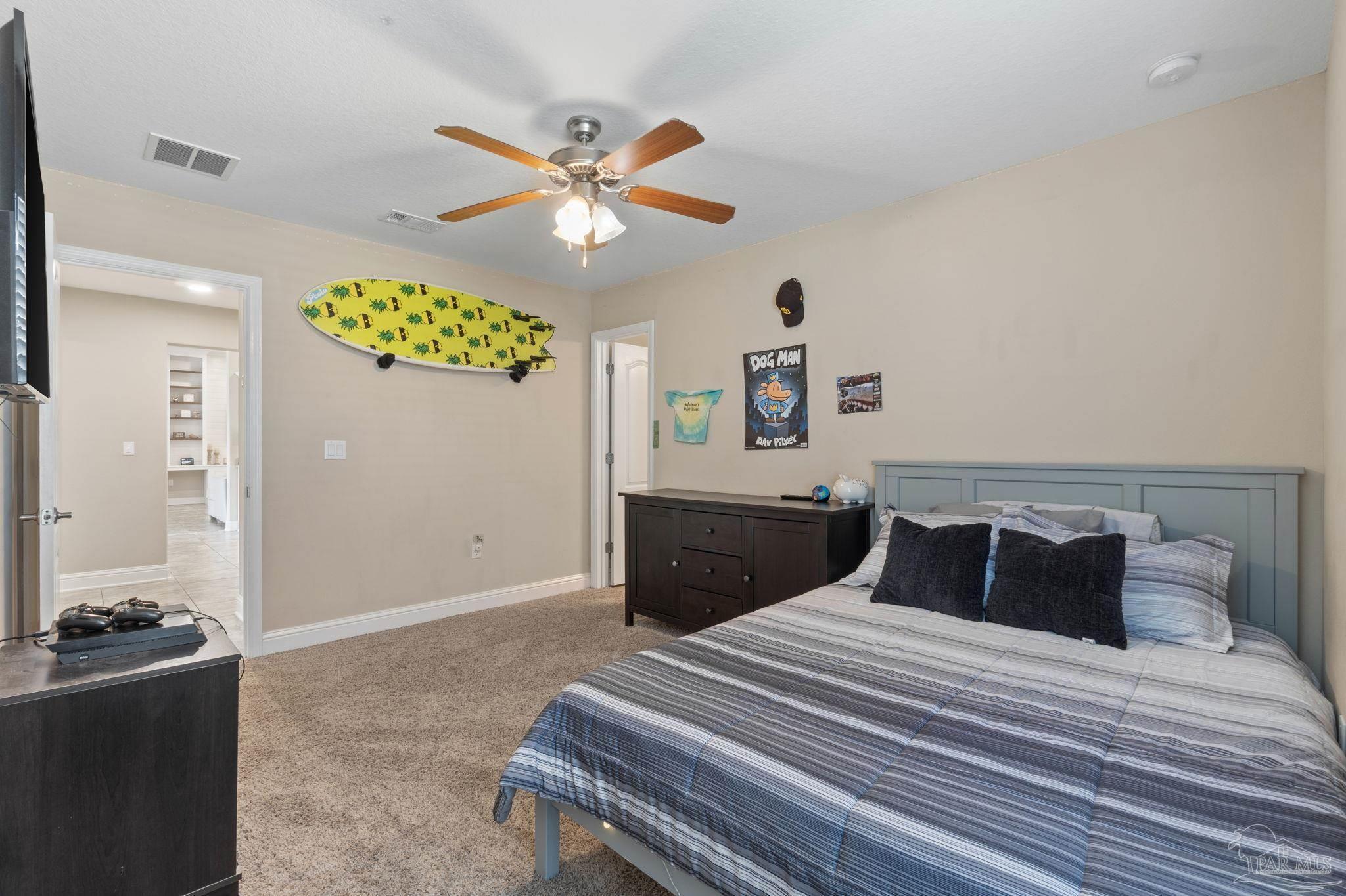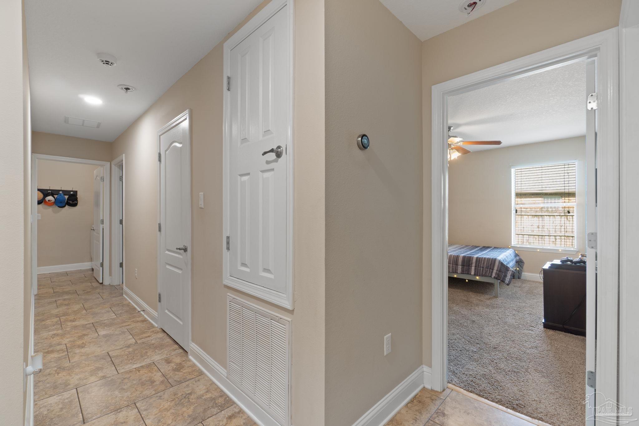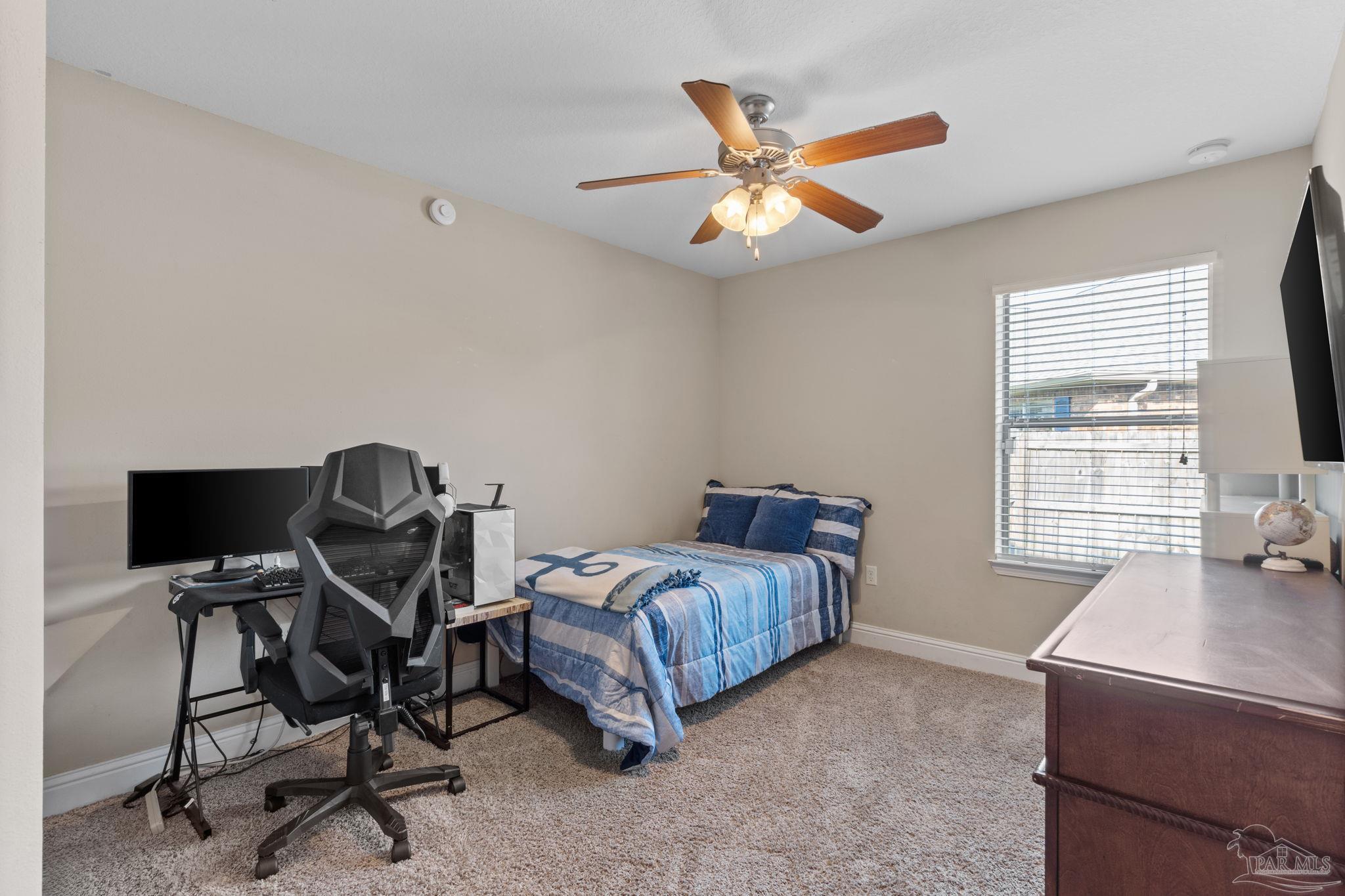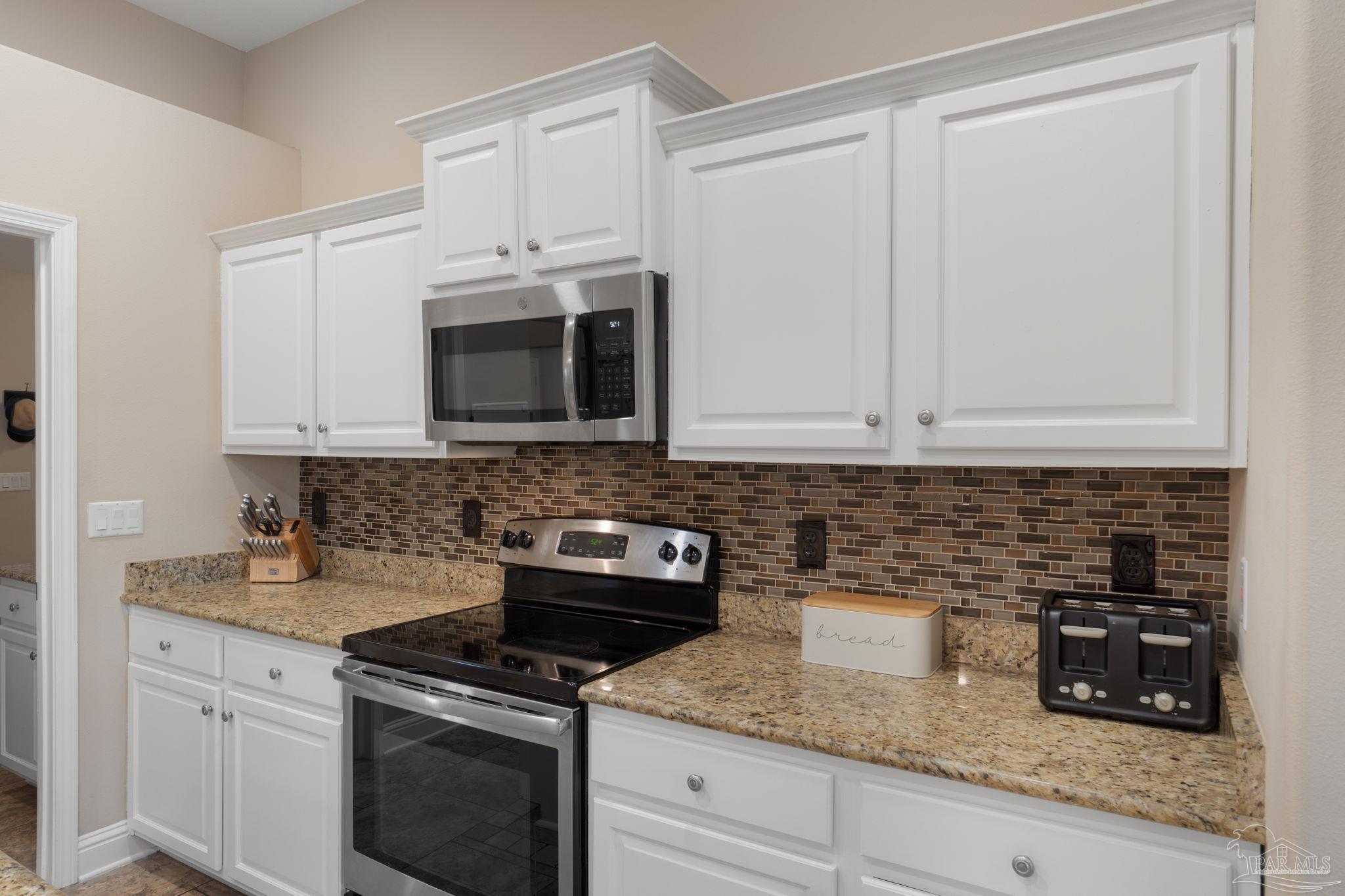 Welcome to your dream POOL home in The Meadows! This stunning 4 bedroom, 3 bathroom all-brick home is tucked away on a quiet cul-de-sac in one of Navarre's most desirable neighborhoods. From the moment you arrive, you'll notice the charming covered front porch, extended driveway, and spacious 3-car garage. Inside, the thoughtful floor plan also offers a formal dining room and a versatile office/flex room behind French doors. The living room features a custom built-in, while the kitchen is a showstopper with granite countertops, stainless steel appliances, and a tasteful backsplash. The oversized laundry room with built-ins serves as a butler pantry for added convenience and storage. The spacious master bedroom is a true retreat, complete with a fantastic en suite bathroom featuring dual vanities, a soaking tub, a walk-in tiled shower with dual shower heads and two walk in closets! The split floor plan features three other great sized bedrooms on the other side of the house, two of which with a full bathroom between them. The 4th bedroom has a walk-in closet and the hallway accessible full third bathroom also has access directly to the back patio, perfect for access to the pool while you're outside having fun. Speaking of which...outdoors your private oasis awaits! Enjoy the custom saltwater gunite pool and hot tub, all overlooked by a covered back patio perfect for relaxing or entertaining year-round and bordered by beautiful palm trees! Additional upgrades include fully paid-off solar panels, a new roof (2021), and a new water heater (2024) for peace of mind. With 4 spacious bedrooms, 3 full baths, and plenty of flexible living space, this home blends comfort, efficiency, and style in an unbeatable East Navarre location close to Hurlburt Field and Navarre's beautiful sugar white beaches. Don't miss your chance to live in The Meadows, schedule your showing today!