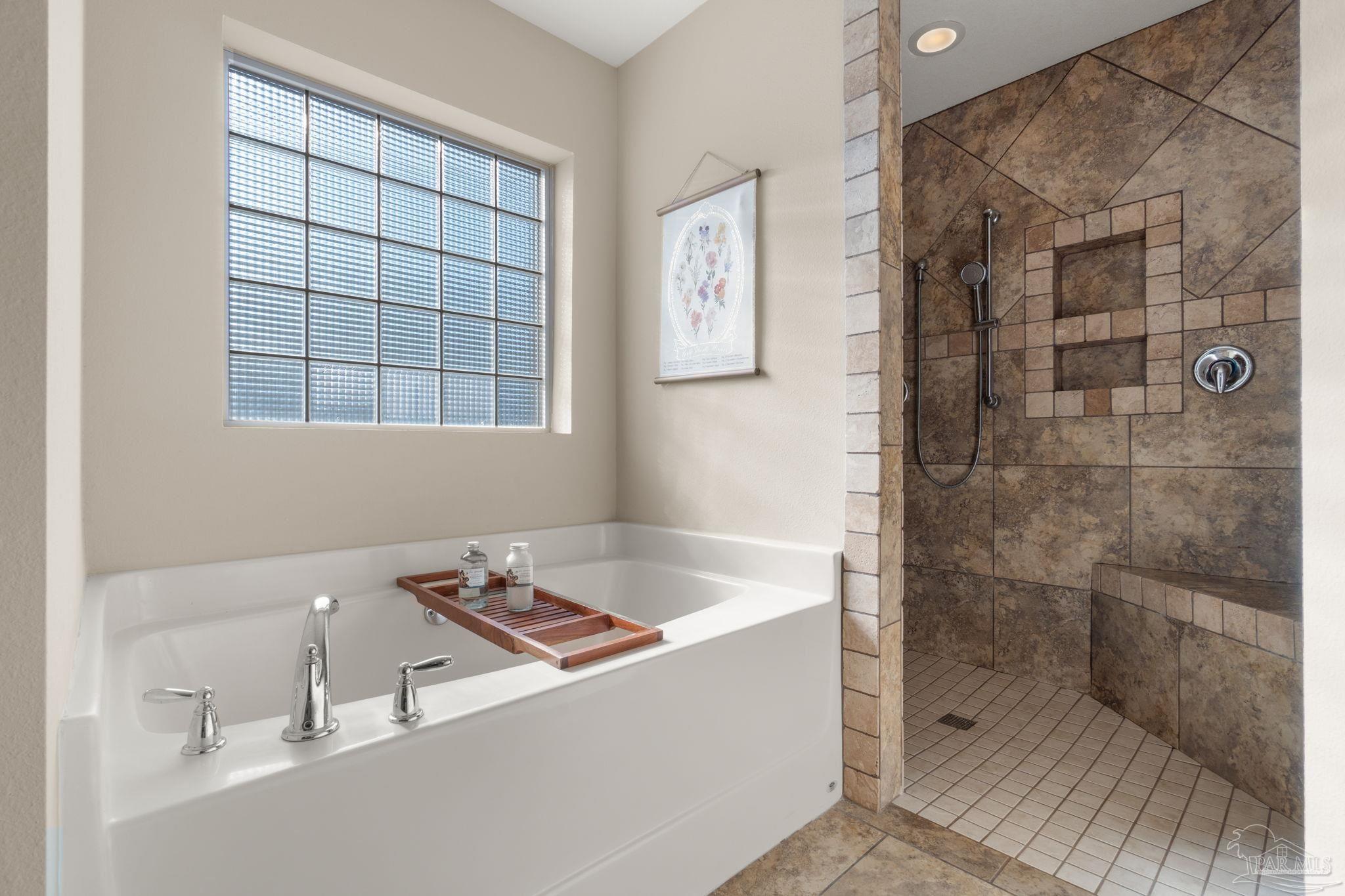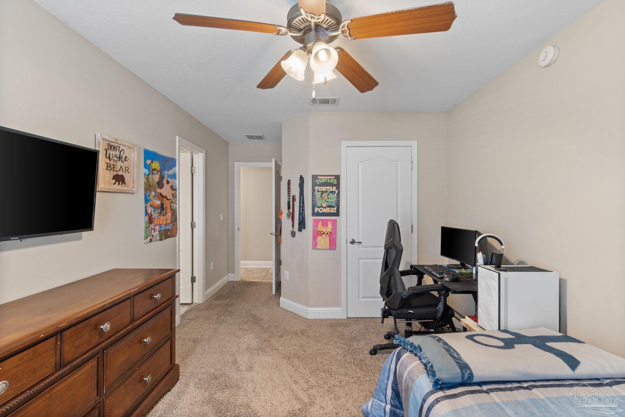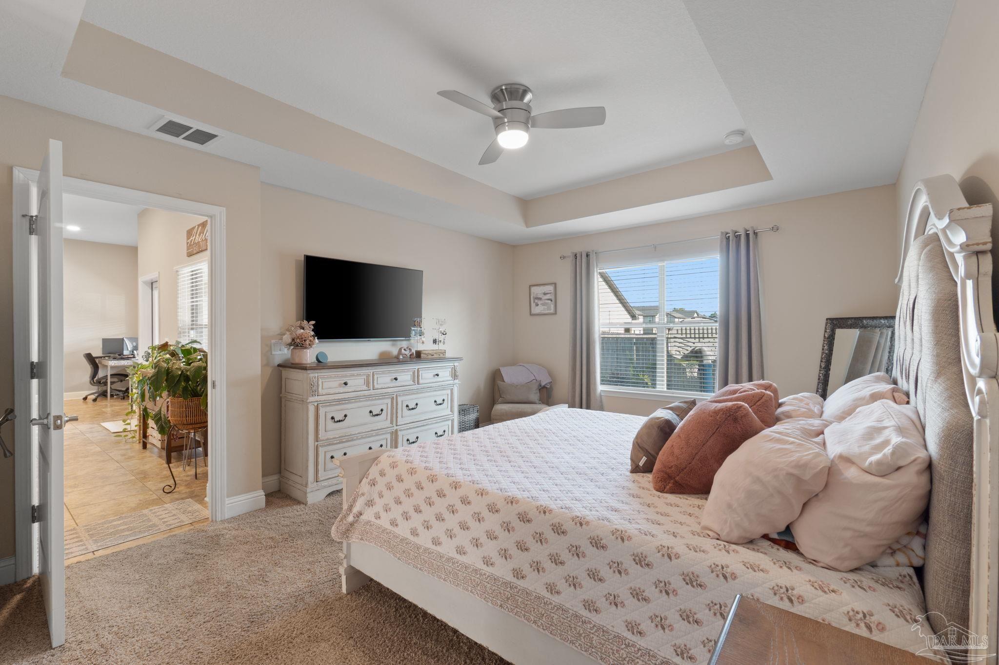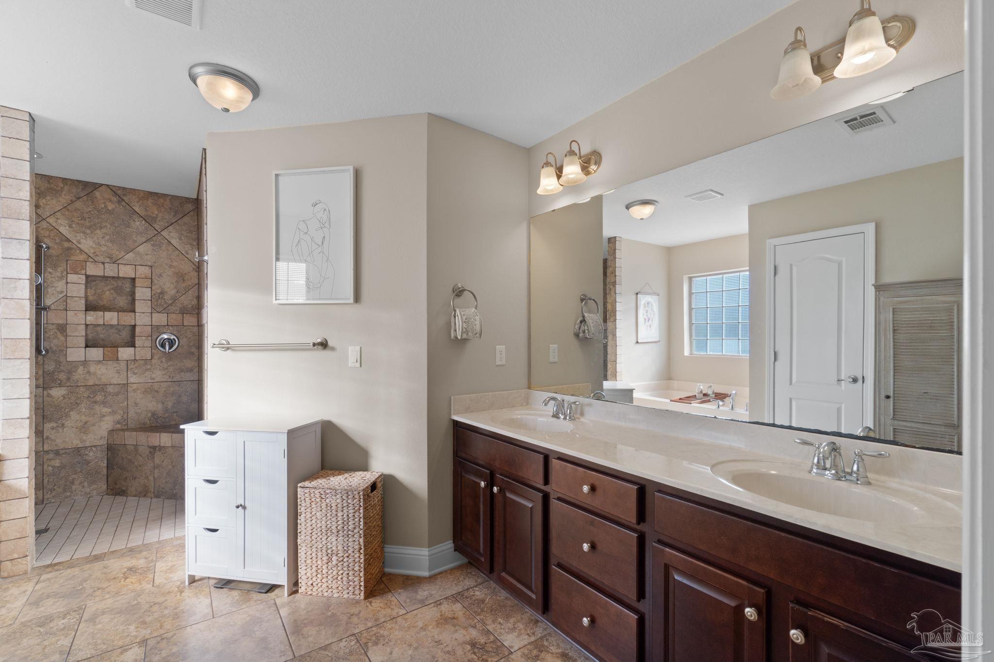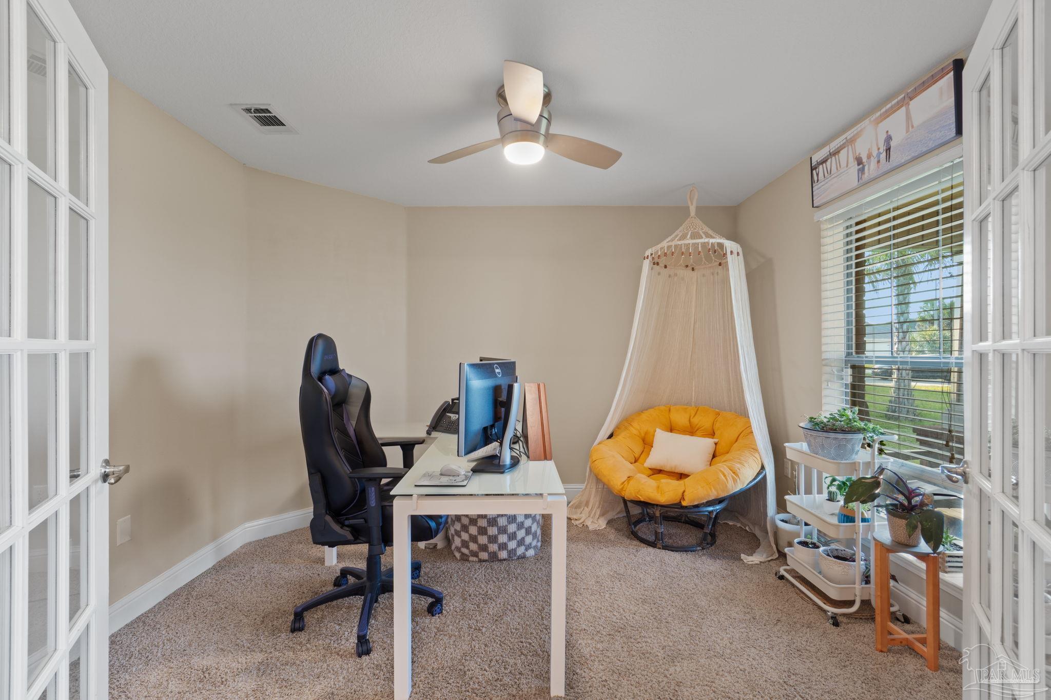 Welcome to your dream POOL home in The Meadows! This stunning 4 bedroom, 3 bathroom all-brick home is tucked away on a quiet cul-de-sac in one of Navarre's most desirable neighborhoods. From the moment you arrive, you'll notice the charming covered front porch, extended driveway, and spacious 3-car garage. Inside, the thoughtful floor plan also offers a formal dining room and a versatile office/flex room behind French doors. The living room features a custom built-in, while the kitchen is a showstopper with granite countertops, stainless steel appliances, and a tasteful backsplash. The oversized laundry room with built-ins serves as a butler pantry for added convenience and storage. The spacious master bedroom is a true retreat, complete with a fantastic en suite bathroom featuring dual vanities, a soaking tub, a walk-in tiled shower with dual shower heads and two walk in closets! The split floor plan features three other great sized bedrooms on the other side of the house, two of which with a full bathroom between them. The 4th bedroom has a walk-in closet and the hallway accessible full third bathroom also has access directly to the back patio, perfect for access to the pool while you're outside having fun. Speaking of which...outdoors your private oasis awaits! Enjoy the custom saltwater gunite pool and hot tub, all overlooked by a covered back patio perfect for relaxing or entertaining year-round and bordered by beautiful palm trees! Additional upgrades include fully paid-off solar panels, a new roof (2021), and a new water heater (2024) for peace of mind. With 4 spacious bedrooms, 3 full baths, and plenty of flexible living space, this home blends comfort, efficiency, and style in an unbeatable East Navarre location close to Hurlburt Field and Navarre's beautiful sugar white beaches. Don't miss your chance to live in The Meadows, schedule your showing today!