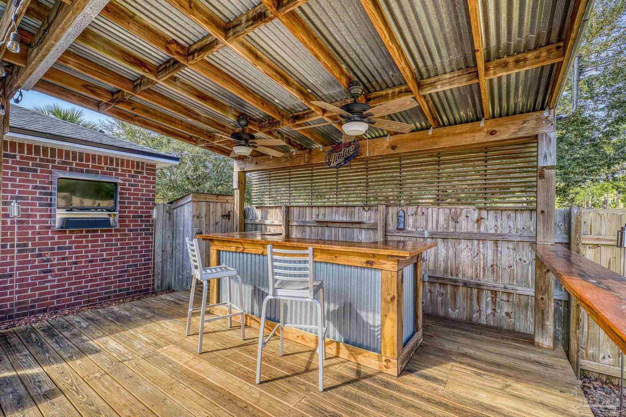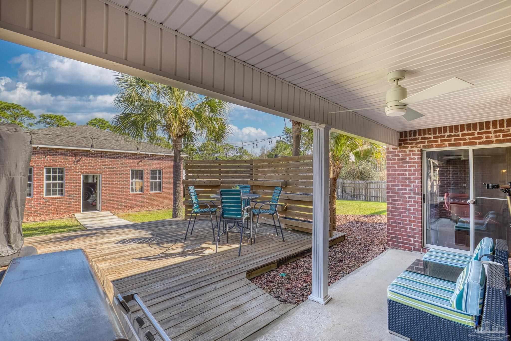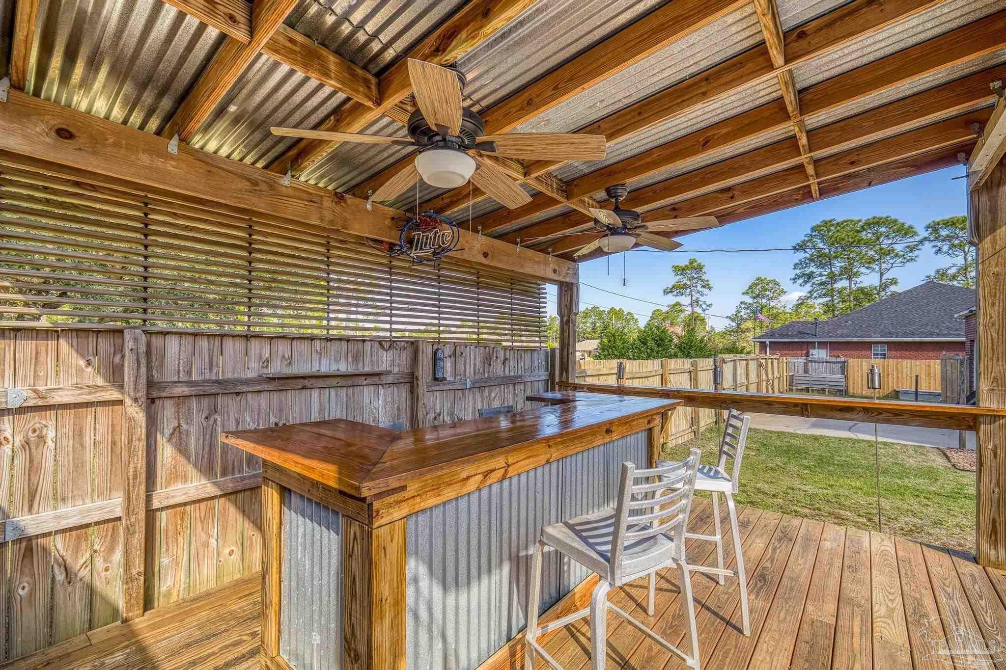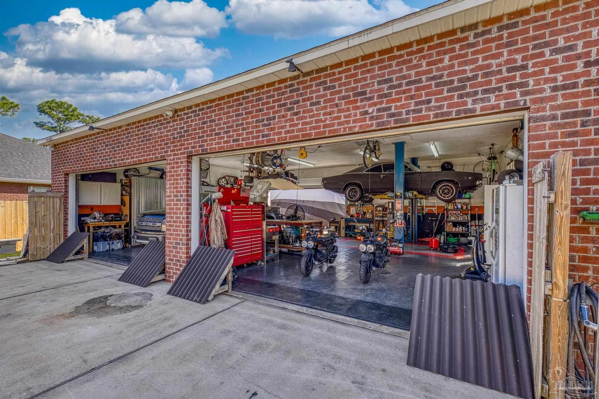 LIMITED TIME OFFERING for this home with standout feature of an additional detached - ALL BRICK - 1200 sq ft garage – perfect for the tinkerer or just to SAVE MONEY on storage. This versatile space offers endless possibilities – ideal for the ultimate game room, gym, entertainment area for holidays or other get-togethers, storing boats, classic cars, or creating a workshop or hobby area. There is a separate electrical panel, 3 large 8' tall by 16' wide roll up doors, lots of built-in storage cabinets & additional driveways. Embrace the epitome of Florida living in this expansive - meticulously maintained home, nestled on a sprawling corner lot with an on-property RV parking area in the backyard. Located off the beaten paths yet within the coveted Holley By The Sea community in Navarre. Step inside & be captivated by the generous layout, designed for seamless entertaining & comfortable living. The home boasts 4 bedrooms & 3 baths, providing ample space for everyone. There is a formal dining room & FLEX room in the front of the home that flow through to the kitchen & great room which are flooded with natural light, creating an inviting atmosphere. The interior features high smooth ceilings, hardwood flooring, updated fixtures, & open kitchen with an island & lots of counter space. The guest suite features a bath with door to the covered patio. The main suite is a true sanctuary with door to the patio & en-suite bath, offering tile flooring, 2 spacious walk-in closets, water closet, soaking tub & separate shower. Extend your living space outdoors onto the large patio & deck complete with built-in bar, NEW fire pit & planter box wall, perfect for enjoying the gentle breezes & Florida sunshine. The expansive corner .63 acre lot provides ample room for outdoor activities, gardening, or simply relaxing in your private oasis & there is plenty of shade in the back yard & also for a pool but who needs a pool since HBTS offers 3 & lots of amenities. SELLER CONCESSIONS OFFERED.