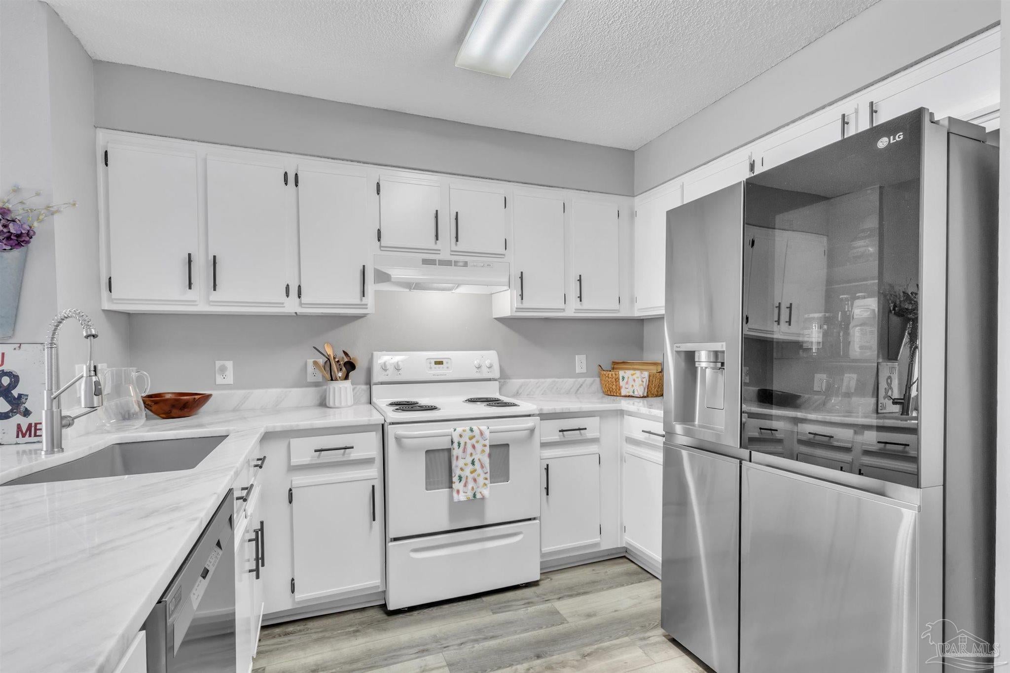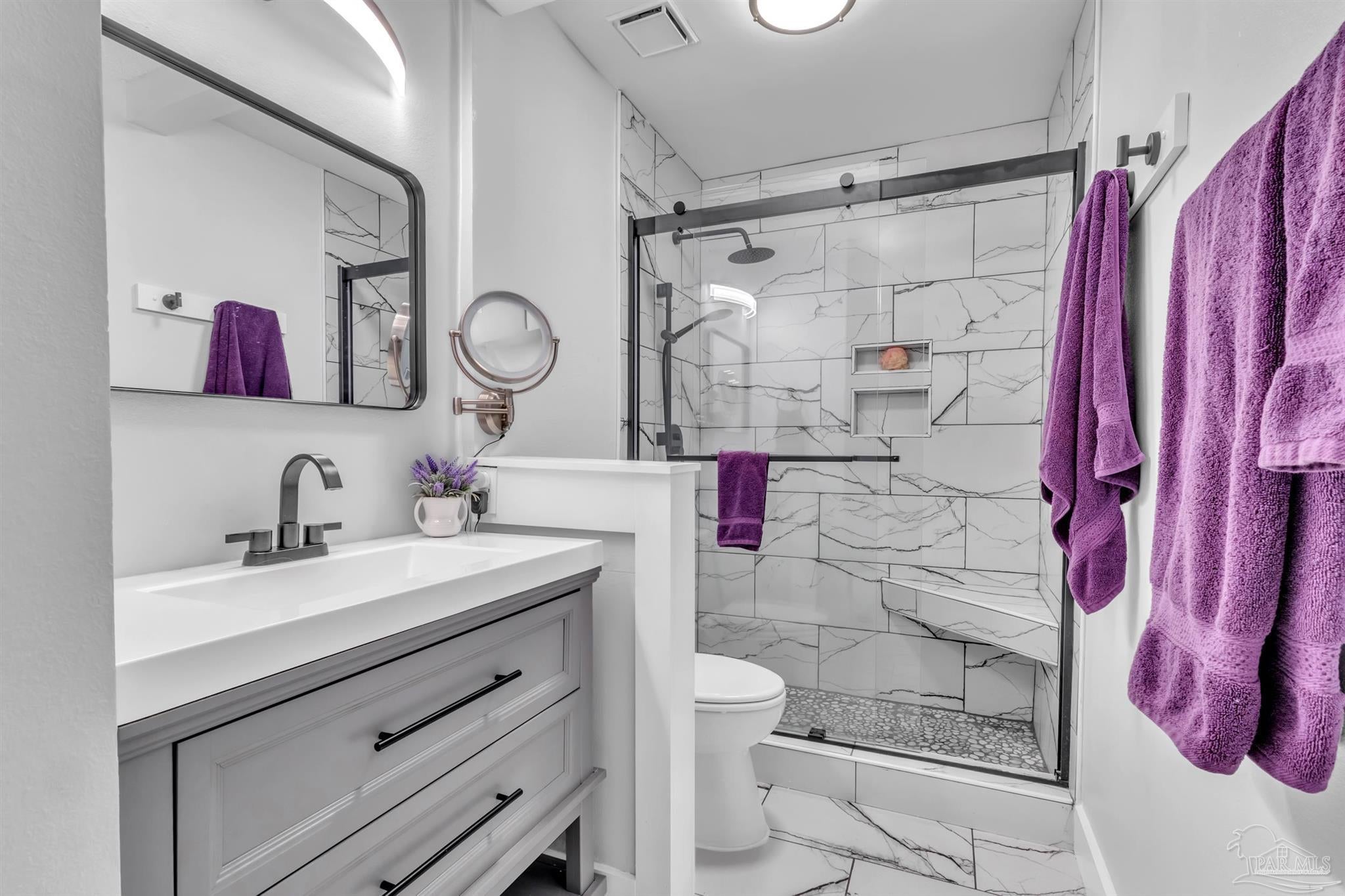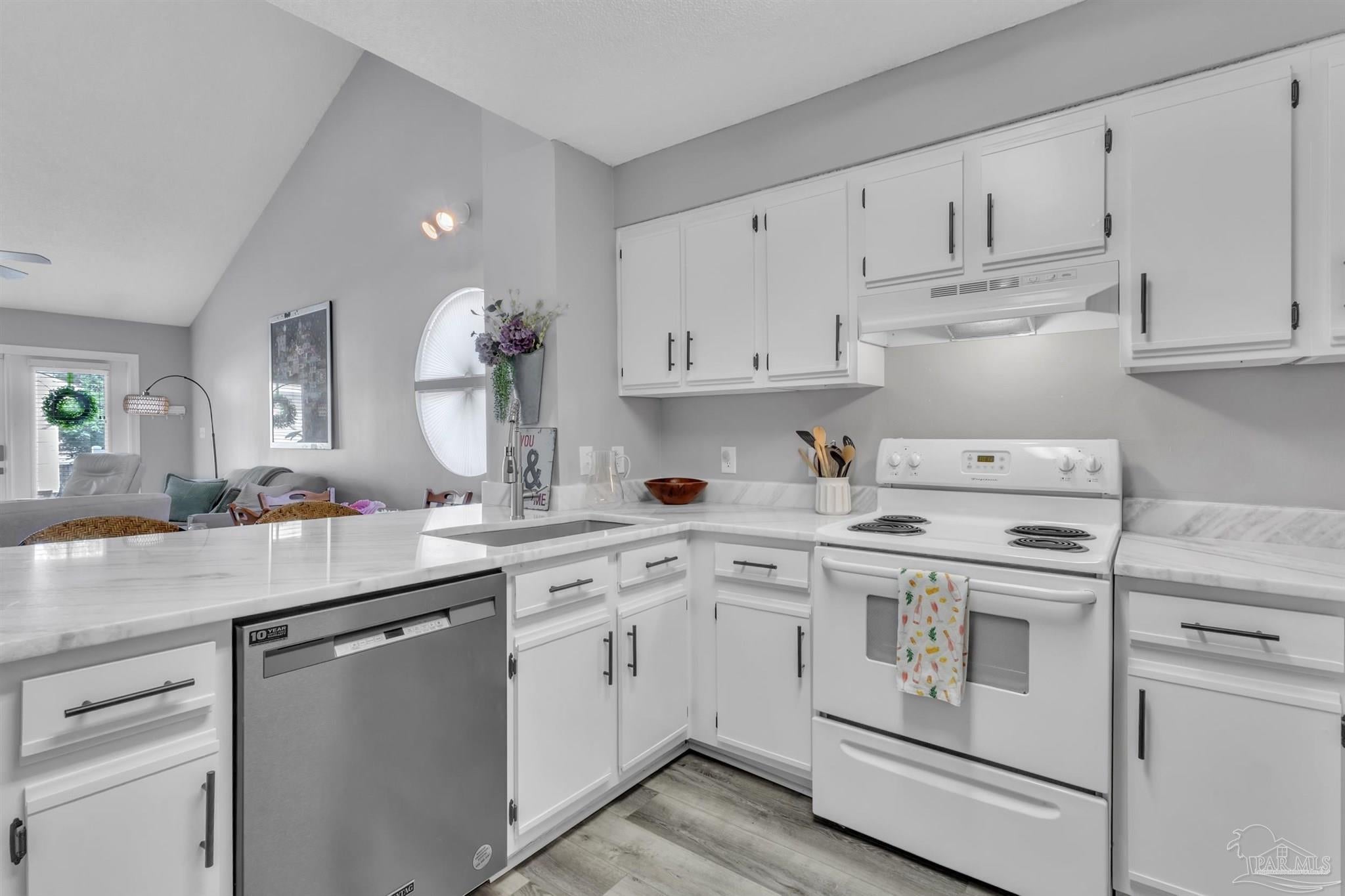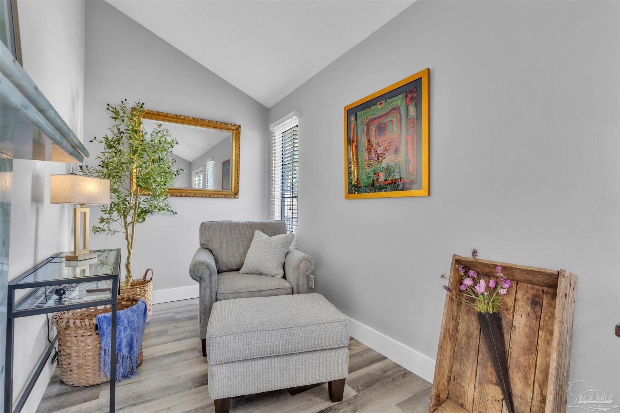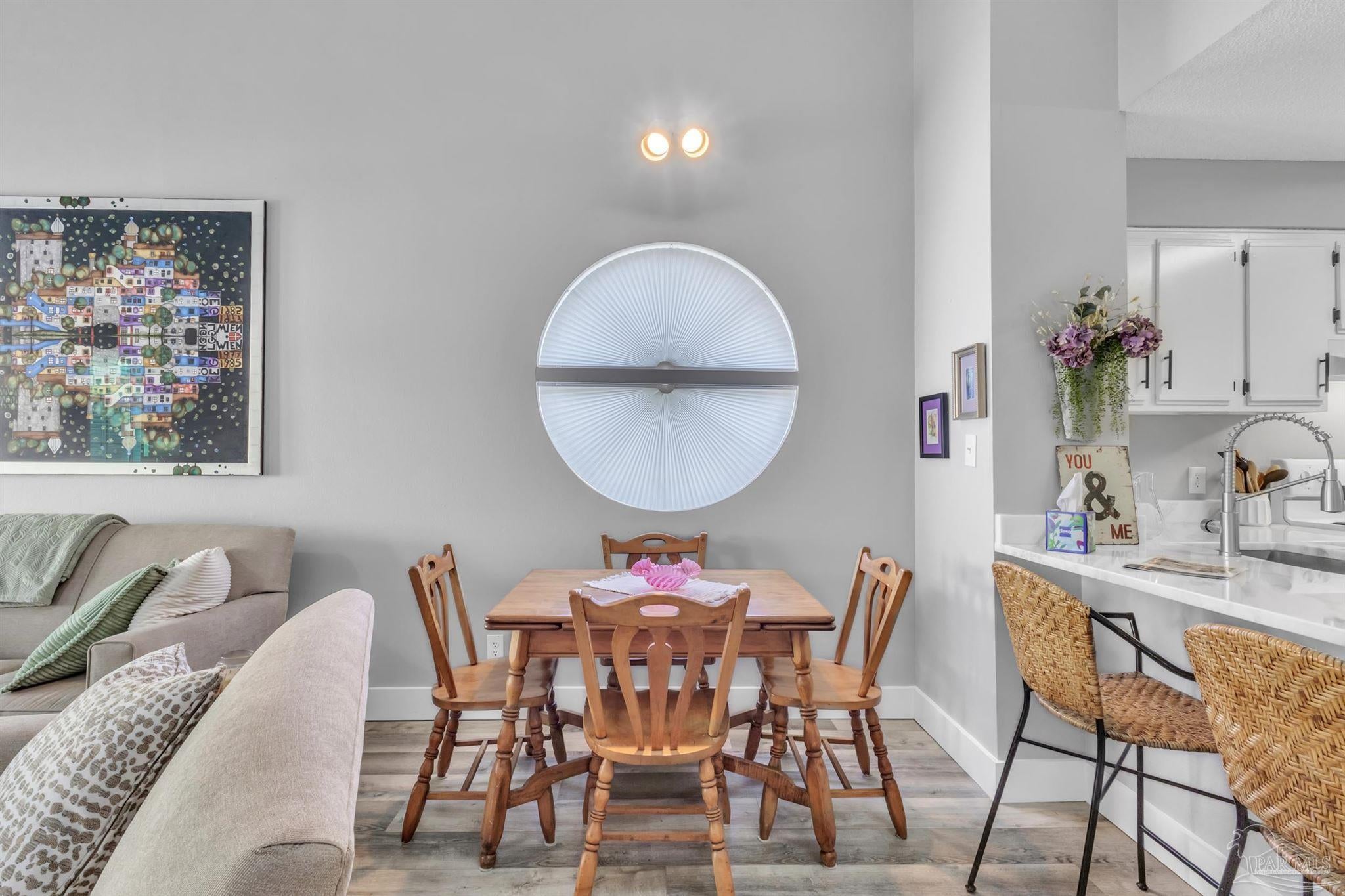 *First floor bedroom is considered primary, second floor is considered a loft bedroom*. Beautifully updated 2-bedroom, 2-bathroom condo in the highly desirable Villas on the Square community. This home blends comfort and style with a dramatic wrap-around quartzite fireplace that anchors the open living area, creating the perfect spot for relaxing evenings or entertaining. Just off the living room, a charming reading nook invites you to curl up with a book and soak in the natural light streaming through the windows. The home also boasts unique architectural details, including circular windows that fill the space with natural light. The modern kitchen features crisp white cabinets, marble countertops, sleek hardware, and stainless-steel appliances, while both bedrooms offer comfort and privacy. You'll also enjoy that the laundry is inside this unit and not in the garage, making laundry days a breeze with no stair climbing required! A cozy front porch provides the perfect spot for your morning coffee, while the community’s sparkling pool is just steps away for weekend relaxation. With recent upgrades, including luxury vinyl flooring, marble countertops, and an updated bathroom with a large porcelain tile step-in shower, this home is truly move-in ready. Located in the heart of Pensacola, you’re minutes from Cordova Mall, Pensacola International Airport, downtown dining, NAS Pensacola, and the area’s world-famous white-sand beaches. Whether you’re looking for your first home, downsizing for a simpler lifestyle, or adding to your investment portfolio, this condo offers the perfect blend of location, style, and value. This is your chance to own a stylish home in one of Pensacola’s most convenient neighborhoods. Don’t wait, schedule your showing today!