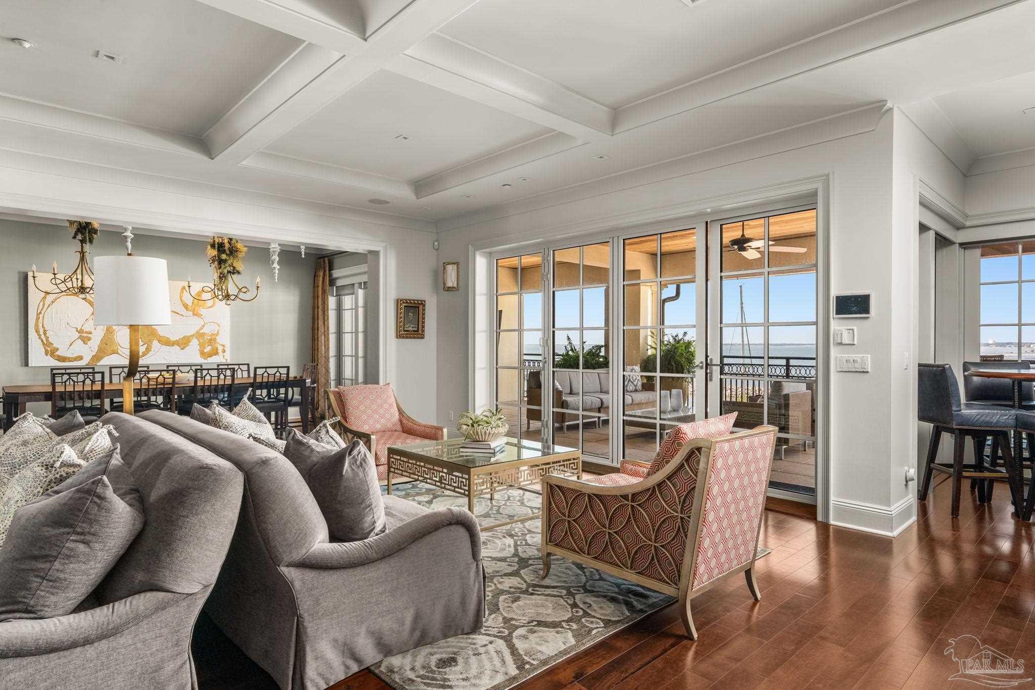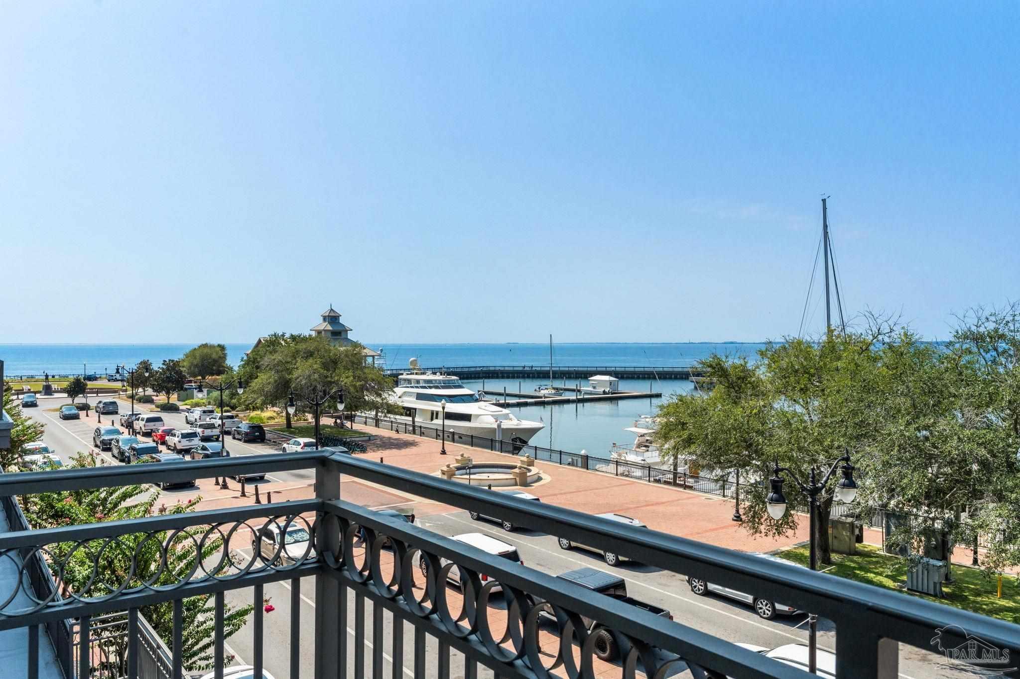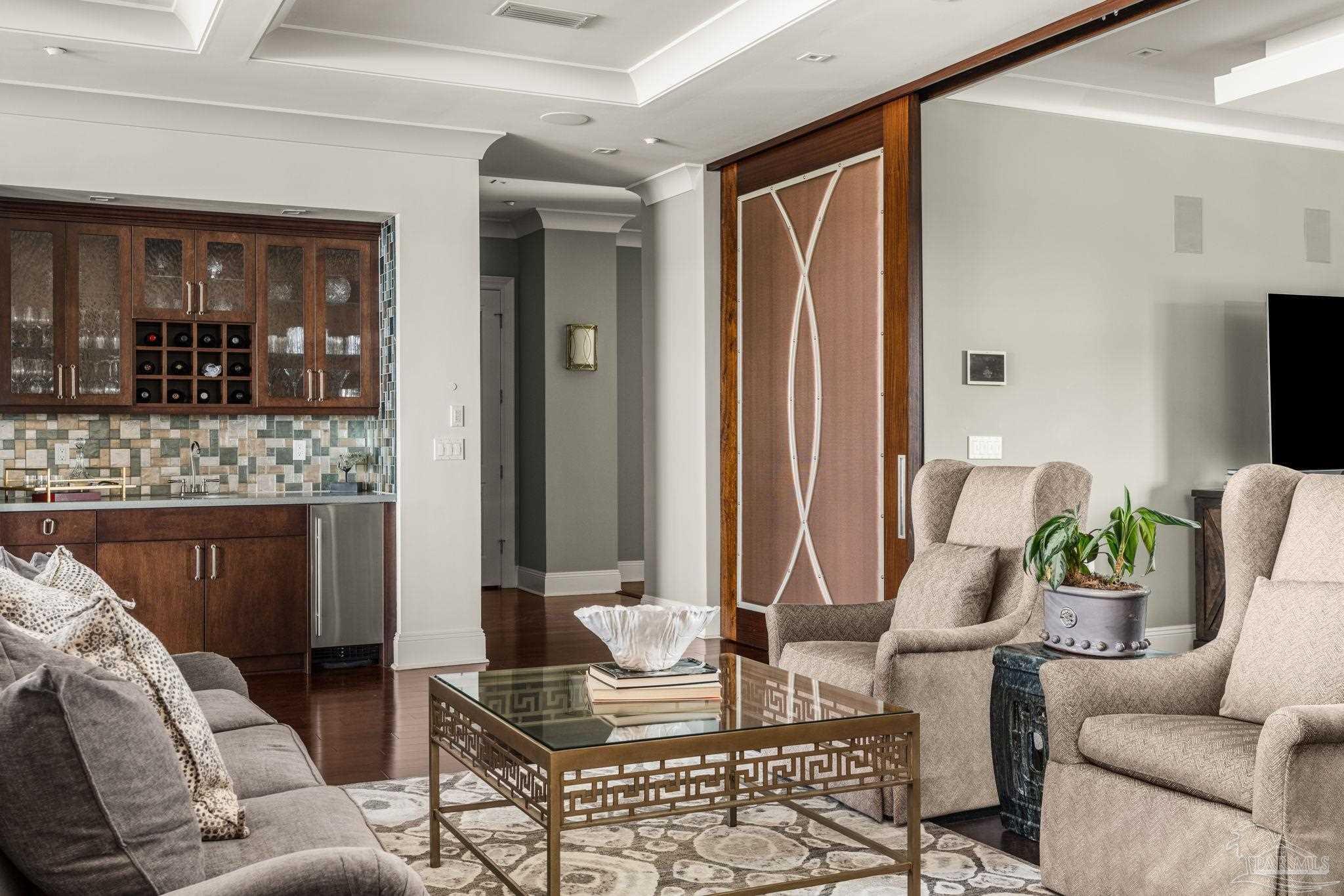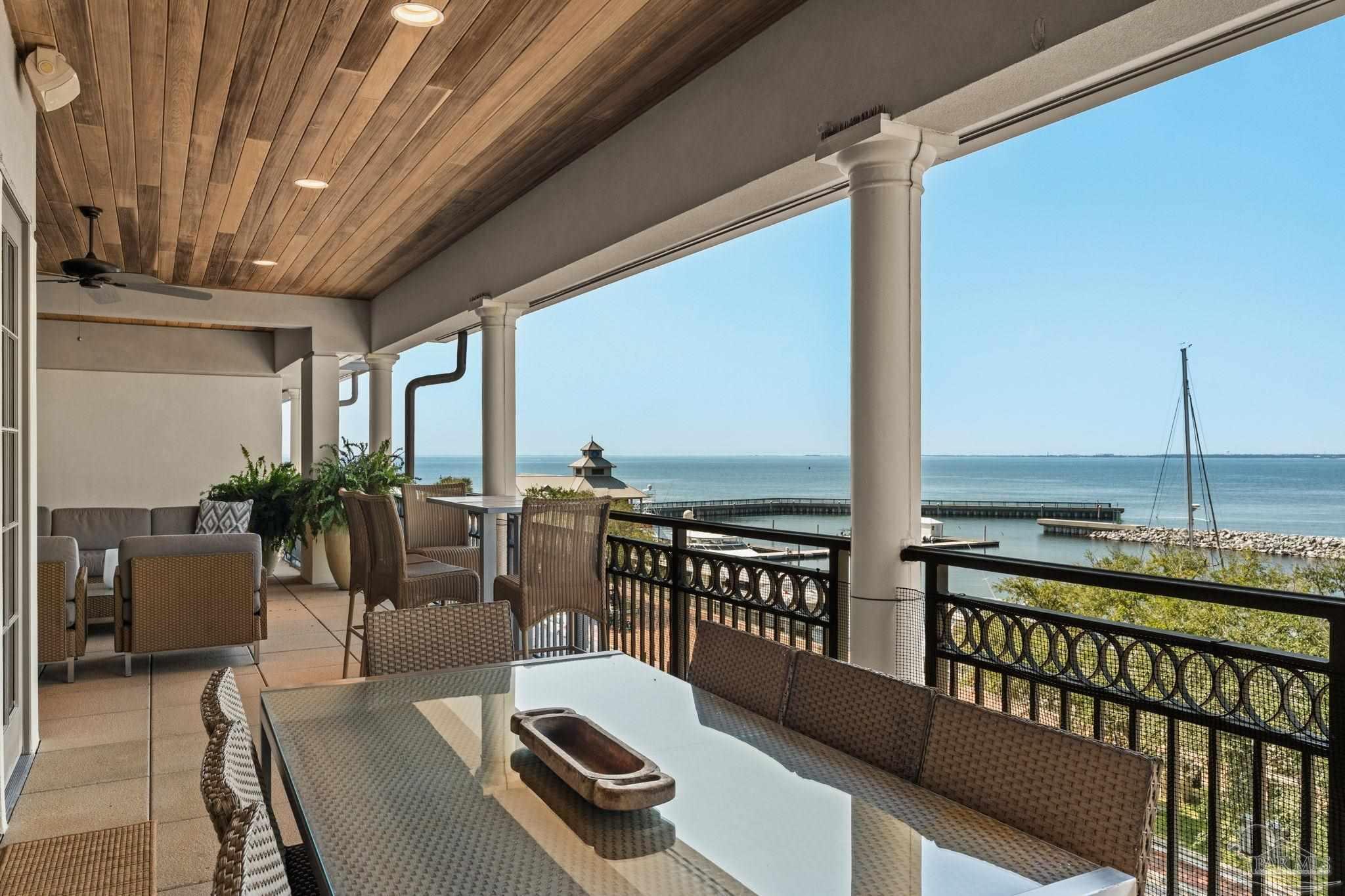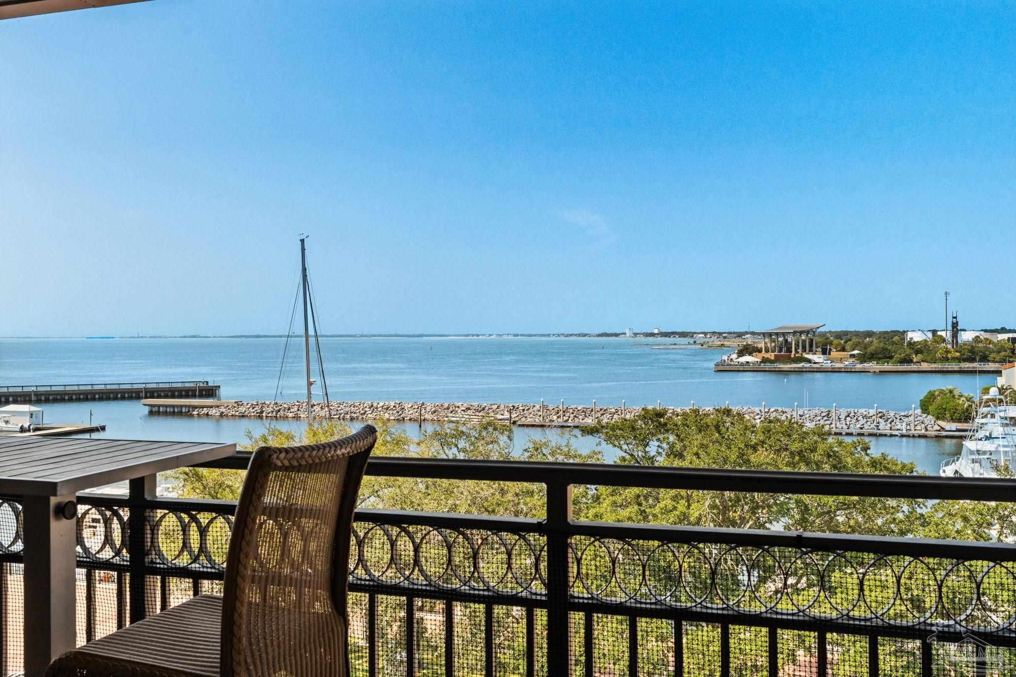 Welcome to 850 S Palafox St, a stunning 3-bedroom, 3.5-bath luxury bayfront condominium in the heart of downtown Pensacola, offering unrivaled panoramic views of Pensacola Bay from both sides. This exquisite residence masterfully blends sophisticated design, cutting-edge technology, and prime convenience for an unparalleled coastal lifestyle. Located just south of Main Street, it provides serene privacy while being steps from vibrant dining, boutique shopping, and Wahoos stadium. The main living area captivates with elegant coffered ceilings, expansive windows with Q-Motion motorized blinds, and an accordion door opening to a private balcony, creating seamless indoor-outdoor flow ideal for entertaining. The gourmet kitchen is a chef’s dream, boasting sleek concrete countertops, premium Wolf appliances, a built-in Sub-Zero refrigerator, a microwave with warming drawer, and stylish bar seating. Off the dining room, a bar room/butler’s pantry with custom cabinetry ensures effortless hosting. The primary suite is a private retreat, featuring its own balcony, dual custom walk-in closets, and luxurious his-and-hers bathrooms with granite finishes. Two additional en suite bedrooms, a dedicated office, and custom storage solutions provide versatility and comfort. Equipped with a state-of-the-art Control4 smart home system, this residence offers seamless control of lighting, audio/video, climate, security, window treatments, and entertainment. Perfectly balancing tranquility and urban energy, 850 S Palafox redefines coastal luxury in downtown Pensacola.