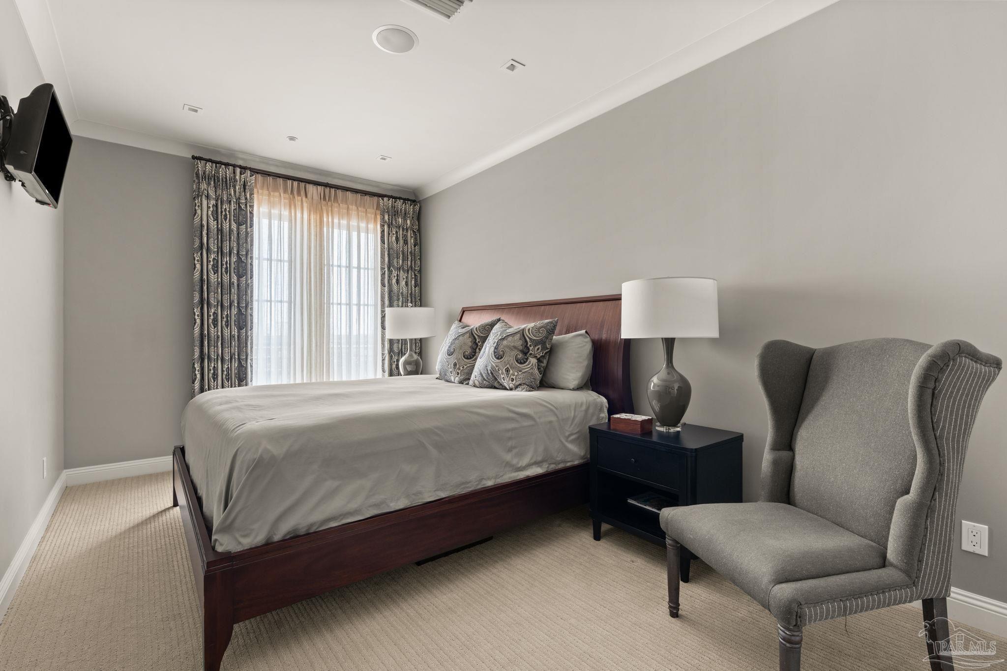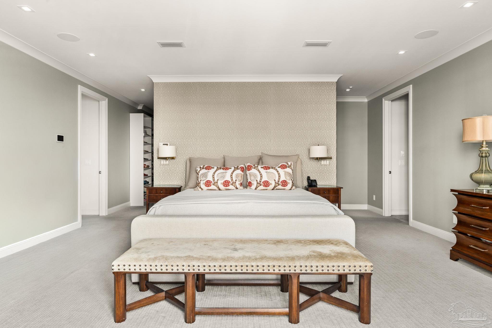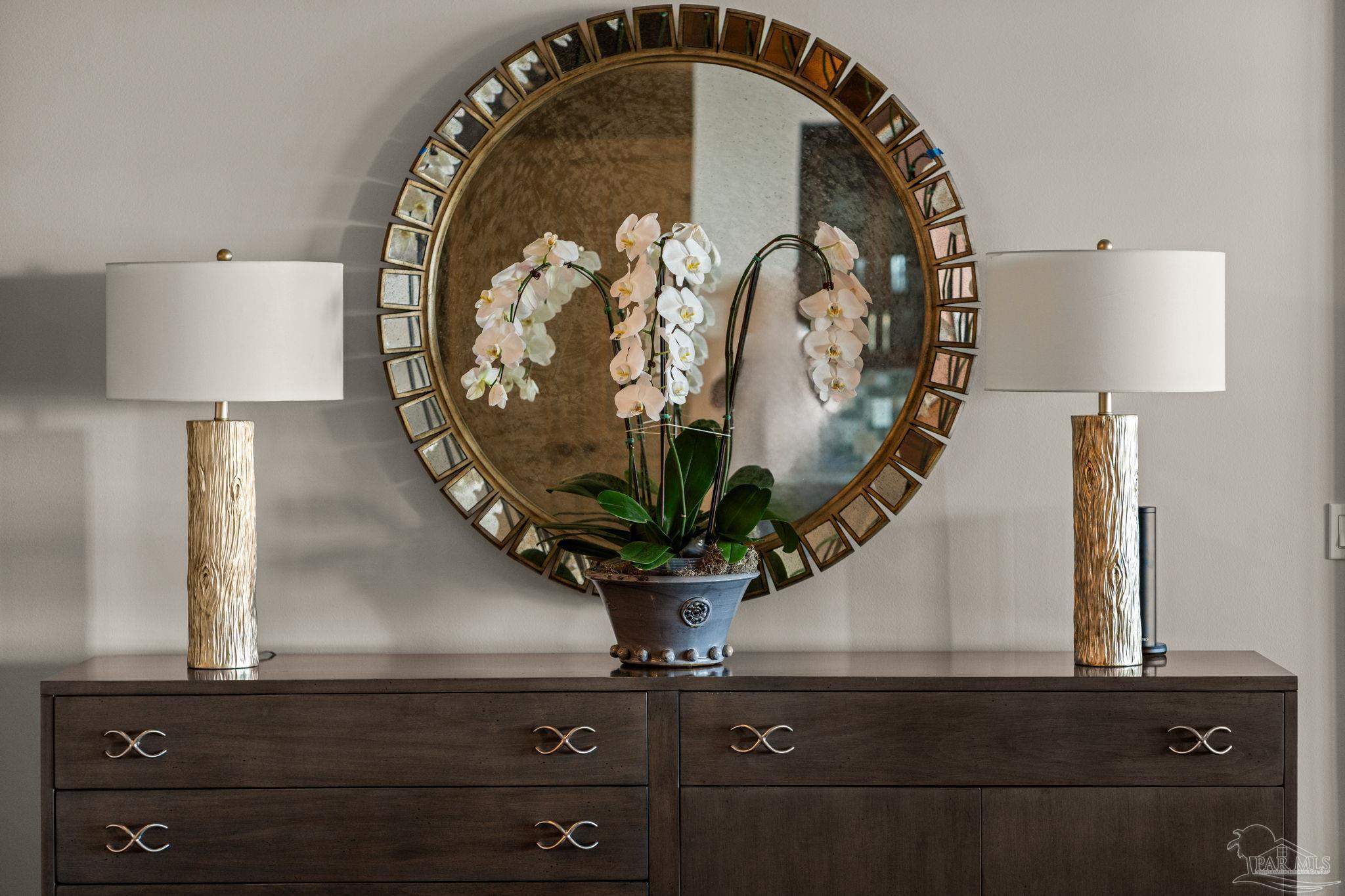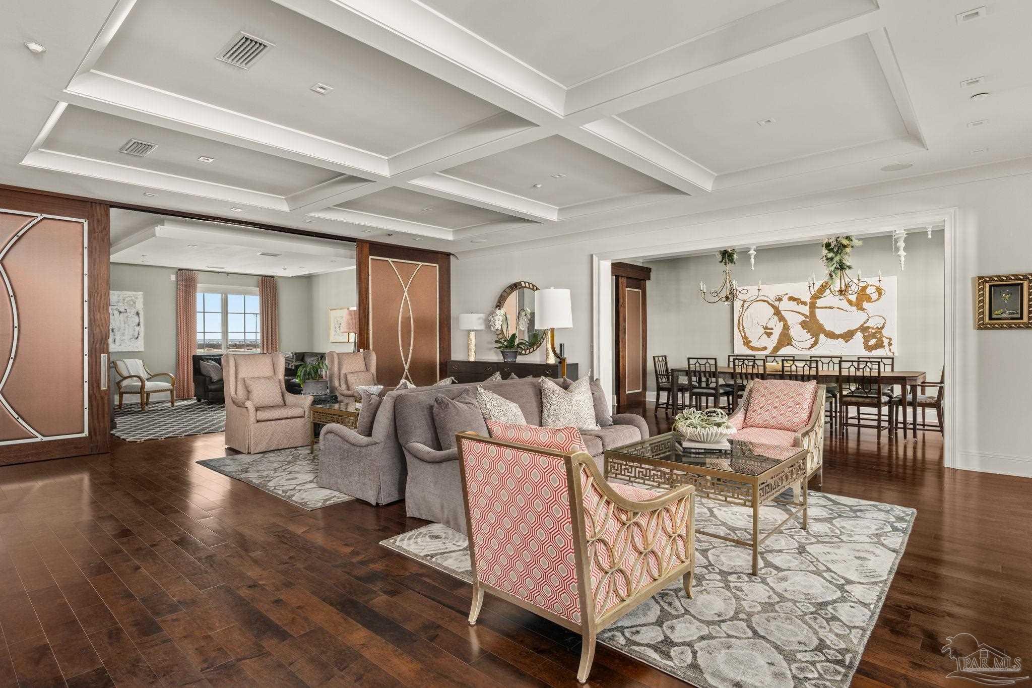 Welcome to 850 S Palafox St, a stunning 3-bedroom, 3.5-bath luxury bayfront condominium in the heart of downtown Pensacola, offering unrivaled panoramic views of Pensacola Bay from both sides. This exquisite residence masterfully blends sophisticated design, cutting-edge technology, and prime convenience for an unparalleled coastal lifestyle. Located just south of Main Street, it provides serene privacy while being steps from vibrant dining, boutique shopping, and Wahoos stadium. The main living area captivates with elegant coffered ceilings, expansive windows with Q-Motion motorized blinds, and an accordion door opening to a private balcony, creating seamless indoor-outdoor flow ideal for entertaining. The gourmet kitchen is a chef’s dream, boasting sleek concrete countertops, premium Wolf appliances, a built-in Sub-Zero refrigerator, a microwave with warming drawer, and stylish bar seating. Off the dining room, a bar room/butler’s pantry with custom cabinetry ensures effortless hosting. The primary suite is a private retreat, featuring its own balcony, dual custom walk-in closets, and luxurious his-and-hers bathrooms with granite finishes. Two additional en suite bedrooms, a dedicated office, and custom storage solutions provide versatility and comfort. Equipped with a state-of-the-art Control4 smart home system, this residence offers seamless control of lighting, audio/video, climate, security, window treatments, and entertainment. Perfectly balancing tranquility and urban energy, 850 S Palafox redefines coastal luxury in downtown Pensacola.