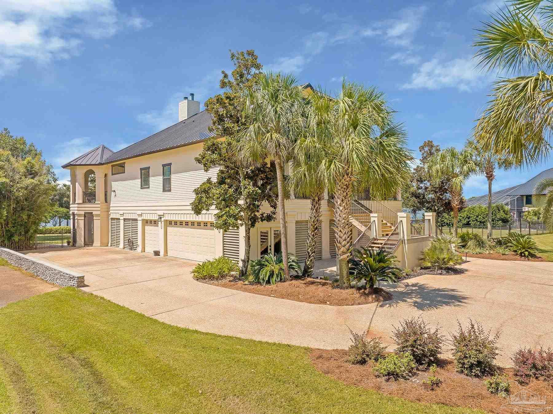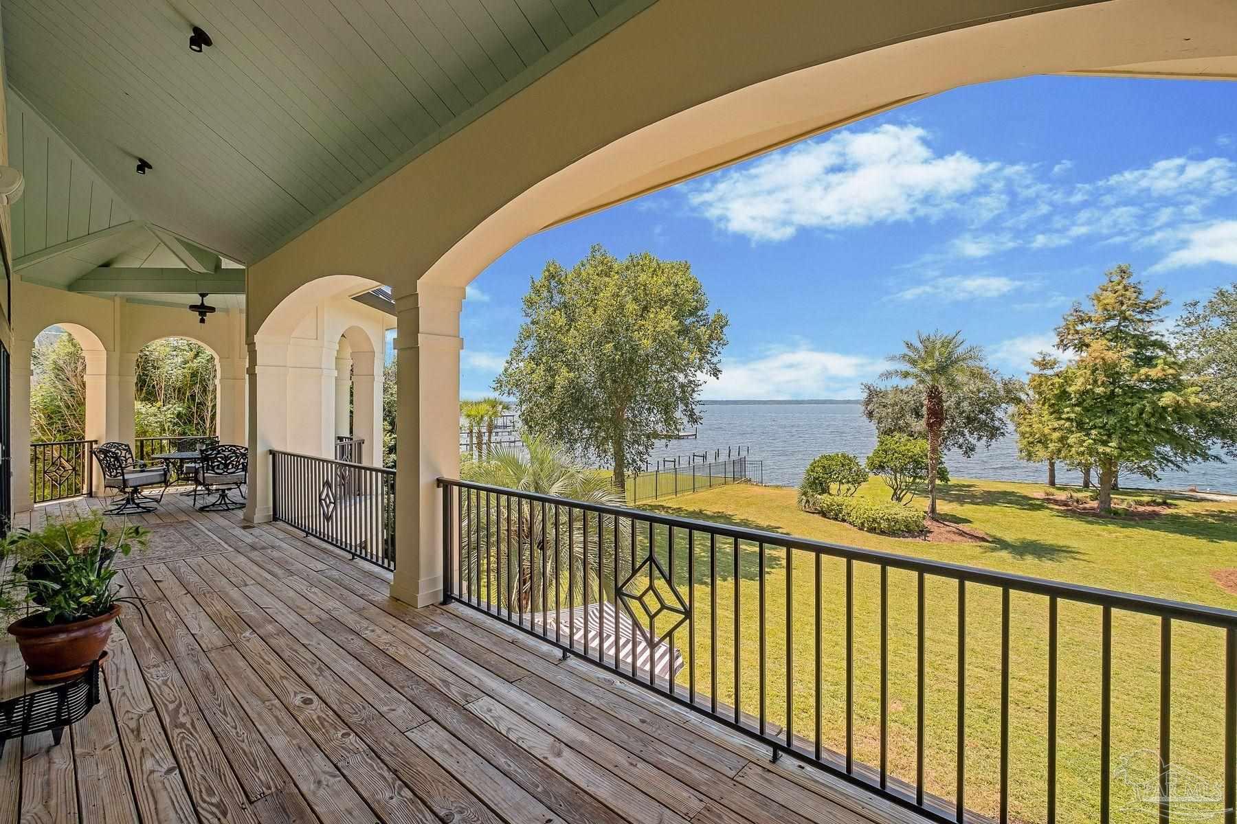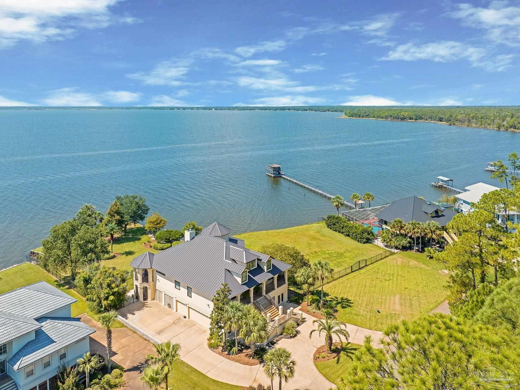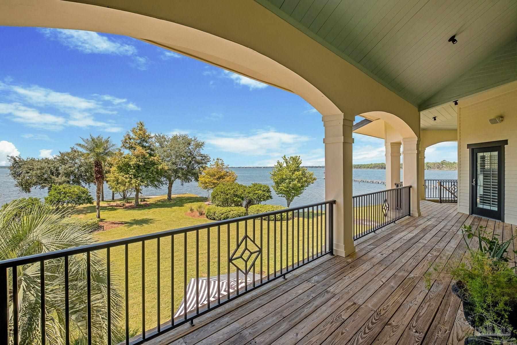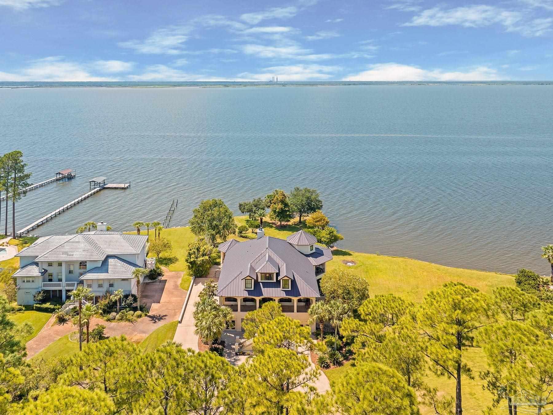 Salt + Serenity Home commands an unparalleled waterfront position on Escambia Bay, offering sweeping 270° views & the ultimate coastal lifestyle. Set on an elevated, professionally landscaped lot in the exclusive Bayside North Island community, this extraordinary estate combines timeless architectural elegance with modern luxury. Approach via a circular driveway to an imperial staircase leading to a covered balcony and grand entrance framed by classical arches and decorative columns. Inside, soaring hand-painted metal ceilings, rich pine floors, and a dramatic spiral staircase that leads to a bonus crow's nest with stunning views. Large windows & French doors flood the home with natural light while perfectly framing the serene bay vistas. At the heart of the home, chef’s kitchen boasts a granite-topped island, a breakfast bar, a professional-grade gas range with double ovens, stainless steel appliances, and abundant custom cabinetry. The adjoining living areas feature a formal dining room, elegant sitting room, a grand family room with custom banquette, statement fireplace, & expansive water views. An office with bay views offers functional yet stylish workspaces. The primary suite is a true retreat, featuring lofty ceilings, French doors to the bay, and a spa-inspired bath. An additional guest suite with private bathrooms is located on the main level. Upstairs, you will find 2 more bedrooms, a guest bath, and a reading nook. Outdoor living is elevated with expansive covered decks, wrought iron fencing, and lush landscaping—an entertainer’s dream. The ground level offers a four-car garage, workshop, and spacious screened lanai ideal for large events cookouts. The backyard boasts ample room to accommodate a pool (virtually shown) or private dock. Deep-water access makes this property perfect for boating, fishing, and paddleboarding. This isn’t just a home—it’s a legacy, a retreat, and your front-row seat to life on the bay. Schedule your private tour today.