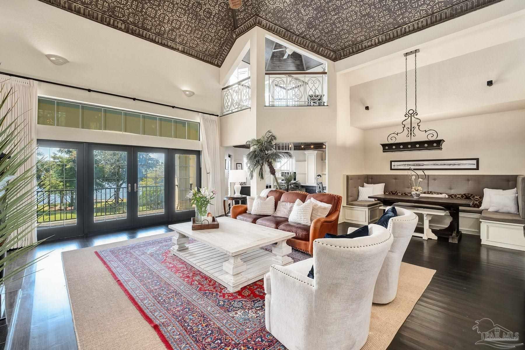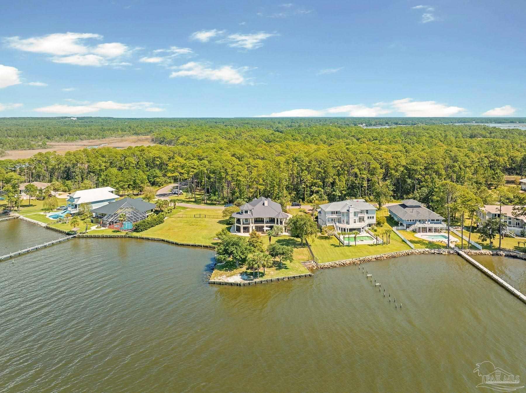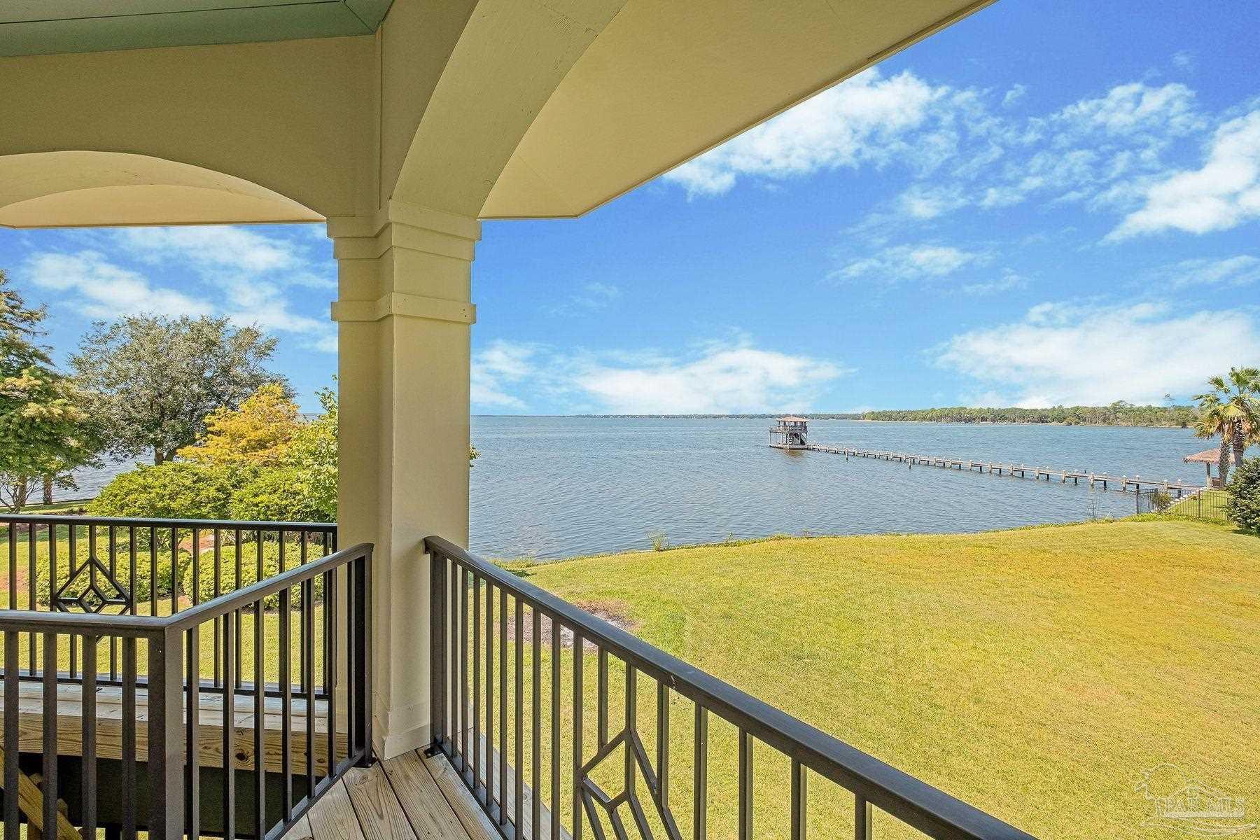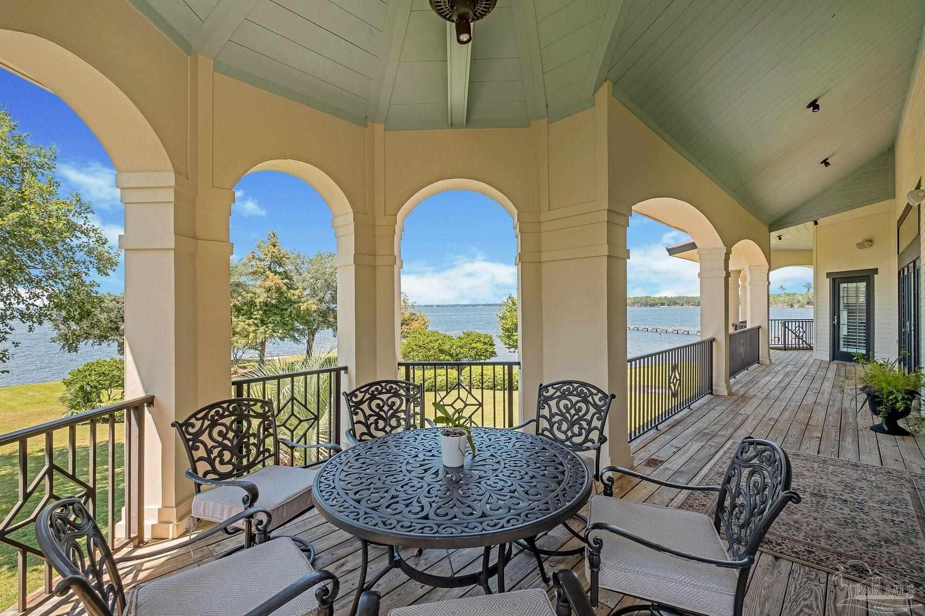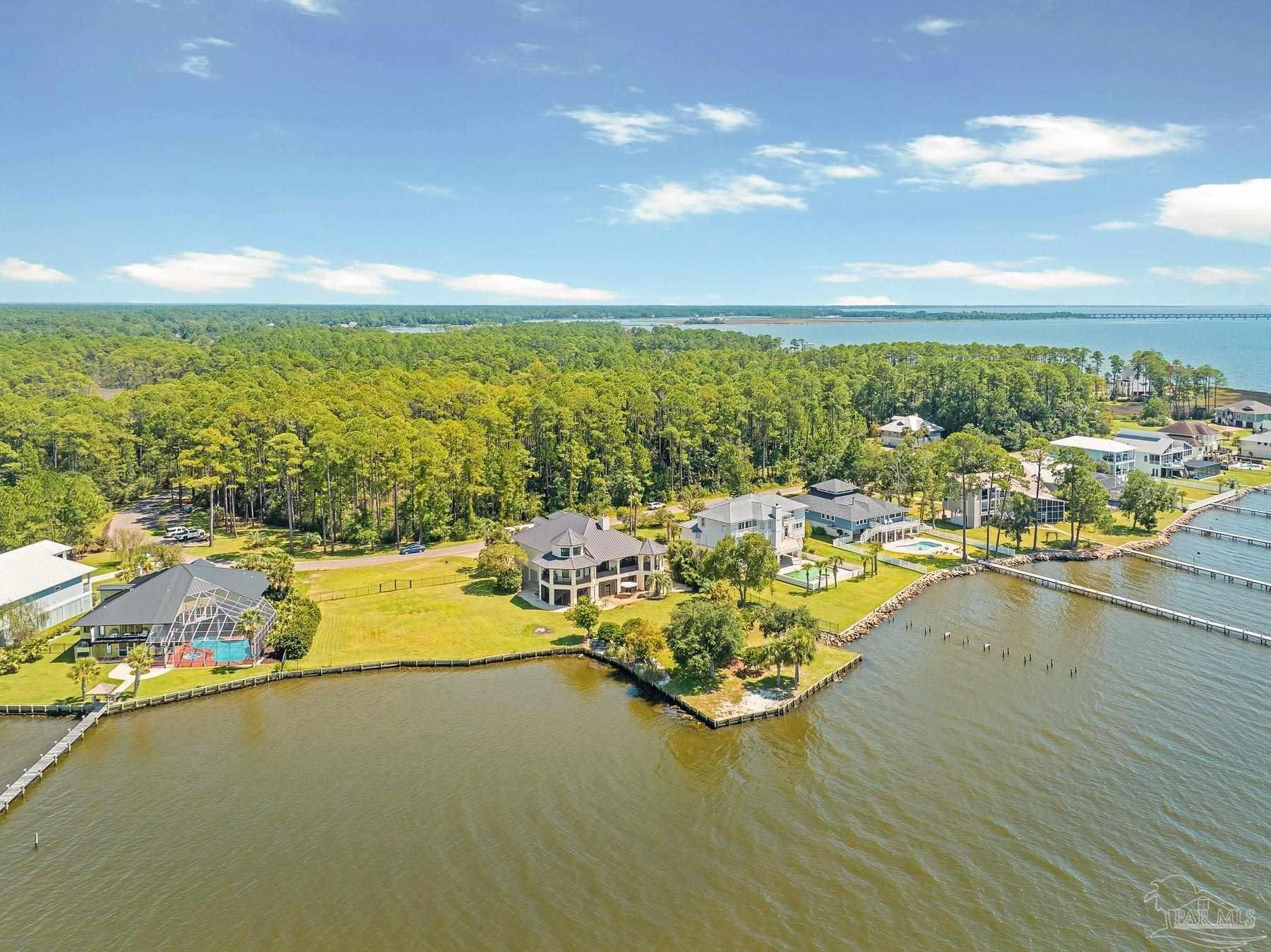 Salt + Serenity Home commands an unparalleled waterfront position on Escambia Bay, offering sweeping 270° views & the ultimate coastal lifestyle. Set on an elevated, professionally landscaped lot in the exclusive Bayside North Island community, this extraordinary estate combines timeless architectural elegance with modern luxury. Approach via a circular driveway to an imperial staircase leading to a covered balcony and grand entrance framed by classical arches and decorative columns. Inside, soaring hand-painted metal ceilings, rich pine floors, and a dramatic spiral staircase that leads to a bonus crow's nest with stunning views. Large windows & French doors flood the home with natural light while perfectly framing the serene bay vistas. At the heart of the home, chef’s kitchen boasts a granite-topped island, a breakfast bar, a professional-grade gas range with double ovens, stainless steel appliances, and abundant custom cabinetry. The adjoining living areas feature a formal dining room, elegant sitting room, a grand family room with custom banquette, statement fireplace, & expansive water views. An office with bay views offers functional yet stylish workspaces. The primary suite is a true retreat, featuring lofty ceilings, French doors to the bay, and a spa-inspired bath. An additional guest suite with private bathrooms is located on the main level. Upstairs, you will find 2 more bedrooms, a guest bath, and a reading nook. Outdoor living is elevated with expansive covered decks, wrought iron fencing, and lush landscaping—an entertainer’s dream. The ground level offers a four-car garage, workshop, and spacious screened lanai ideal for large events cookouts. The backyard boasts ample room to accommodate a pool (virtually shown) or private dock. Deep-water access makes this property perfect for boating, fishing, and paddleboarding. This isn’t just a home—it’s a legacy, a retreat, and your front-row seat to life on the bay. Schedule your private tour today.