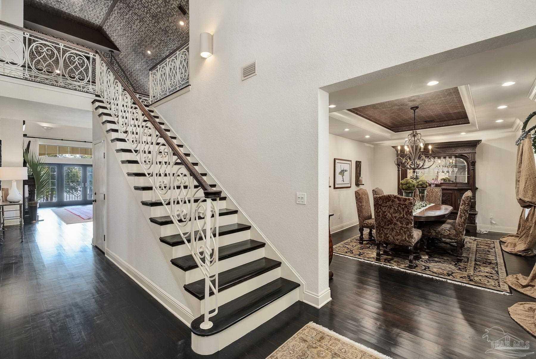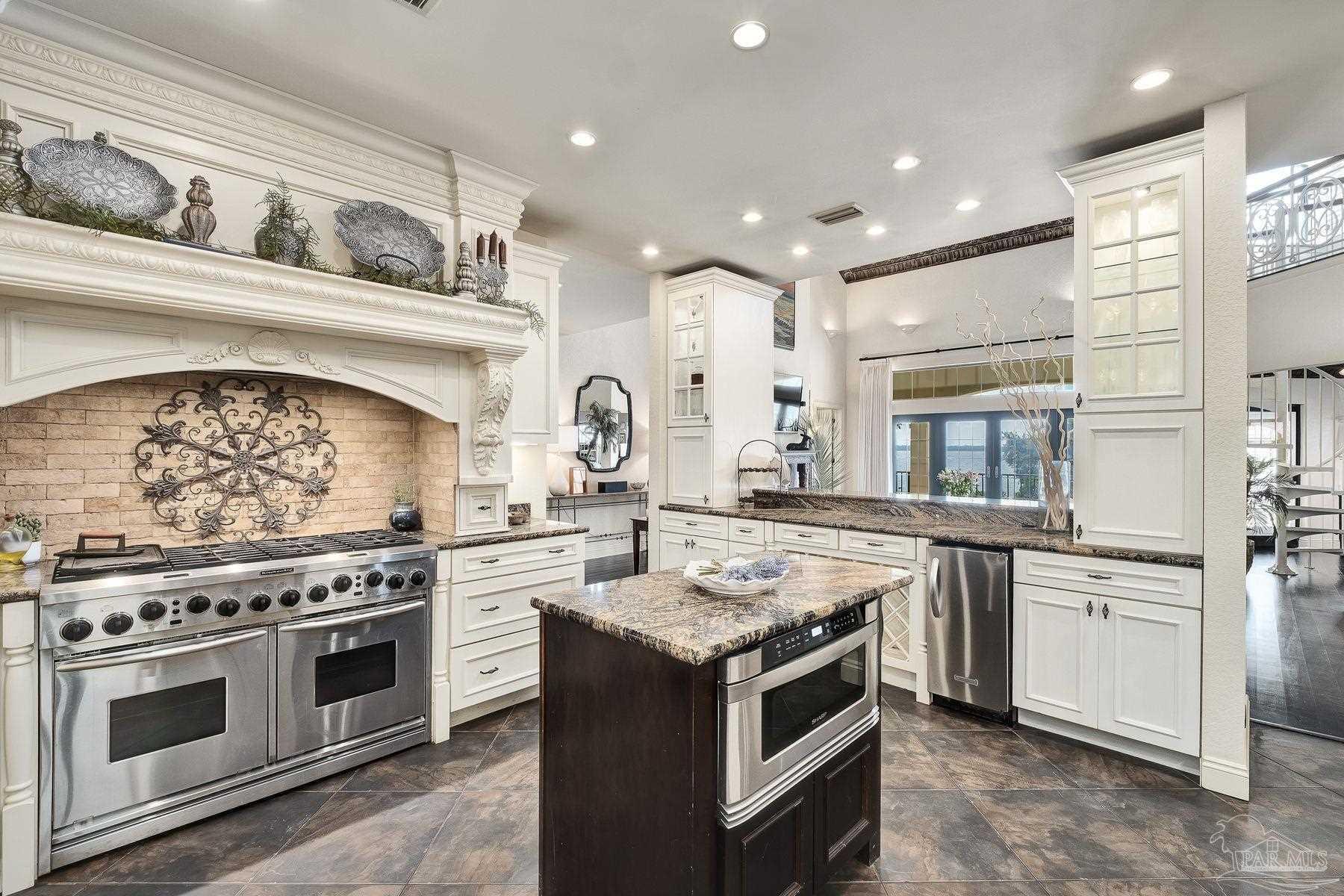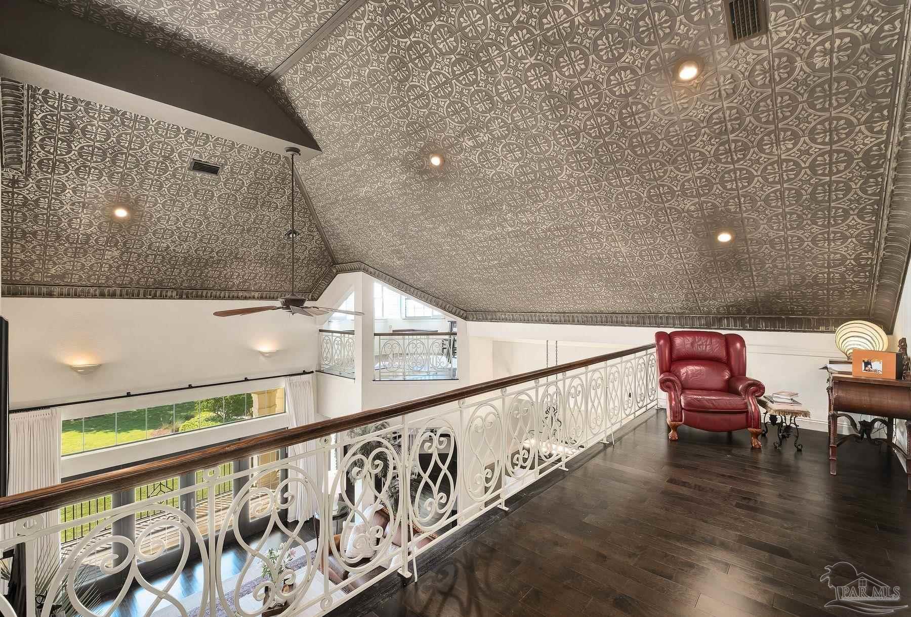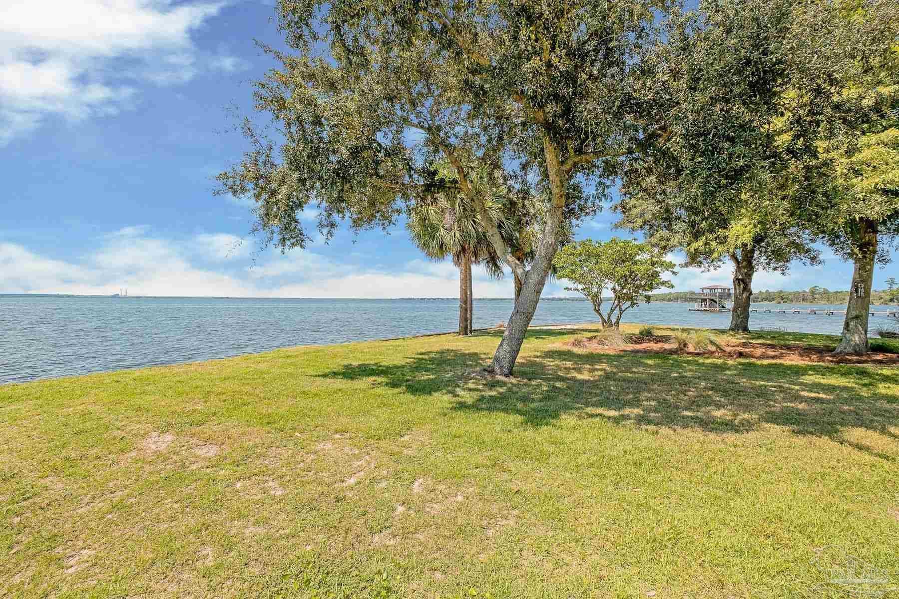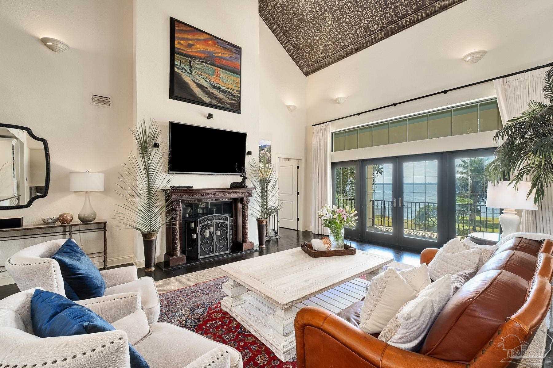 Salt + Serenity Home commands an unparalleled waterfront position on Escambia Bay, offering sweeping 270° views & the ultimate coastal lifestyle. Set on an elevated, professionally landscaped lot in the exclusive Bayside North Island community, this extraordinary estate combines timeless architectural elegance with modern luxury. Approach via a circular driveway to an imperial staircase leading to a covered balcony and grand entrance framed by classical arches and decorative columns. Inside, soaring hand-painted metal ceilings, rich pine floors, and a dramatic spiral staircase that leads to a bonus crow's nest with stunning views. Large windows & French doors flood the home with natural light while perfectly framing the serene bay vistas. At the heart of the home, chef’s kitchen boasts a granite-topped island, a breakfast bar, a professional-grade gas range with double ovens, stainless steel appliances, and abundant custom cabinetry. The adjoining living areas feature a formal dining room, elegant sitting room, a grand family room with custom banquette, statement fireplace, & expansive water views. An office with bay views offers functional yet stylish workspaces. The primary suite is a true retreat, featuring lofty ceilings, French doors to the bay, and a spa-inspired bath. An additional guest suite with private bathrooms is located on the main level. Upstairs, you will find 2 more bedrooms, a guest bath, and a reading nook. Outdoor living is elevated with expansive covered decks, wrought iron fencing, and lush landscaping—an entertainer’s dream. The ground level offers a four-car garage, workshop, and spacious screened lanai ideal for large events cookouts. The backyard boasts ample room to accommodate a pool (virtually shown) or private dock. Deep-water access makes this property perfect for boating, fishing, and paddleboarding. This isn’t just a home—it’s a legacy, a retreat, and your front-row seat to life on the bay. Schedule your private tour today.