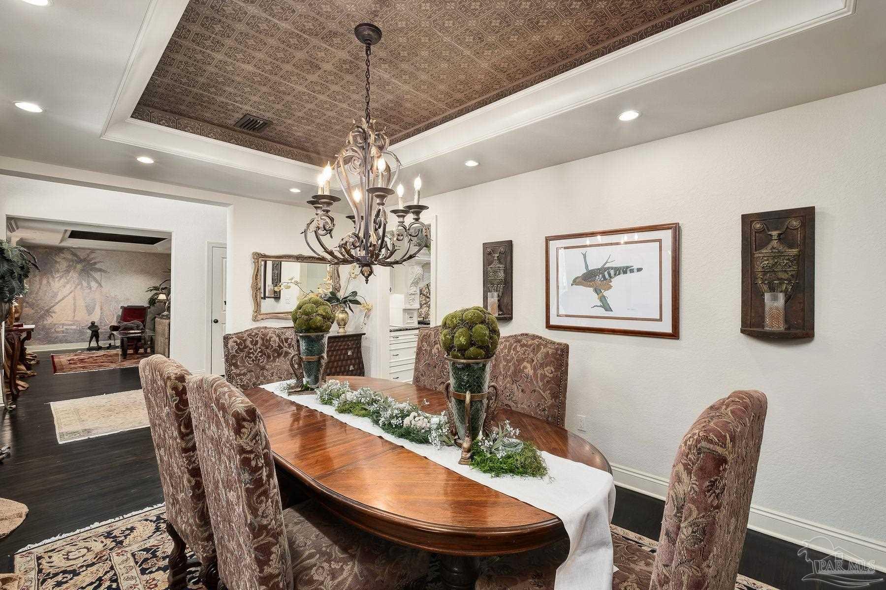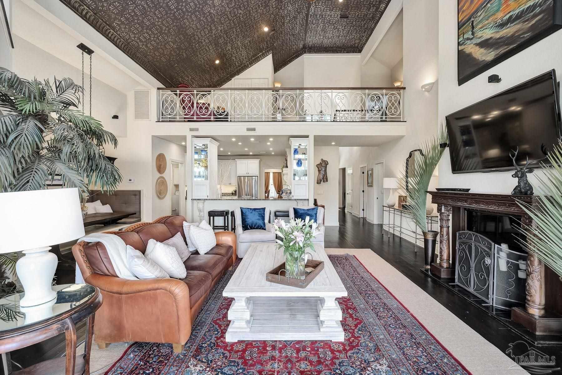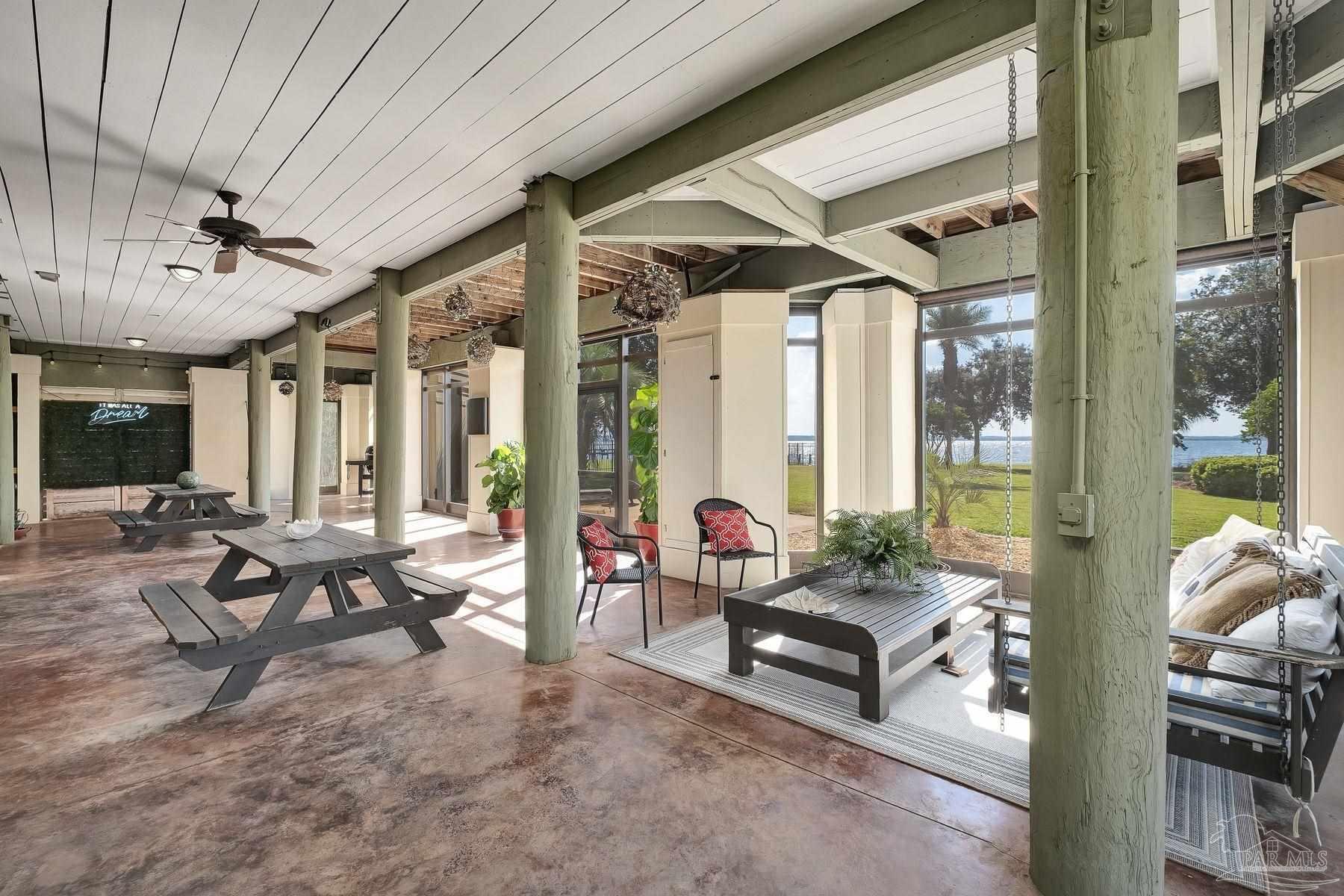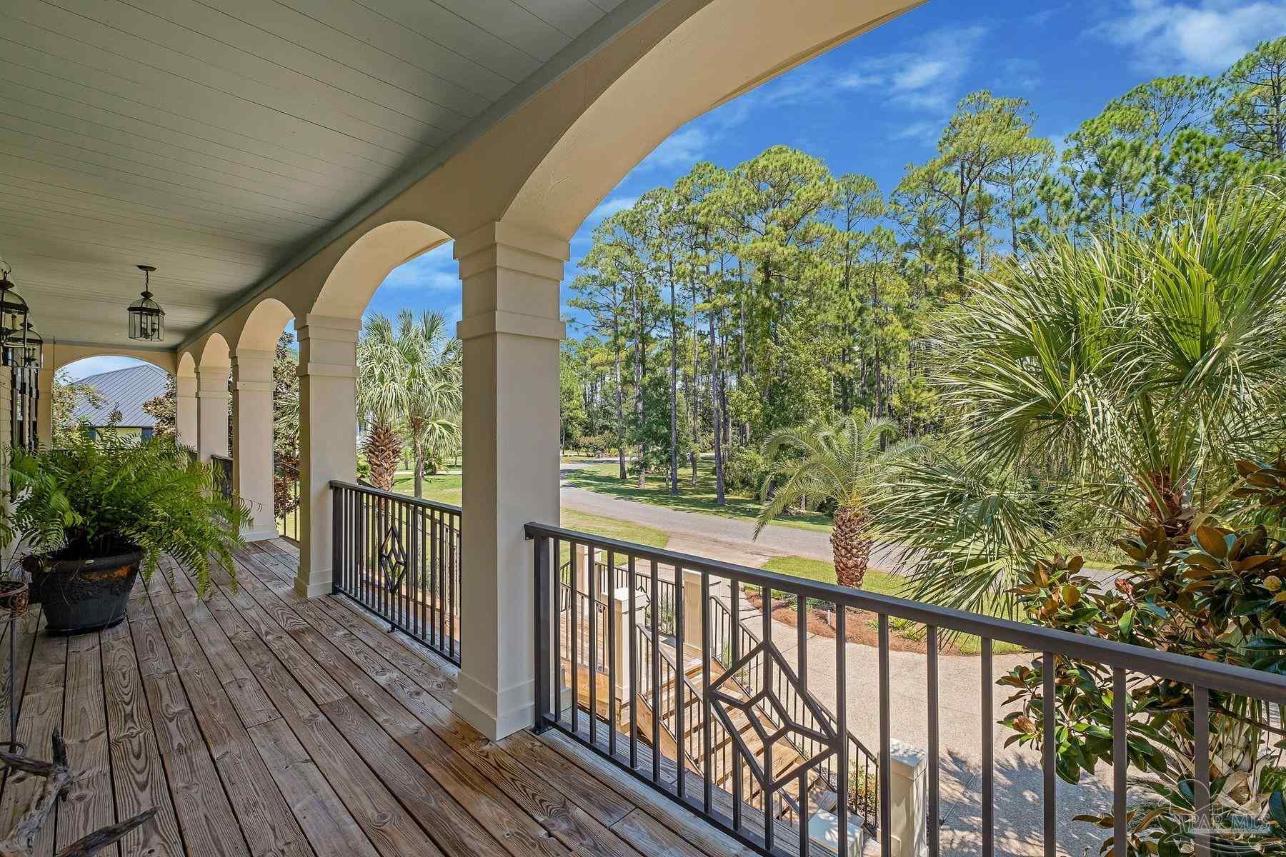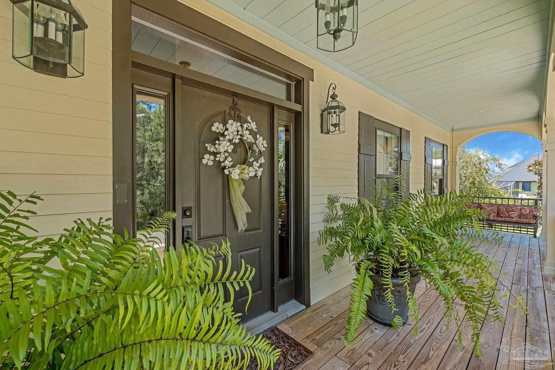 Salt + Serenity Home commands an unparalleled waterfront position on Escambia Bay, offering sweeping 270° views & the ultimate coastal lifestyle. Set on an elevated, professionally landscaped lot in the exclusive Bayside North Island community, this extraordinary estate combines timeless architectural elegance with modern luxury. Approach via a circular driveway to an imperial staircase leading to a covered balcony and grand entrance framed by classical arches and decorative columns. Inside, soaring hand-painted metal ceilings, rich pine floors, and a dramatic spiral staircase that leads to a bonus crow's nest with stunning views. Large windows & French doors flood the home with natural light while perfectly framing the serene bay vistas. At the heart of the home, chef’s kitchen boasts a granite-topped island, a breakfast bar, a professional-grade gas range with double ovens, stainless steel appliances, and abundant custom cabinetry. The adjoining living areas feature a formal dining room, elegant sitting room, a grand family room with custom banquette, statement fireplace, & expansive water views. An office with bay views offers functional yet stylish workspaces. The primary suite is a true retreat, featuring lofty ceilings, French doors to the bay, and a spa-inspired bath. An additional guest suite with private bathrooms is located on the main level. Upstairs, you will find 2 more bedrooms, a guest bath, and a reading nook. Outdoor living is elevated with expansive covered decks, wrought iron fencing, and lush landscaping—an entertainer’s dream. The ground level offers a four-car garage, workshop, and spacious screened lanai ideal for large events cookouts. The backyard boasts ample room to accommodate a pool (virtually shown) or private dock. Deep-water access makes this property perfect for boating, fishing, and paddleboarding. This isn’t just a home—it’s a legacy, a retreat, and your front-row seat to life on the bay. Schedule your private tour today.