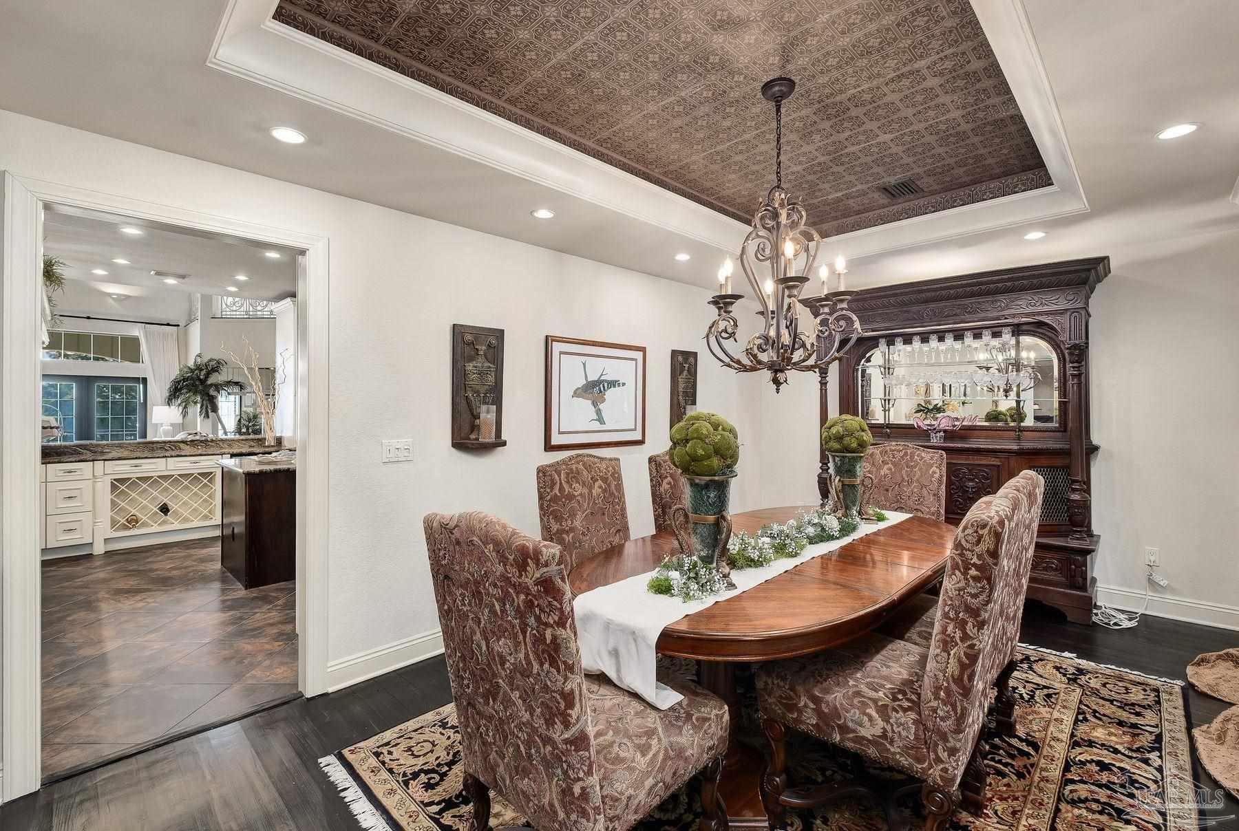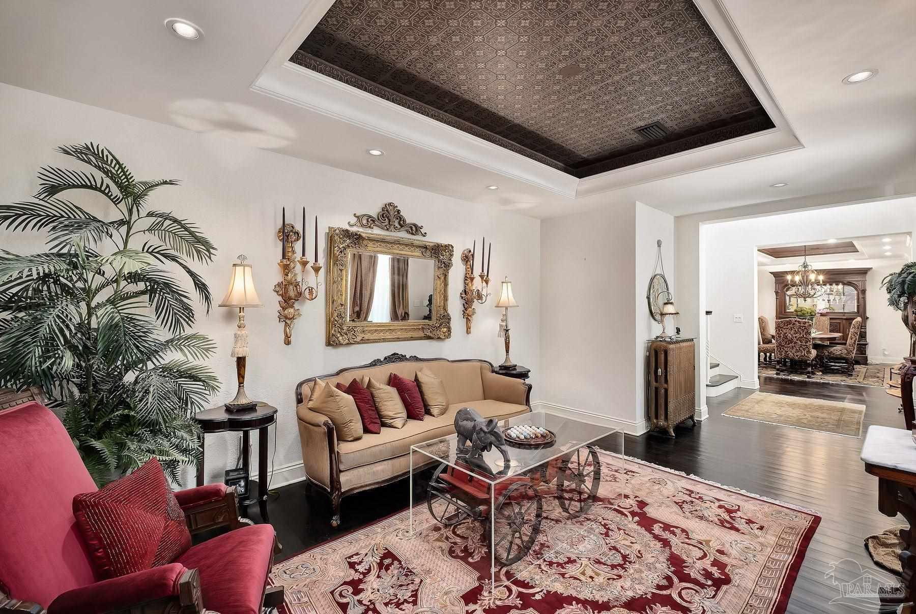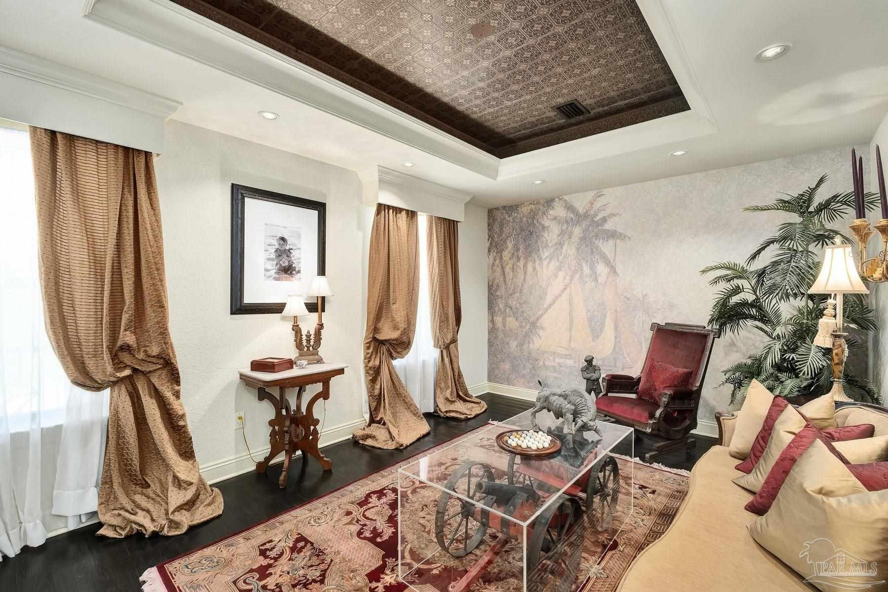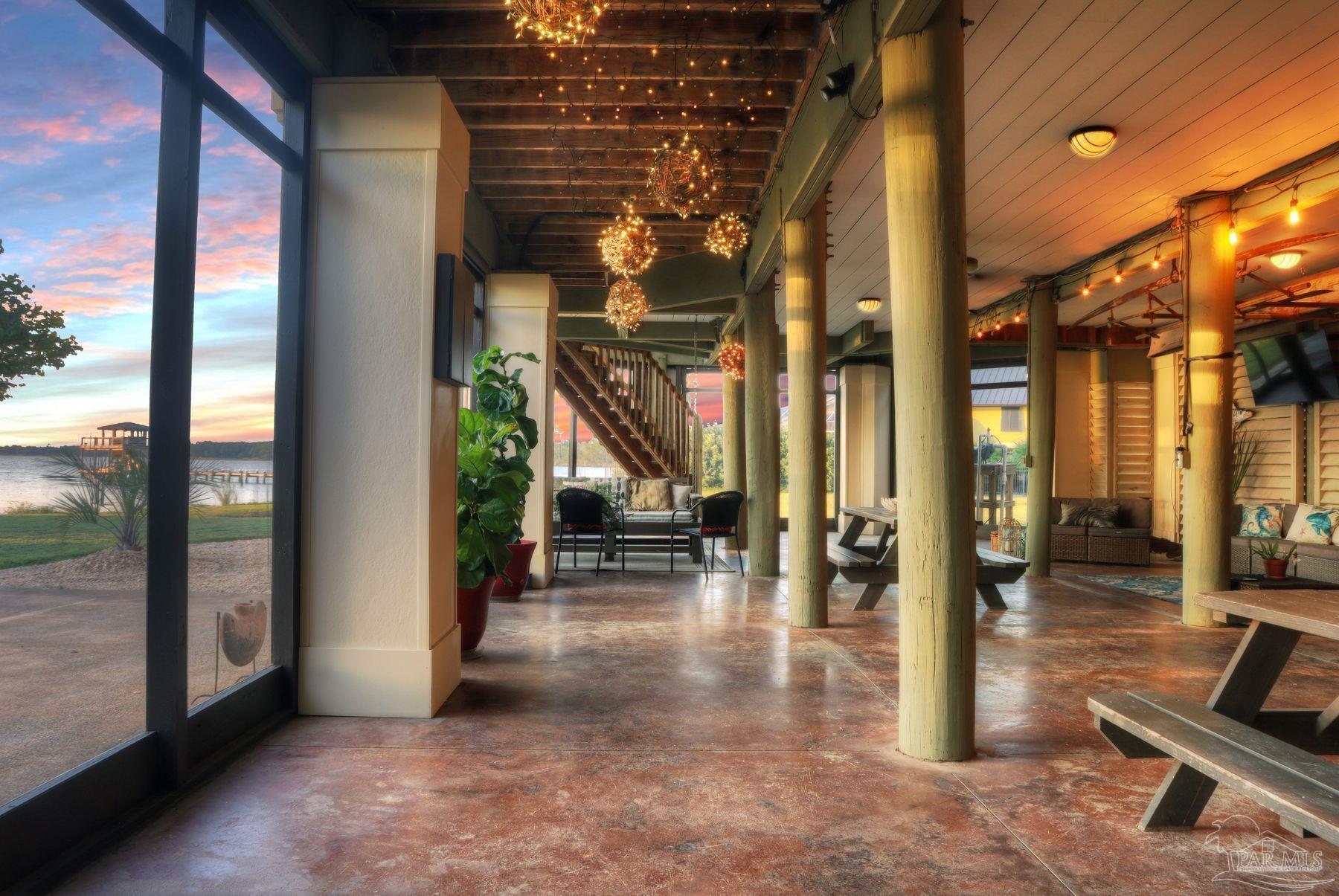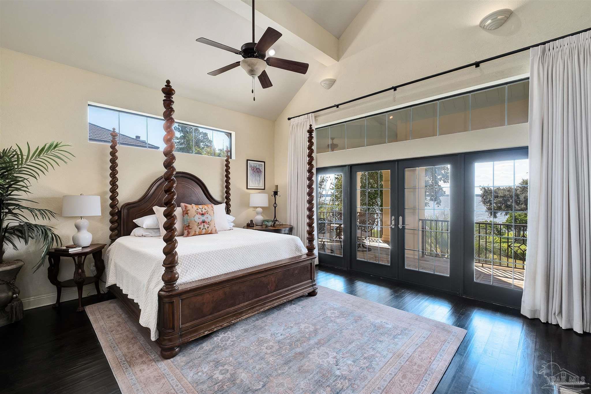 Salt + Serenity Home commands an unparalleled waterfront position on Escambia Bay, offering sweeping 270° views & the ultimate coastal lifestyle. Set on an elevated, professionally landscaped lot in the exclusive Bayside North Island community, this extraordinary estate combines timeless architectural elegance with modern luxury. Approach via a circular driveway to an imperial staircase leading to a covered balcony and grand entrance framed by classical arches and decorative columns. Inside, soaring hand-painted metal ceilings, rich pine floors, and a dramatic spiral staircase that leads to a bonus crow's nest with stunning views. Large windows & French doors flood the home with natural light while perfectly framing the serene bay vistas. At the heart of the home, chef’s kitchen boasts a granite-topped island, a breakfast bar, a professional-grade gas range with double ovens, stainless steel appliances, and abundant custom cabinetry. The adjoining living areas feature a formal dining room, elegant sitting room, a grand family room with custom banquette, statement fireplace, & expansive water views. An office with bay views offers functional yet stylish workspaces. The primary suite is a true retreat, featuring lofty ceilings, French doors to the bay, and a spa-inspired bath. An additional guest suite with private bathrooms is located on the main level. Upstairs, you will find 2 more bedrooms, a guest bath, and a reading nook. Outdoor living is elevated with expansive covered decks, wrought iron fencing, and lush landscaping—an entertainer’s dream. The ground level offers a four-car garage, workshop, and spacious screened lanai ideal for large events cookouts. The backyard boasts ample room to accommodate a pool (virtually shown) or private dock. Deep-water access makes this property perfect for boating, fishing, and paddleboarding. This isn’t just a home—it’s a legacy, a retreat, and your front-row seat to life on the bay. Schedule your private tour today.