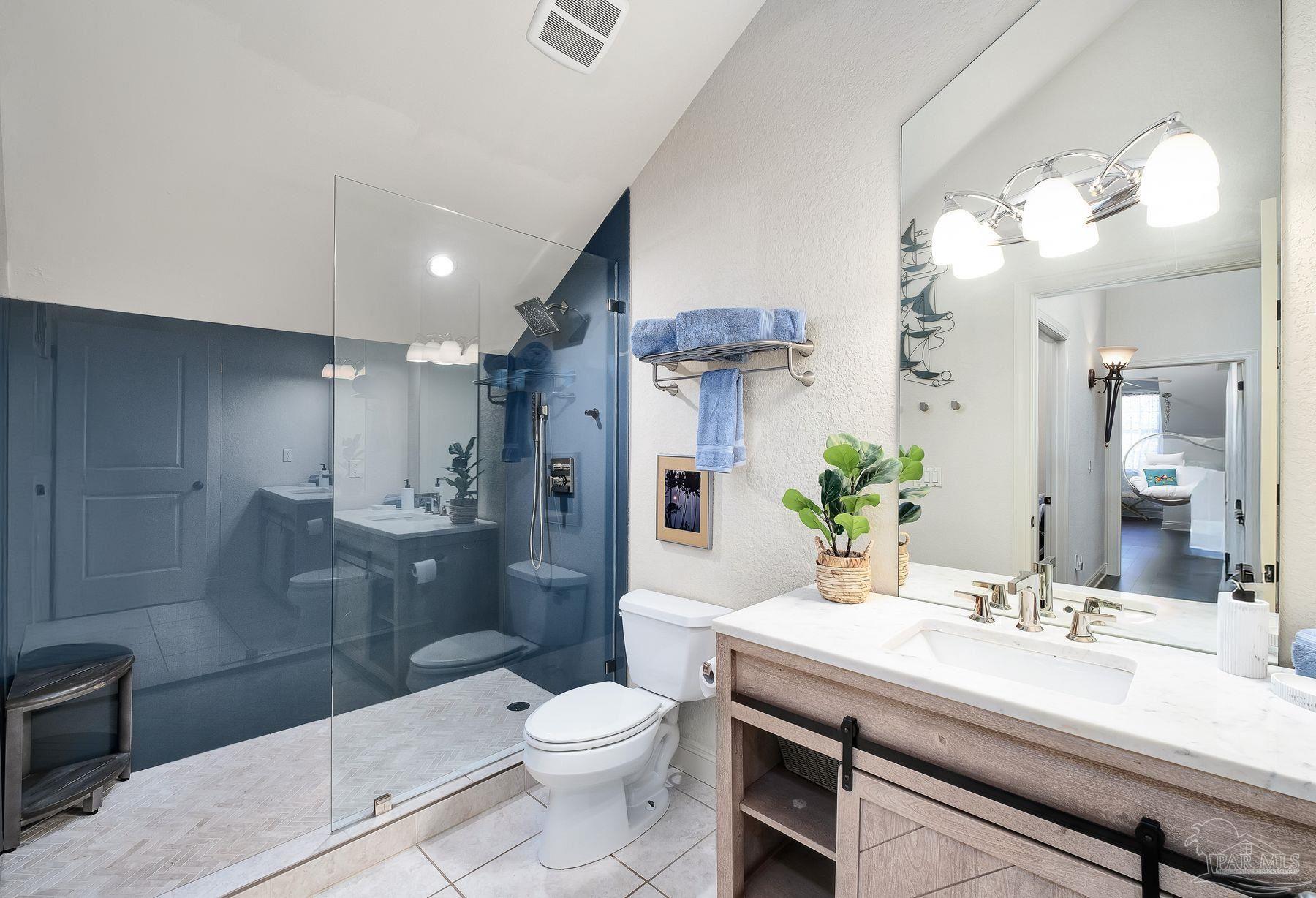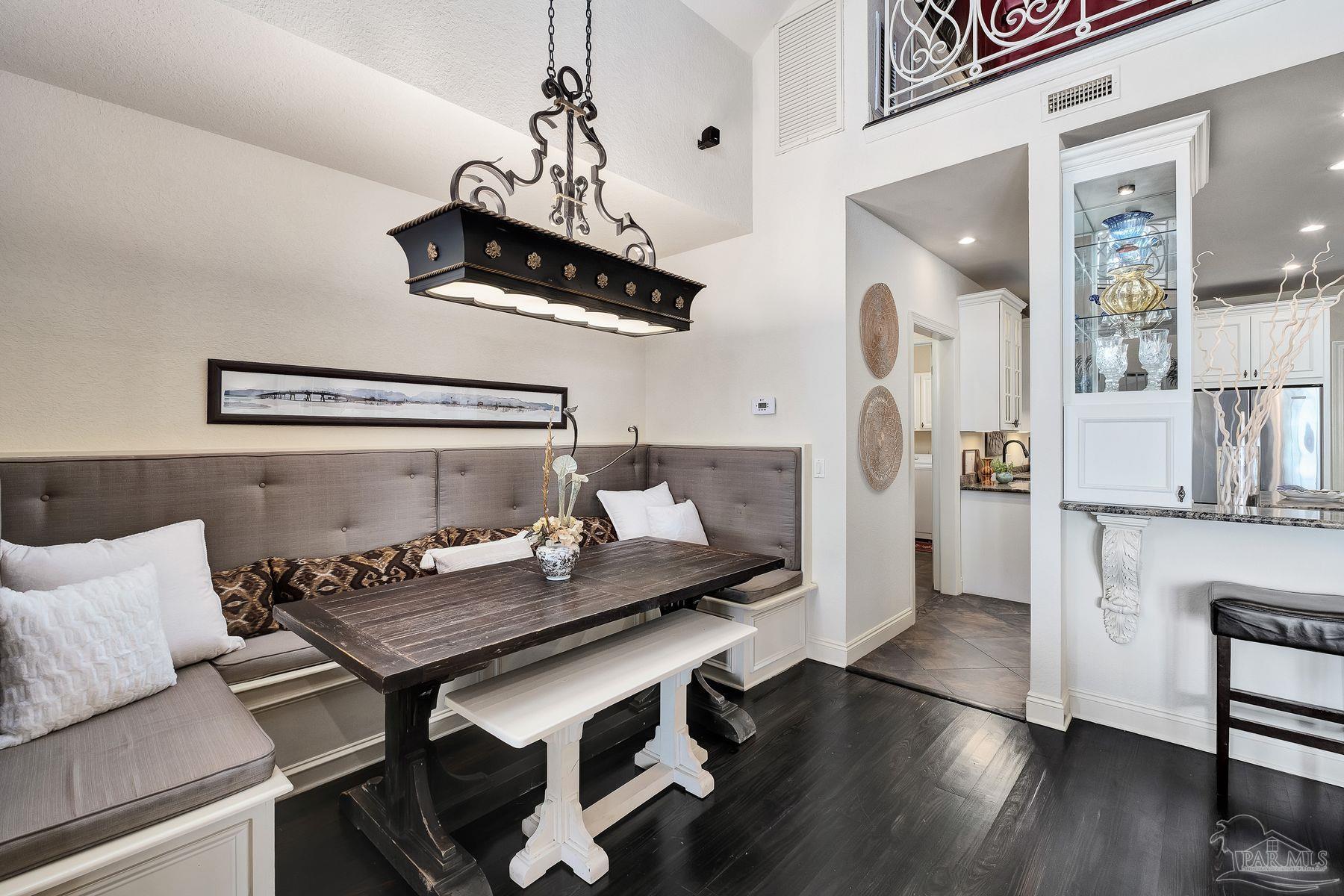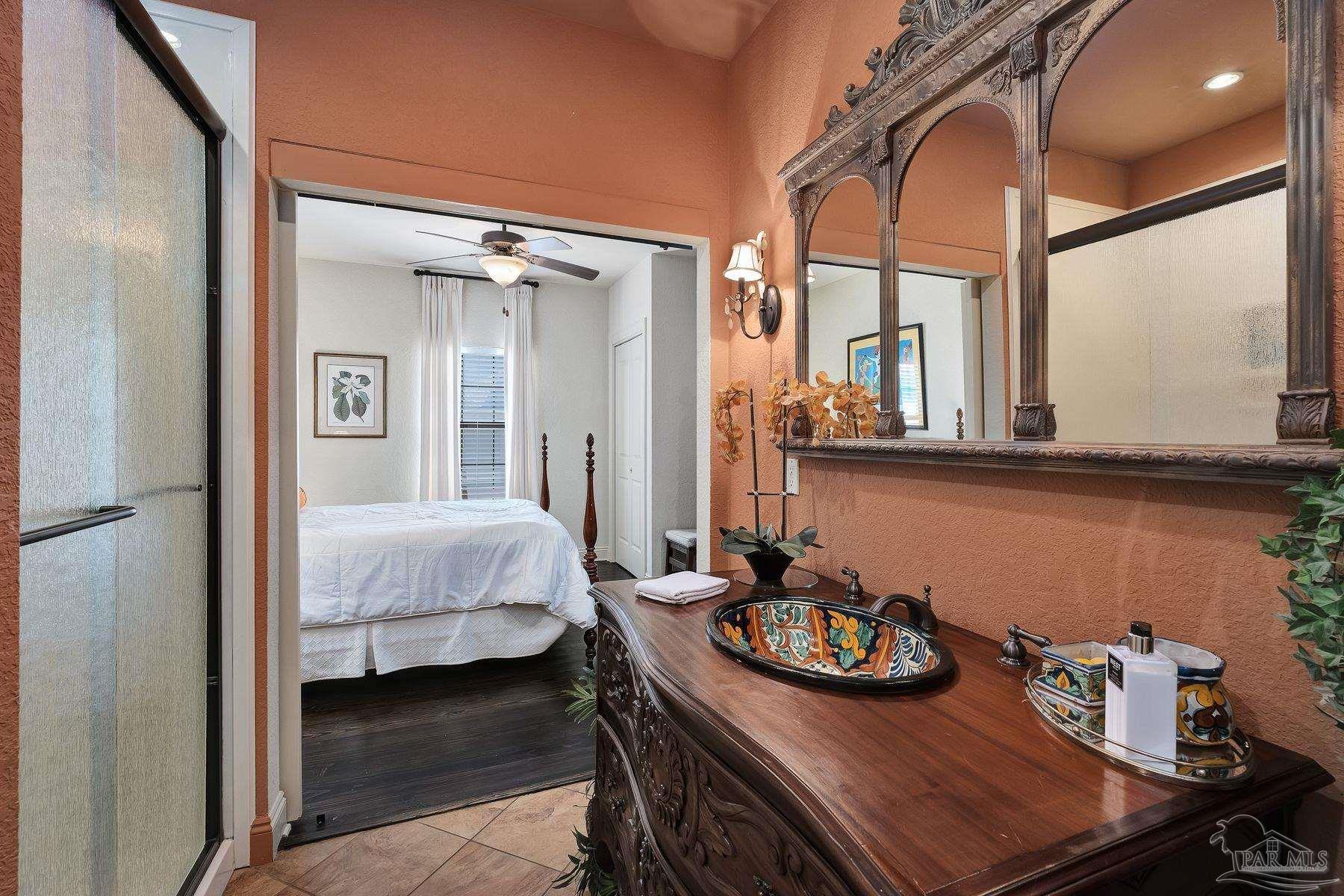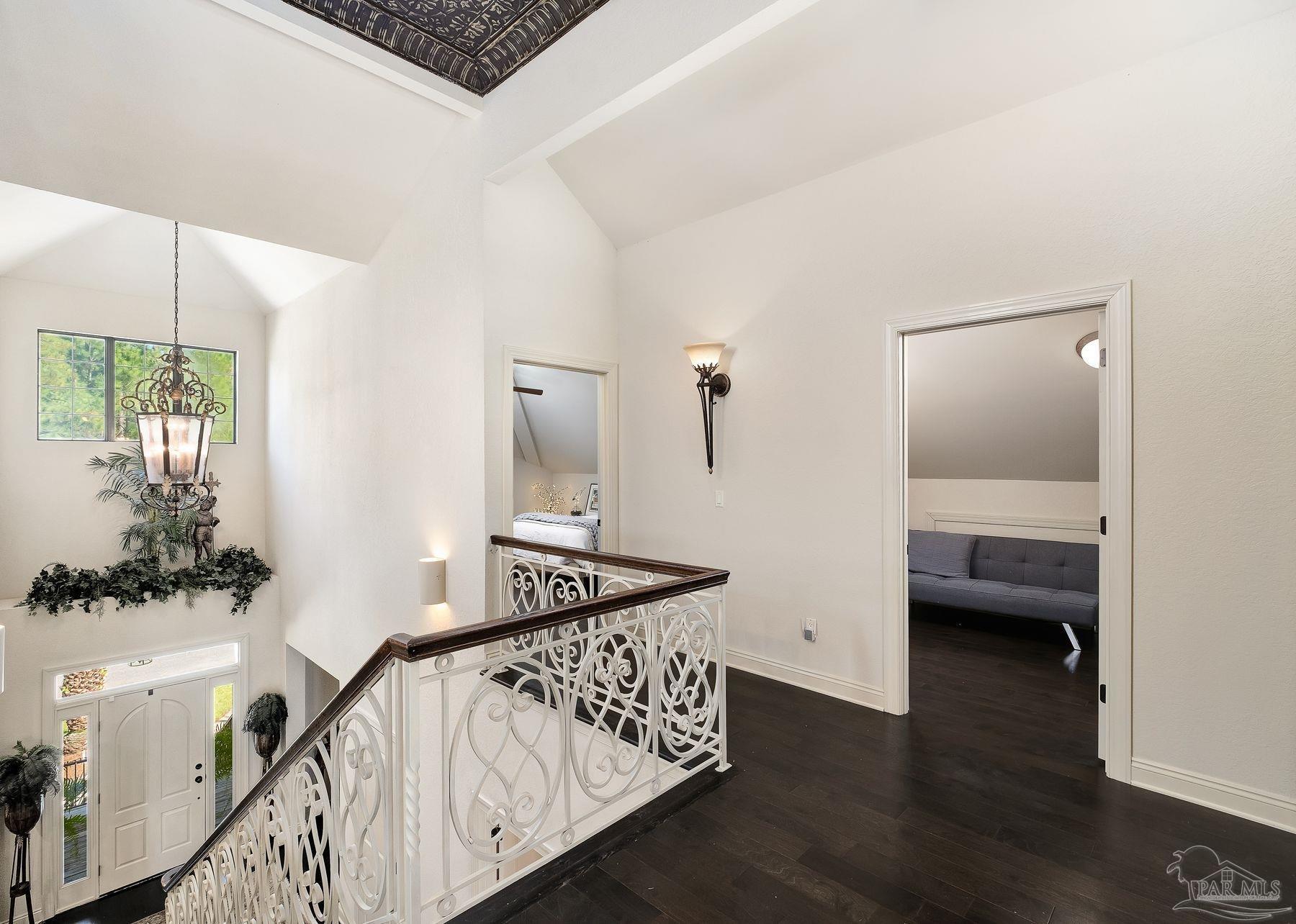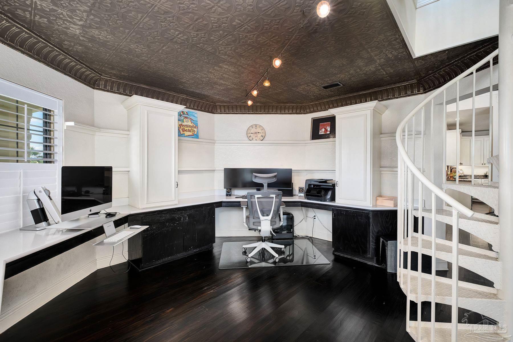 Salt + Serenity Home commands an unparalleled waterfront position on Escambia Bay, offering sweeping 270° views & the ultimate coastal lifestyle. Set on an elevated, professionally landscaped lot in the exclusive Bayside North Island community, this extraordinary estate combines timeless architectural elegance with modern luxury. Approach via a circular driveway to an imperial staircase leading to a covered balcony and grand entrance framed by classical arches and decorative columns. Inside, soaring hand-painted metal ceilings, rich pine floors, and a dramatic spiral staircase that leads to a bonus crow's nest with stunning views. Large windows & French doors flood the home with natural light while perfectly framing the serene bay vistas. At the heart of the home, chef’s kitchen boasts a granite-topped island, a breakfast bar, a professional-grade gas range with double ovens, stainless steel appliances, and abundant custom cabinetry. The adjoining living areas feature a formal dining room, elegant sitting room, a grand family room with custom banquette, statement fireplace, & expansive water views. An office with bay views offers functional yet stylish workspaces. The primary suite is a true retreat, featuring lofty ceilings, French doors to the bay, and a spa-inspired bath. An additional guest suite with private bathrooms is located on the main level. Upstairs, you will find 2 more bedrooms, a guest bath, and a reading nook. Outdoor living is elevated with expansive covered decks, wrought iron fencing, and lush landscaping—an entertainer’s dream. The ground level offers a four-car garage, workshop, and spacious screened lanai ideal for large events cookouts. The backyard boasts ample room to accommodate a pool (virtually shown) or private dock. Deep-water access makes this property perfect for boating, fishing, and paddleboarding. This isn’t just a home—it’s a legacy, a retreat, and your front-row seat to life on the bay. Schedule your private tour today.