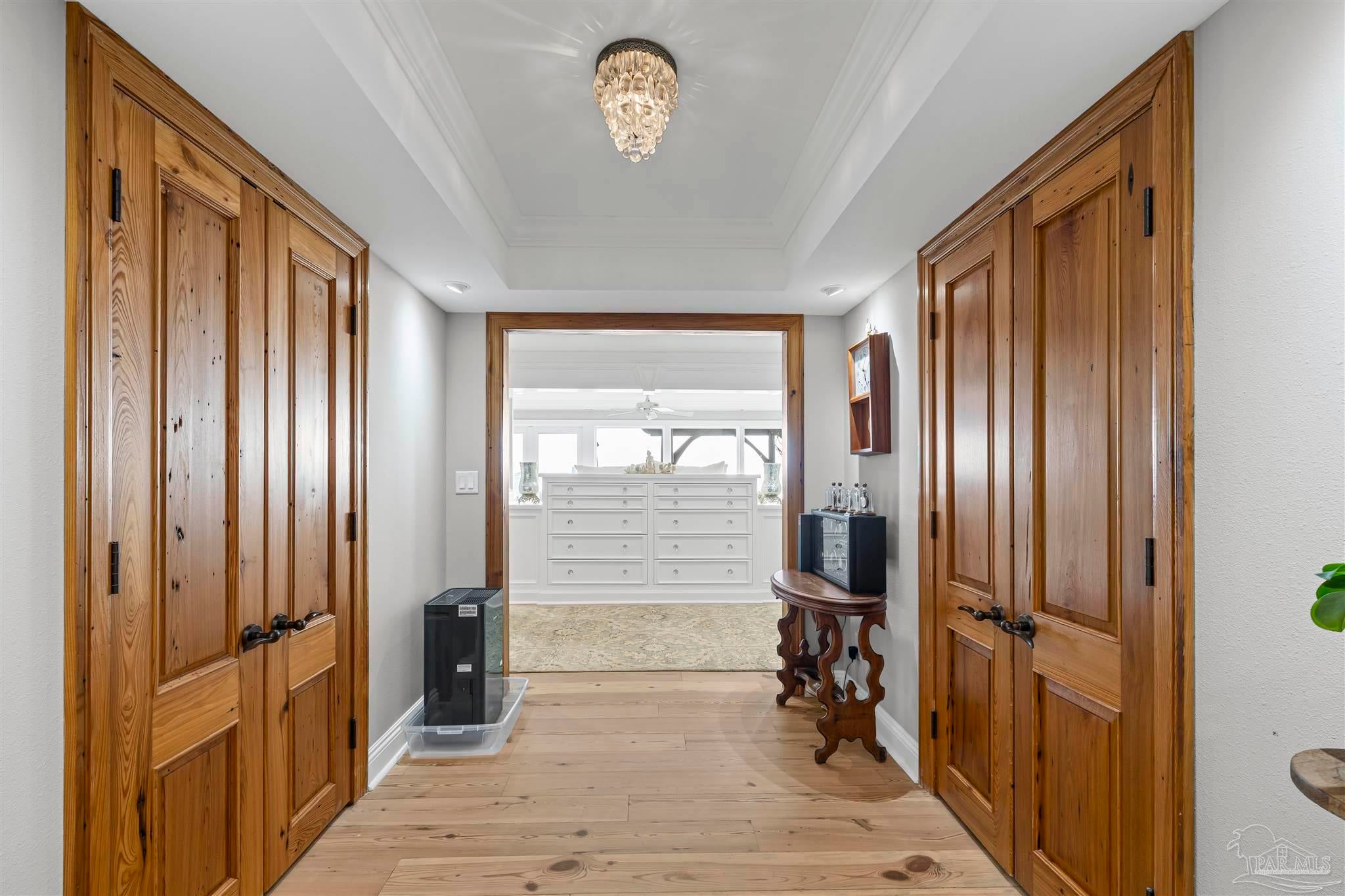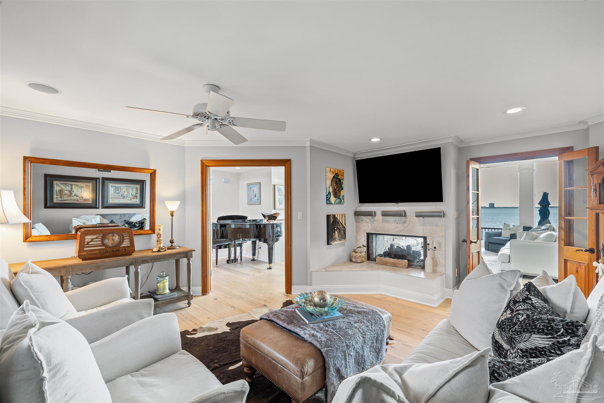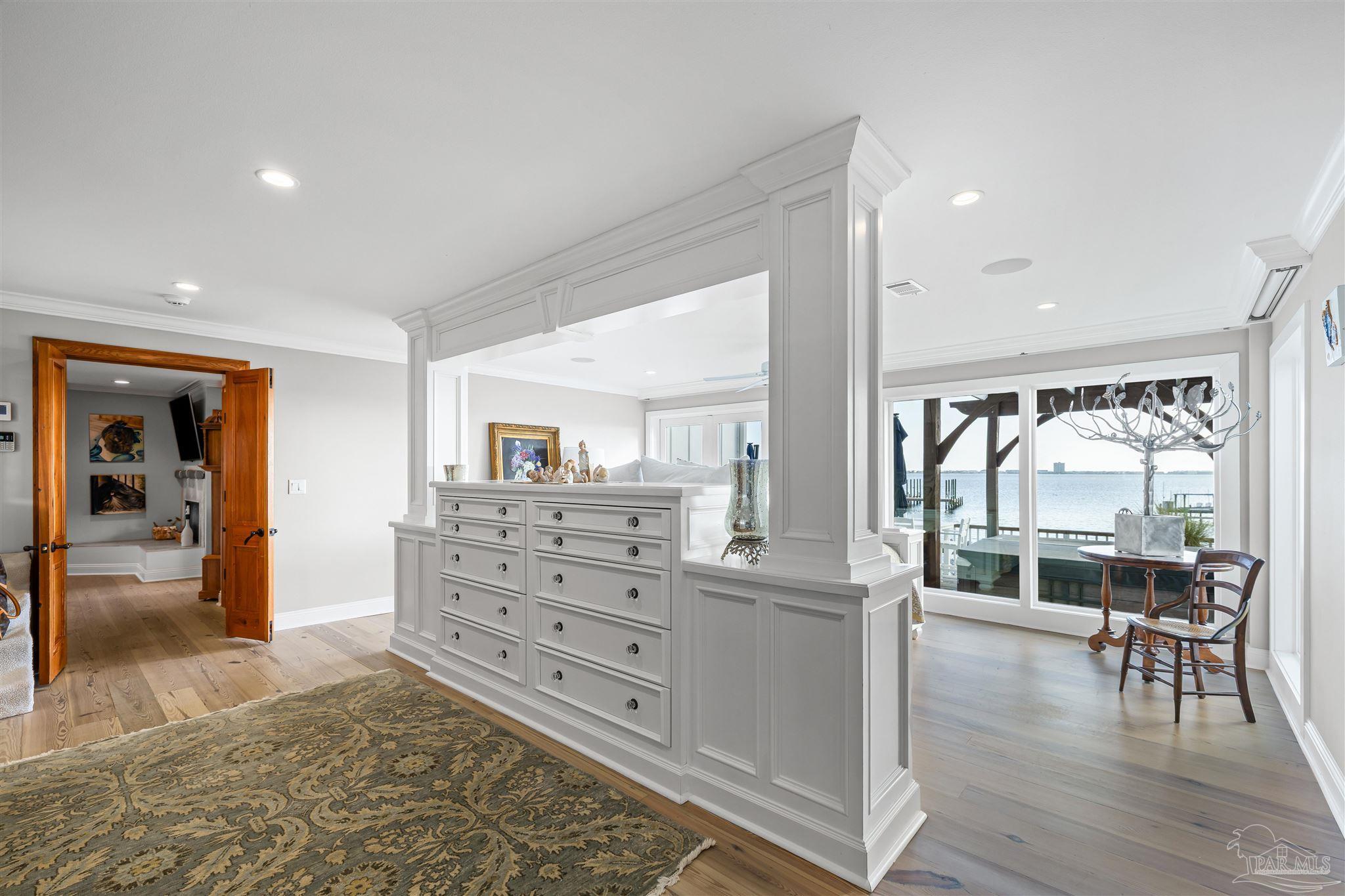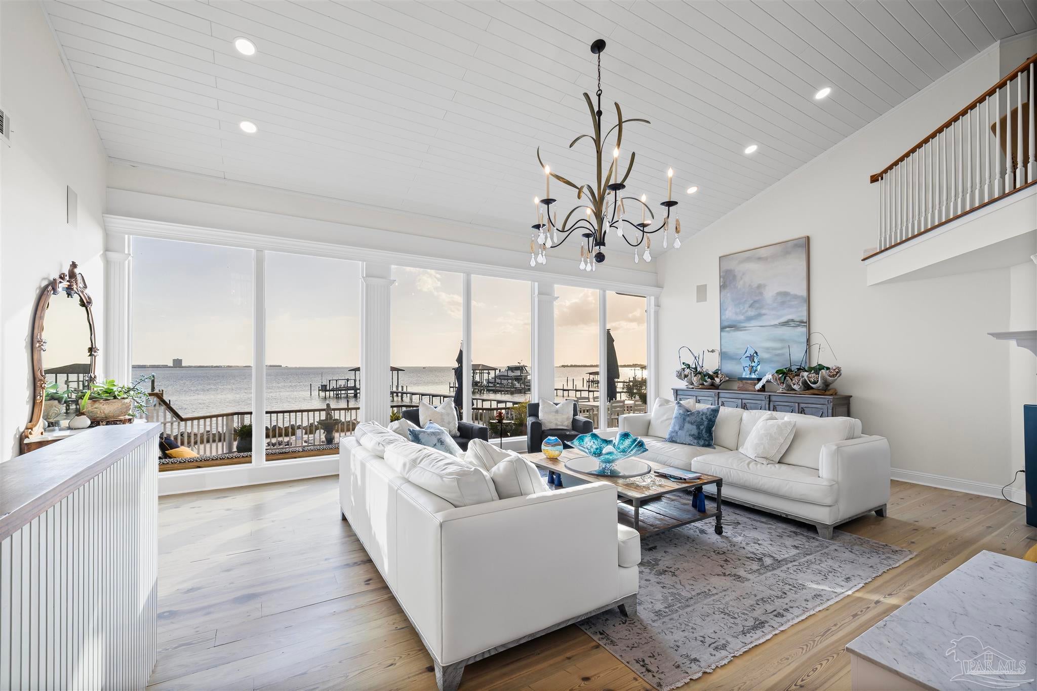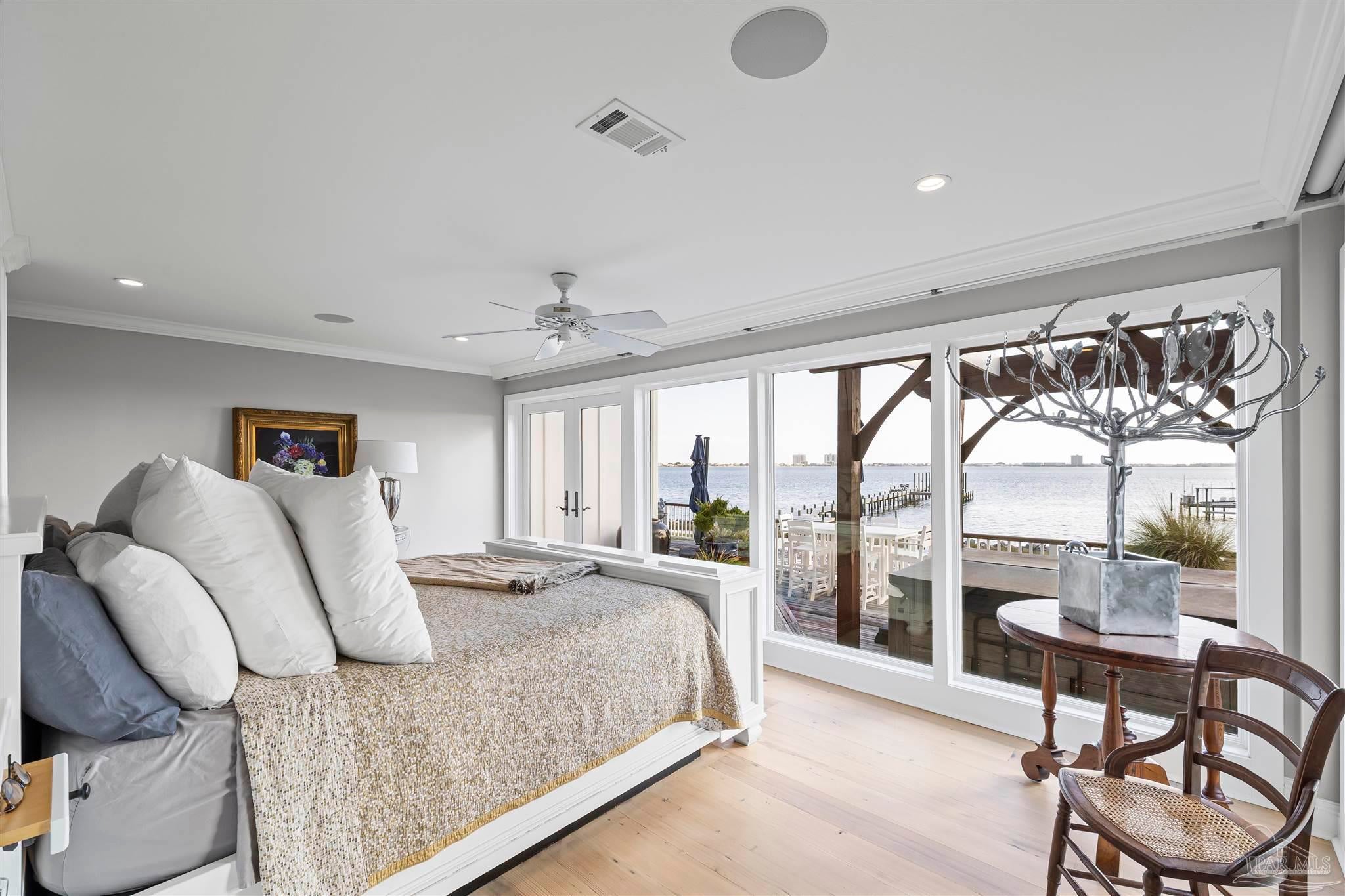 This is a rare opportunity to own a premier deep-water estate in Gulf Breeze Proper. Situated on 1.5 acres with over 200 feet on the Intracoastal Waterway, this stunning property features a rare 20x50 ft deep-water boat slip (9 ft depth) with flow-through dock and sun deck, a private white sand beach, and expansive green space. The home offers luxury throughout, including a great room with expansive windows showcasing breathtaking water views, a vaulted ceiling, and a gas fireplace. The custom kitchen is equipped with high-end appliances, a wet bar, and a dining area overlooking the Sound. The primary suite offers panoramic water views, deck/hot tub access, dual walk-in closets, and a spa-style bath with a soaking tub and separate shower. A main-level guest suite includes a private bath and patio access. Upstairs, you'll find two additional bedrooms, two full baths, and a large multipurpose room with a fireplace and French doors for added privacy. Additional features include a 3-car garage with a climate-controlled, large bonus room and half bath, plus a 200x200 ft vacant lot across the street included in the sale. Exceptional views, luxury finishes, and rare boating access make this a one-of-a-kind waterfront offering the ultimate Florida lifestyle.