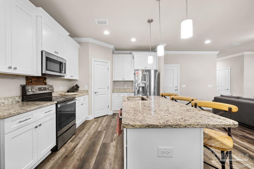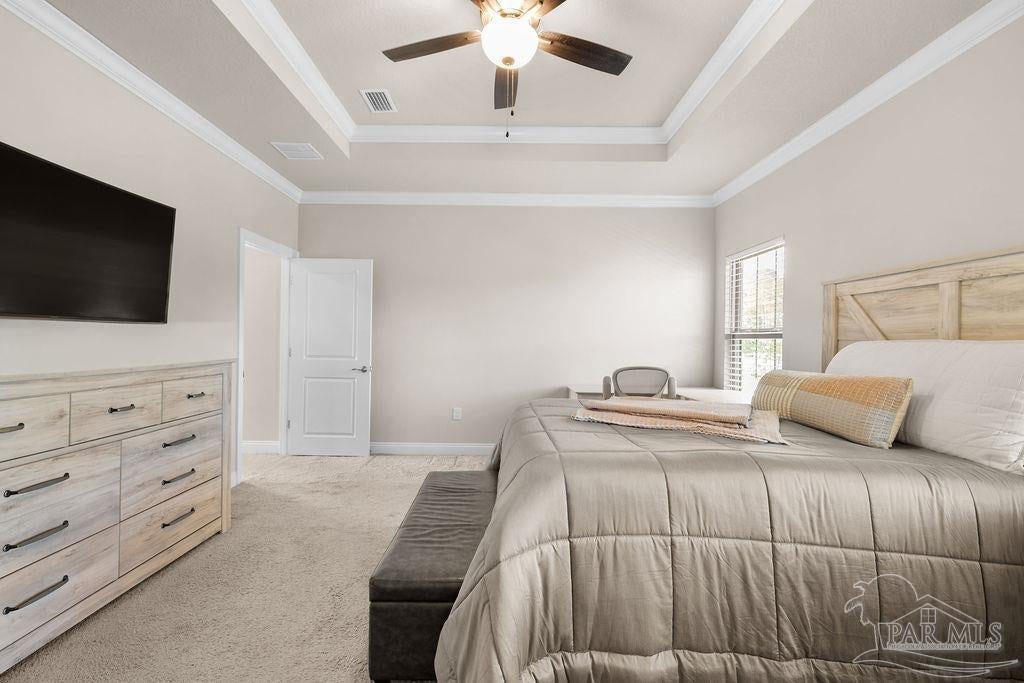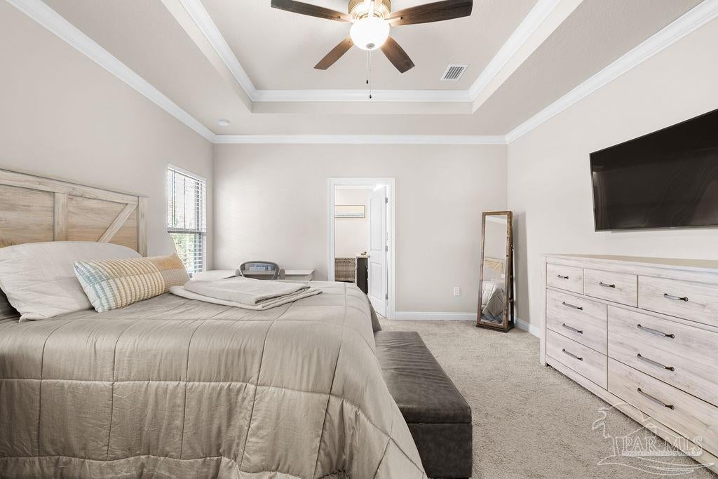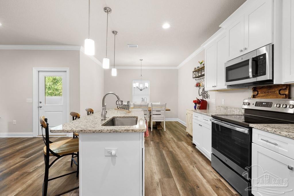 Come see your Dream Home! Tucked away on a peaceful cul-de-sac in beautiful Navarre, this spacious two-story home offers 4 bedrooms, 2.5 bathrooms, and an oversized lot – the perfect blend of comfort, style, and functionality. Step inside to discover a bright, open layout with thoughtful upgrades throughout. The kitchen is a true centerpiece, featuring granite countertops, stainless steel appliances, a breakfast bar, and a custom-shelved pantry to keep everything organized. The main floor also includes a dining room, living room, and a convenient half bath – ideal for entertaining. Upstairs, you’ll find four generously sized bedrooms with plenty of closet space. The primary suite is a private retreat, complete with tray ceilings, a custom walk-in closet, double vanity, tiled shower, and a relaxing garden tub – your very own spa-like escape. Enjoy Florida living at its best on the screened, covered patio overlooking the fully fenced backyard – perfect for playing, gardening, or entertaining guests. Additional features include gutters, a well-fed sprinkler system, grinder pump, Trimlight holiday lights, epoxy-coated garage floors, and overhead garage storage shelves to make organization effortless. Located just minutes from Navarre’s white-sand beaches, top-rated schools, and shopping, this home combines convenience with quiet cul-de-sac living. Don’t miss your chance to make this beautifully maintained, move-in-ready home yours!