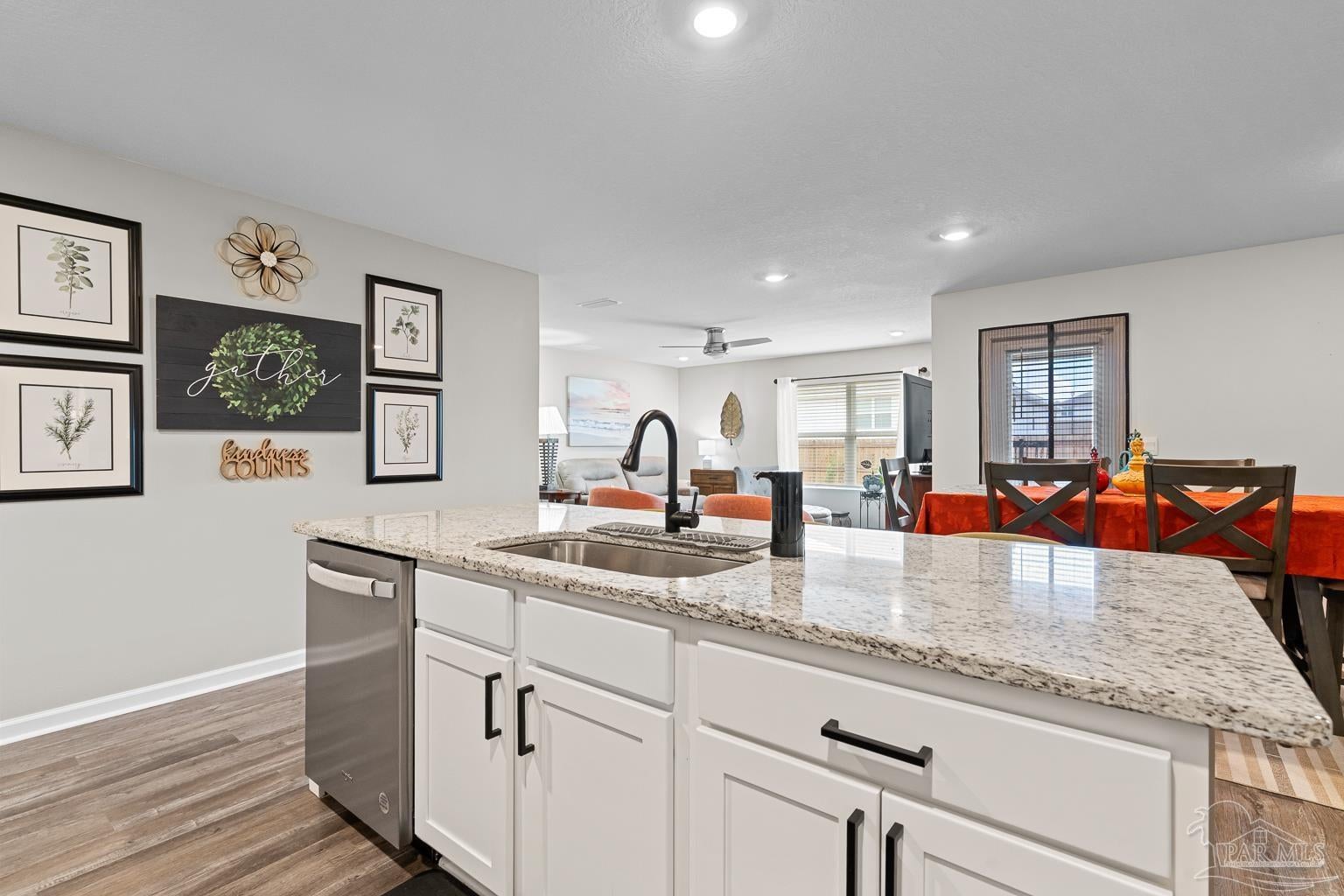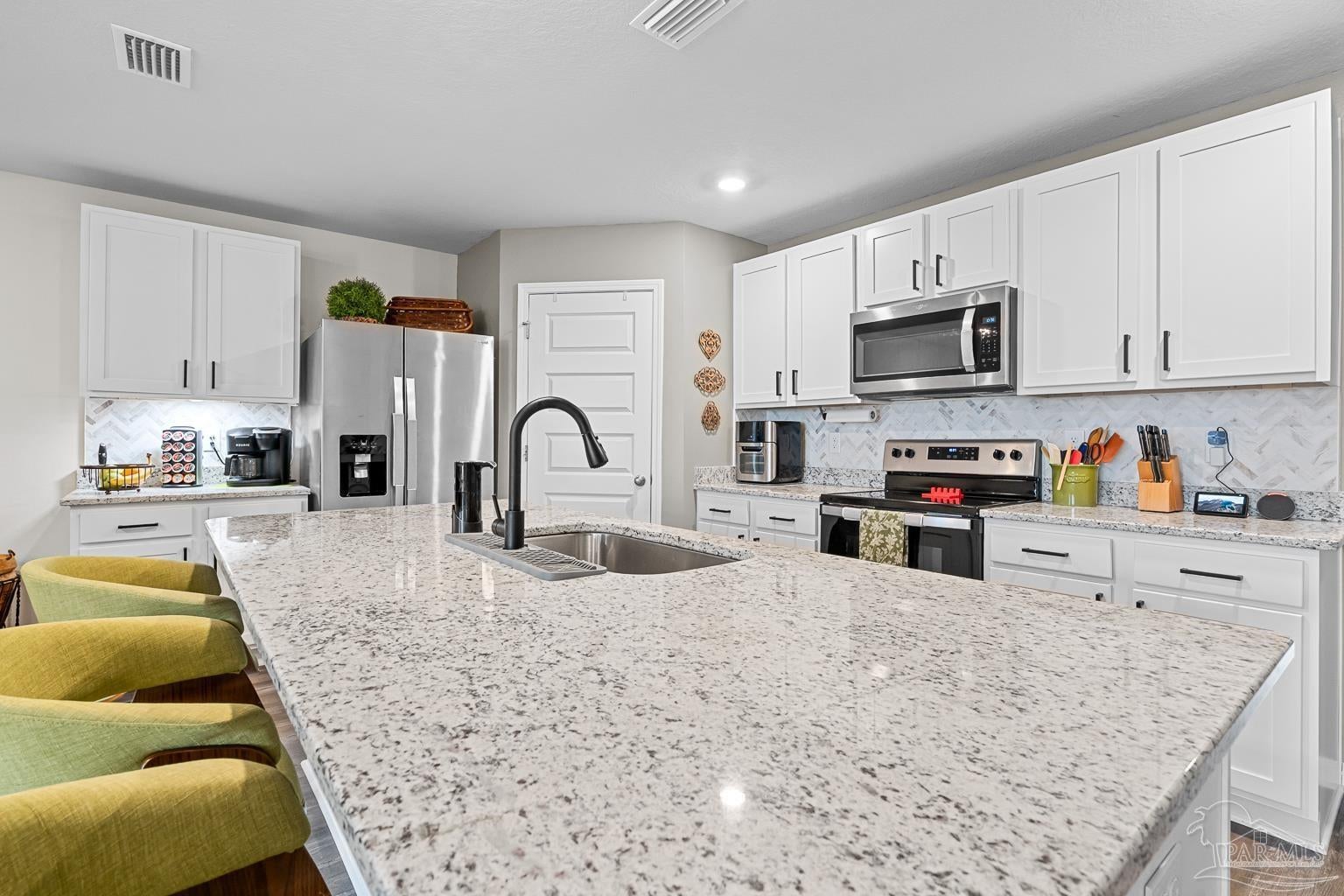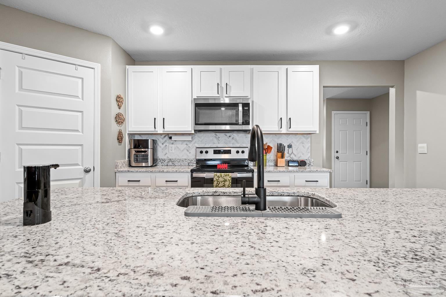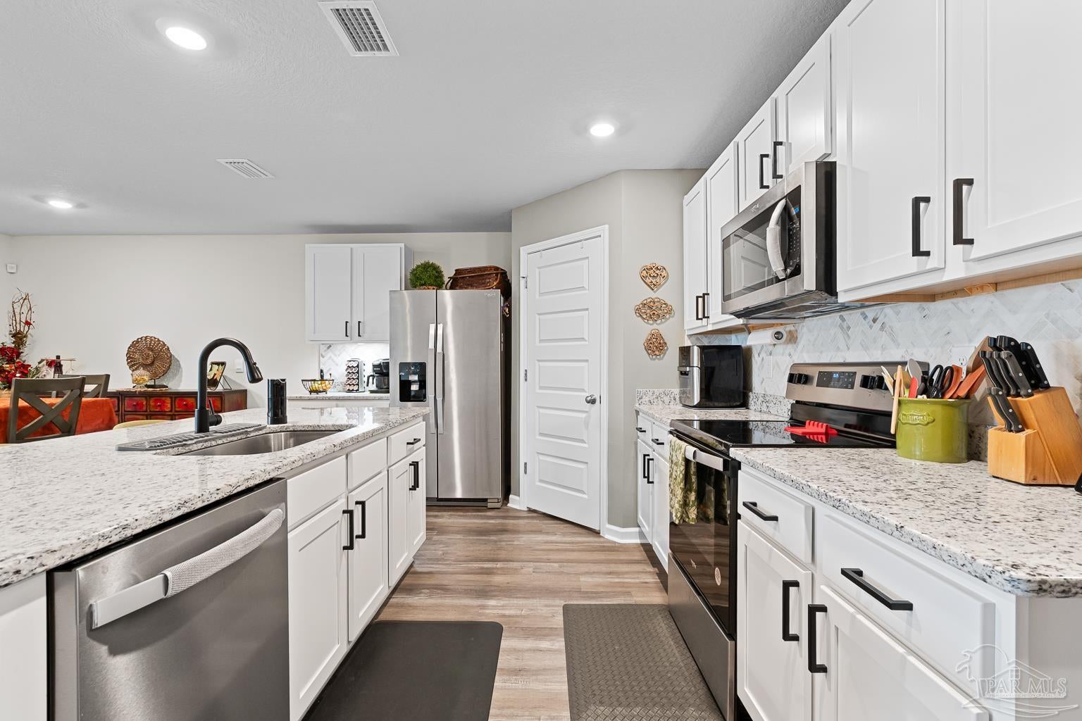 This four-bedroom, two-bathroom home combines modern design with thoughtful upgrades offering both comfort and convenience- Sellers are willing to sell the home fully furnished, providing a true turnkey experience (furnishings not included in the sale price). Step inside to be welcomed by soaring 9-foot ceilings, recessed lighting and warm neutral color palette that creates an inviting atmosphere leading into the kitchen with an oversized granite island, 33 inch under mount sink, matte black hardware, and stylish herringbone mosaic backsplash tile that blends seamlessly adding elegance and sophistication. The open layout flows easily into the living and dining areas with LVP flooring making it ideal for durability and low maintenance. The Master Bath features a double vanity, updated lighting, and a glass barn-style shower door. Ceiling fans have been added throughout the home to enhance efficiency and comfort. Additional shelving and cabinetry in the closets, bathrooms, and laundry room have been added offering smart storage solutions for everyday organization. This property also includes standard smart-home technology, such as keyless entry, a SkyBell video doorbell, automated front porch lighting, an Echo Dot device, and a Qolsys touch panel for centralized control of lighting, climate, and security when out of town. Enjoy your private backyard enclosed by a 6-foot privacy fence with multiple aluminum framed access gates. A complete gutter system and termite bond ensure proper drainage and structural integrity of the home. At this price point accompanied with these upgrades, this home provides tremendous value!