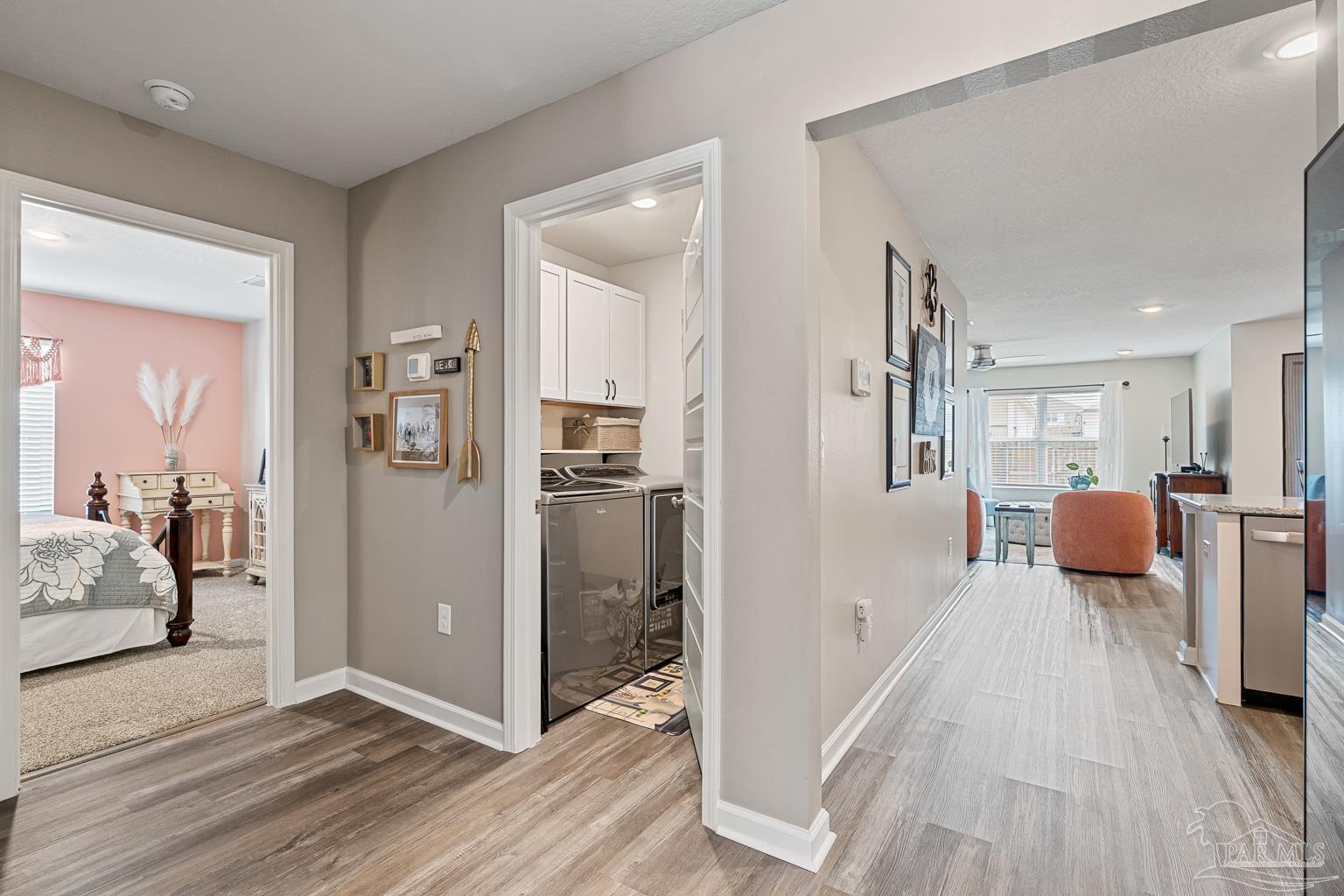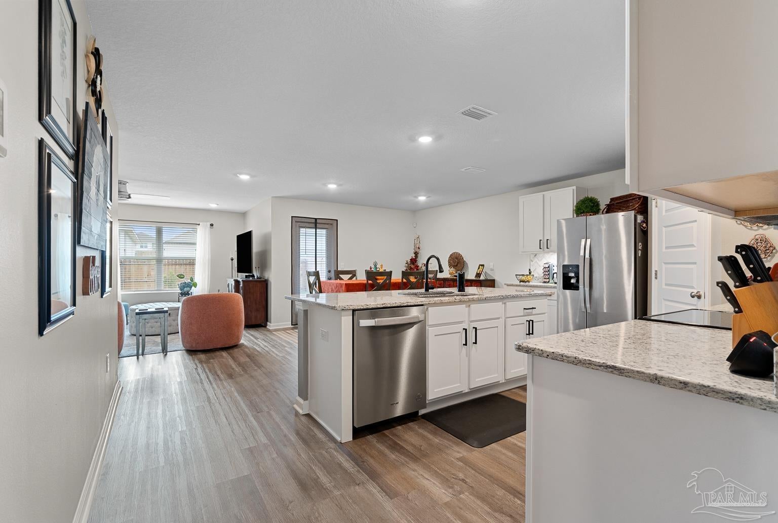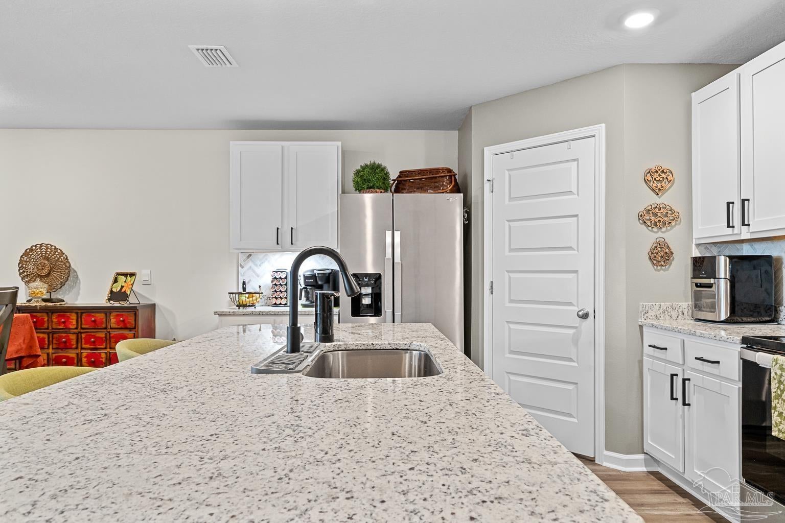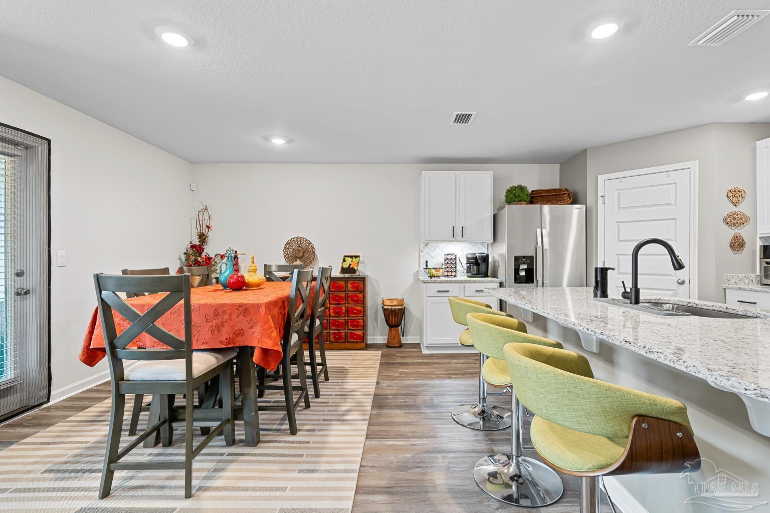 This four-bedroom, two-bathroom home combines modern design with thoughtful upgrades offering both comfort and convenience- Sellers are willing to sell the home fully furnished, providing a true turnkey experience (furnishings not included in the sale price). Step inside to be welcomed by soaring 9-foot ceilings, recessed lighting and warm neutral color palette that creates an inviting atmosphere leading into the kitchen with an oversized granite island, 33 inch under mount sink, matte black hardware, and stylish herringbone mosaic backsplash tile that blends seamlessly adding elegance and sophistication. The open layout flows easily into the living and dining areas with LVP flooring making it ideal for durability and low maintenance. The Master Bath features a double vanity, updated lighting, and a glass barn-style shower door. Ceiling fans have been added throughout the home to enhance efficiency and comfort. Additional shelving and cabinetry in the closets, bathrooms, and laundry room have been added offering smart storage solutions for everyday organization. This property also includes standard smart-home technology, such as keyless entry, a SkyBell video doorbell, automated front porch lighting, an Echo Dot device, and a Qolsys touch panel for centralized control of lighting, climate, and security when out of town. Enjoy your private backyard enclosed by a 6-foot privacy fence with multiple aluminum framed access gates. A complete gutter system and termite bond ensure proper drainage and structural integrity of the home. At this price point accompanied with these upgrades, this home provides tremendous value!