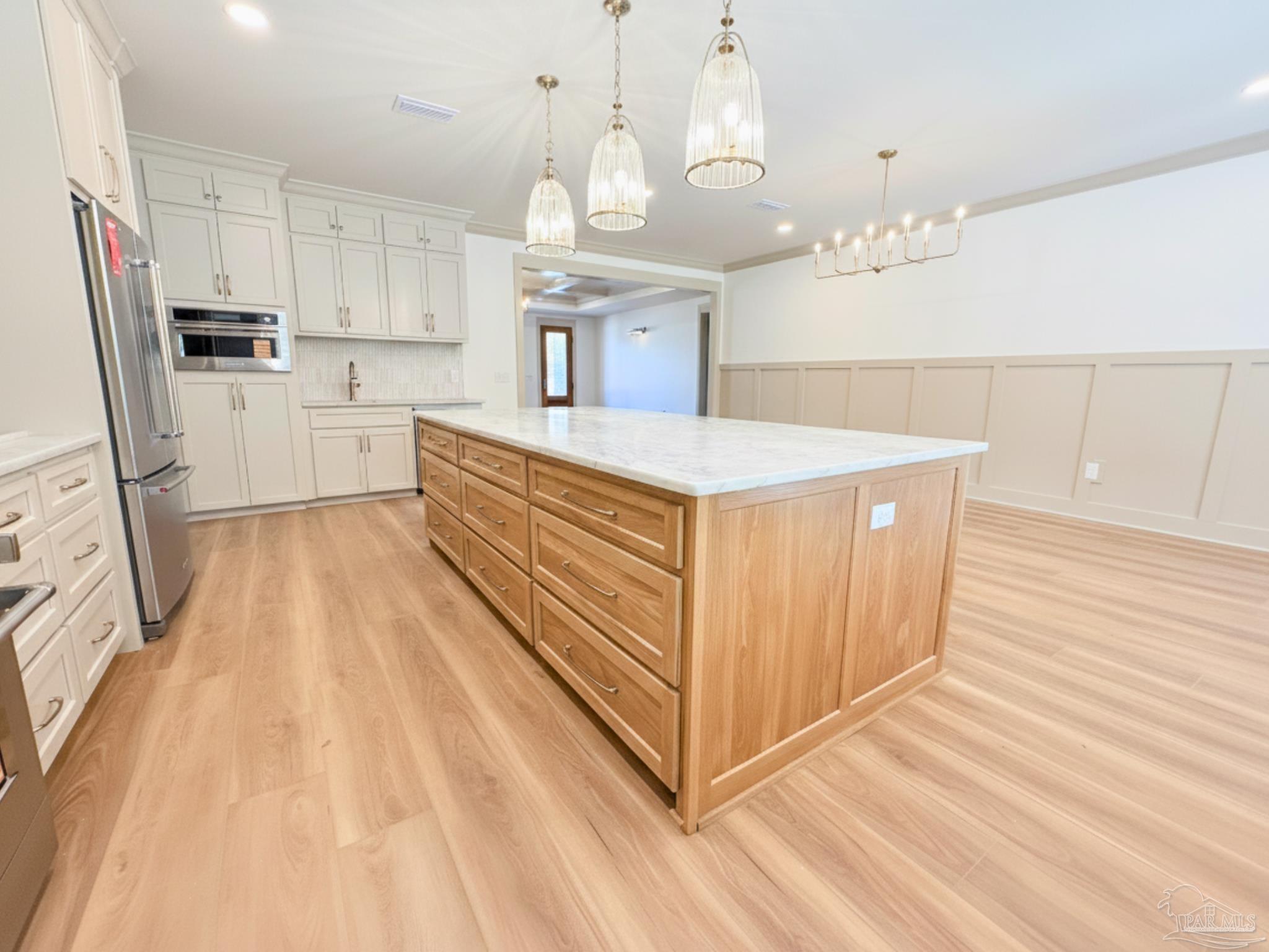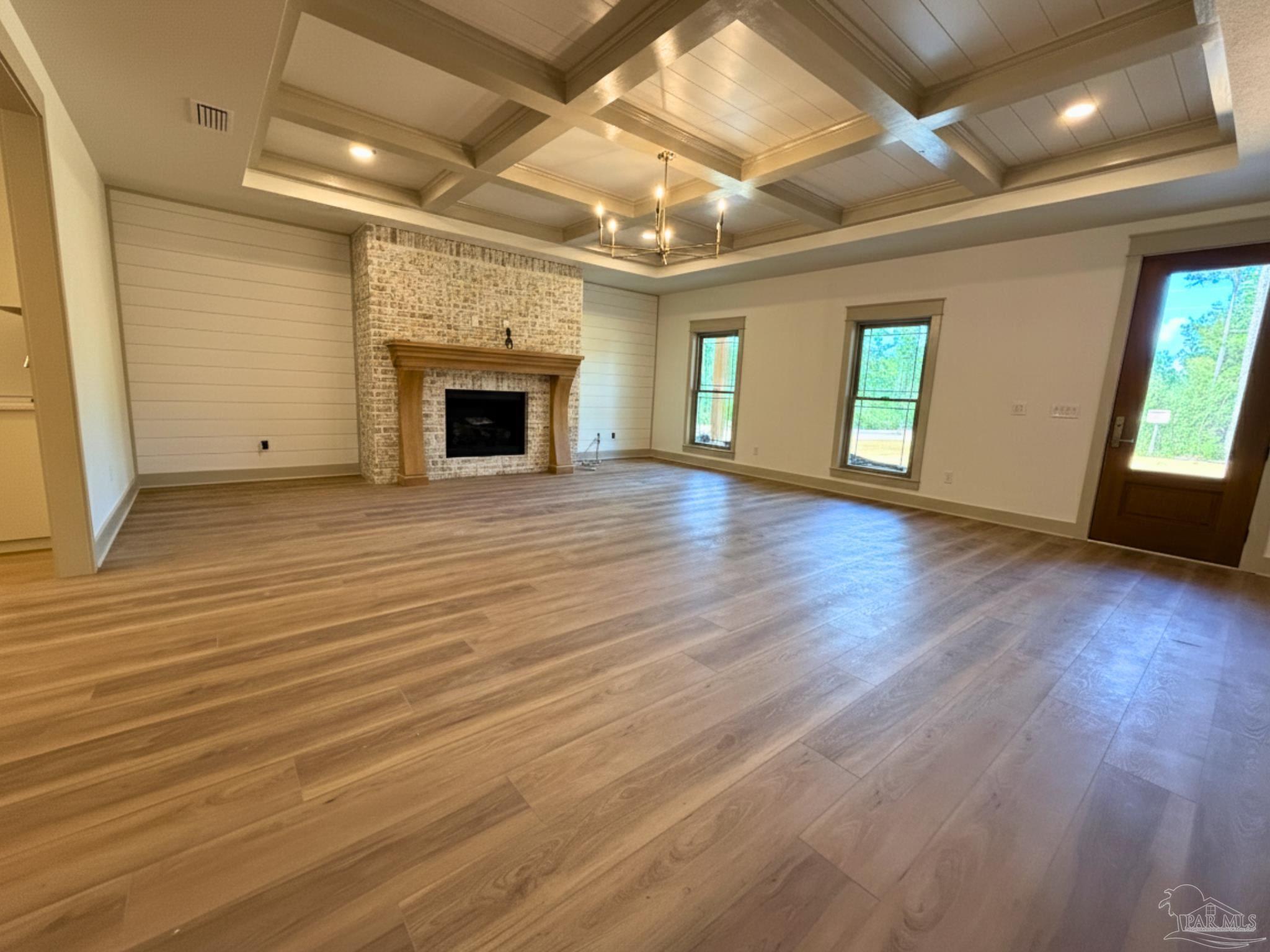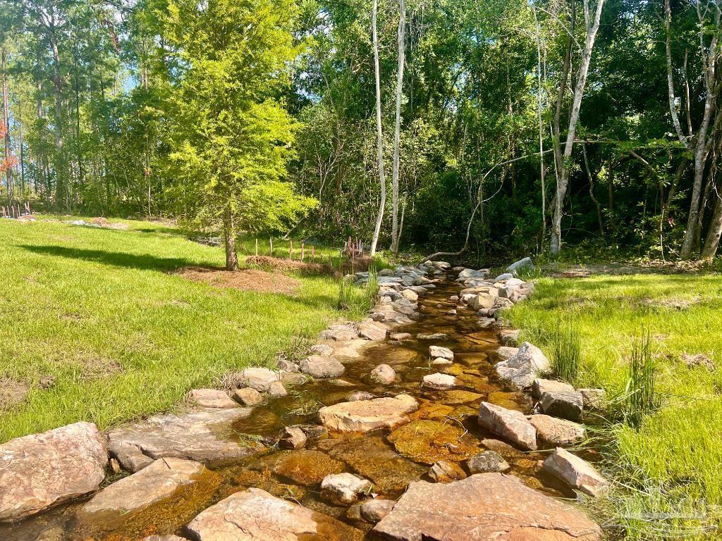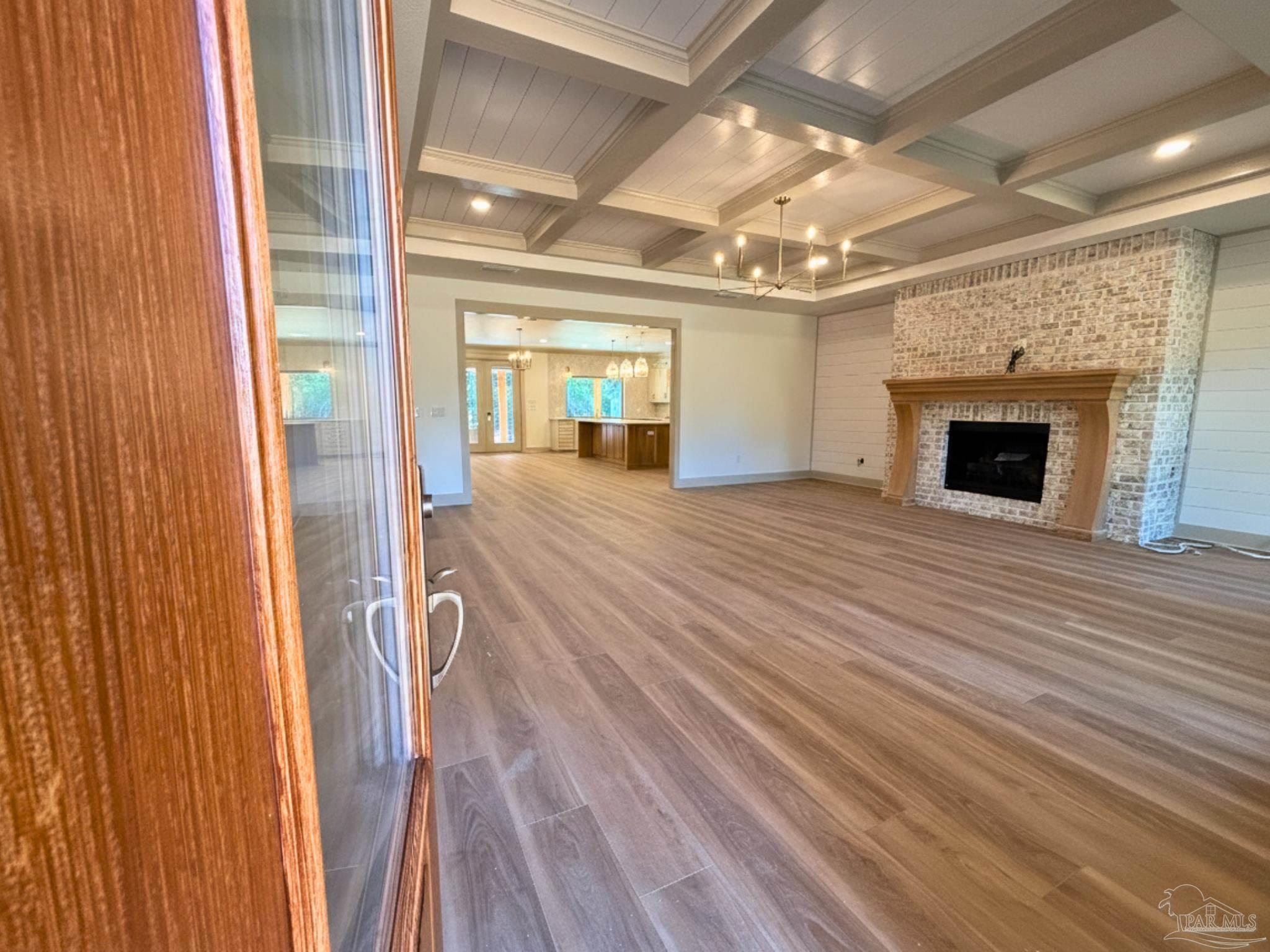 MODERN SOUTHERN ELEGANCE meets timeless craftsmanship in this custom-built retreat set on a generous, private wooded homesite. From the moment you step inside, you’ll sense the difference. The open-concept living area showcases a coffered ceiling and a striking brick fireplace with a custom wood mantel. Wide-plank floors and a soft, nude-toned palette create a serene backdrop that complements any décor. French doors lead to a covered porch with a wood-burning fireplace—perfect for year-round entertaining. *The heart of the home is a chef’s kitchen designed for both beauty and function. Creamy cabinetry with soft-close drawers offers smart storage—including a pantry with pull-out drawers for easy access. Quartz countertops, a gas range crowned by a pot filler, and a built-in wine cooler elevate everyday cooking. A separate prep area features its own sink, keeping the main island clutter-free. Just off the kitchen, a thoughtfully designed laundry room adds floating shelves for display and additional storage. *The owner’s suite offers peaceful views and a luxurious retreat: a generous walk-in closet and a large, light-and-breezy bathroom featuring a freestanding soaking tub and a zero-entry spa shower with a rain shower head and shower bench. Secondary bedrooms are generously sized and thoughtfully separated. Thoughtful design extends outside: a convenient entry from the covered porch leads across the hall to a powder room—perfect for future pool guests. *Nestled within the NatureWalk at Pond Creek community, this home is surrounded by lush pines, scattered oaks, and natural creeks. Large wooded lots and beautifully landscaped grounds create a country-like atmosphere while keeping you close to Pace, Milton, and Pensacola. Residents enjoy privacy, tranquil surroundings, and a strong sense of community that makes NatureWalk one of the most desirable neighborhoods in the area.