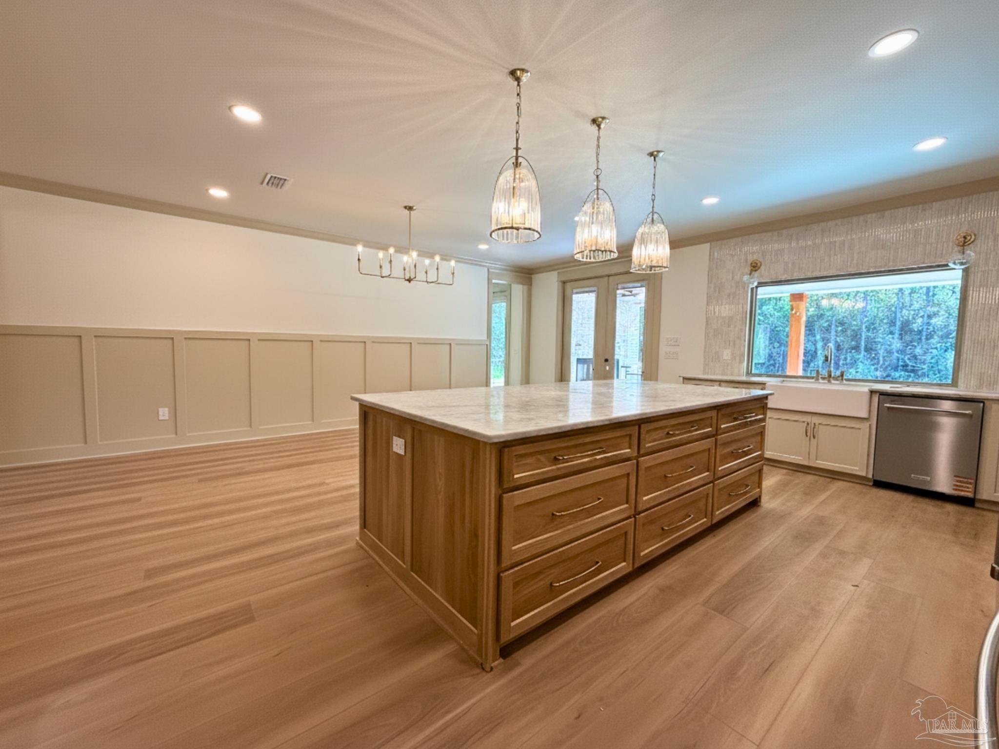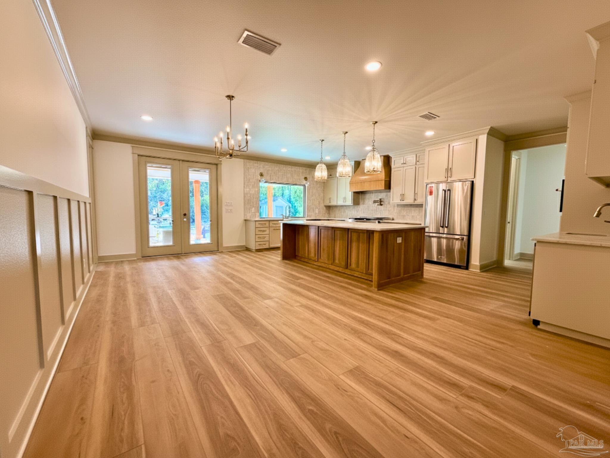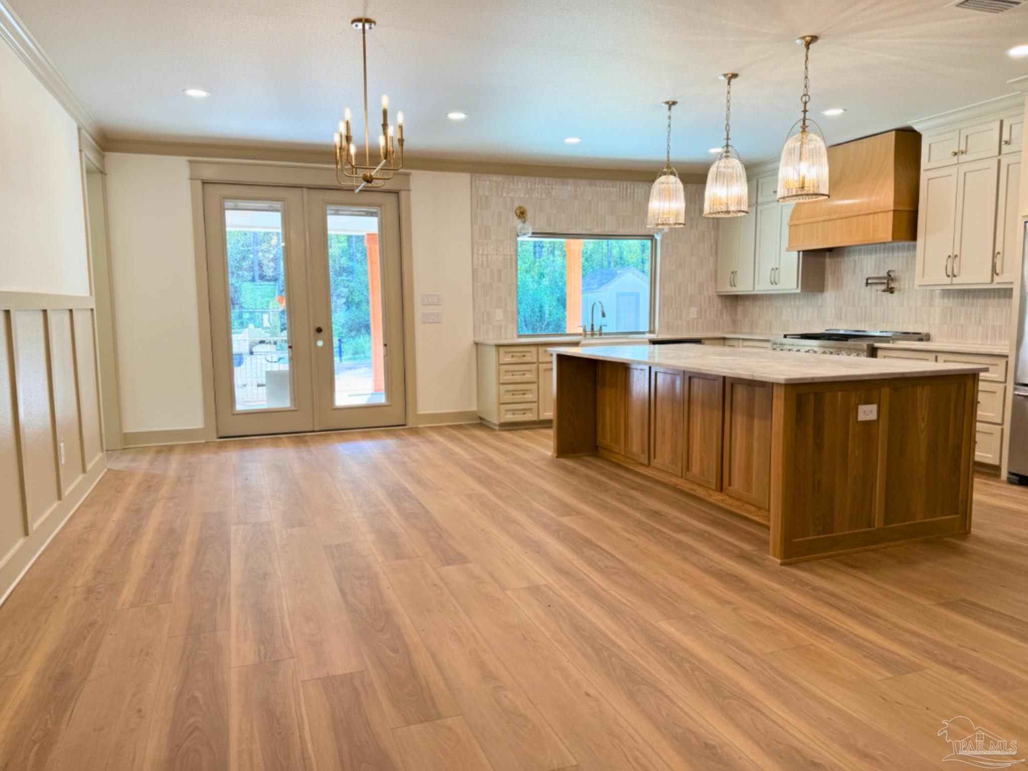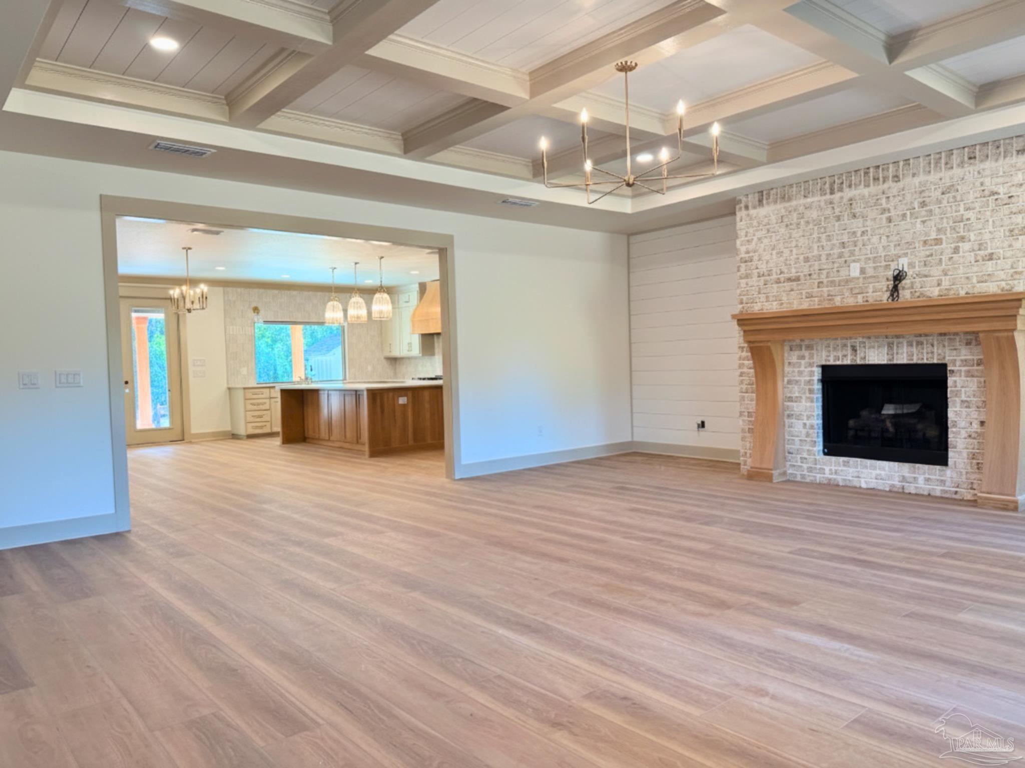 MODERN SOUTHERN ELEGANCE meets timeless craftsmanship in this custom-built retreat set on a generous, private wooded homesite. From the moment you step inside, you’ll sense the difference. The open-concept living area showcases a coffered ceiling and a striking brick fireplace with a custom wood mantel. Wide-plank floors and a soft, nude-toned palette create a serene backdrop that complements any décor. French doors lead to a covered porch with a wood-burning fireplace—perfect for year-round entertaining. *The heart of the home is a chef’s kitchen designed for both beauty and function. Creamy cabinetry with soft-close drawers offers smart storage—including a pantry with pull-out drawers for easy access. Quartz countertops, a gas range crowned by a pot filler, and a built-in wine cooler elevate everyday cooking. A separate prep area features its own sink, keeping the main island clutter-free. Just off the kitchen, a thoughtfully designed laundry room adds floating shelves for display and additional storage. *The owner’s suite offers peaceful views and a luxurious retreat: a generous walk-in closet and a large, light-and-breezy bathroom featuring a freestanding soaking tub and a zero-entry spa shower with a rain shower head and shower bench. Secondary bedrooms are generously sized and thoughtfully separated. Thoughtful design extends outside: a convenient entry from the covered porch leads across the hall to a powder room—perfect for future pool guests. *Nestled within the NatureWalk at Pond Creek community, this home is surrounded by lush pines, scattered oaks, and natural creeks. Large wooded lots and beautifully landscaped grounds create a country-like atmosphere while keeping you close to Pace, Milton, and Pensacola. Residents enjoy privacy, tranquil surroundings, and a strong sense of community that makes NatureWalk one of the most desirable neighborhoods in the area.