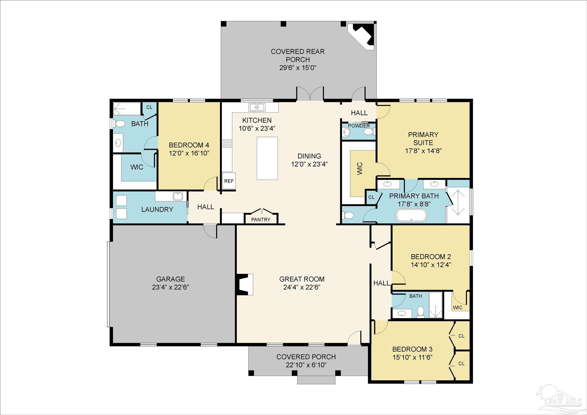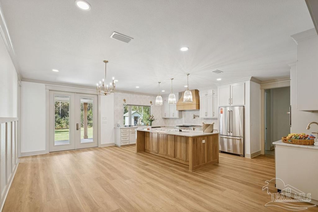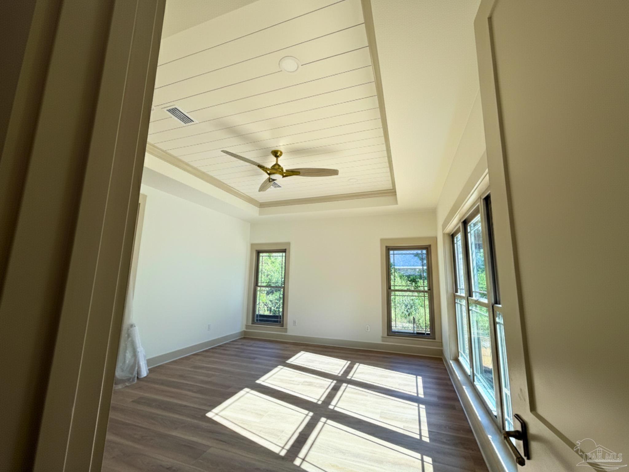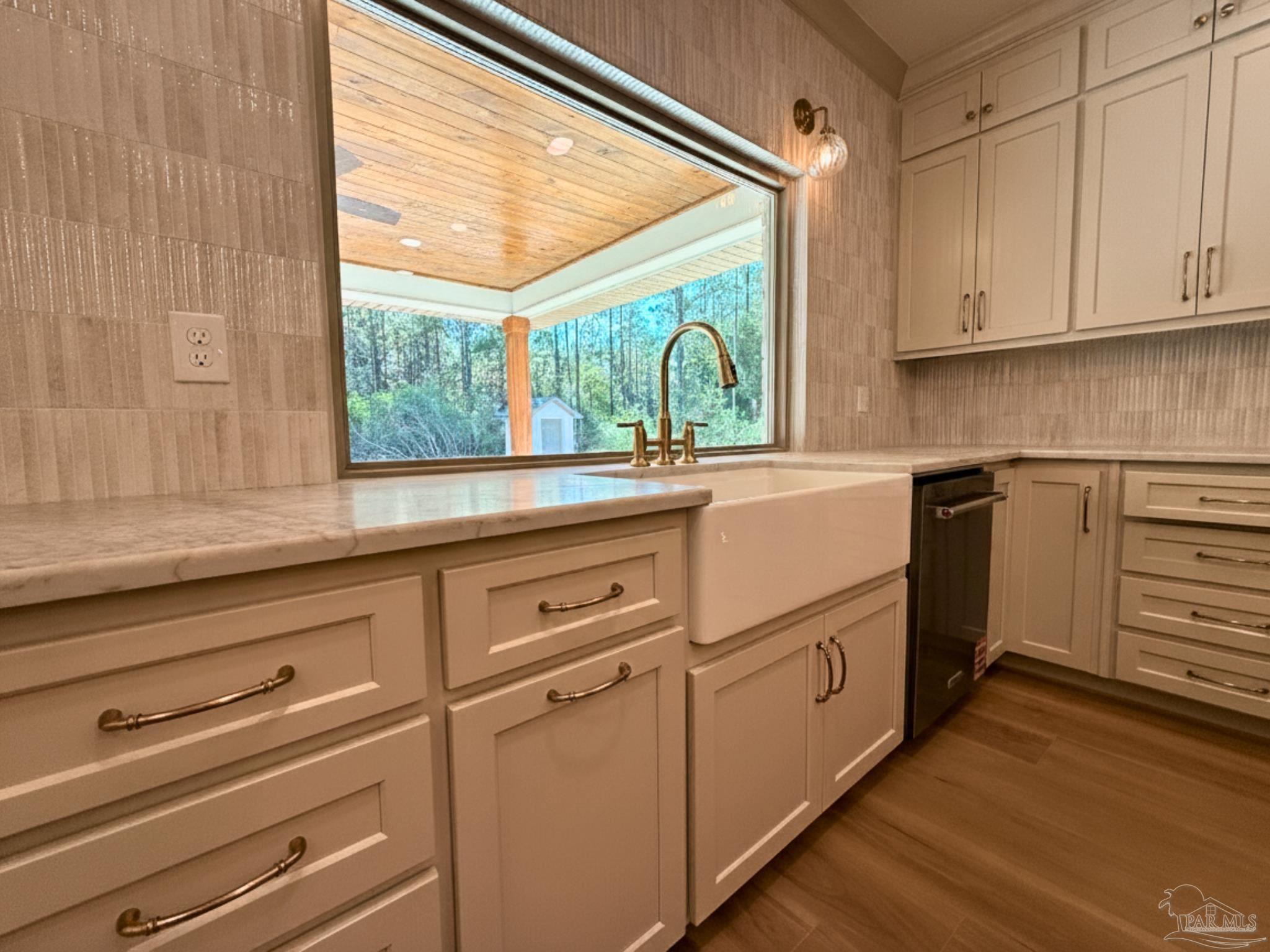 MODERN SOUTHERN ELEGANCE meets timeless craftsmanship in this custom-built retreat set on a generous, private wooded homesite. From the moment you step inside, you’ll sense the difference. The open-concept living area showcases a coffered ceiling and a striking brick fireplace with a custom wood mantel. Wide-plank floors and a soft, nude-toned palette create a serene backdrop that complements any décor. French doors lead to a covered porch with a wood-burning fireplace—perfect for year-round entertaining. *The heart of the home is a chef’s kitchen designed for both beauty and function. Creamy cabinetry with soft-close drawers offers smart storage—including a pantry with pull-out drawers for easy access. Quartz countertops, a gas range crowned by a pot filler, and a built-in wine cooler elevate everyday cooking. A separate prep area features its own sink, keeping the main island clutter-free. Just off the kitchen, a thoughtfully designed laundry room adds floating shelves for display and additional storage. *The owner’s suite offers peaceful views and a luxurious retreat: a generous walk-in closet and a large, light-and-breezy bathroom featuring a freestanding soaking tub and a zero-entry spa shower with a rain shower head and shower bench. Secondary bedrooms are generously sized and thoughtfully separated. Thoughtful design extends outside: a convenient entry from the covered porch leads across the hall to a powder room—perfect for future pool guests. *Nestled within the NatureWalk at Pond Creek community, this home is surrounded by lush pines, scattered oaks, and natural creeks. Large wooded lots and beautifully landscaped grounds create a country-like atmosphere while keeping you close to Pace, Milton, and Pensacola. Residents enjoy privacy, tranquil surroundings, and a strong sense of community that makes NatureWalk one of the most desirable neighborhoods in the area.
