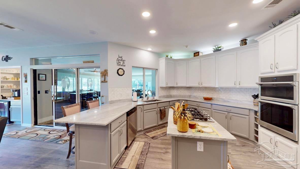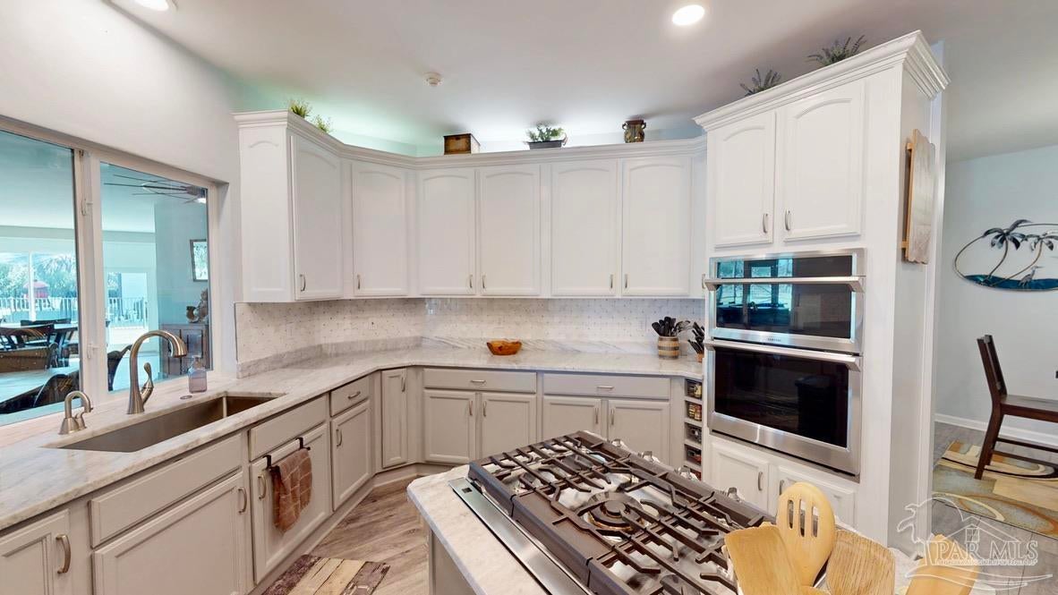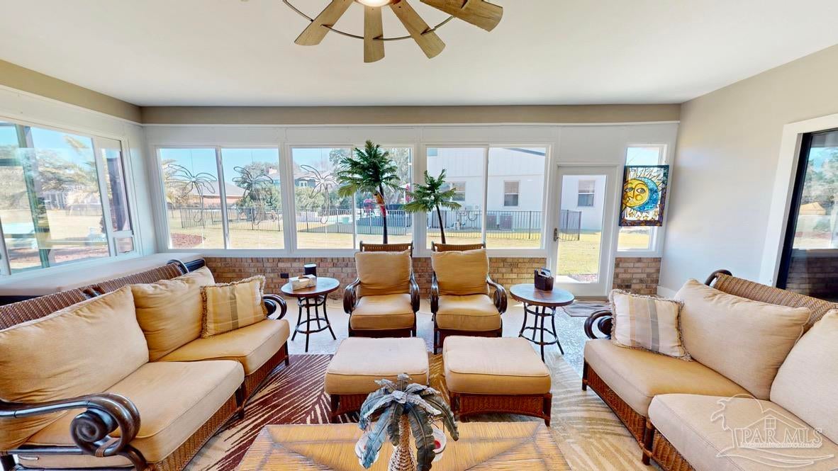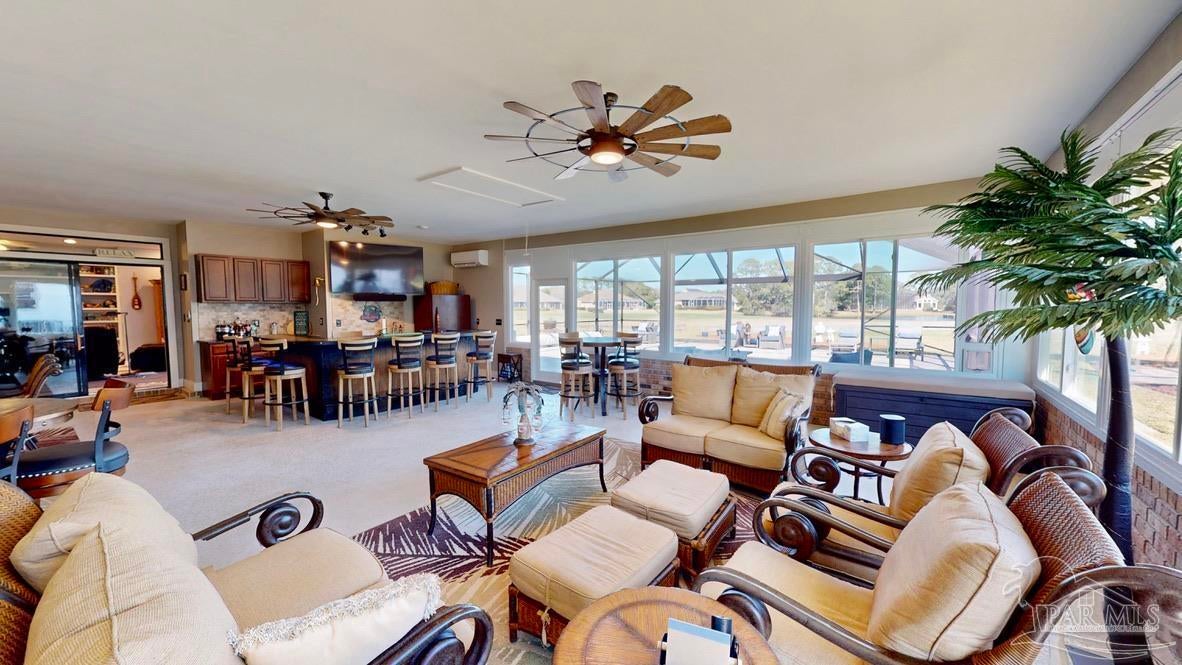 This beautifully updated 4 bedroom, 3 bathroom residence in Tiger Point Village offers breathtaking views of Tiger Point East signature hole #5 with its island green, along with glimpses of Santa Rosa Sound from the pool area, front of the house and the newly enclosed Florida room. Designed with both comfort and entertainment in mind, this single story split-level floor plan boasts multiple living areas, creating the perfect space for relaxation and hosting guests. The updated kitchen features stainless steel appliances, a walk-in pantry and ability to serve straight into the Florida room. The master suite features a walk-in shower, separate soaking tub and walk-in closets. Two other bedrooms share a jack and jill bathroom with walk-in shower. Major upgrades bring peace of mind, including a newer roof, HVAC system, and updated ductwork for improved efficiency and comfort. From the Florida room, step outside to your private oasis. A heated gunite pool, enclosed within a screened lanai, making it enjoyable year-round. Whether you're soaking up the serene golf course views, hosting gatherings, or simply unwinding, this home is truly an entertainer’s dream. Don’t miss this rare opportunity to own a move-in-ready gem in Gulf Breeze! Schedule your private showing today.