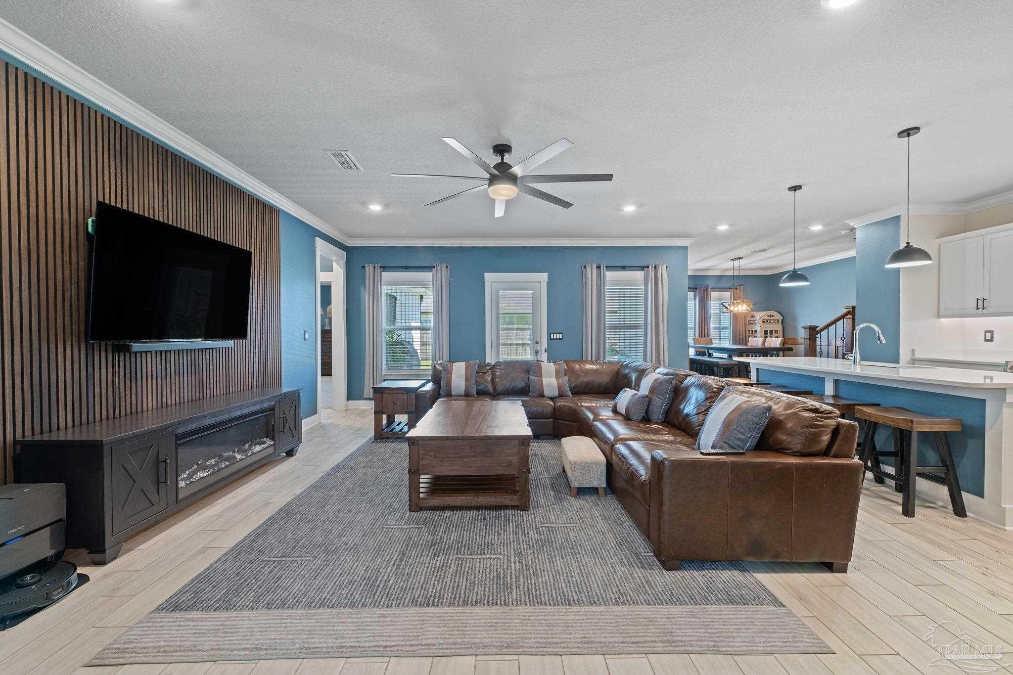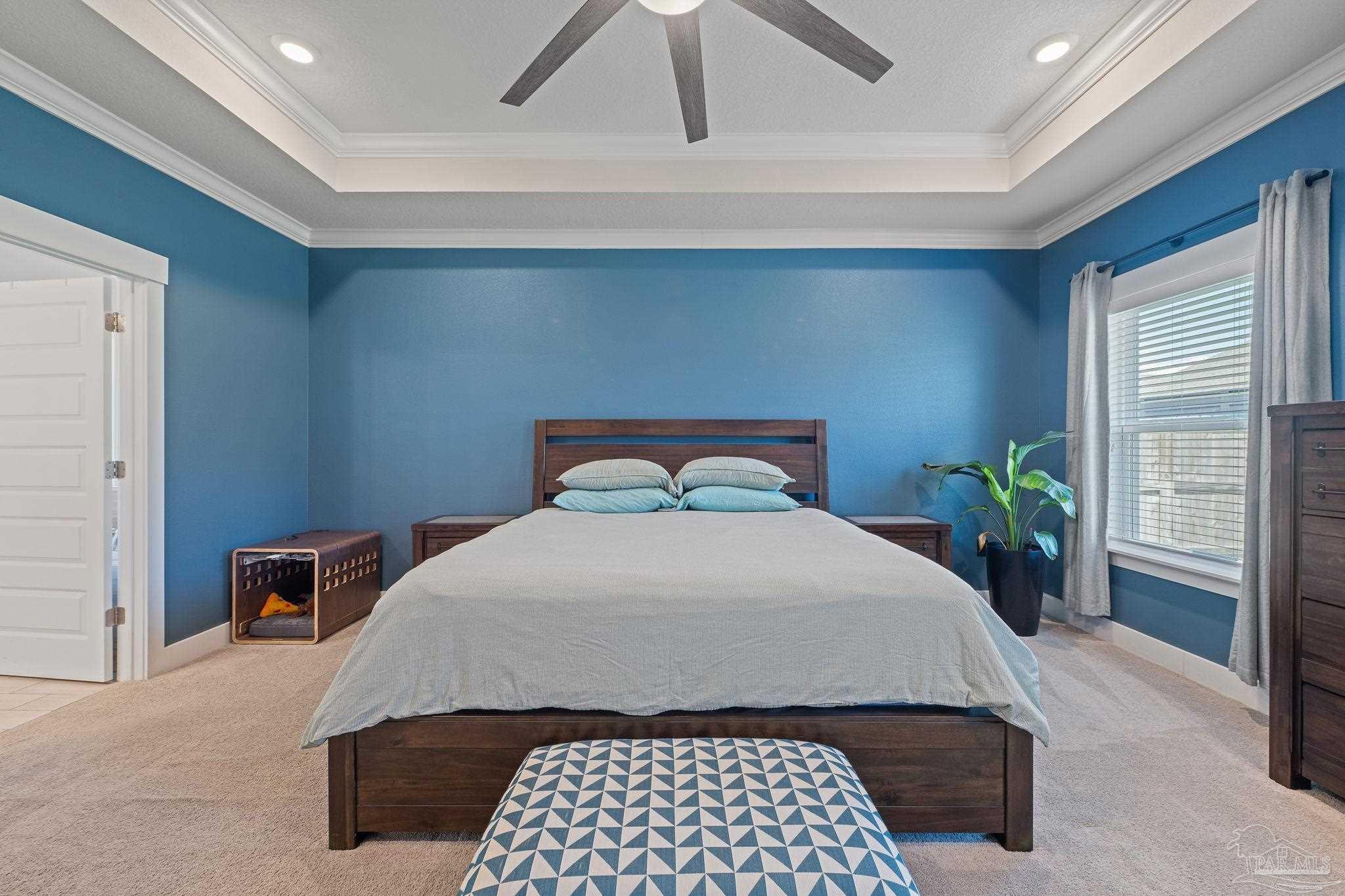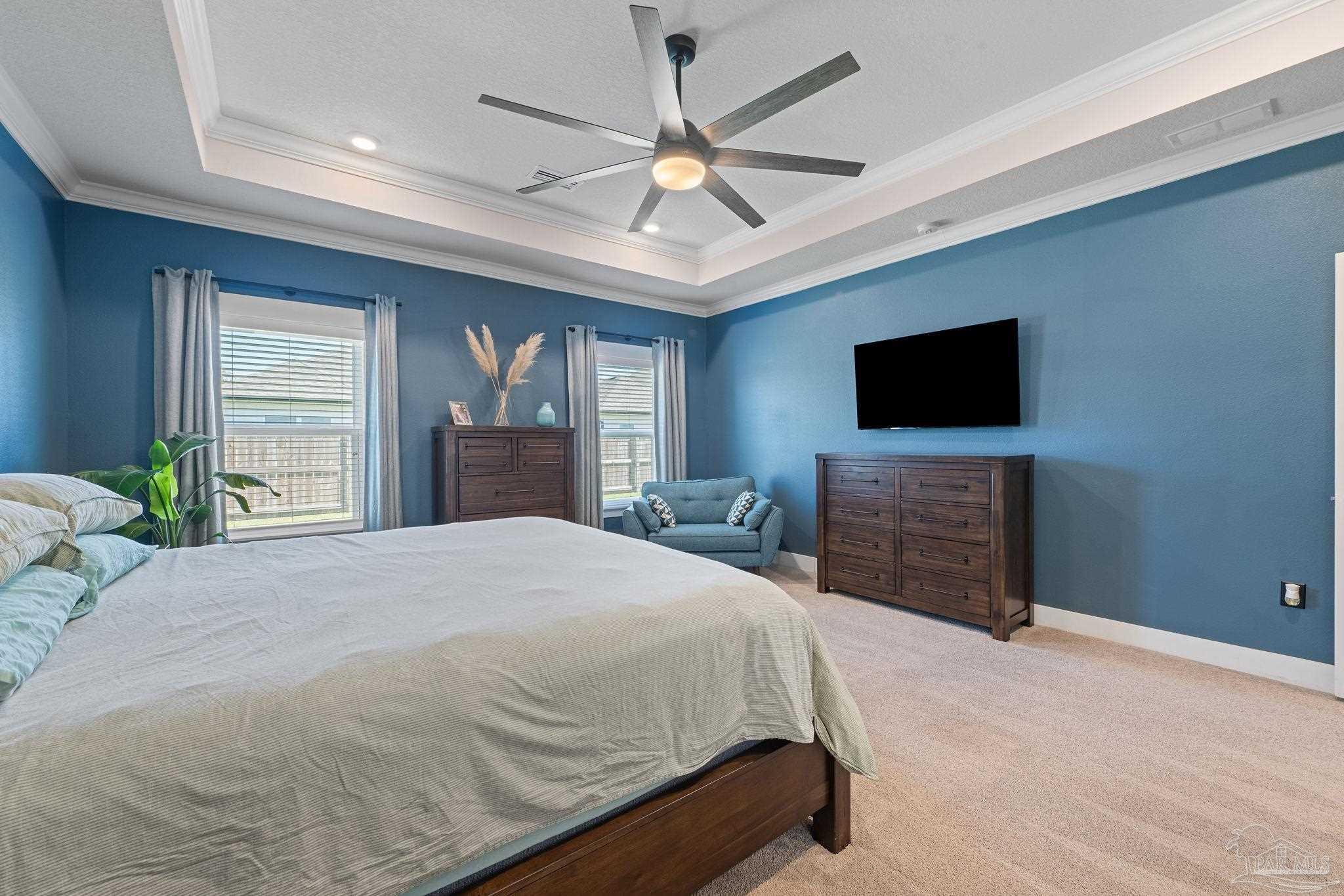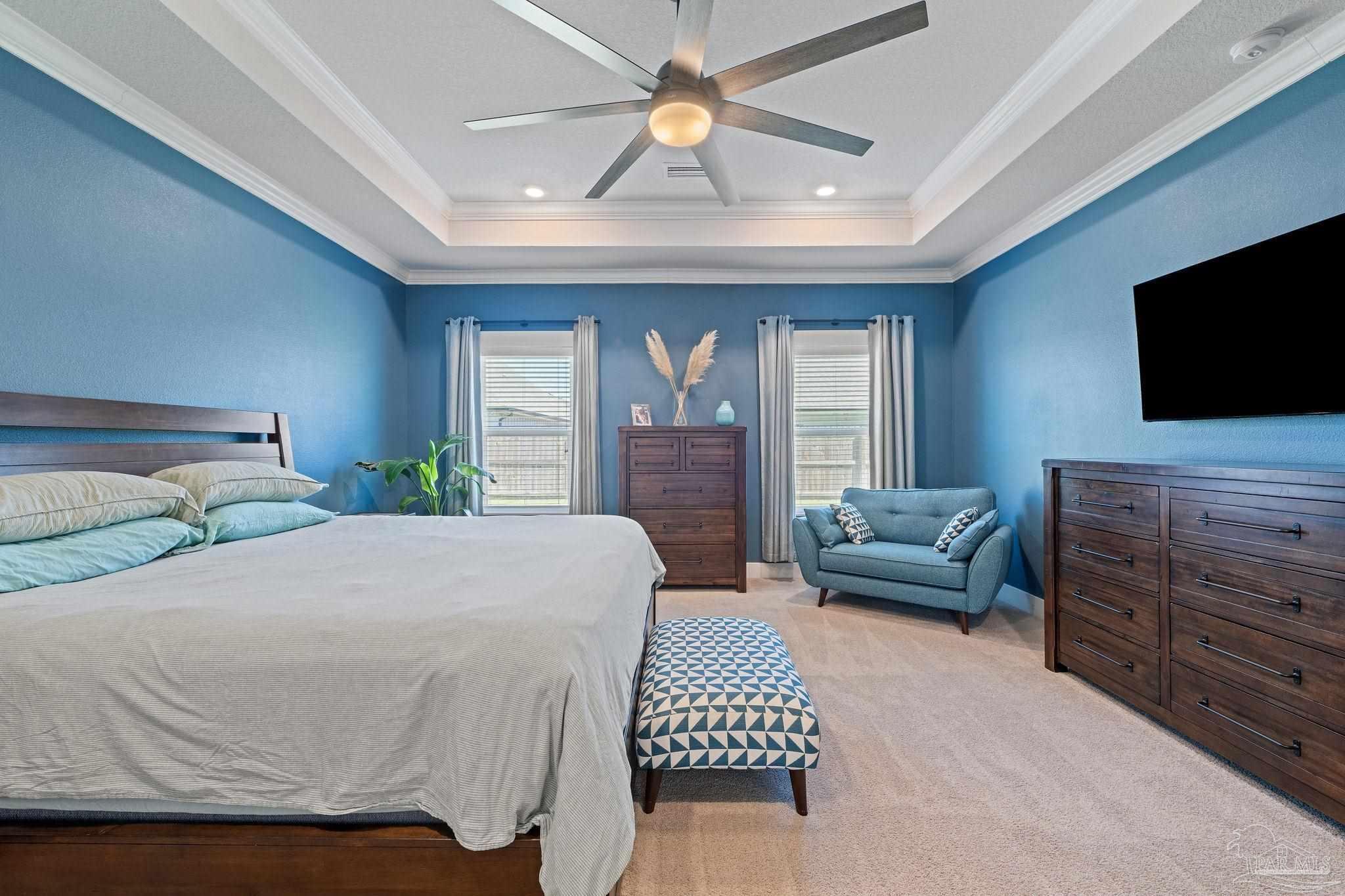 Welcome to this beautiful 3,159 square foot craftsman style home located in Water's Edge subdivision in Gulf Breeze. This home features 4 bedrooms, 3 bull baths, and a huge bonus/flex room and a 3 car garage! As you enter, the foyer welcomes you into this split bedroom, open floor plan home with plenty of room for entertaining, and exquisite features and tons of character such as: crown molding, granite countertops in kitchen and baths, wood-look tile through out the common areas, stainless steel appliances with staggered white shaker style, upgraded cabinetry. On the front left of the home, there are 2 bedrooms that share a full bath. The large and private primary suite has tray ceilings with crown molding. The primary bath has a double vanity with granite tops, tile shower with a frameless glass door, drop in garden tub with tile surround and a huge walk in shower. The covered back porch has tons of room for entertaining and a yard large enough for a pool and outdoor entertainment area. The right side of the home features a laundry room, and pantry just off the 3 car garage. Behind this is a guest suite, complete with another full bath. Upstairs, you'll find a massive 5th bedroom or flex room that offer almost 600 square foot of living space. This home is in the Gulf Breeze School District, and is convenient to Highway 98, Hurlburt Field, NAS Pensacola, Whiting Field, the I-10, and the sugar-white beaches.