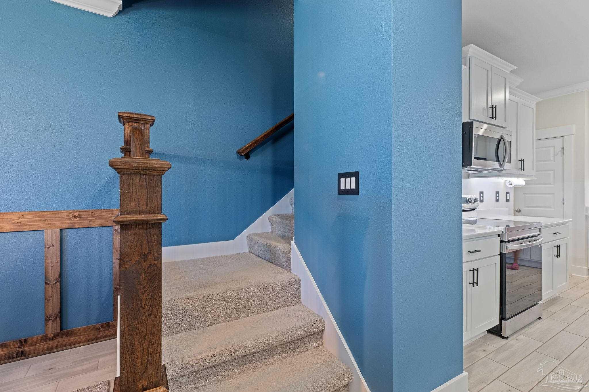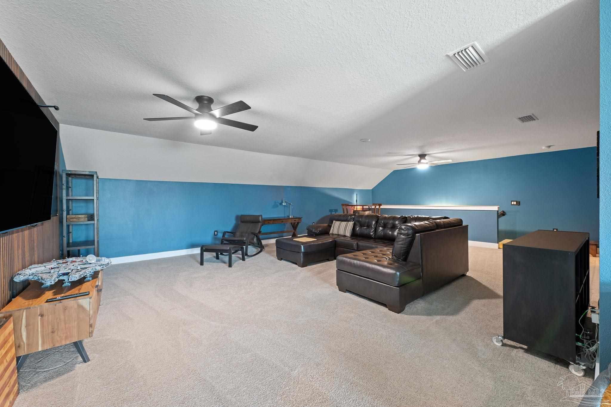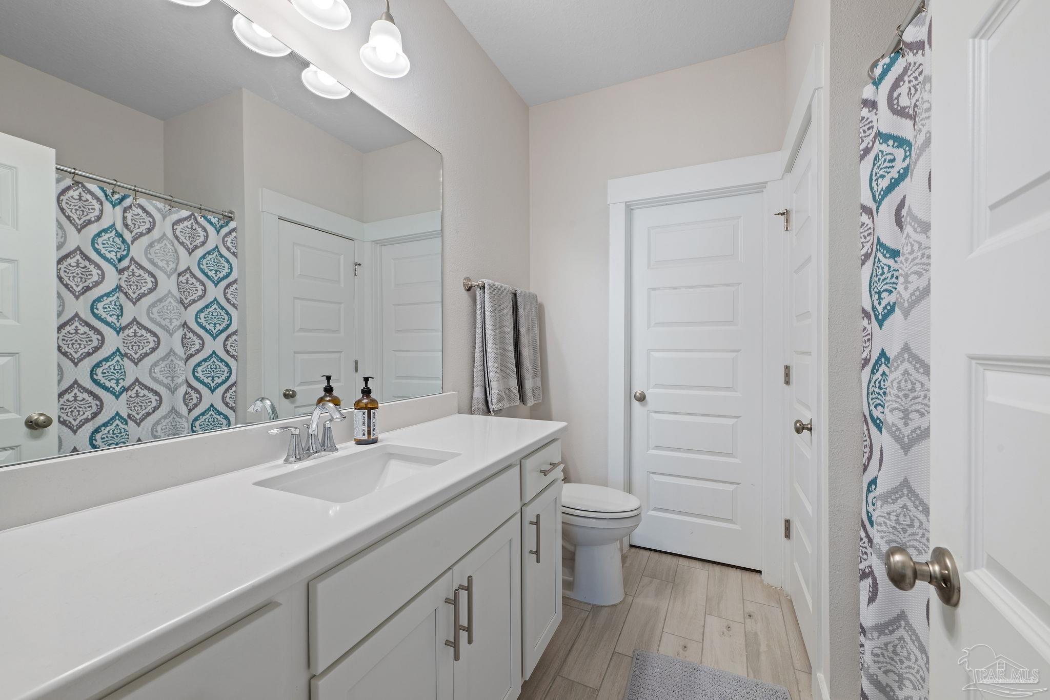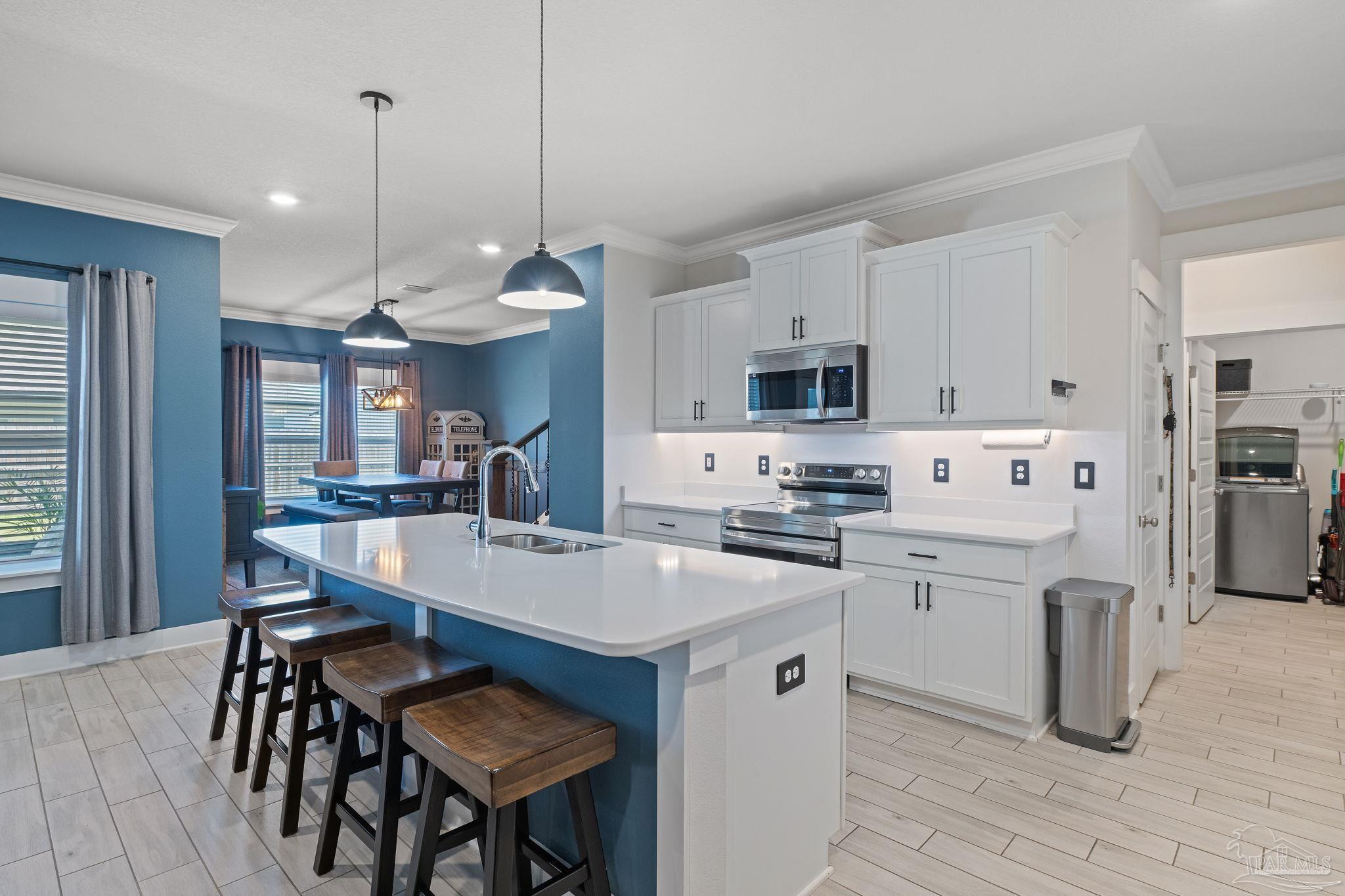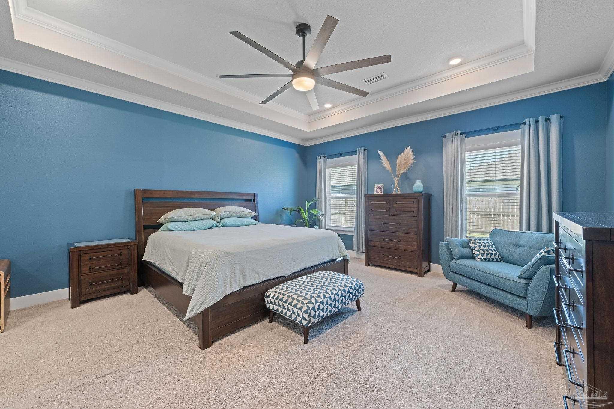 Welcome to this beautiful 3,159 square foot craftsman style home located in Water's Edge subdivision in Gulf Breeze. This home features 4 bedrooms, 3 bull baths, and a huge bonus/flex room and a 3 car garage! As you enter, the foyer welcomes you into this split bedroom, open floor plan home with plenty of room for entertaining, and exquisite features and tons of character such as: crown molding, granite countertops in kitchen and baths, wood-look tile through out the common areas, stainless steel appliances with staggered white shaker style, upgraded cabinetry. On the front left of the home, there are 2 bedrooms that share a full bath. The large and private primary suite has tray ceilings with crown molding. The primary bath has a double vanity with granite tops, tile shower with a frameless glass door, drop in garden tub with tile surround and a huge walk in shower. The covered back porch has tons of room for entertaining and a yard large enough for a pool and outdoor entertainment area. The right side of the home features a laundry room, and pantry just off the 3 car garage. Behind this is a guest suite, complete with another full bath. Upstairs, you'll find a massive 5th bedroom or flex room that offer almost 600 square foot of living space. This home is in the Gulf Breeze School District, and is convenient to Highway 98, Hurlburt Field, NAS Pensacola, Whiting Field, the I-10, and the sugar-white beaches.