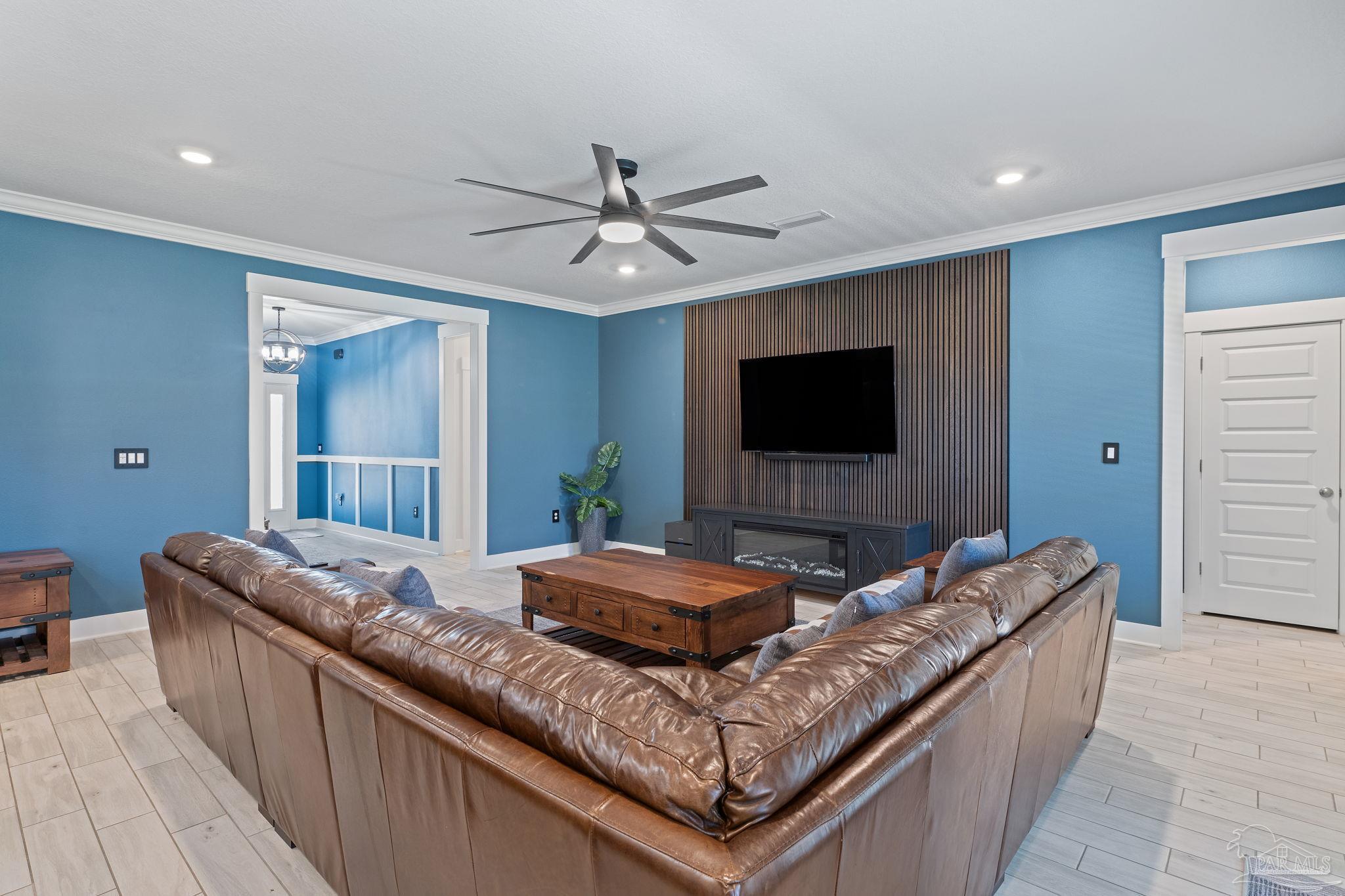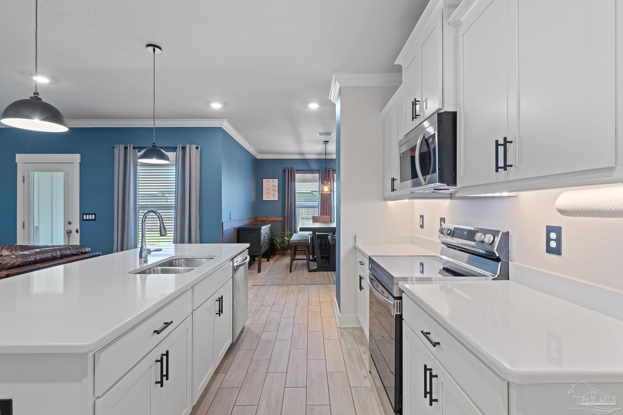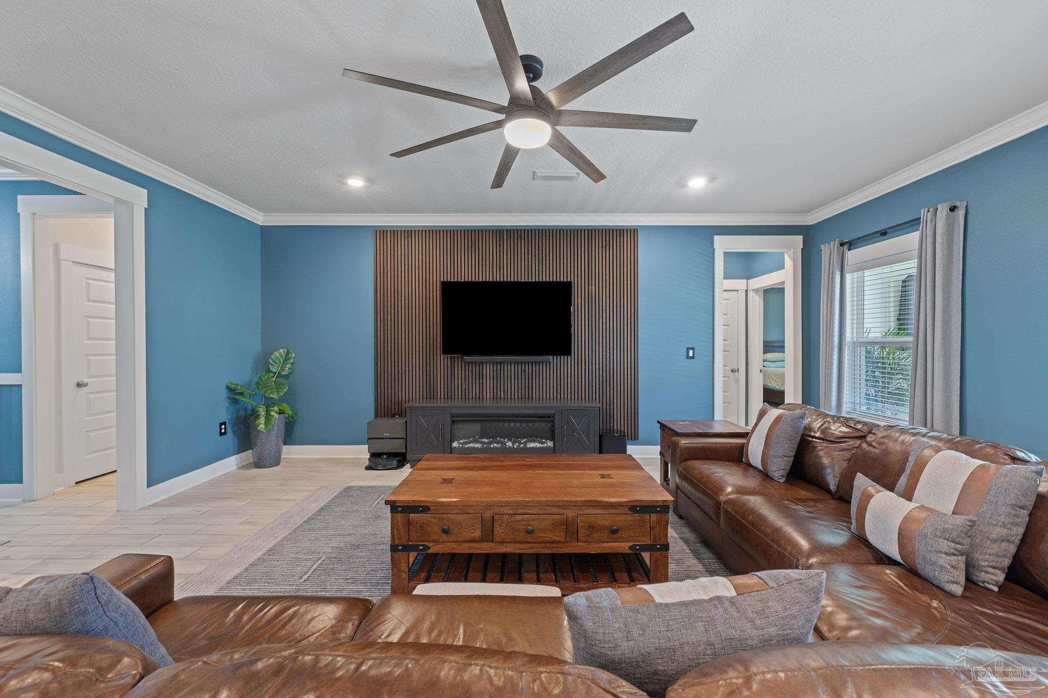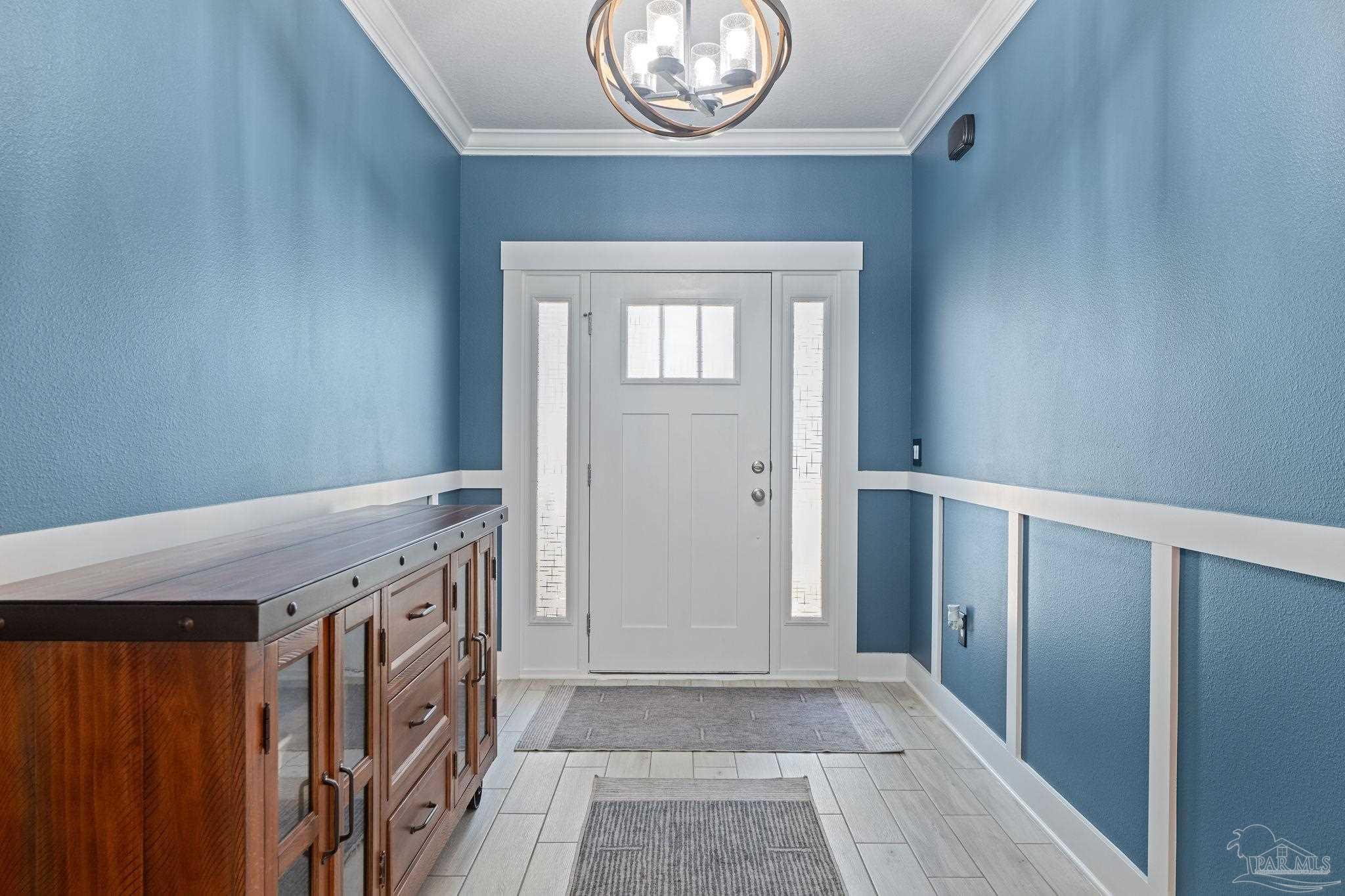 Welcome to this beautiful 3,159 square foot craftsman style home located in Water's Edge subdivision in Gulf Breeze. This home features 4 bedrooms, 3 bull baths, and a huge bonus/flex room and a 3 car garage! As you enter, the foyer welcomes you into this split bedroom, open floor plan home with plenty of room for entertaining, and exquisite features and tons of character such as: crown molding, granite countertops in kitchen and baths, wood-look tile through out the common areas, stainless steel appliances with staggered white shaker style, upgraded cabinetry. On the front left of the home, there are 2 bedrooms that share a full bath. The large and private primary suite has tray ceilings with crown molding. The primary bath has a double vanity with granite tops, tile shower with a frameless glass door, drop in garden tub with tile surround and a huge walk in shower. The covered back porch has tons of room for entertaining and a yard large enough for a pool and outdoor entertainment area. The right side of the home features a laundry room, and pantry just off the 3 car garage. Behind this is a guest suite, complete with another full bath. Upstairs, you'll find a massive 5th bedroom or flex room that offer almost 600 square foot of living space. This home is in the Gulf Breeze School District, and is convenient to Highway 98, Hurlburt Field, NAS Pensacola, Whiting Field, the I-10, and the sugar-white beaches.