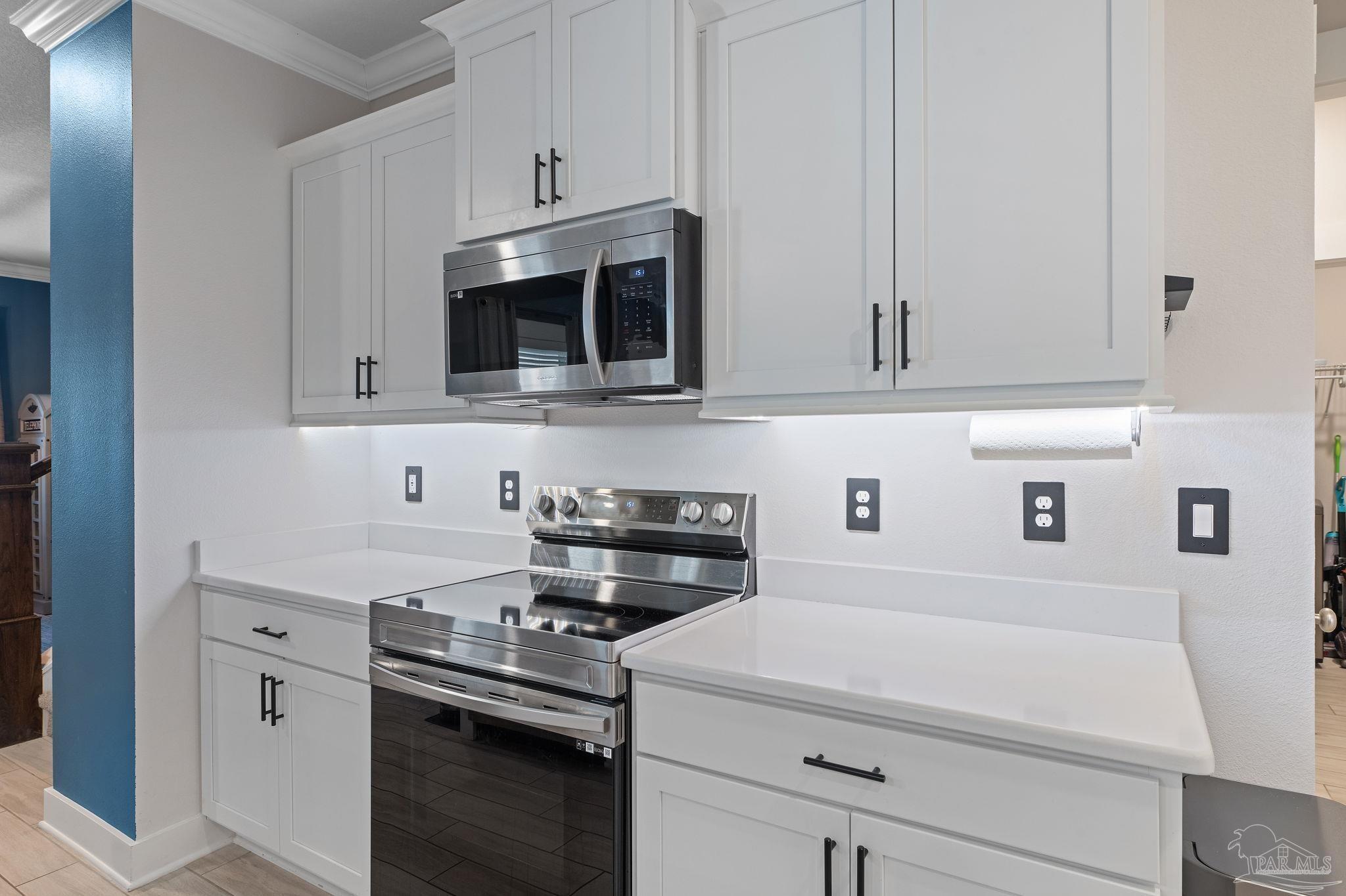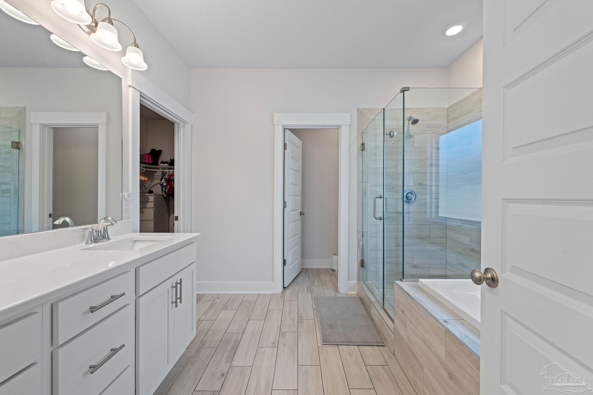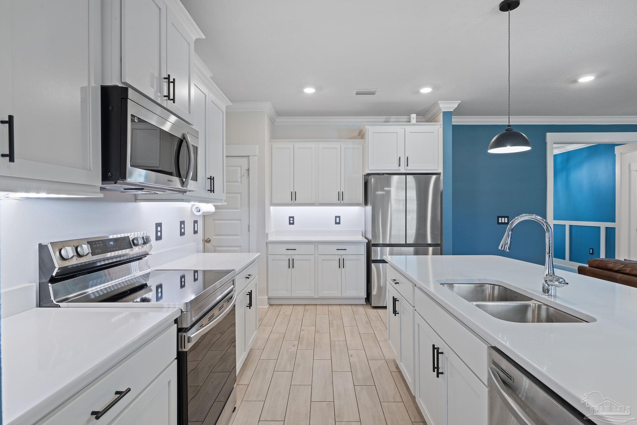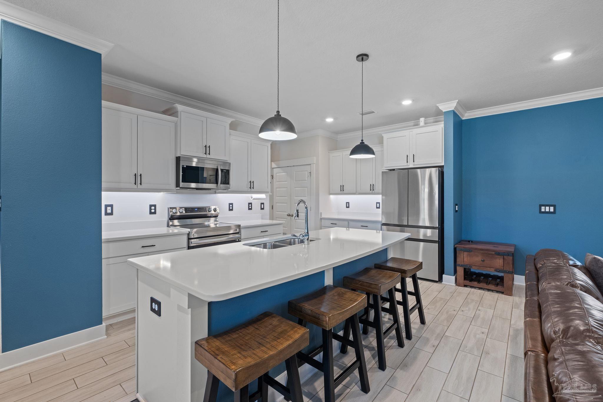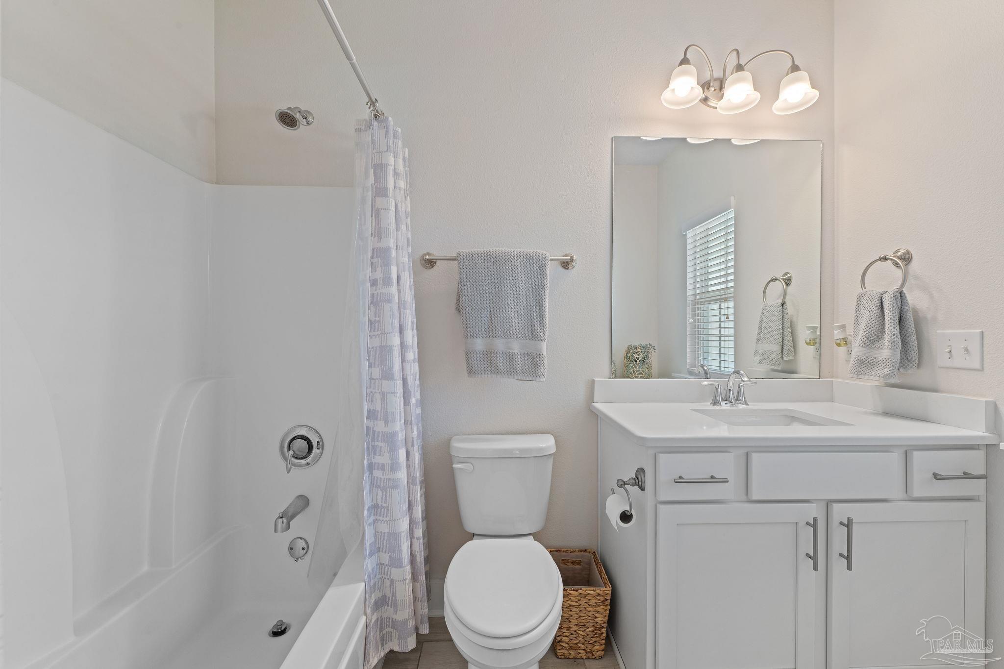 Welcome to this beautiful 3,159 square foot craftsman style home located in Water's Edge subdivision in Gulf Breeze. This home features 4 bedrooms, 3 bull baths, and a huge bonus/flex room and a 3 car garage! As you enter, the foyer welcomes you into this split bedroom, open floor plan home with plenty of room for entertaining, and exquisite features and tons of character such as: crown molding, granite countertops in kitchen and baths, wood-look tile through out the common areas, stainless steel appliances with staggered white shaker style, upgraded cabinetry. On the front left of the home, there are 2 bedrooms that share a full bath. The large and private primary suite has tray ceilings with crown molding. The primary bath has a double vanity with granite tops, tile shower with a frameless glass door, drop in garden tub with tile surround and a huge walk in shower. The covered back porch has tons of room for entertaining and a yard large enough for a pool and outdoor entertainment area. The right side of the home features a laundry room, and pantry just off the 3 car garage. Behind this is a guest suite, complete with another full bath. Upstairs, you'll find a massive 5th bedroom or flex room that offer almost 600 square foot of living space. This home is in the Gulf Breeze School District, and is convenient to Highway 98, Hurlburt Field, NAS Pensacola, Whiting Field, the I-10, and the sugar-white beaches.