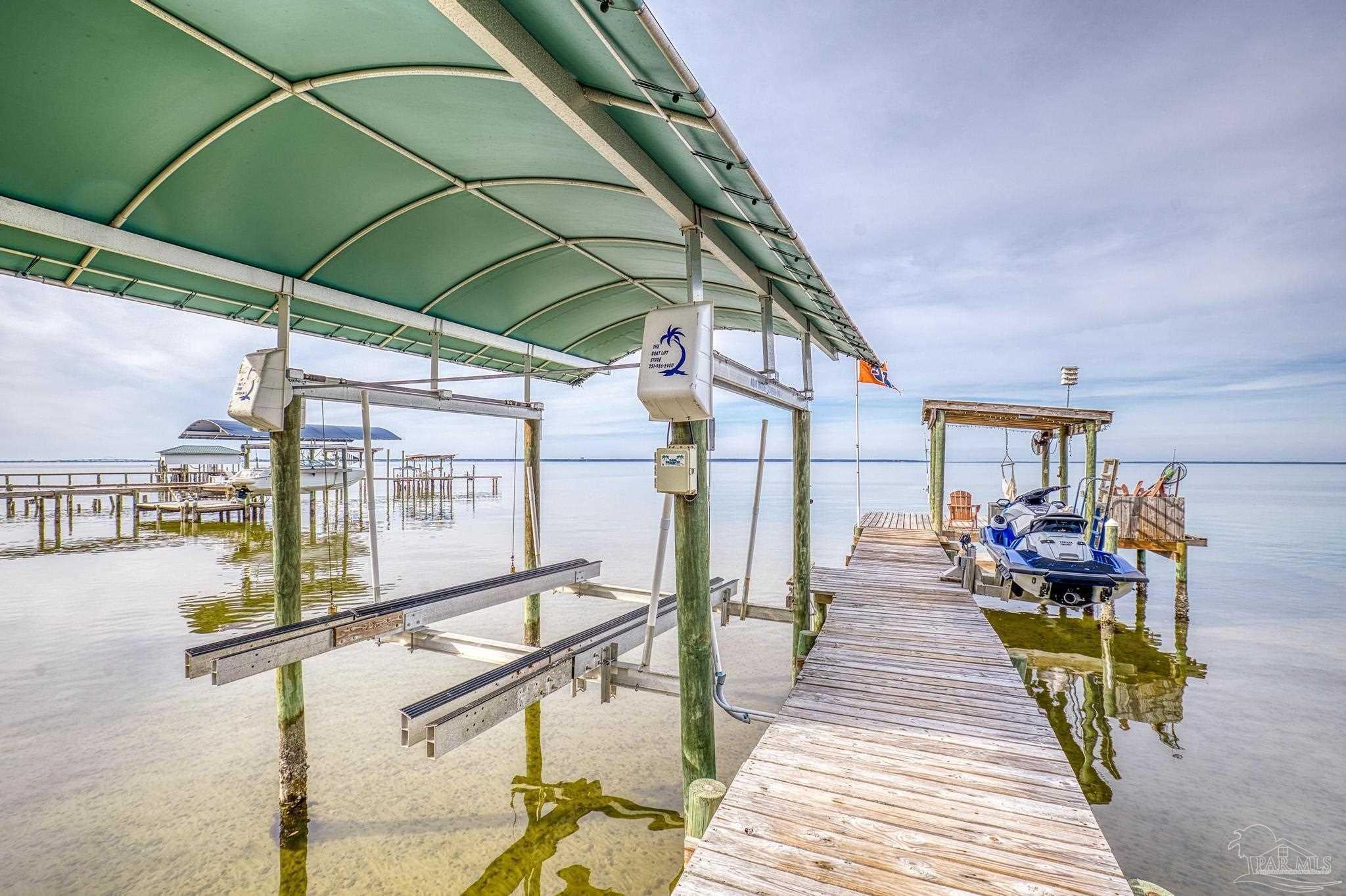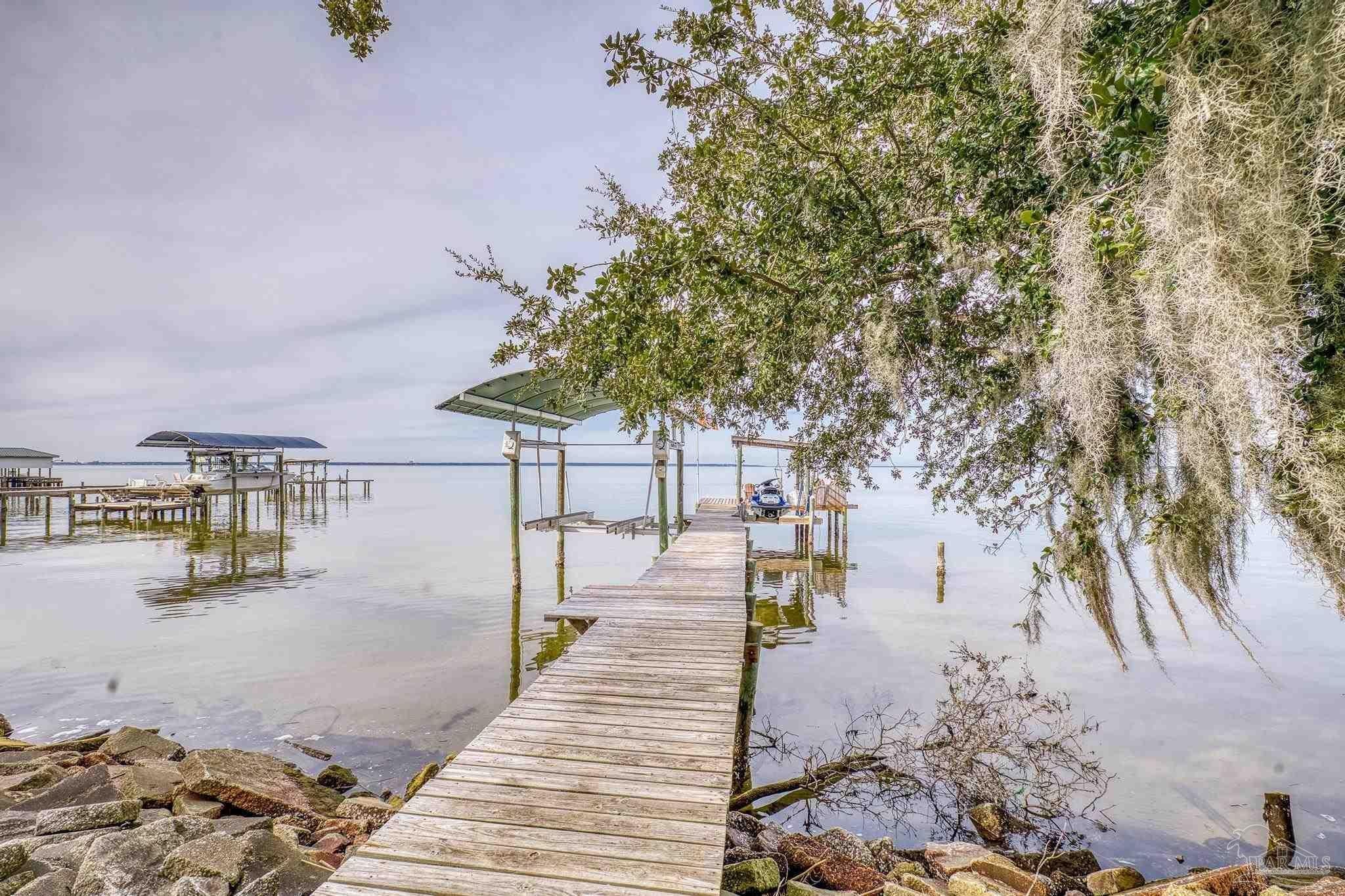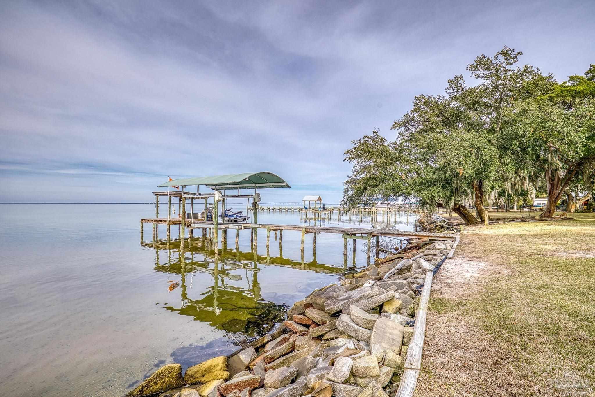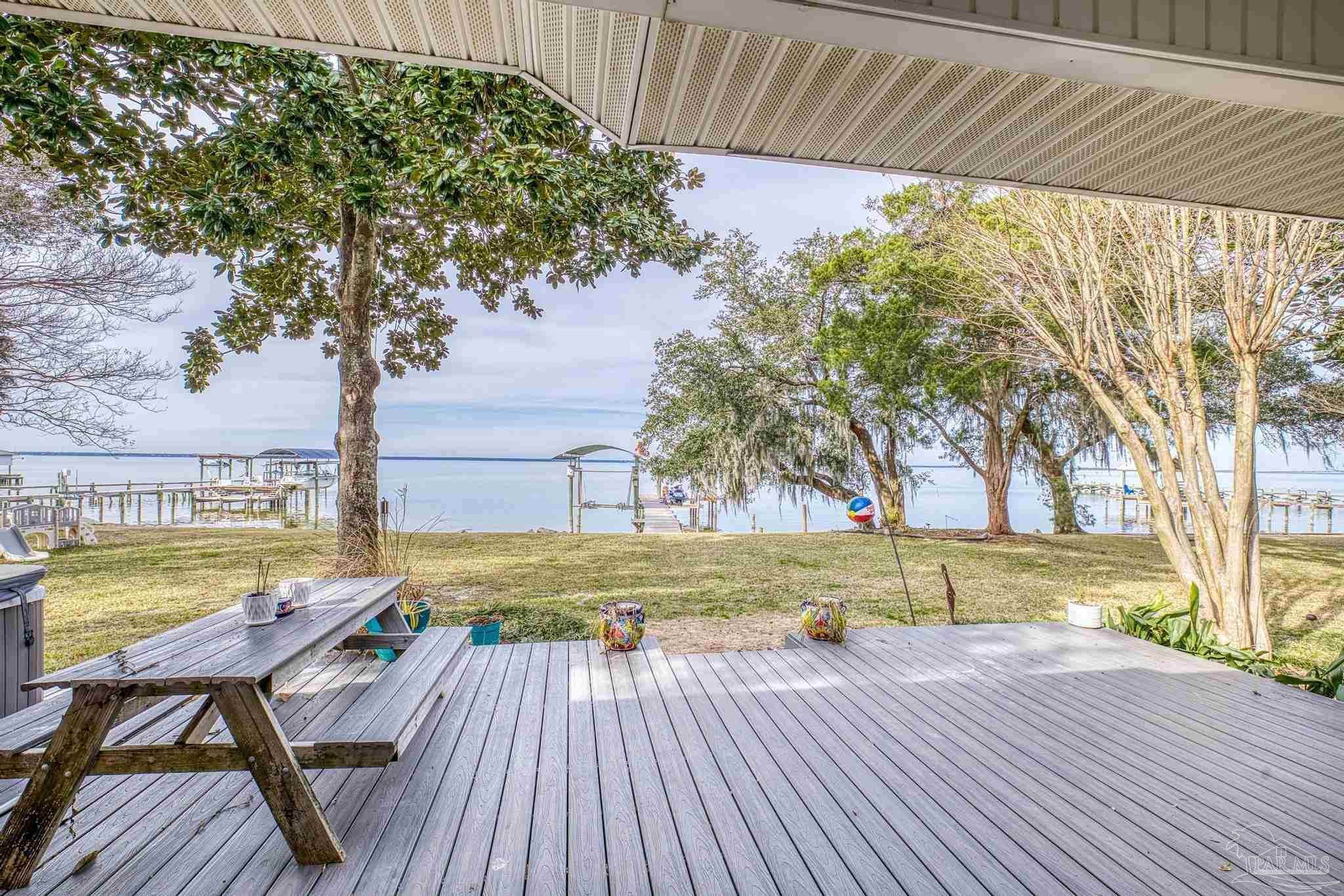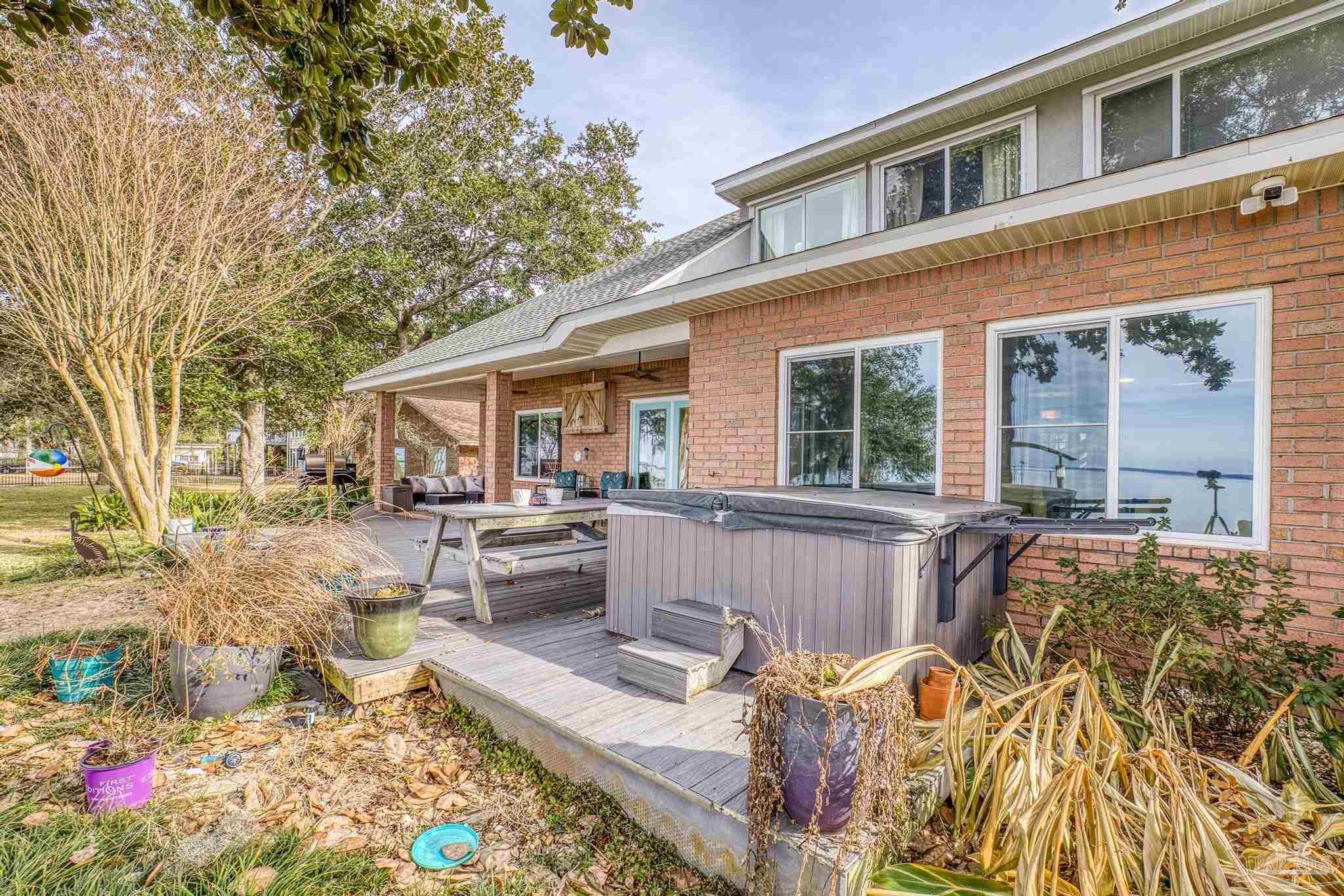 Waterfront living on Pensacola Bay with 90 feet of private shoreline. This exceptional 3-bed, 3.5-bath Gulf Breeze home spans nearly 3,500 sq ft on a .40-acre lot and blends solid construction with relaxed coastal style—brick and Hardie® plank siding, impact-rated windows (2020), assumable flood insurance (never flooded), and homeowners insurance reportedly under $8K/yr—paired with a neutral palette, LVP flooring, and bay views from almost every room. The fully remodeled kitchen is a showpiece with floor-to-ceiling white cabinetry, quartzite countertops, stainless appliances, an eat-in nook, and a breakfast bar. It opens to a spacious family room with a cozy fireplace and picture windows framing the wraparound deck, hot tub, and backyard oasis. Out back, a 100-ft dock with boat and jet-ski lifts sets the stage for everyday sunset cruises and weekend fun. The primary suite is a private retreat with a sitting area overlooking the water, dual vanities, a tiled shower, soaking tub, water closet, and a generous walk-in closet. A split layout places a secondary bedroom and updated bath on the opposite side of the home, along with a large laundry/mud room offering abundant storage. Upstairs, ~800 sq ft adds a bedroom, full bath, and a separate living area with sweeping bay views—perfect for guests or a media space. Additional highlights include a 2-car garage, irrigation system, transferable termite warranty, and no HOA. Ideally located just past the Gulf Islands National Seashore, this is luxury waterfront living in Gulf Breeze at its best. See media for more details, photos, and 3D tour.